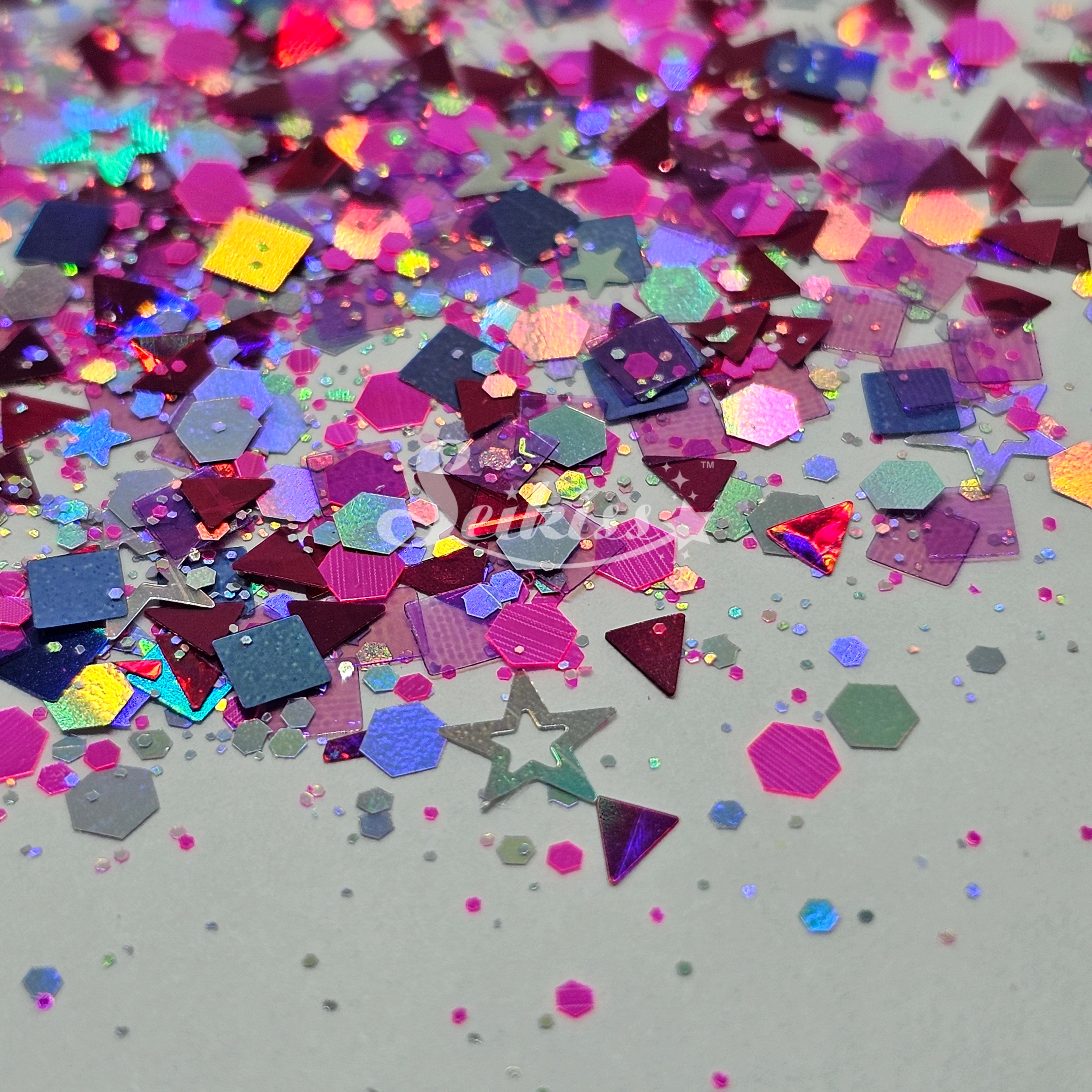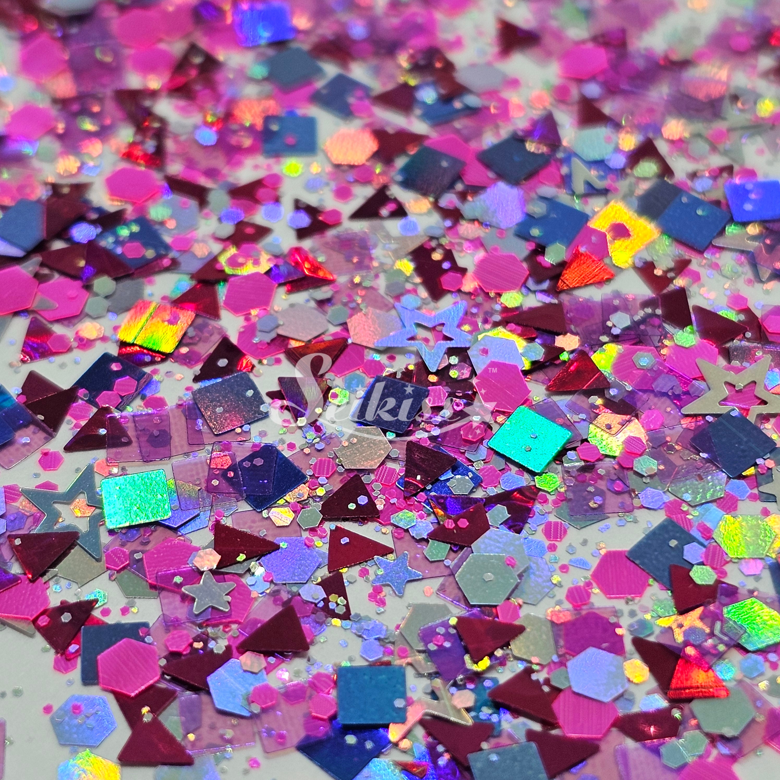 1982 Retro is a unique custom mix packed with a vibrant retro style. In this mix, you can find blue & purple squares, silver stars, fuchsia triangles, and a holographic silver chunky mix. Perfect for all your projects like resin, nails, tumblers, jewelry, arts, and all types of crafts.
