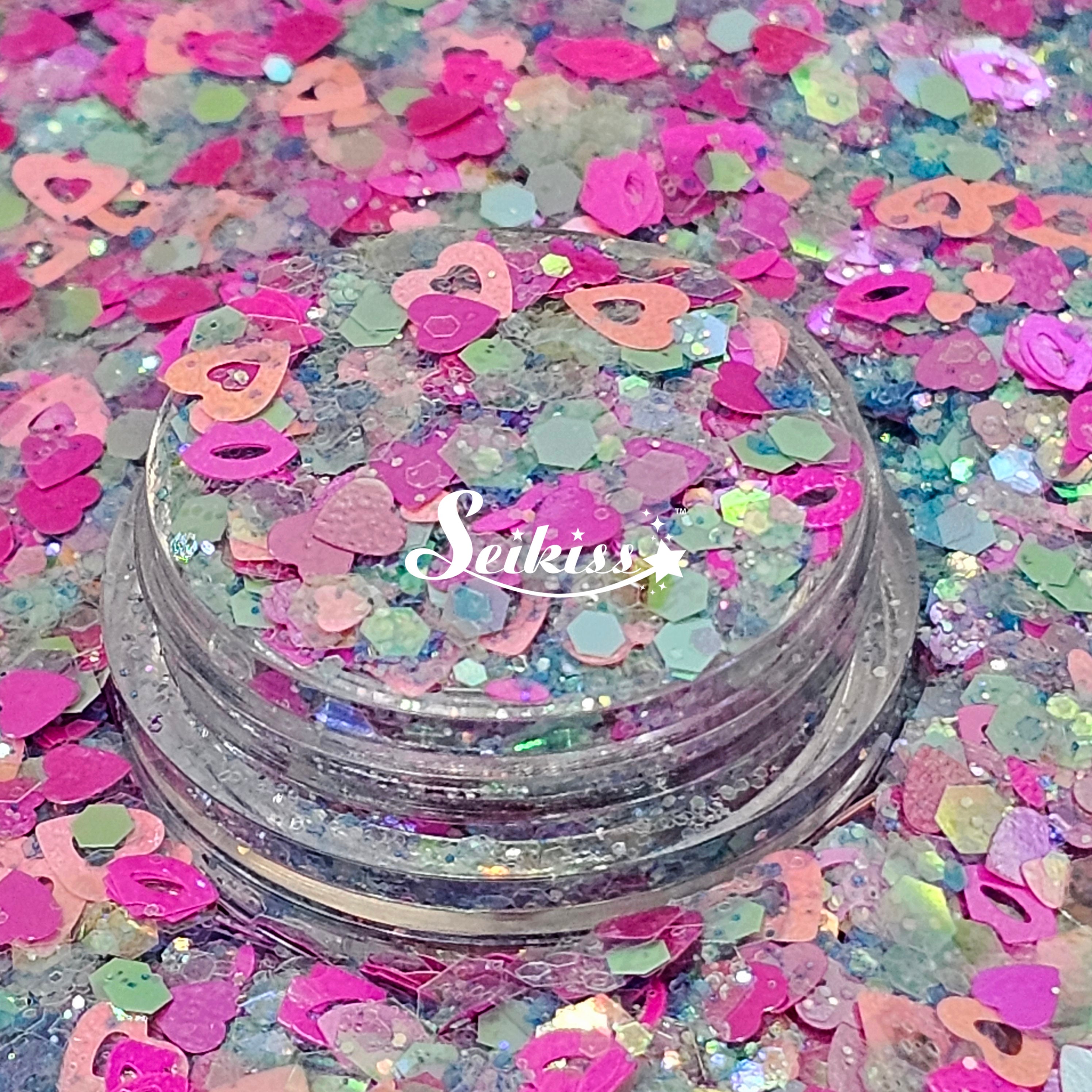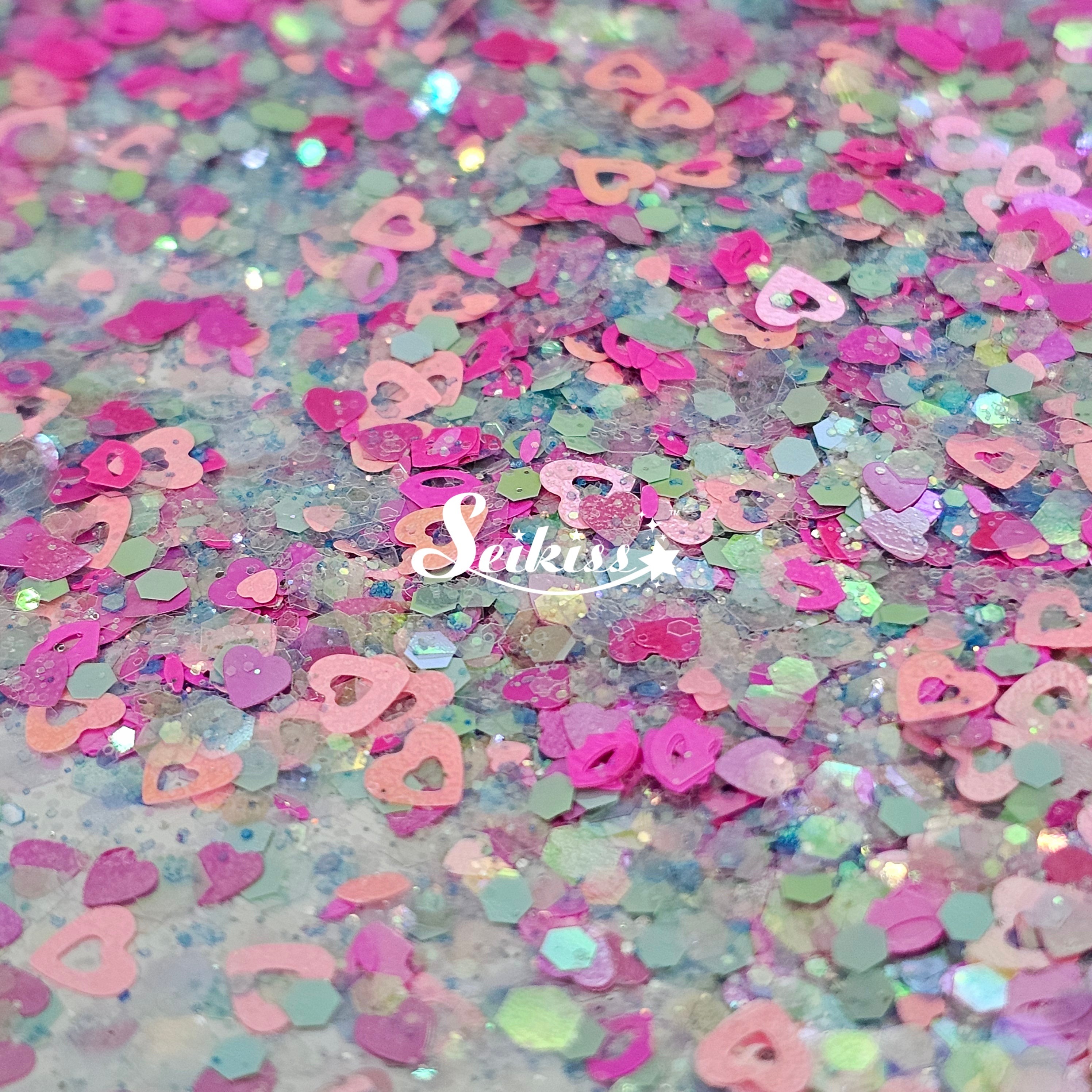 Amor Azul is a stunning mix of soft pink hollow hearts, blue chunky glitter, small pink hearts and kisses with an iridescent finish. Perfect for adding a romantic, eye-catching finish to all your projects, including resin art, nails, tumblers, jewelry, and all types of crafts..