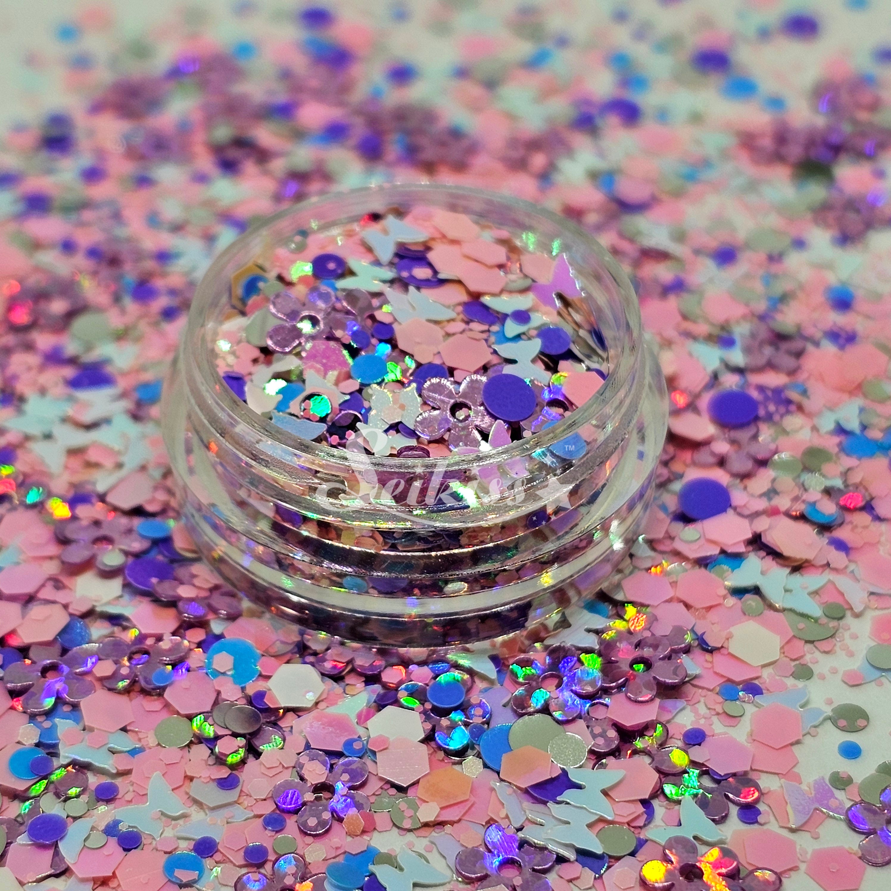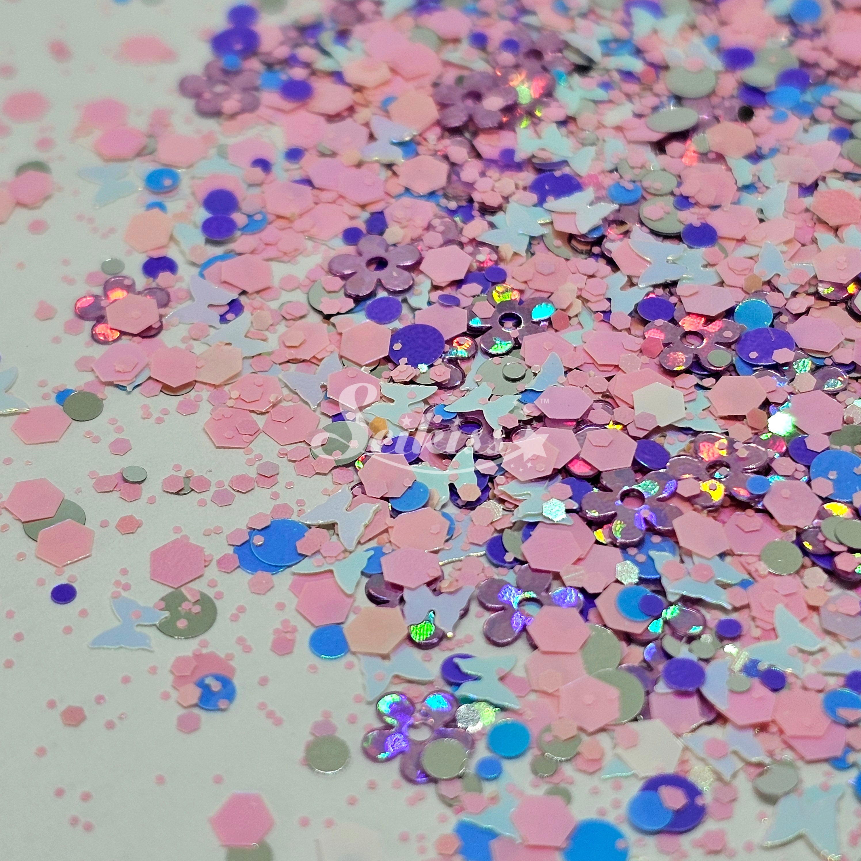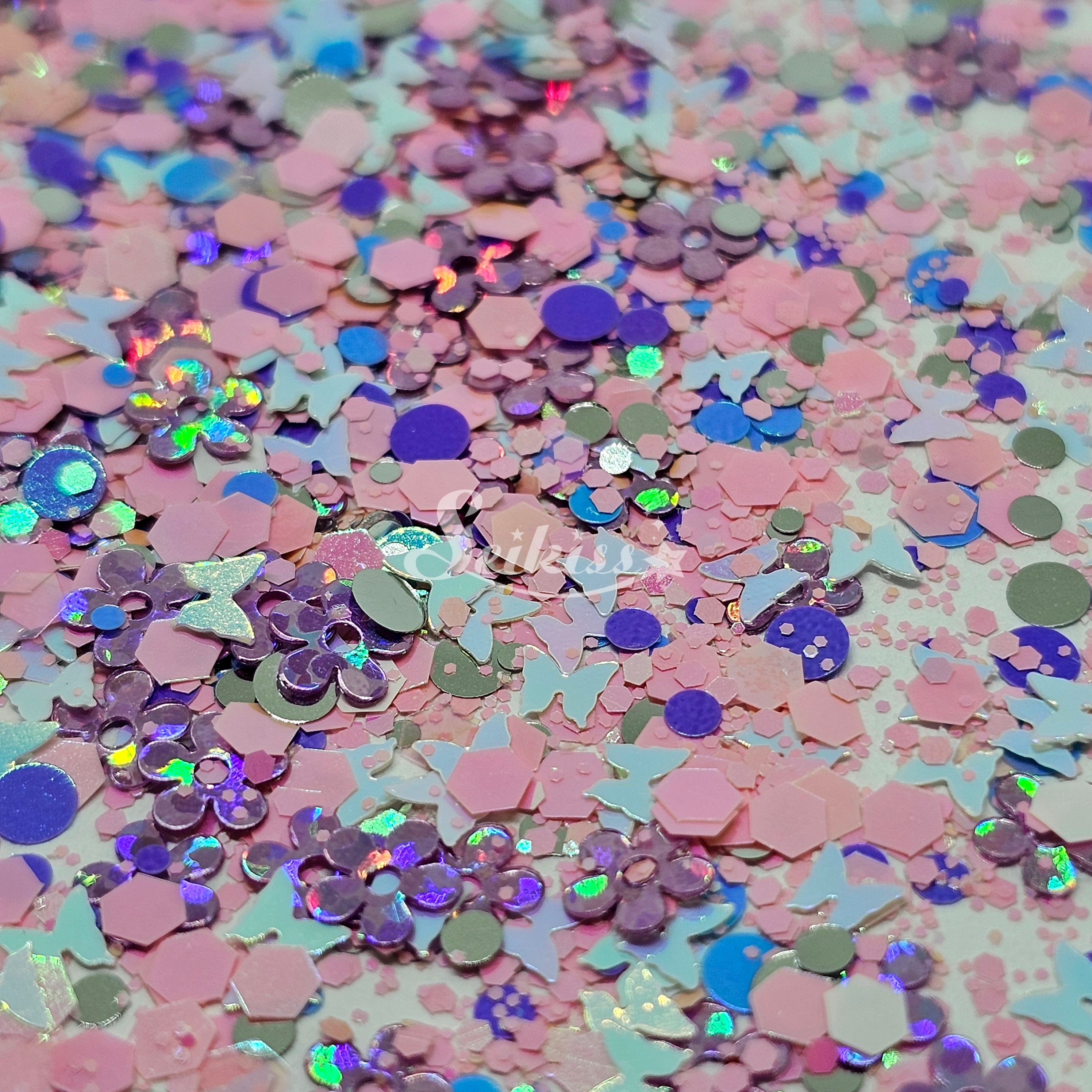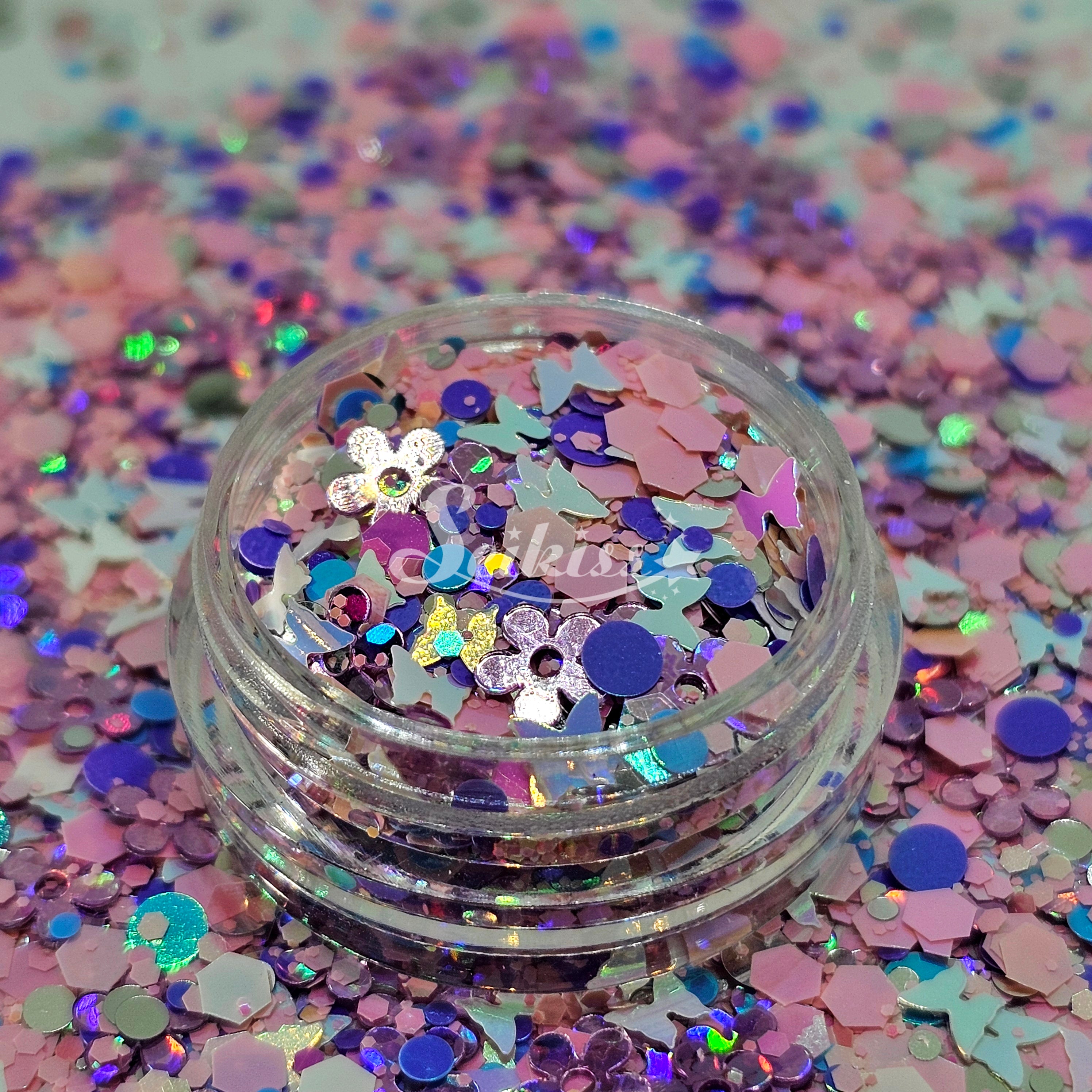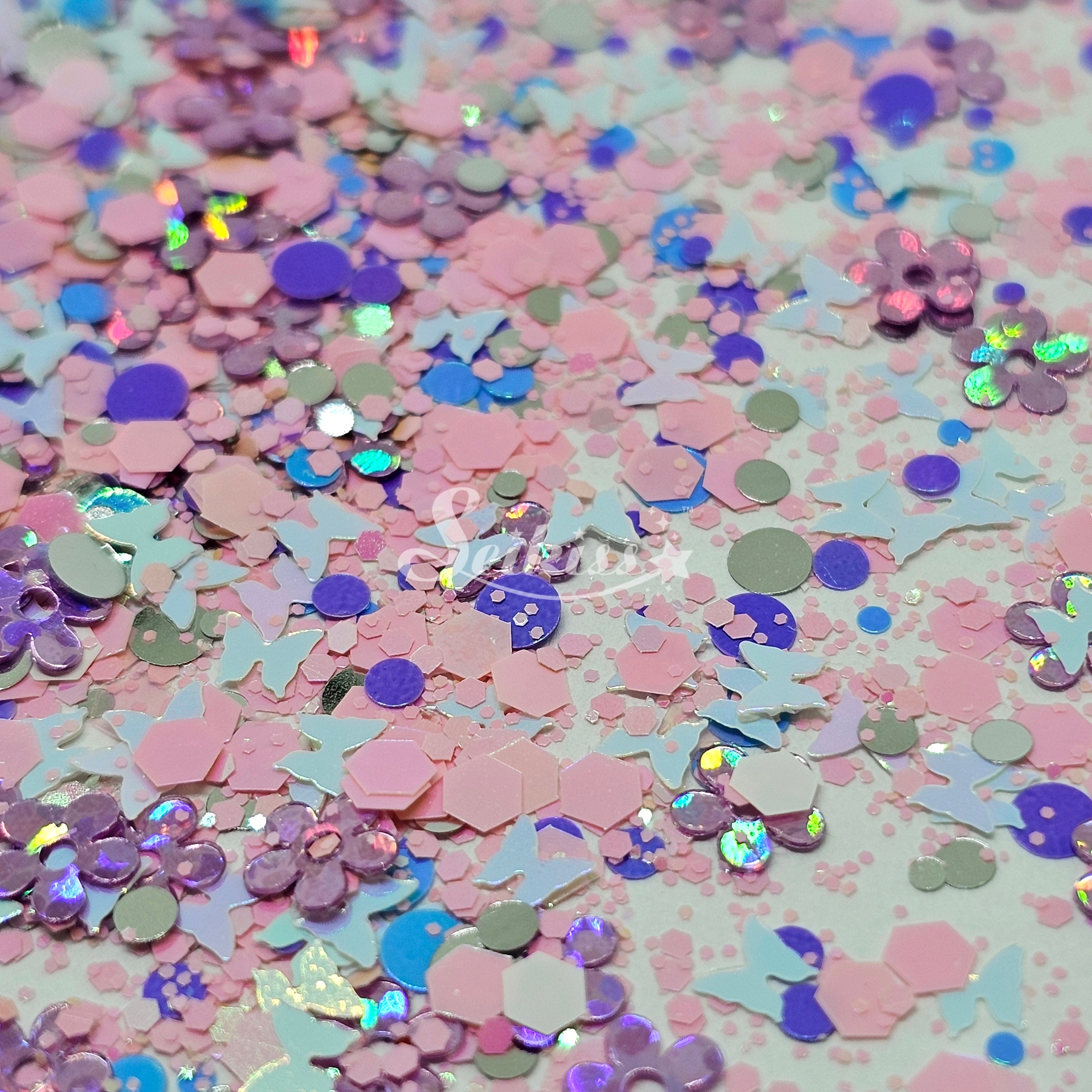 Anastasia is a unique custom mix of purple flowers, iridescent butterflies, soft pink, silver, and purple chunky mix, with blue dots.