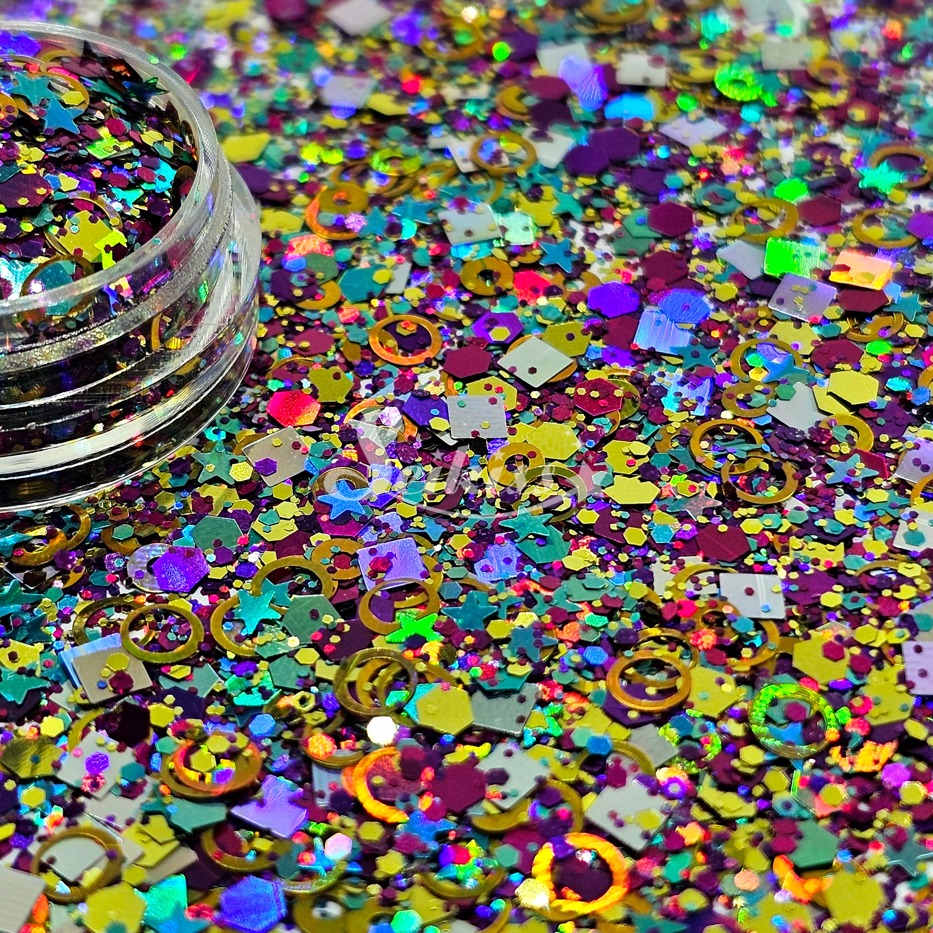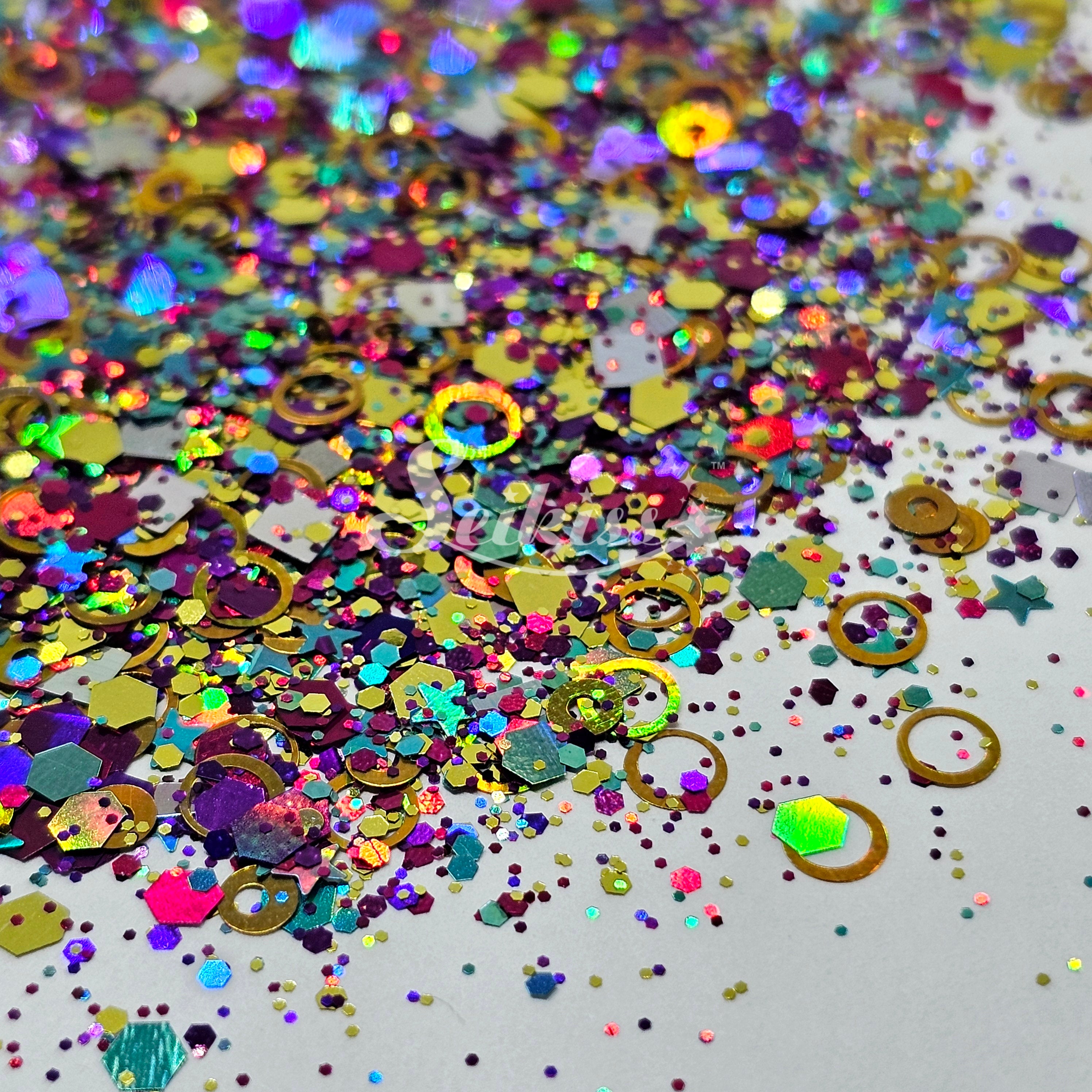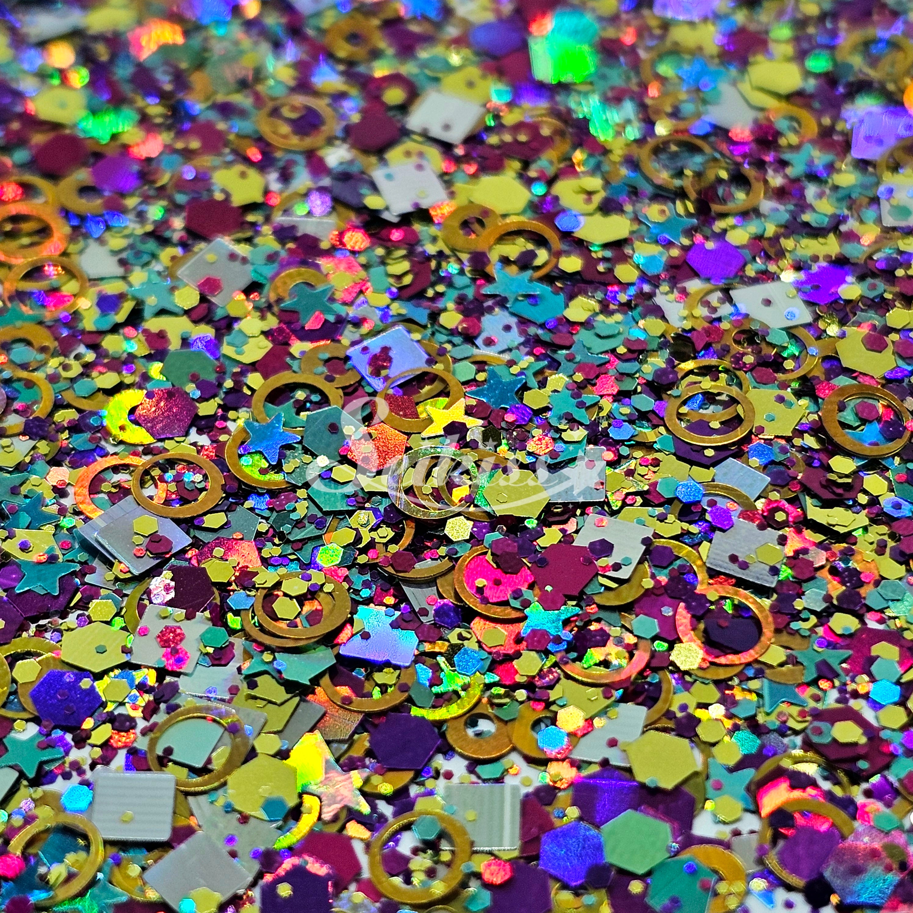 Arcade is a unique custom mix packed with a vibrant retro style. In this mix, you can find gold circles, turquoise stars, silver squares, and a holographic purple and blue chunky mix.