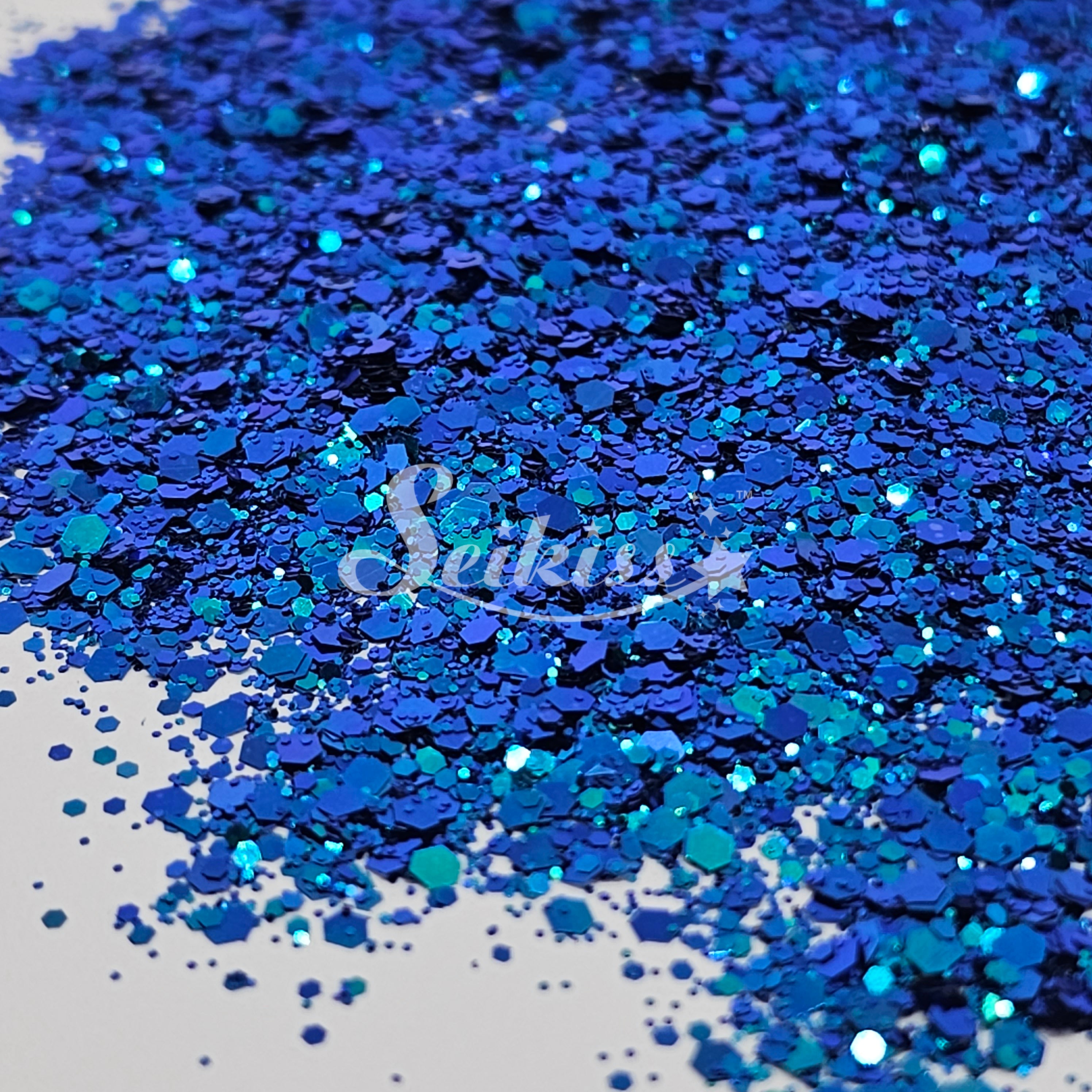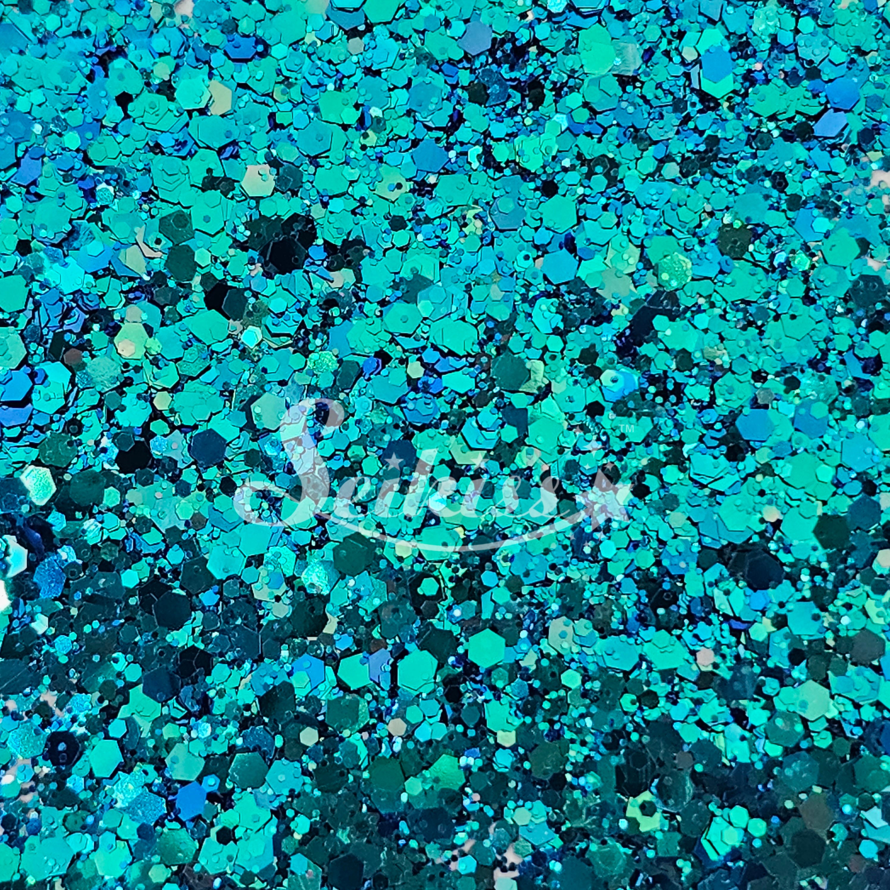 Atlantis Small Chunky Glitter Mix is a color shift from dark blue to turquoise hues, perfect for resin, nails, tumblers, jewelry, arts, and all types of crafts and projects.