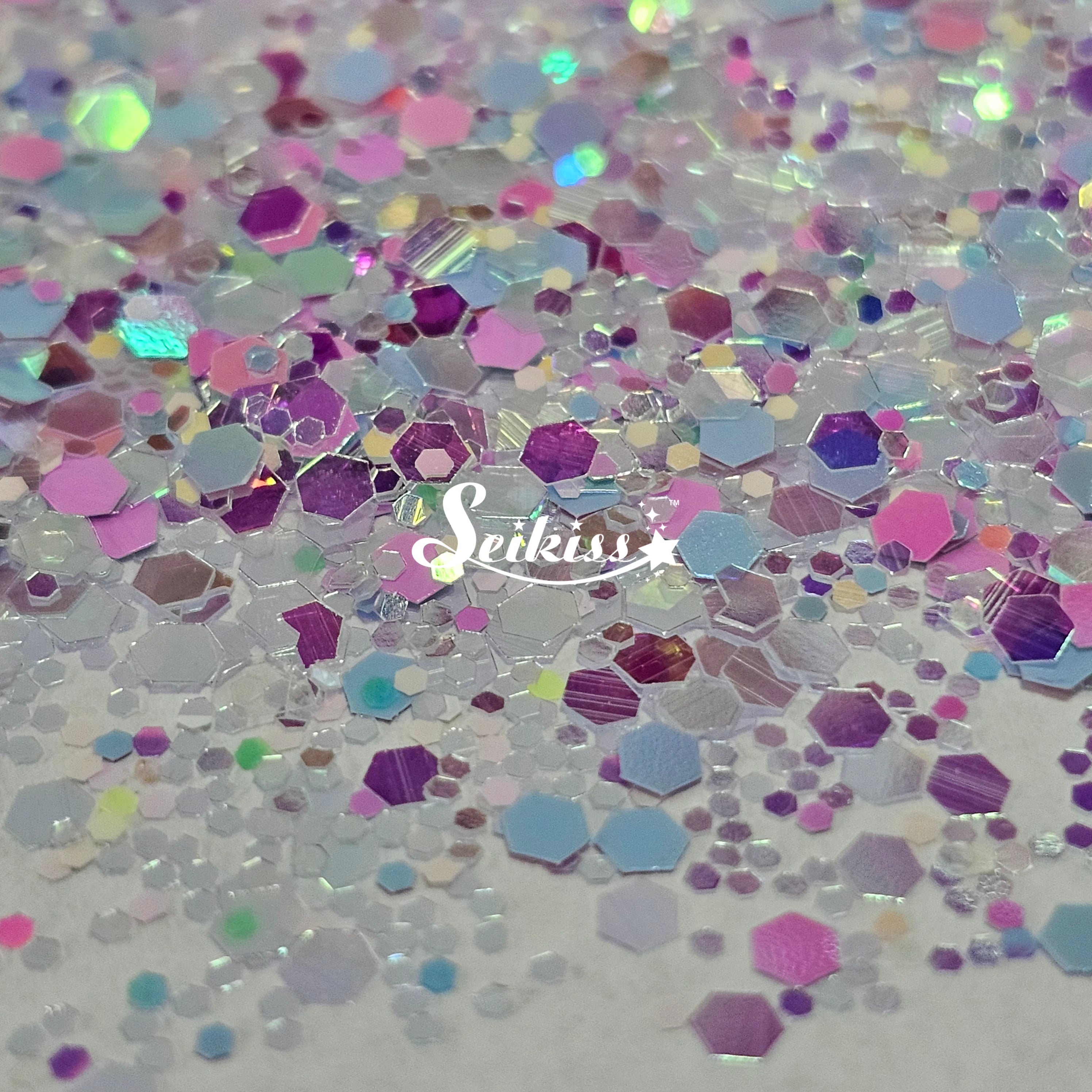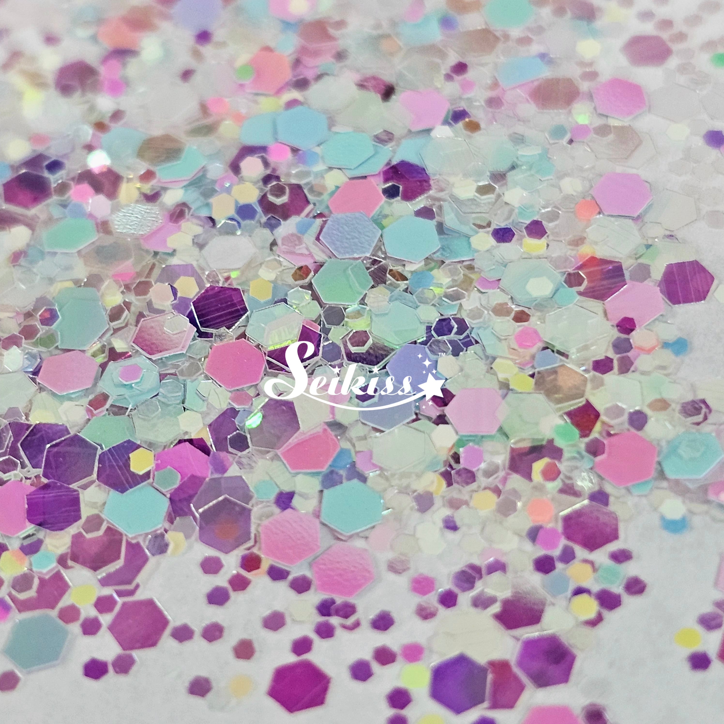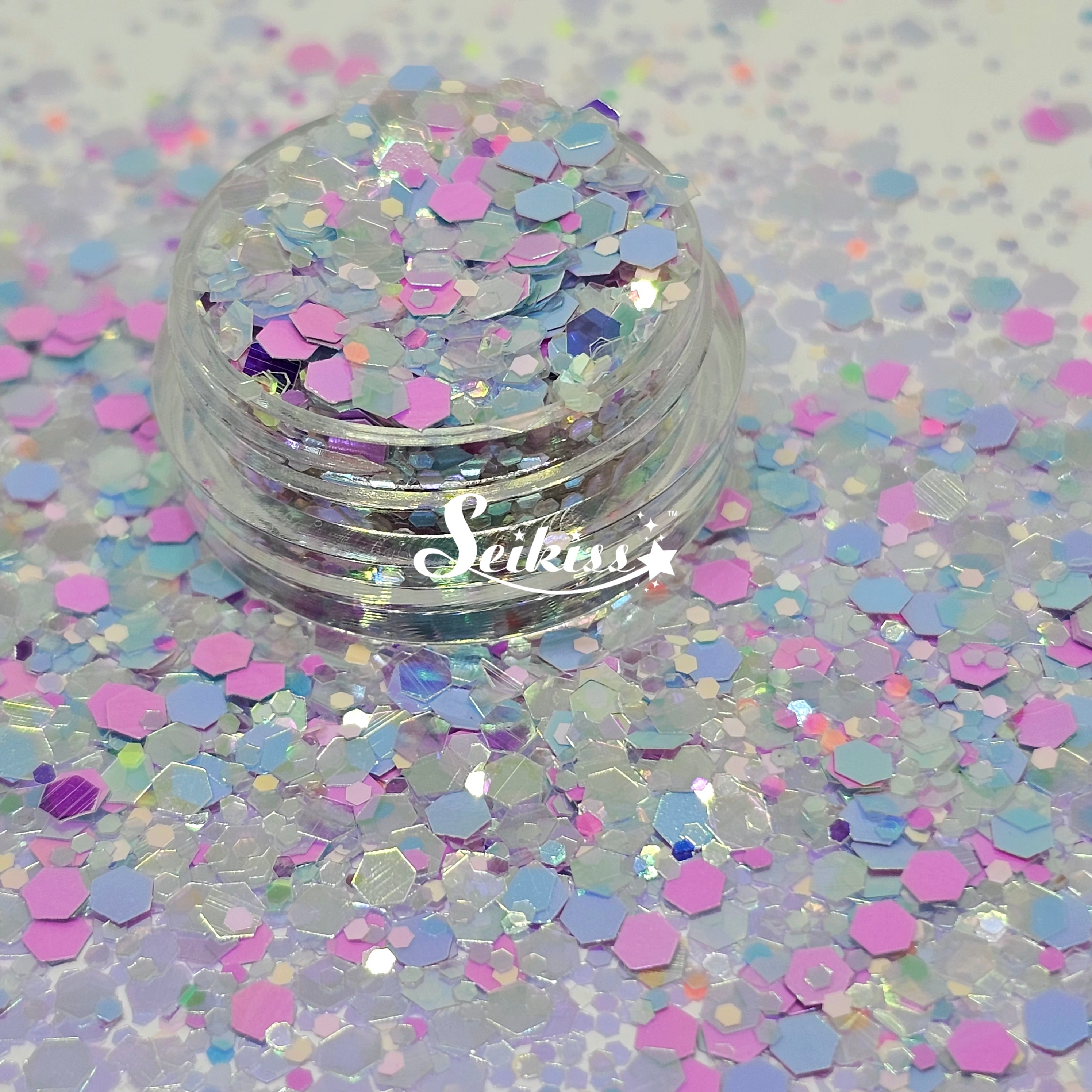 Birthday Fun Glitter is a chunky mix of pink and purple with silver mirror like sparkles adding a stunning visual effect to your project with an iridescent finish. You can see the colors darkening depending on the angle you look at it.