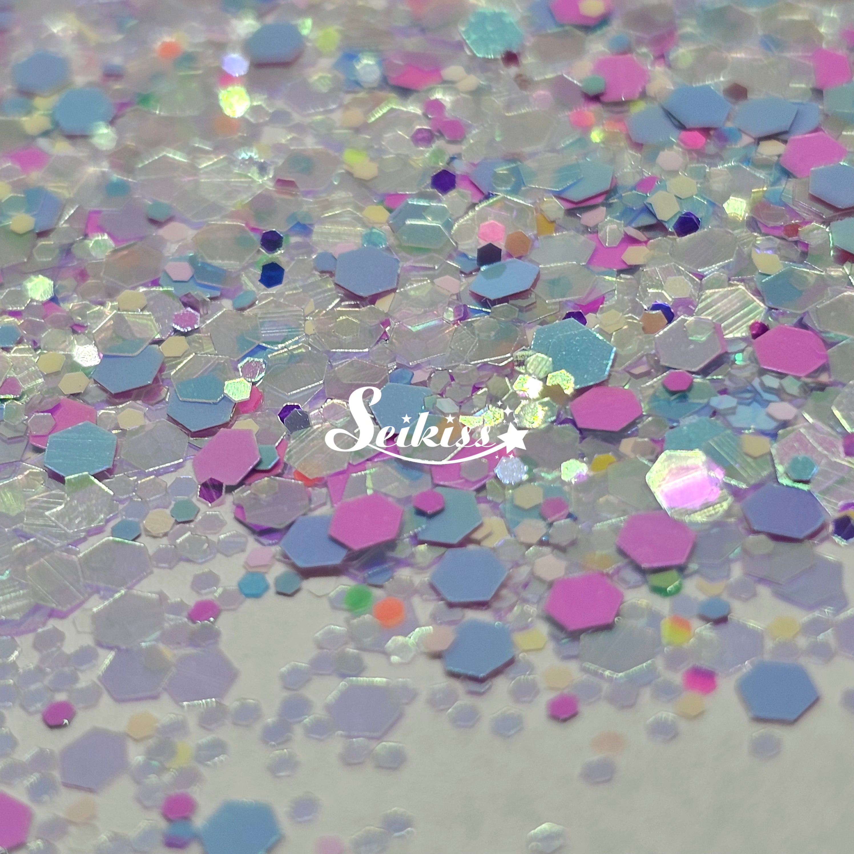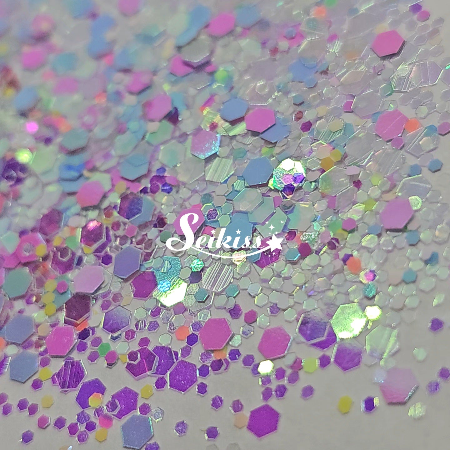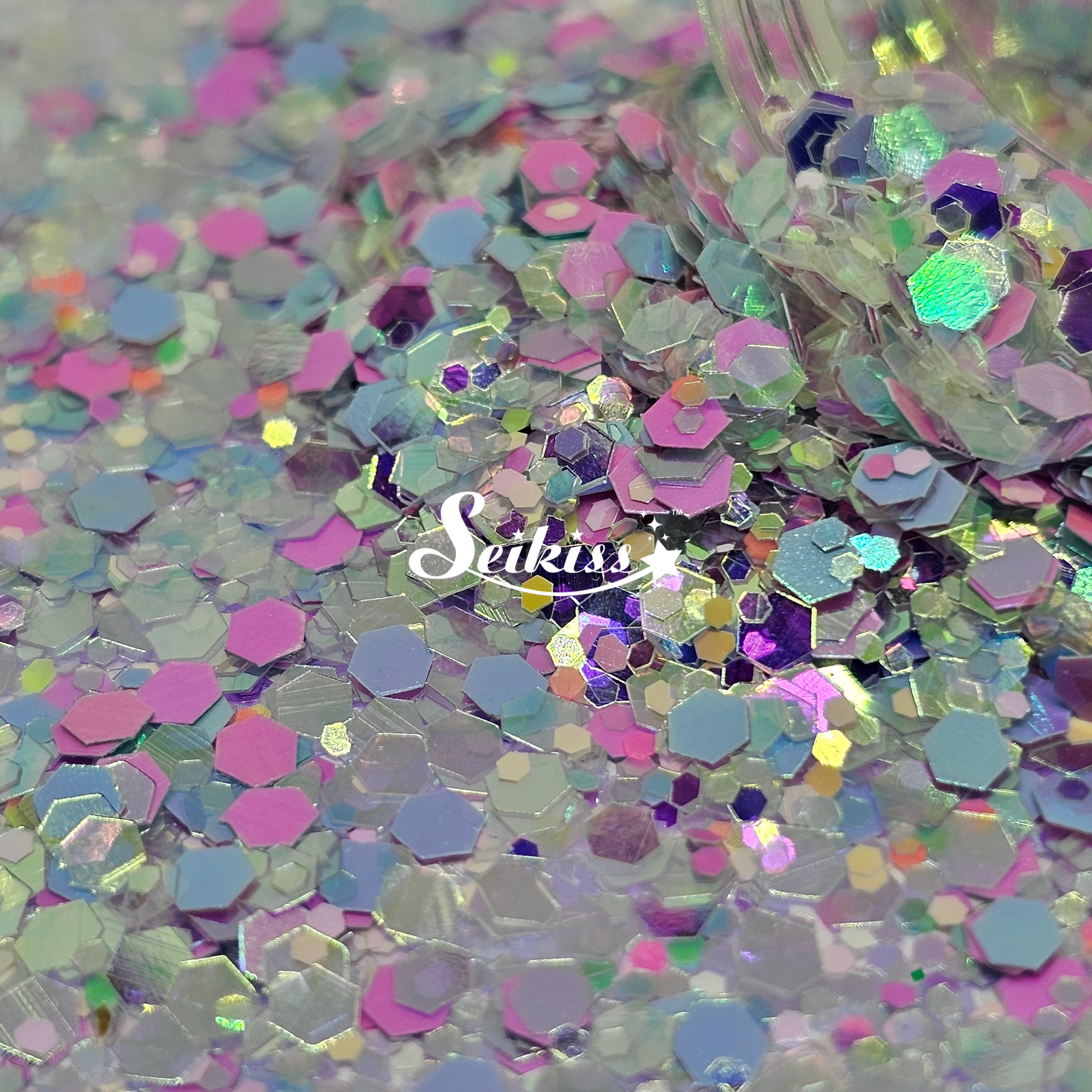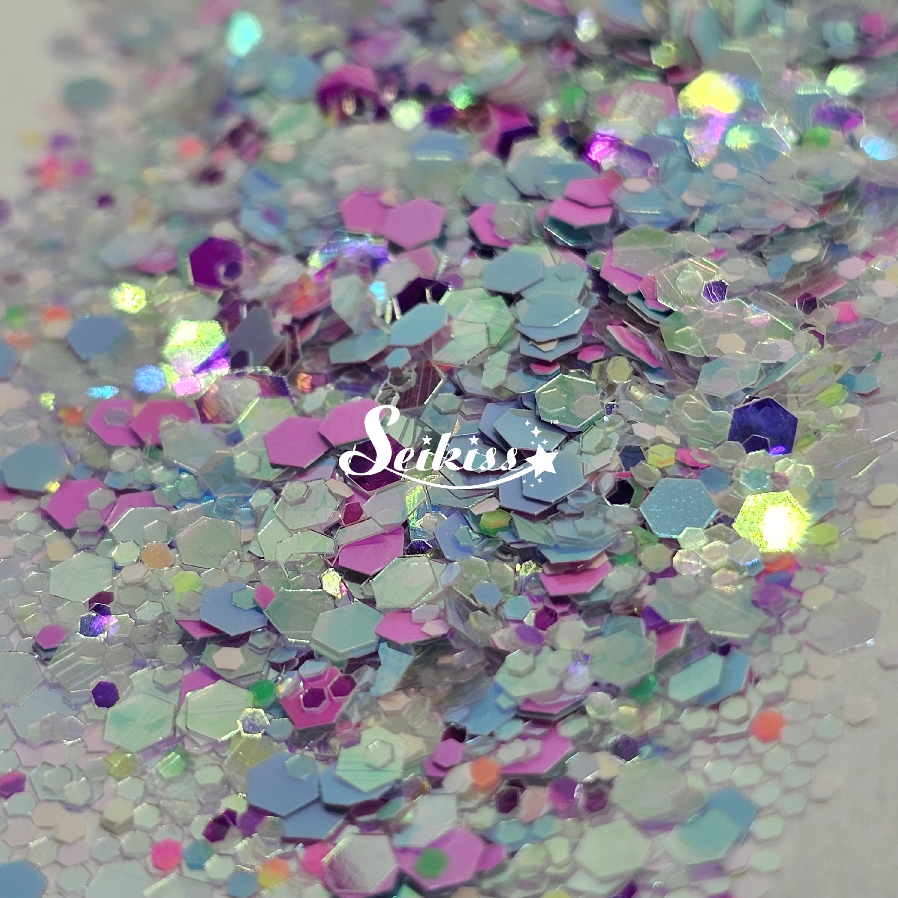 Birthday Fun Glitter is a chunky mix of pink and purple with silver mirror like sparkles adding a stunning visual effect to your project with an iridescent finish. You can see the colors darkening depending on the angle you look at it.