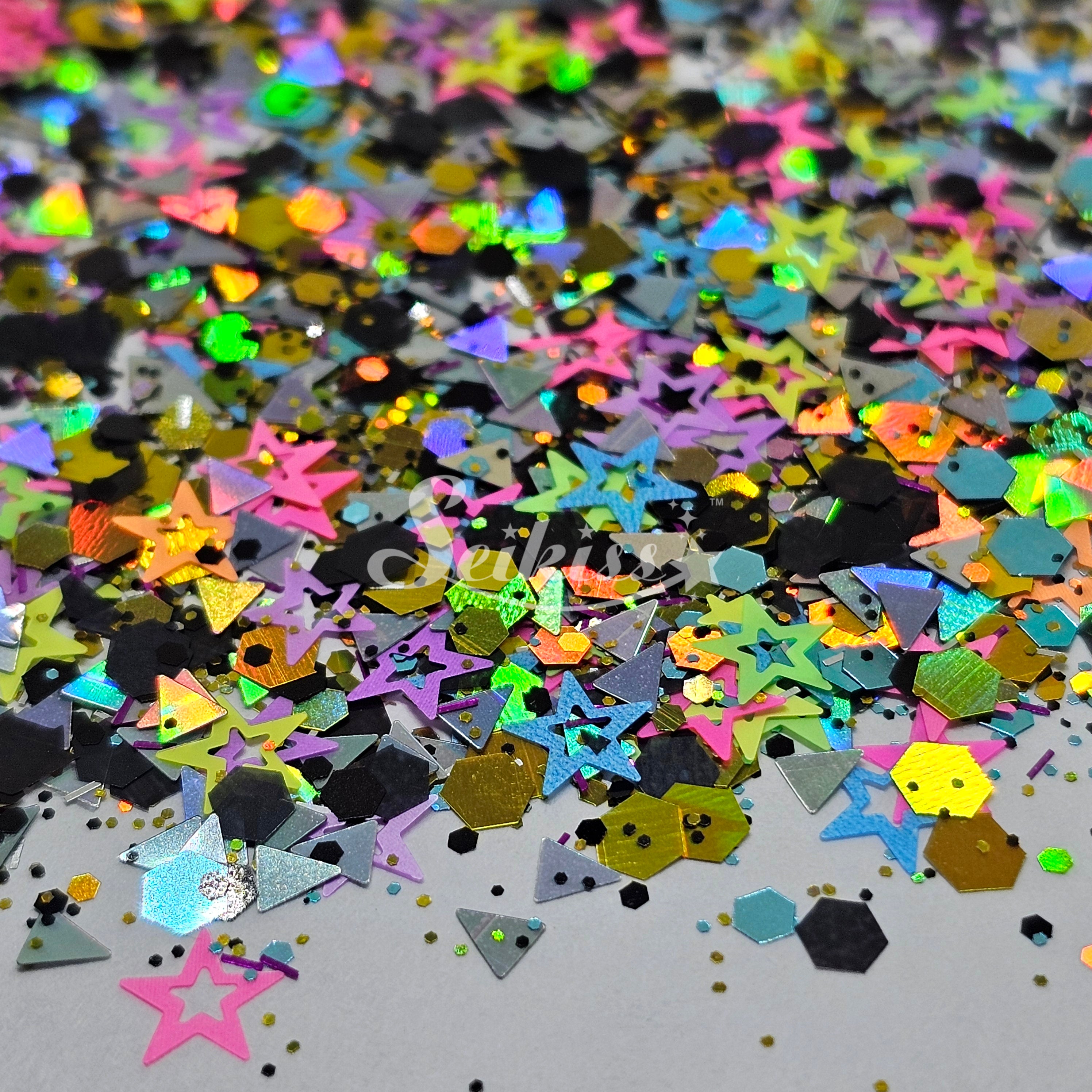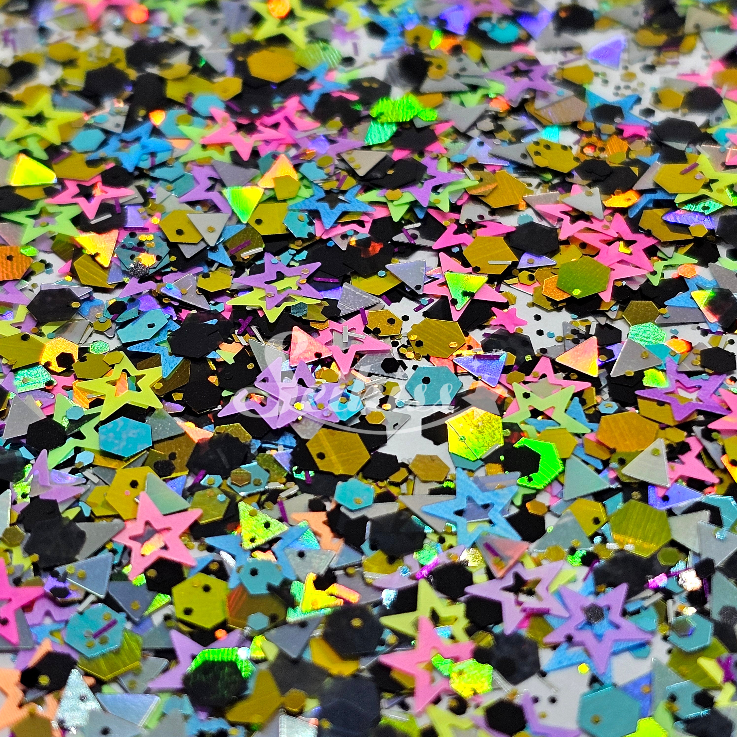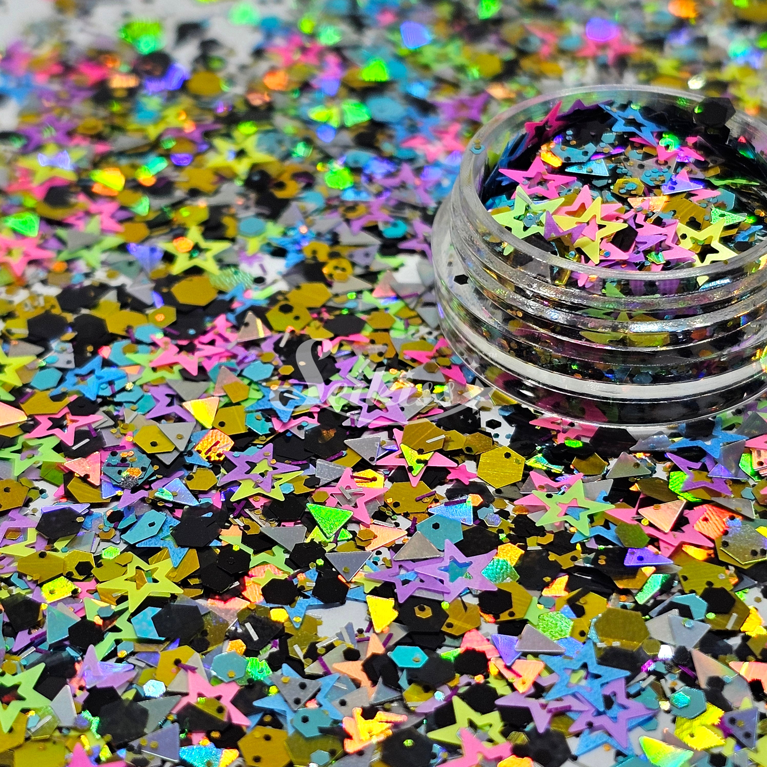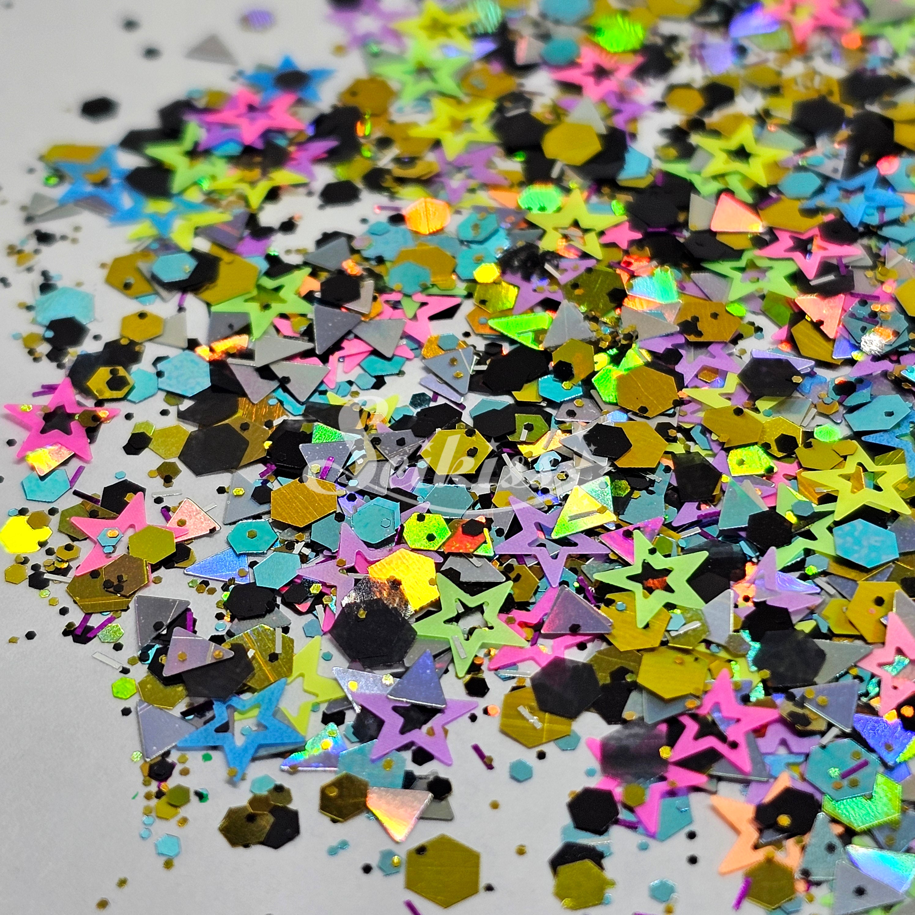 Blast from the Past is a unique custom mix packed with a shiny retro style. In this mix you can find the classic gold and black chunky mix colors, multicolor stars, silver triangles and blue. Perfect for all your projects like resin, nails, tumblers, jewelry, arts, and all types of crafts.