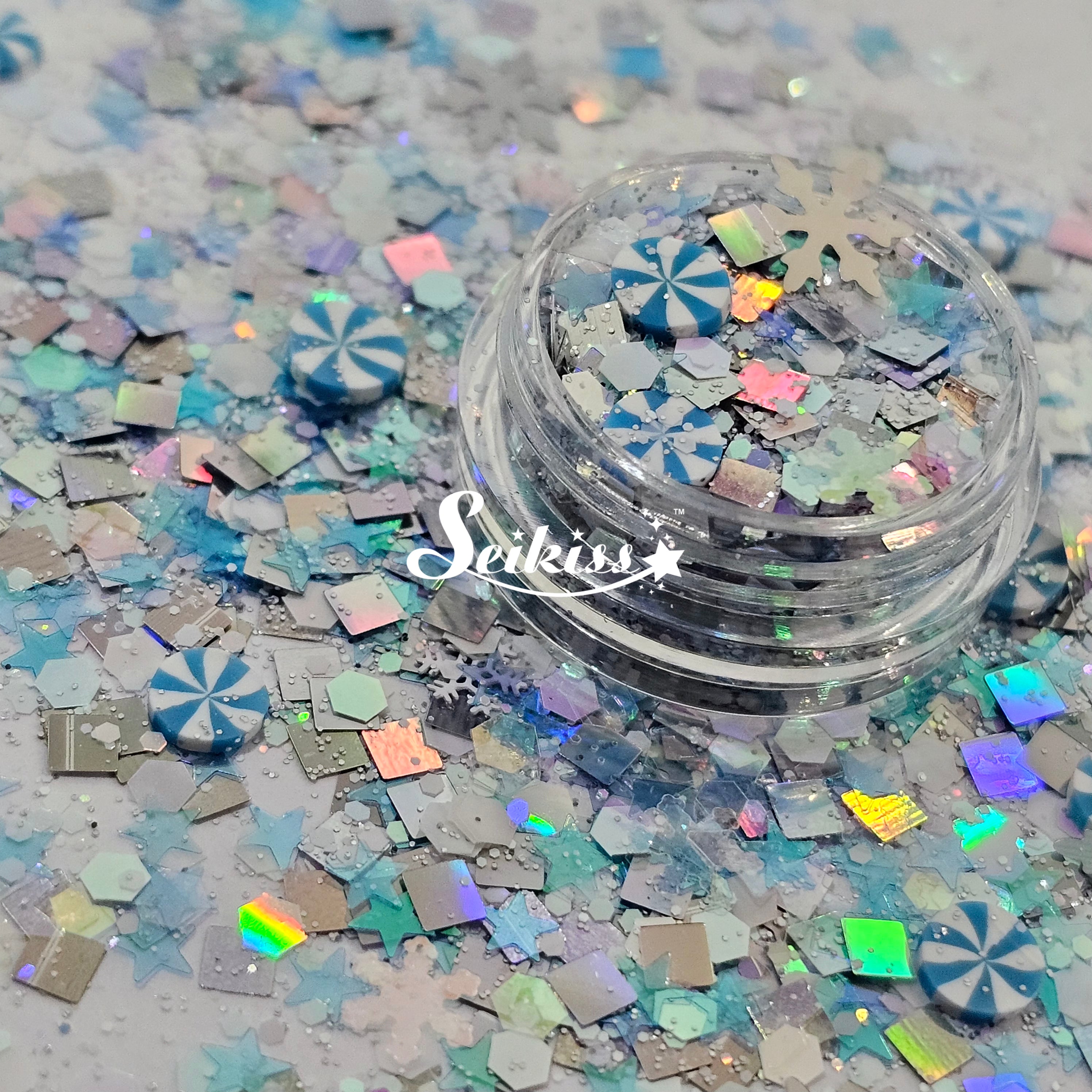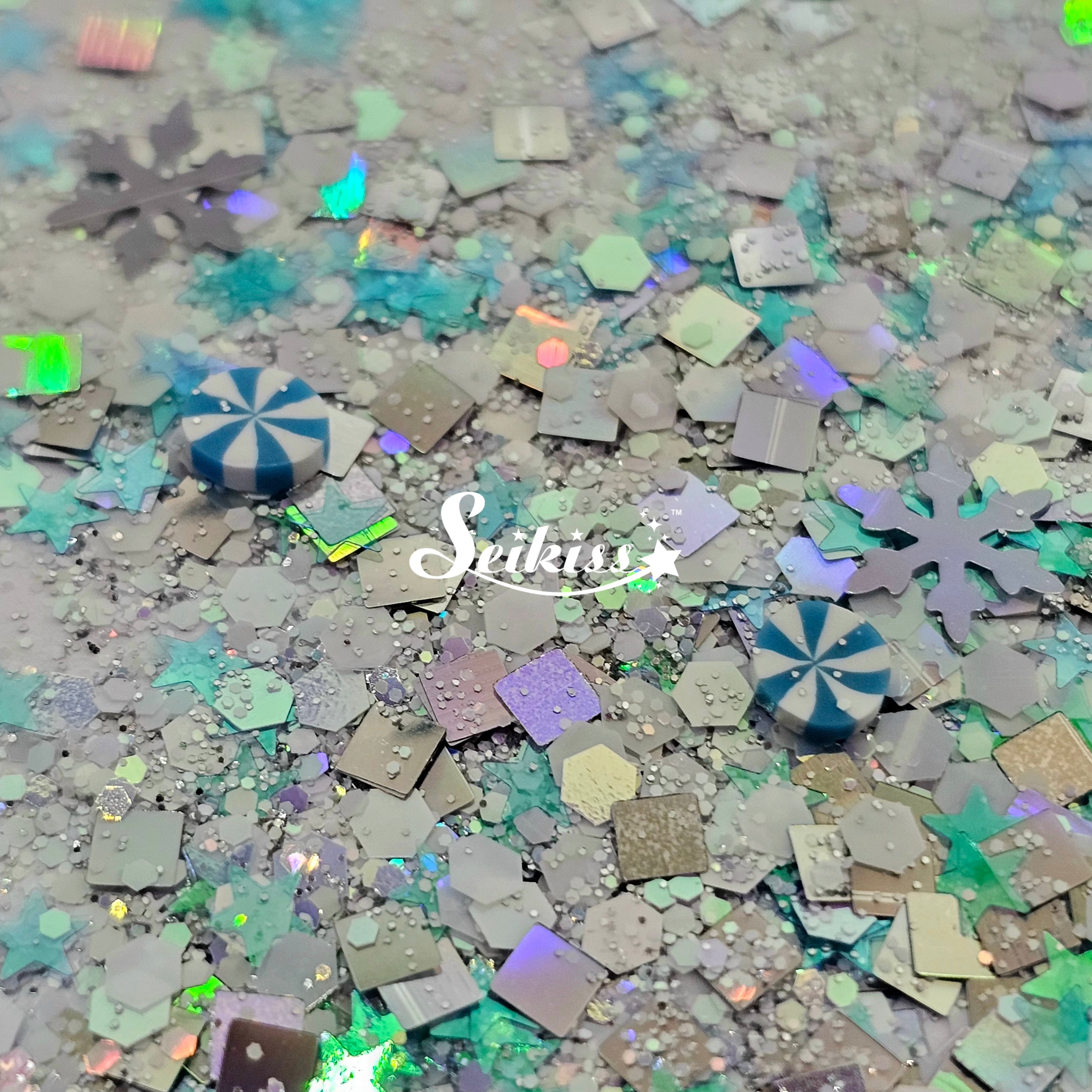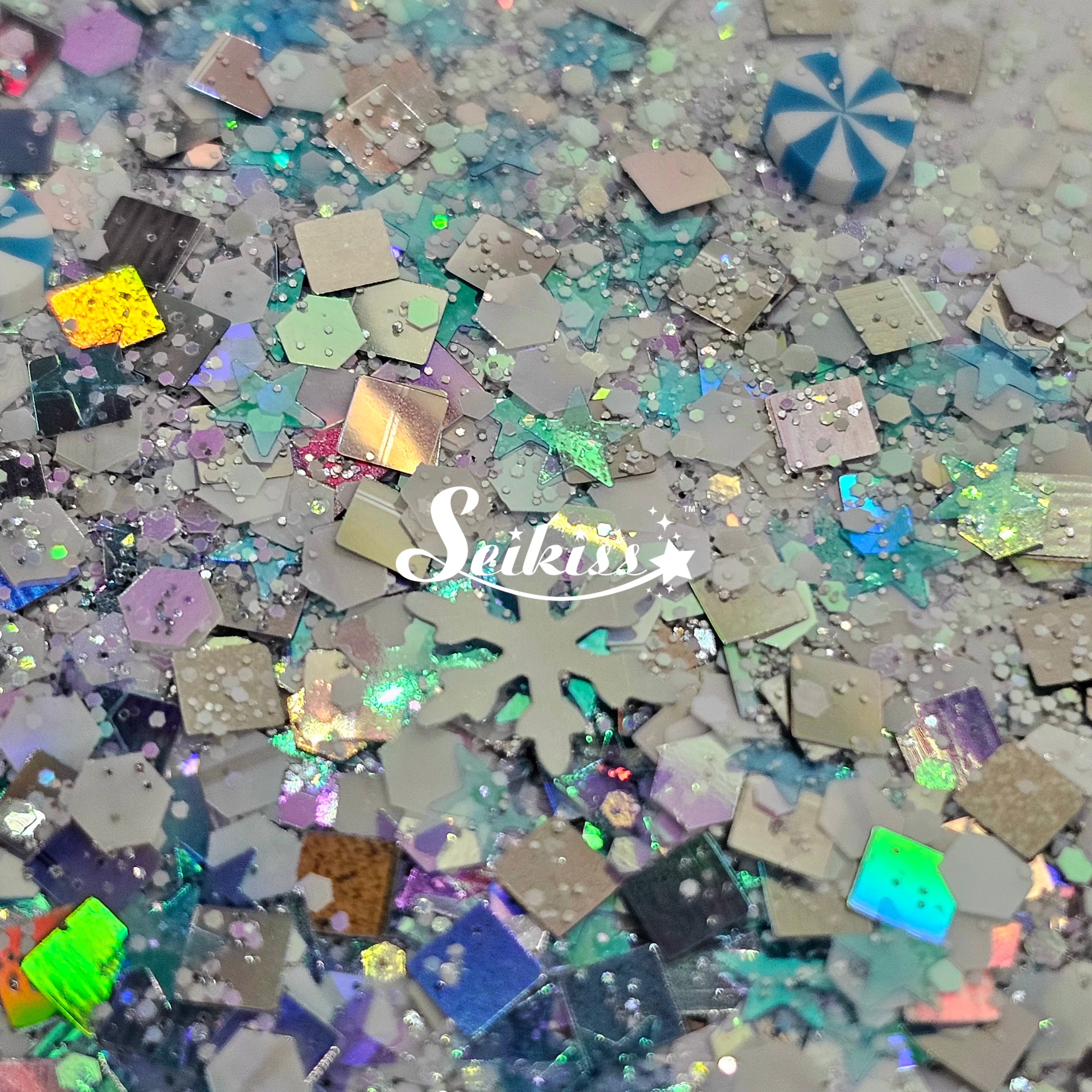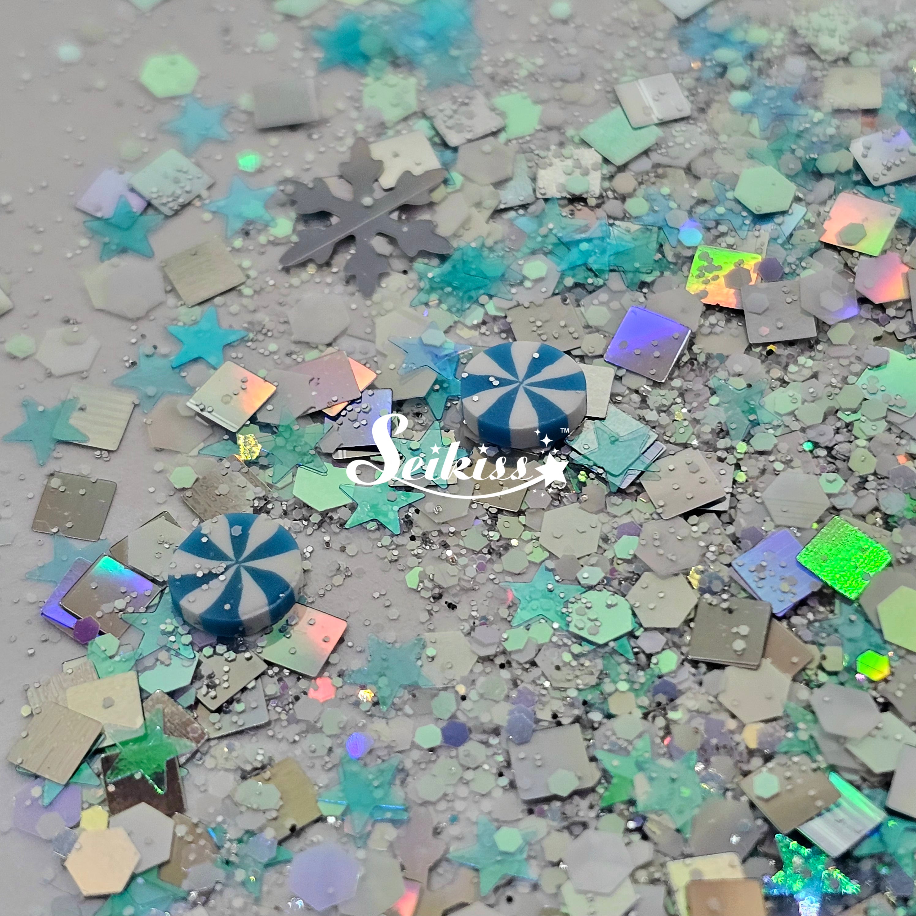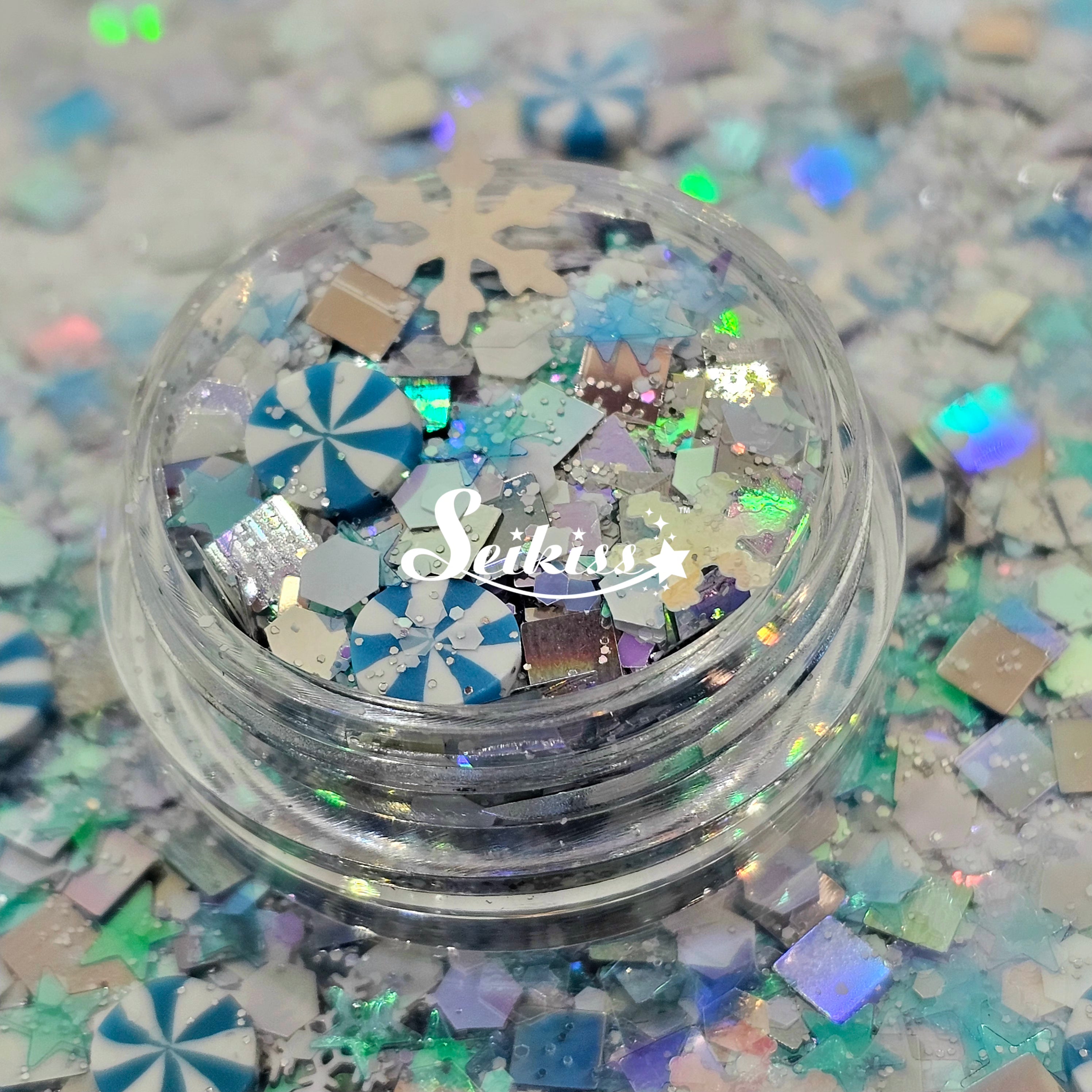 Blizzard is a custom mix of holographic white and silver. Turquoise stars, iridescent and silver snowflakes and blue candy mints. Adding a stunning visual effect to your artwork. You may also find some surprises in this lovely mix. This makes your projects shine and is perfect for nails, resin, tumblers, jewelry, arts, and all types of crafts and projects.