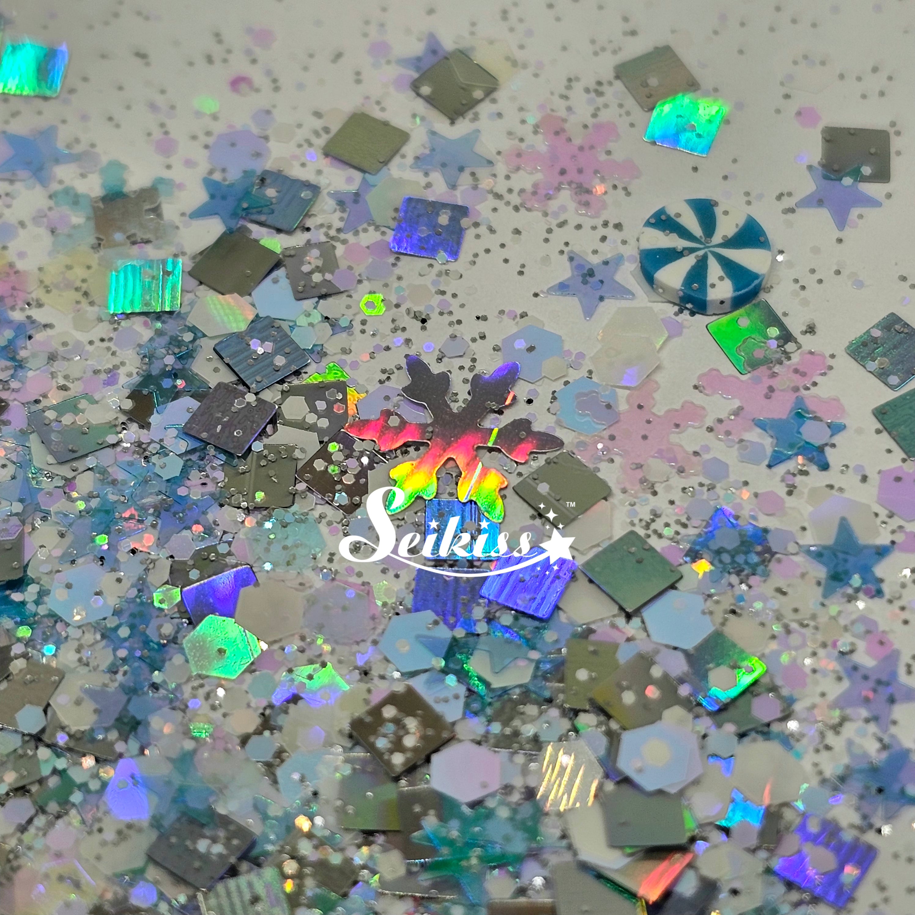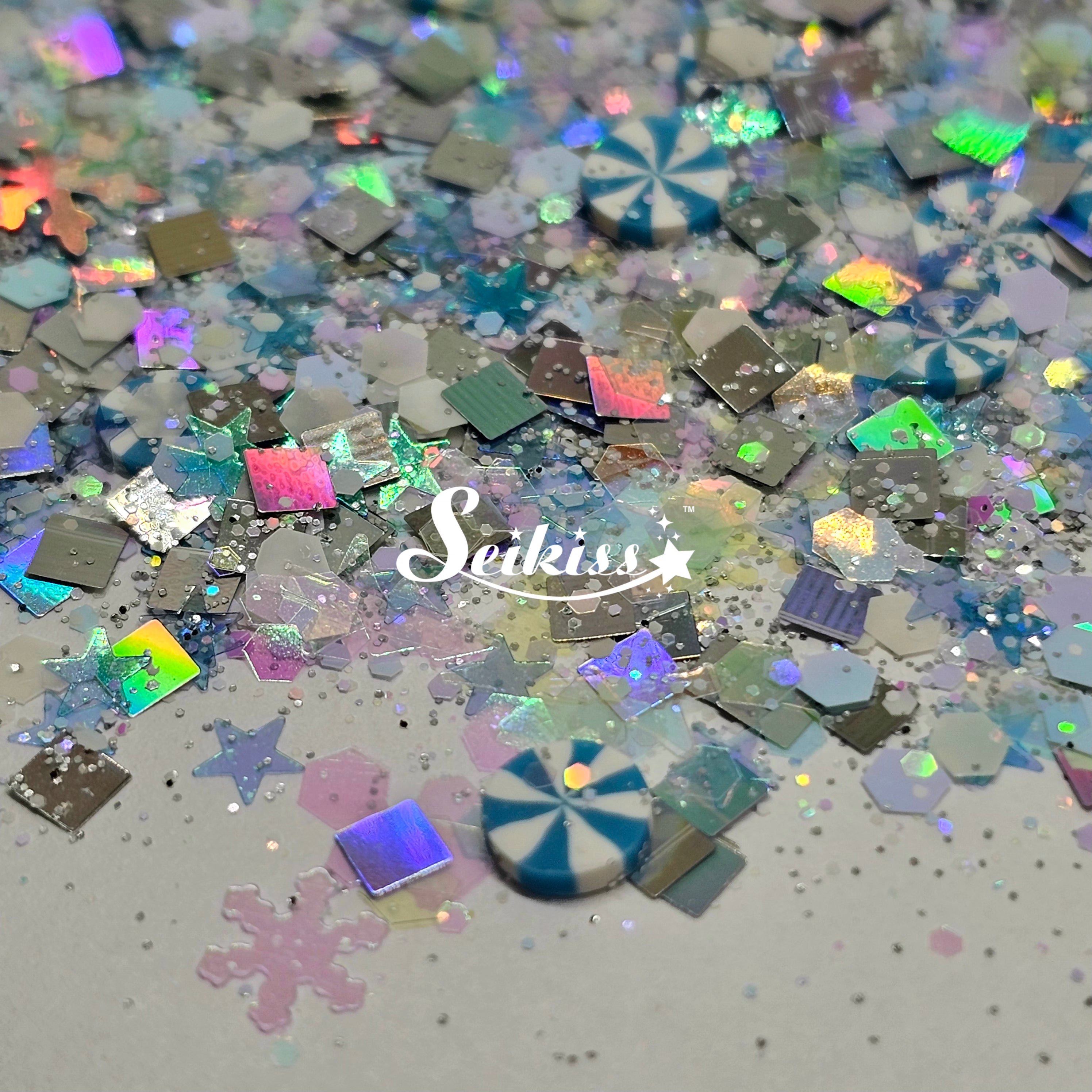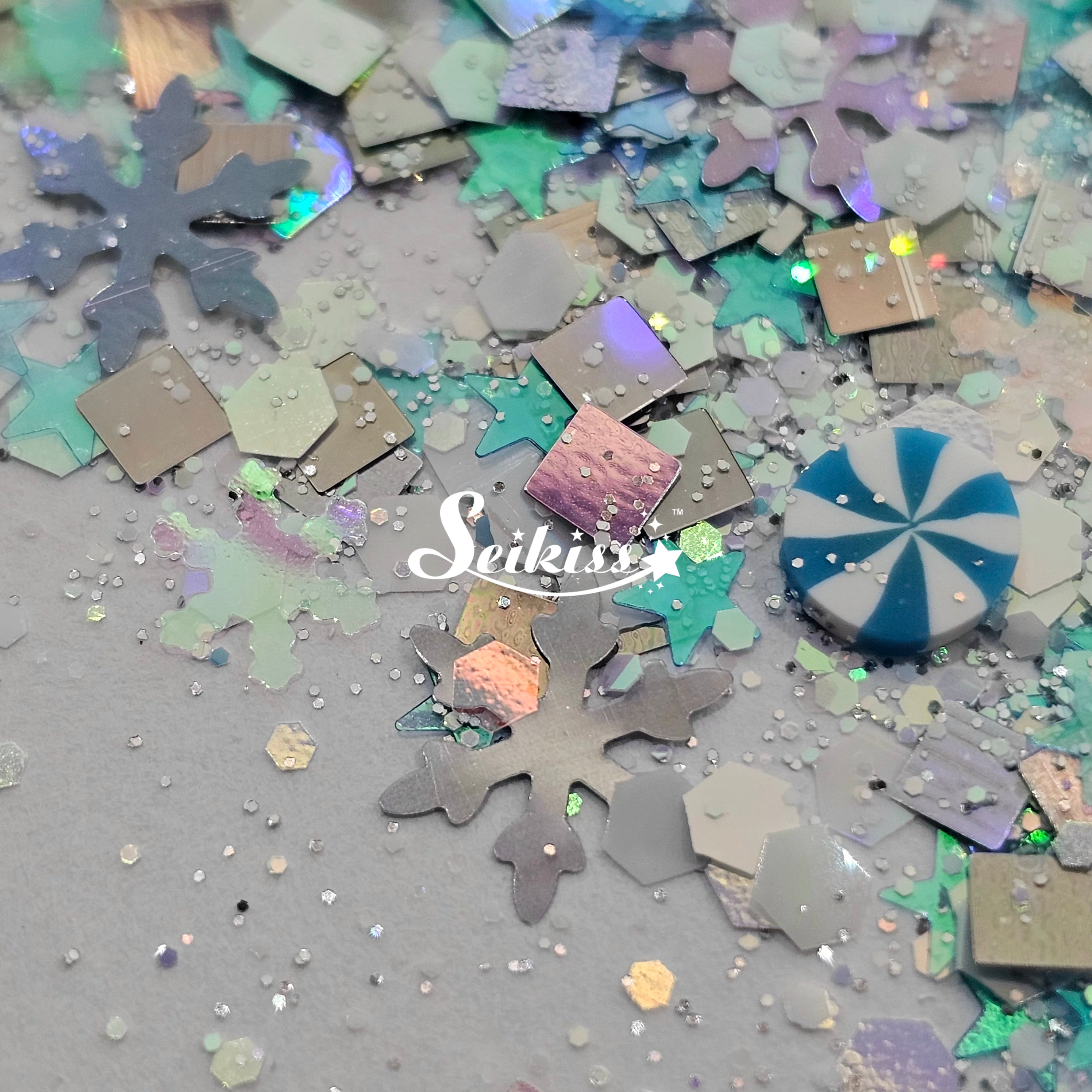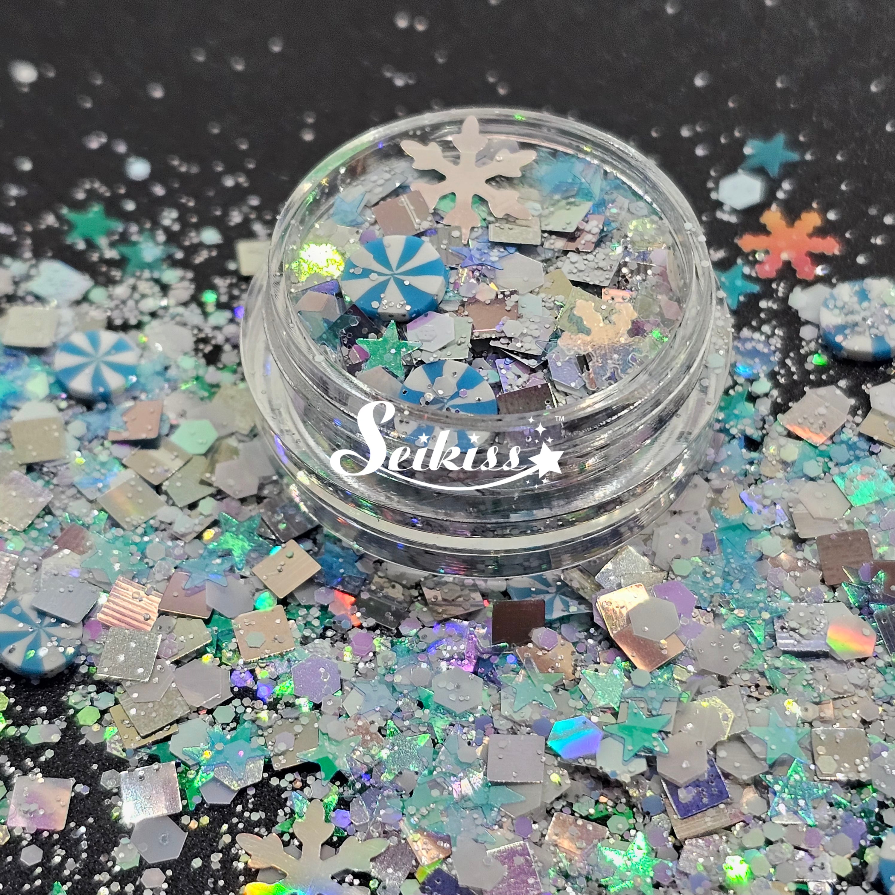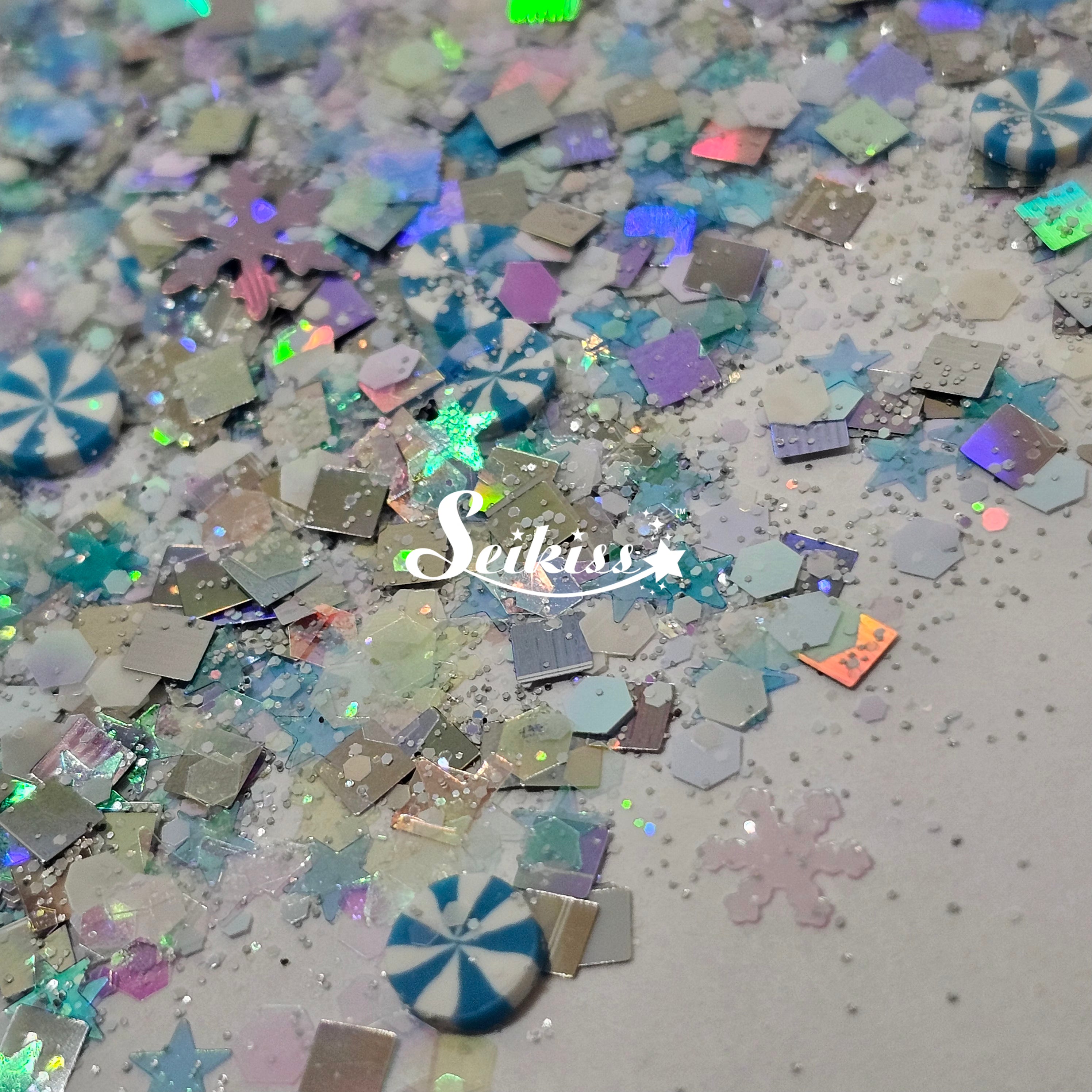 Blizzard is a custom mix of holographic white and silver. Turquoise stars, iridescent and silver snowflakes and blue candy mints. Adding a stunning visual effect to your artwork. You may also find some surprises in this lovely mix. This makes your projects shine and is perfect for nails, resin, tumblers, jewelry, arts, and all types of crafts and projects.