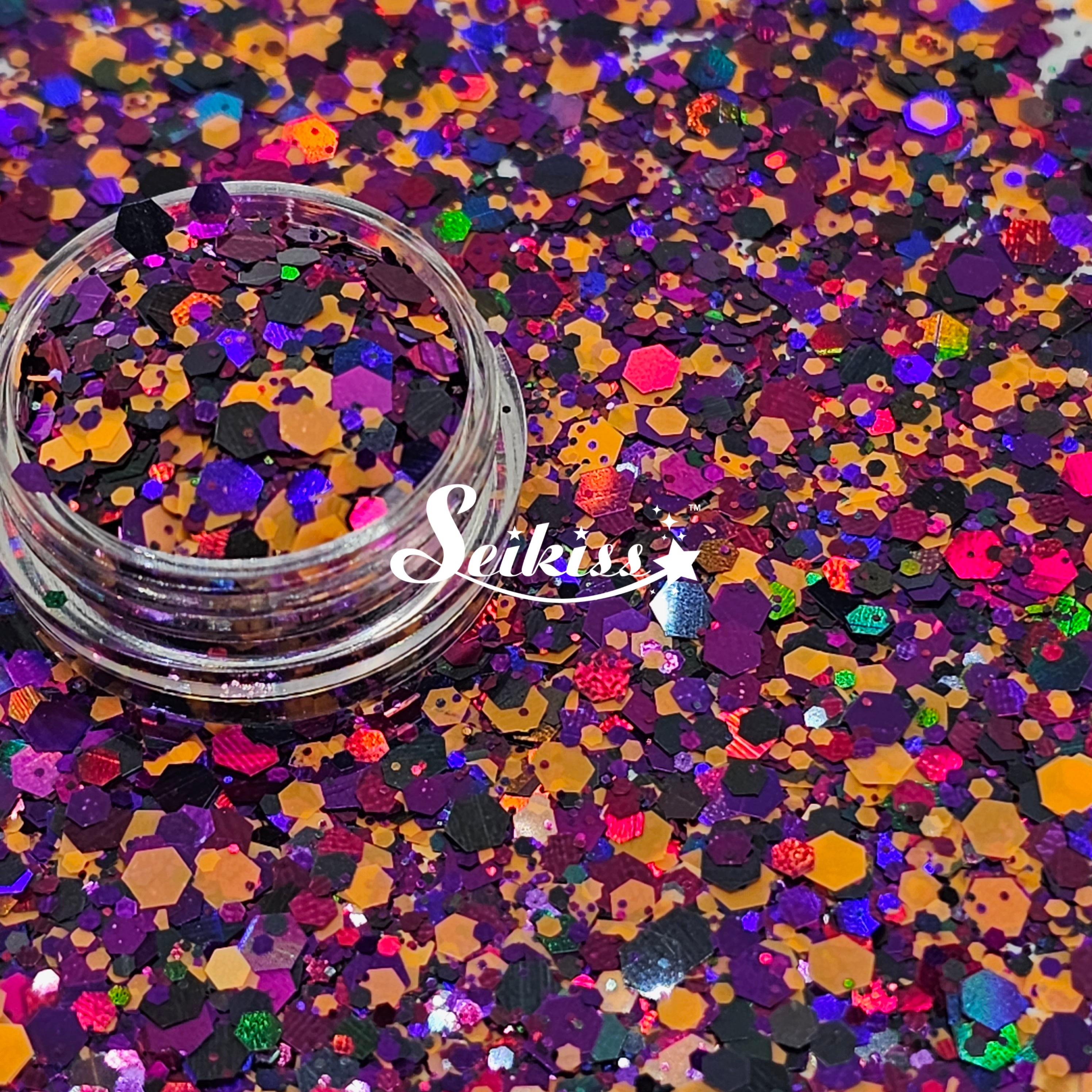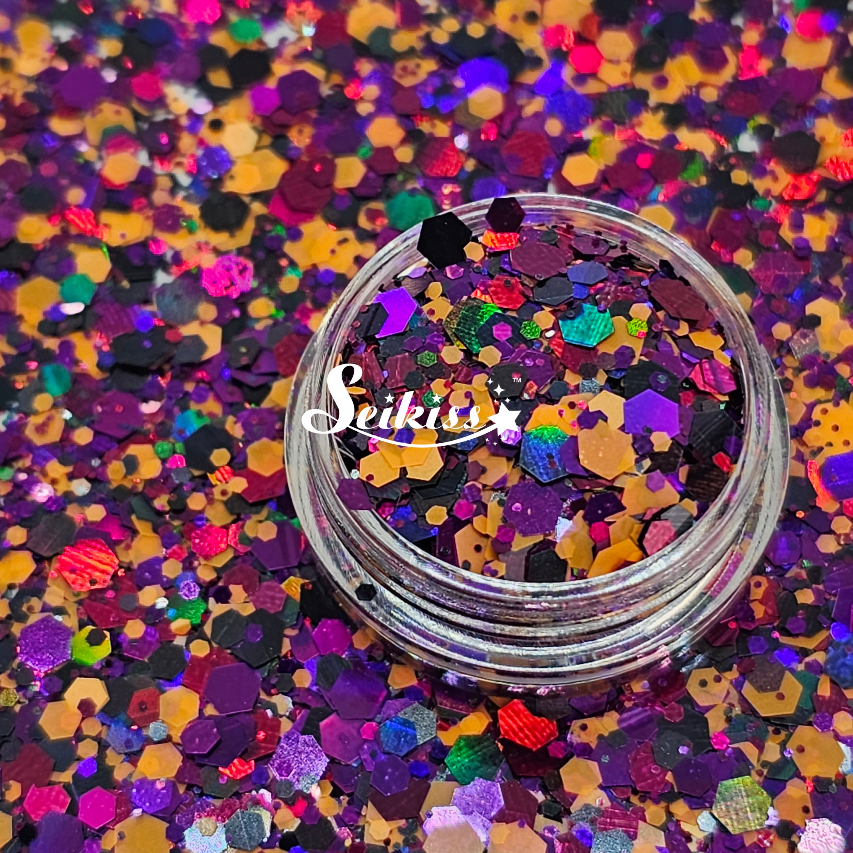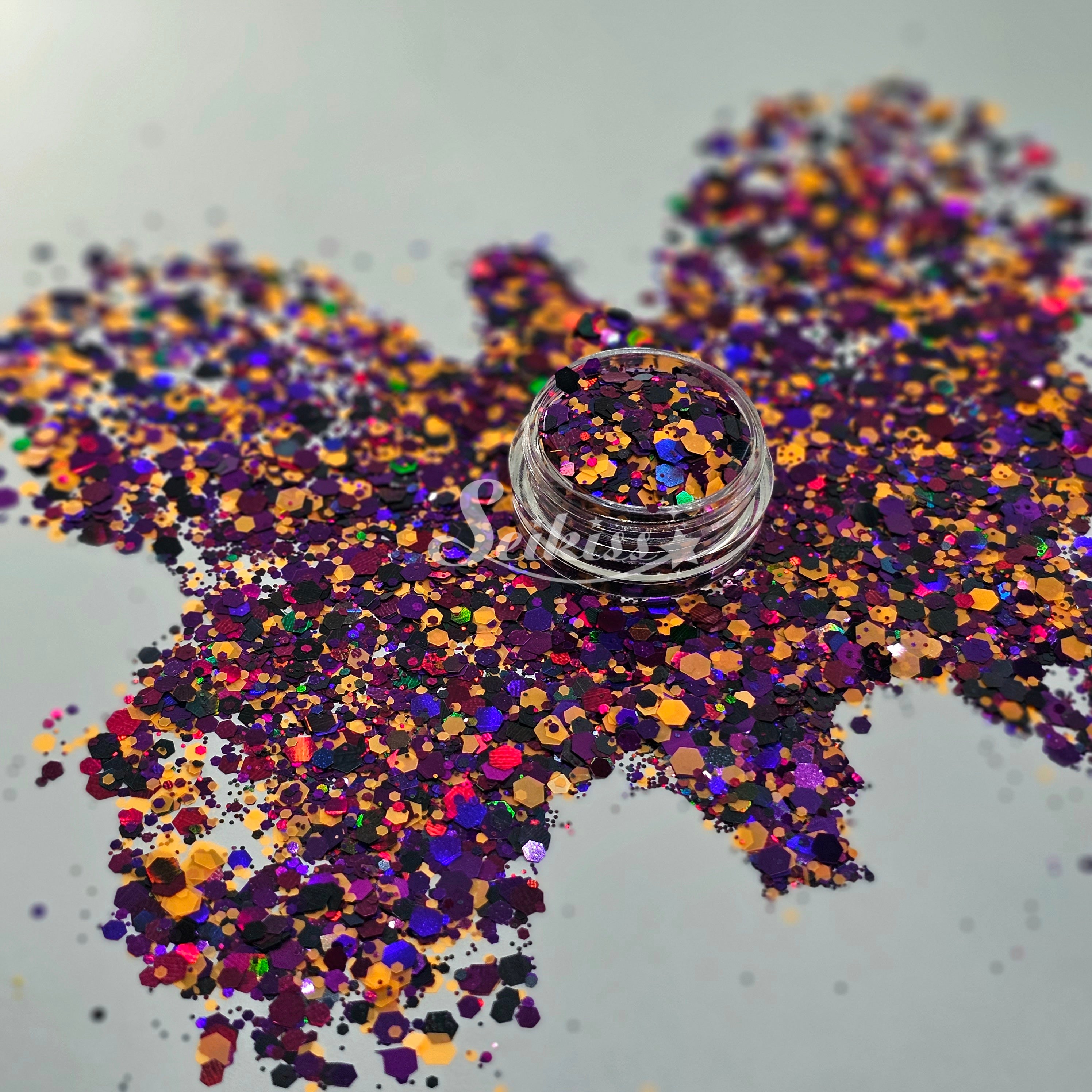 Butterfly Effect Chunky Glitter is a mix of purple, black and soft orange with a holographic finish adding a stunning visual effect to your artwork. This makes your projects shine and is perfect for resin, nails, tumblers, jewelry, arts, and all types of crafts and projects.