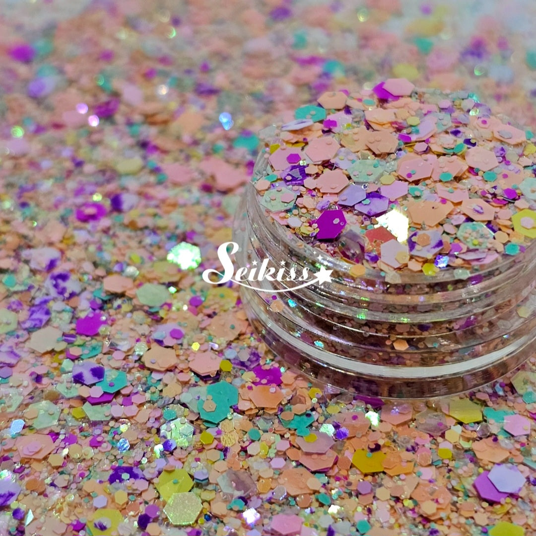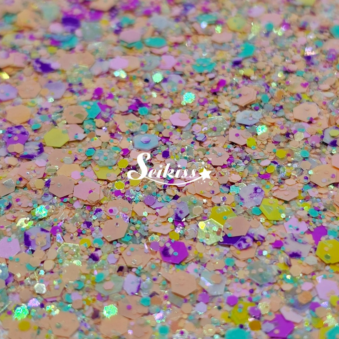 Chloe is a sparkly custom mix of soft orange, blue, purple, pink, and some yellow. This blend is perfect for nails, resin, tumblers, jewelry, arts, and all types of crafts and projects.