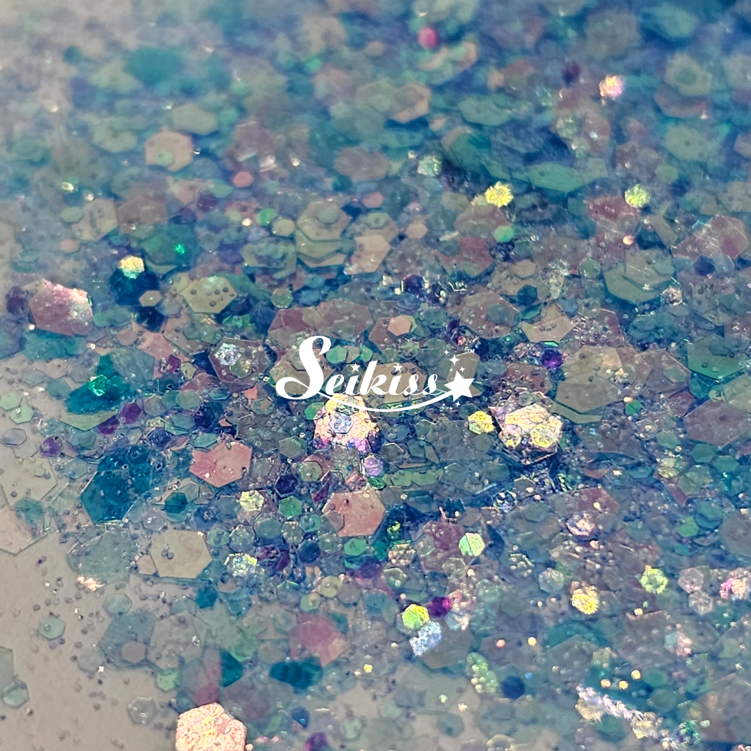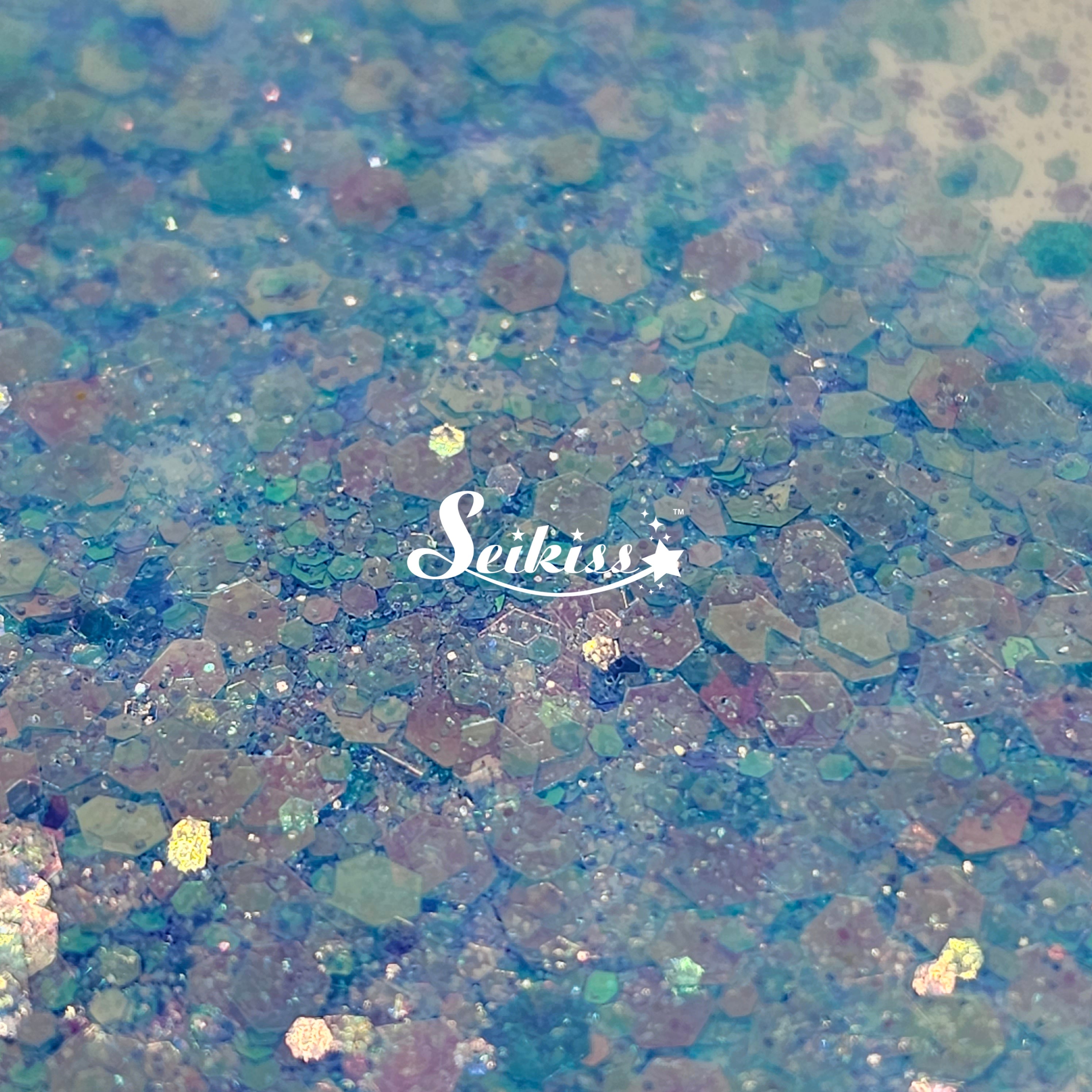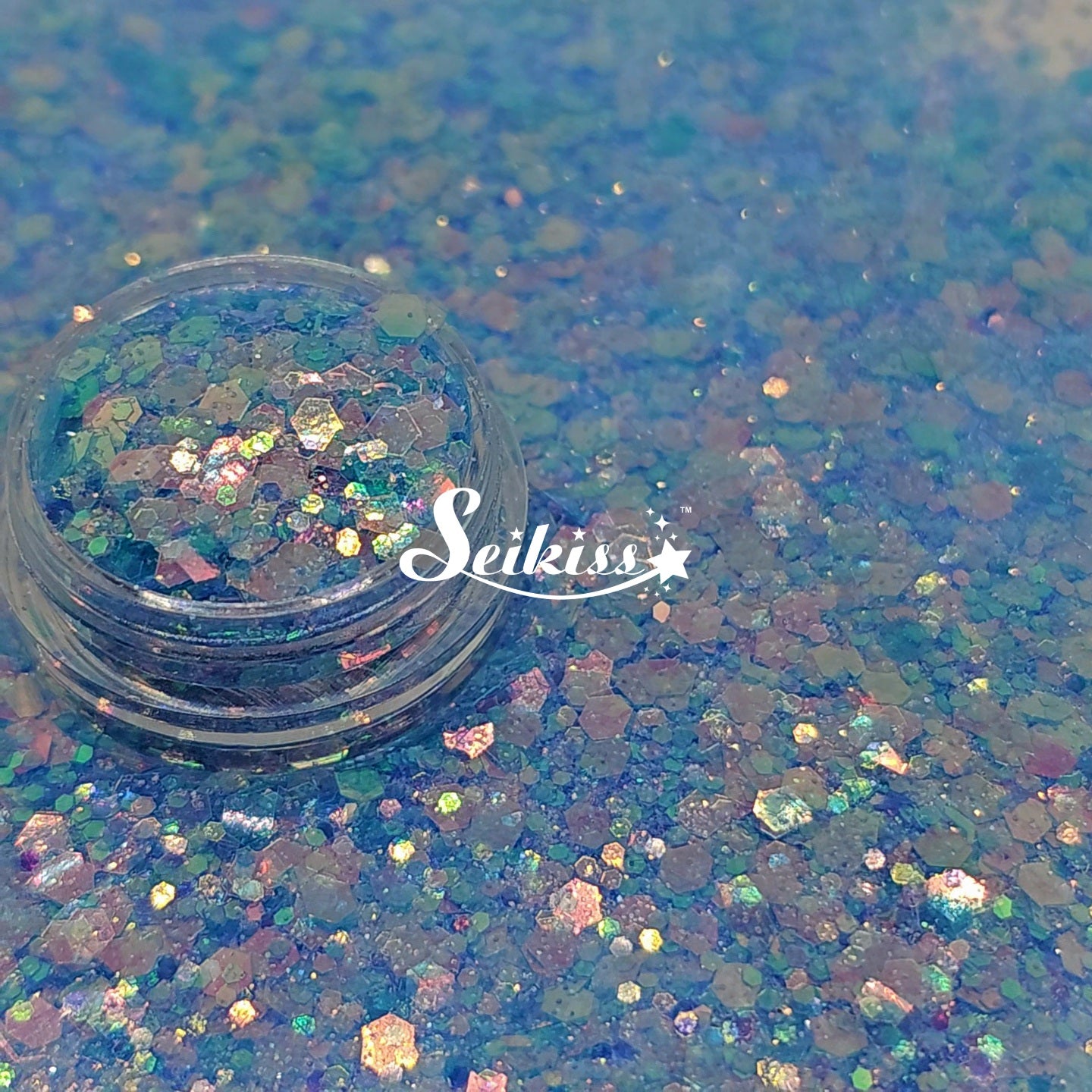 Cindy at Midnight has a colorful chunky mix of sparkle in a lovely blue, with an iridescent finish.
