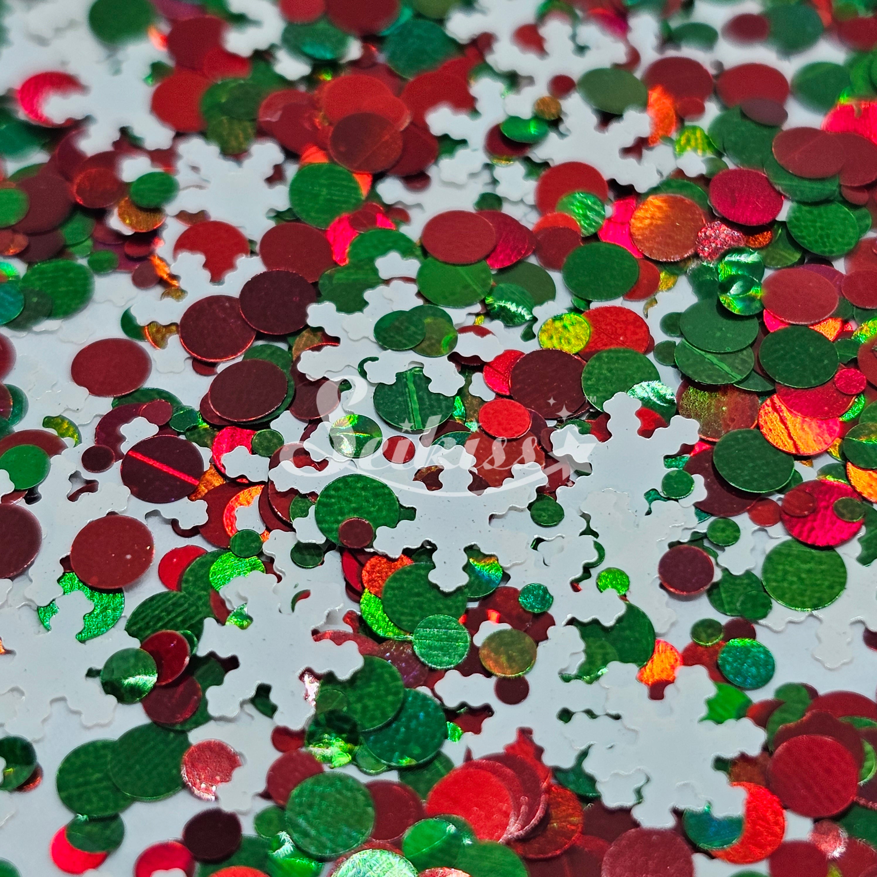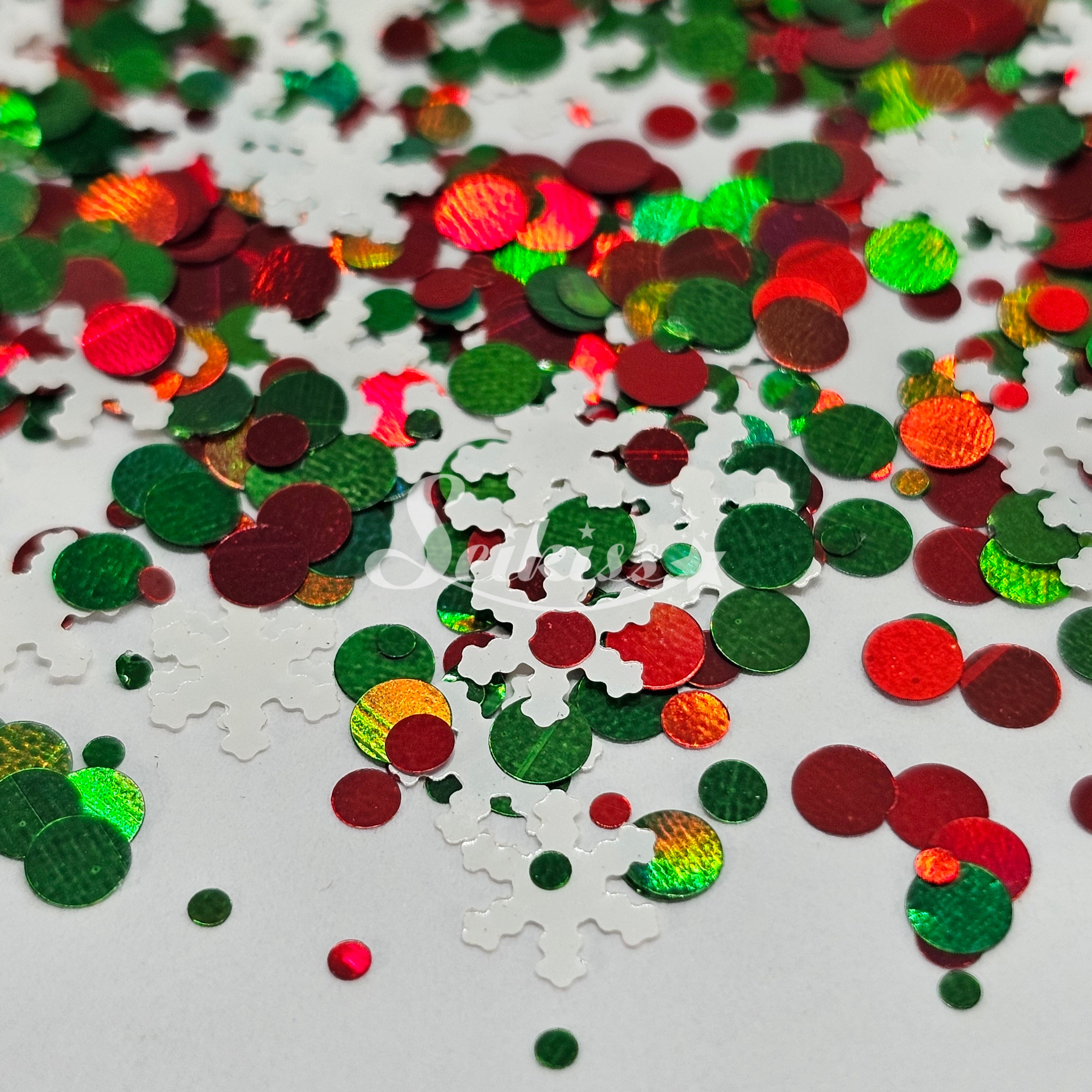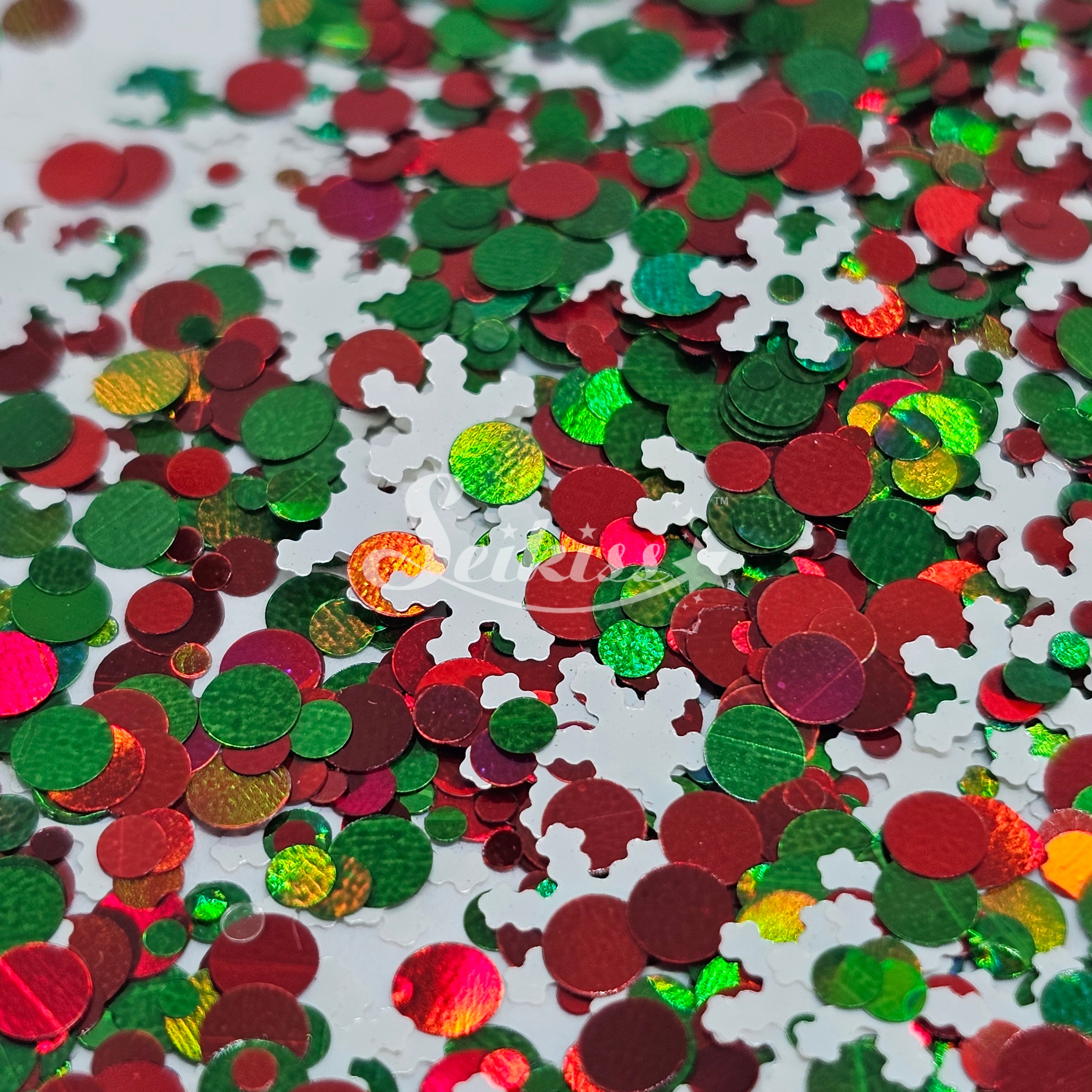 Classic Holiday is a mix of traditional green and red dots glitter with white snowflakes adding a stunning visual effect to your artwork. This makes your projects shine and is perfect for resin, nails, tumblers, jewelry, arts, and all types of crafts and projects.