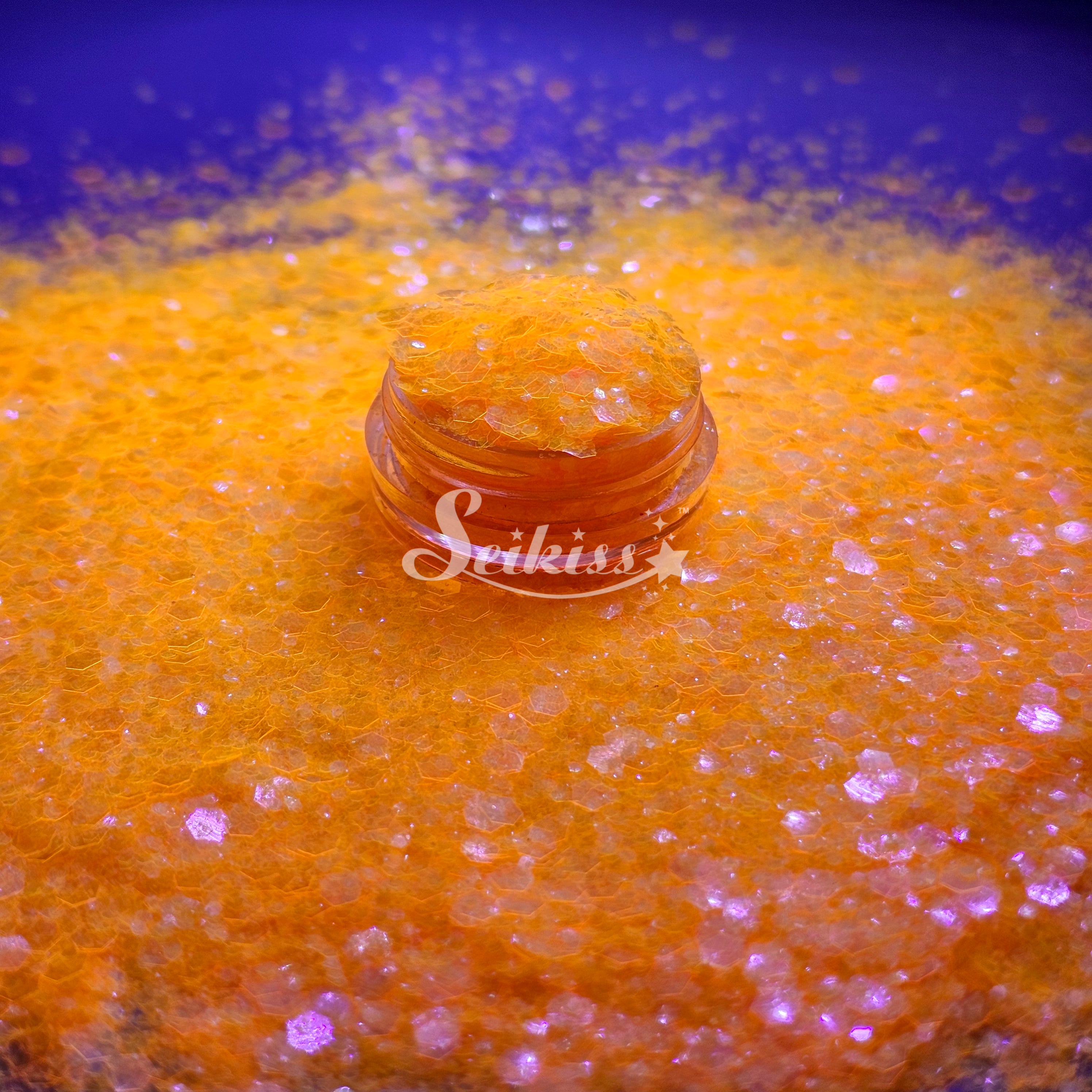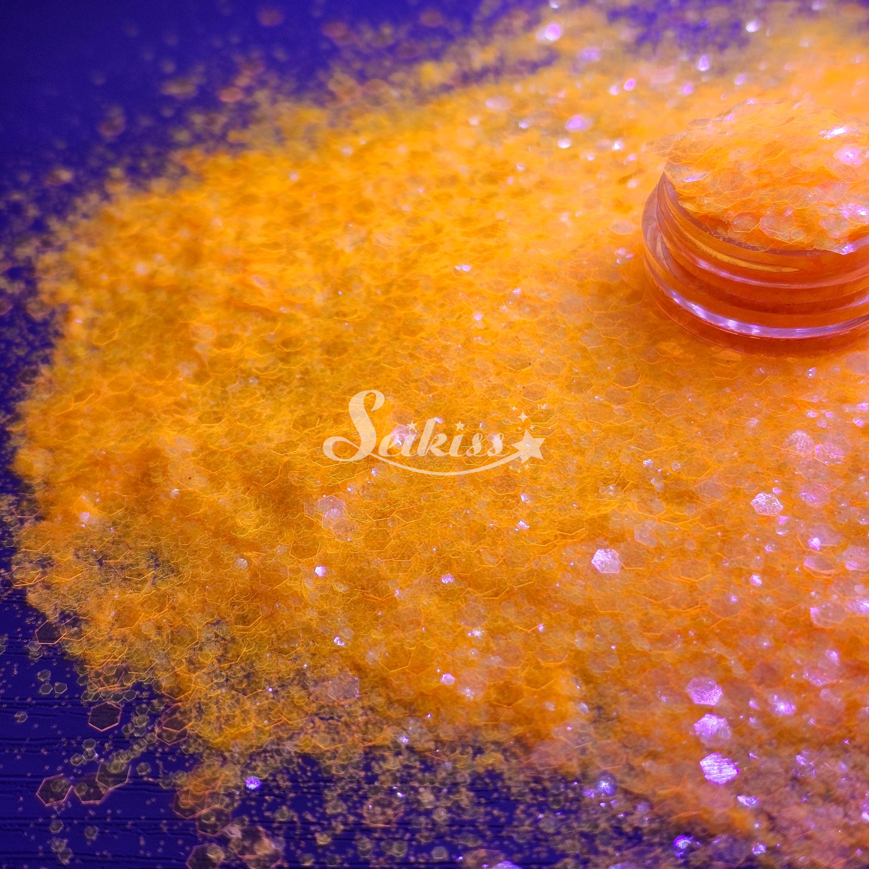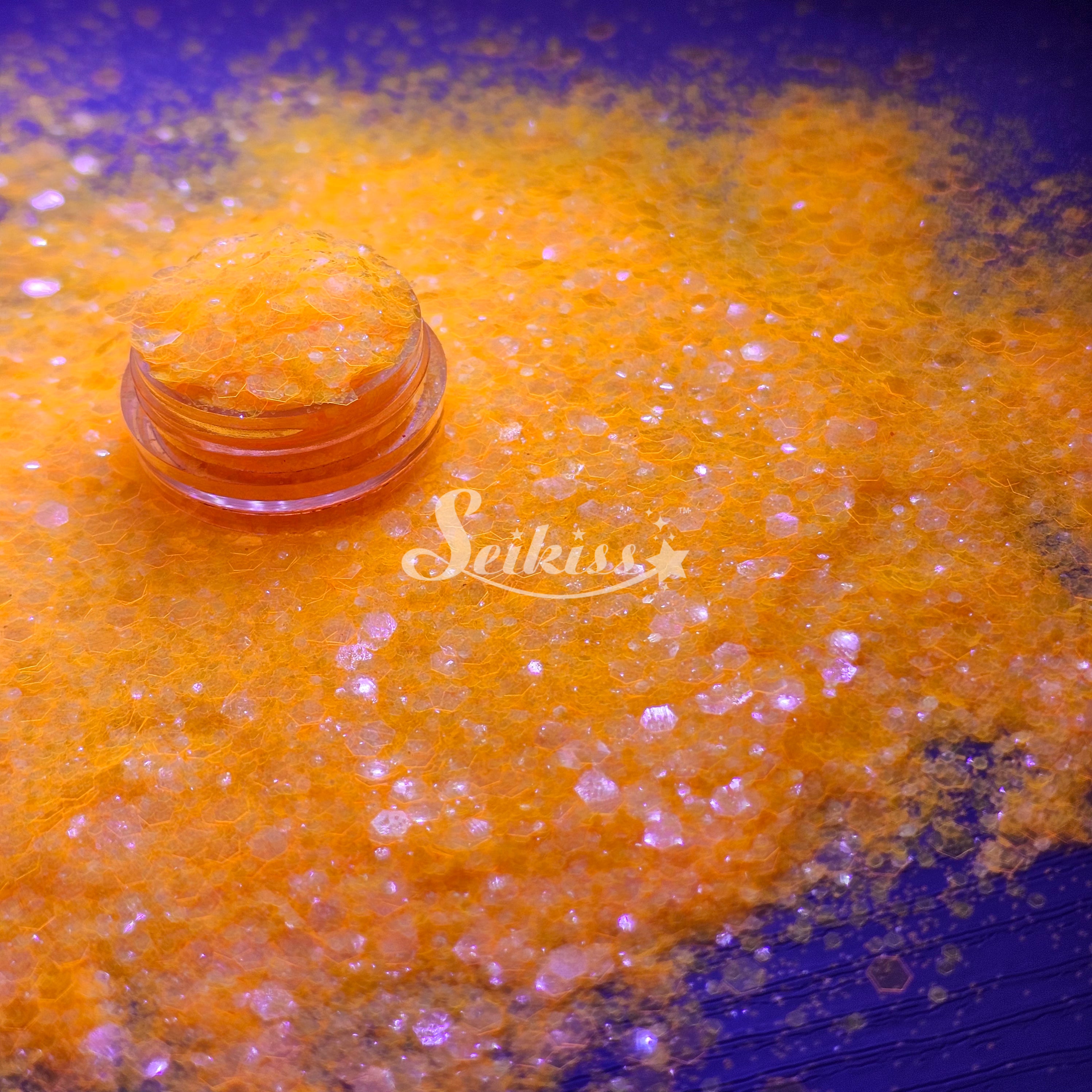 Fluorescent Orange Chunky Glitter brings a dazzling pop of color to any creation with its vibrant hue and shimmering iridescent finish. Under UV light, it glows brilliantly for an eye-catching effect, while in normal light it appears as a classic orange glitter. Perfect for adding a glamorous touch to nails, resin art, tumblers, jewelry, and all your favorite craft projects.