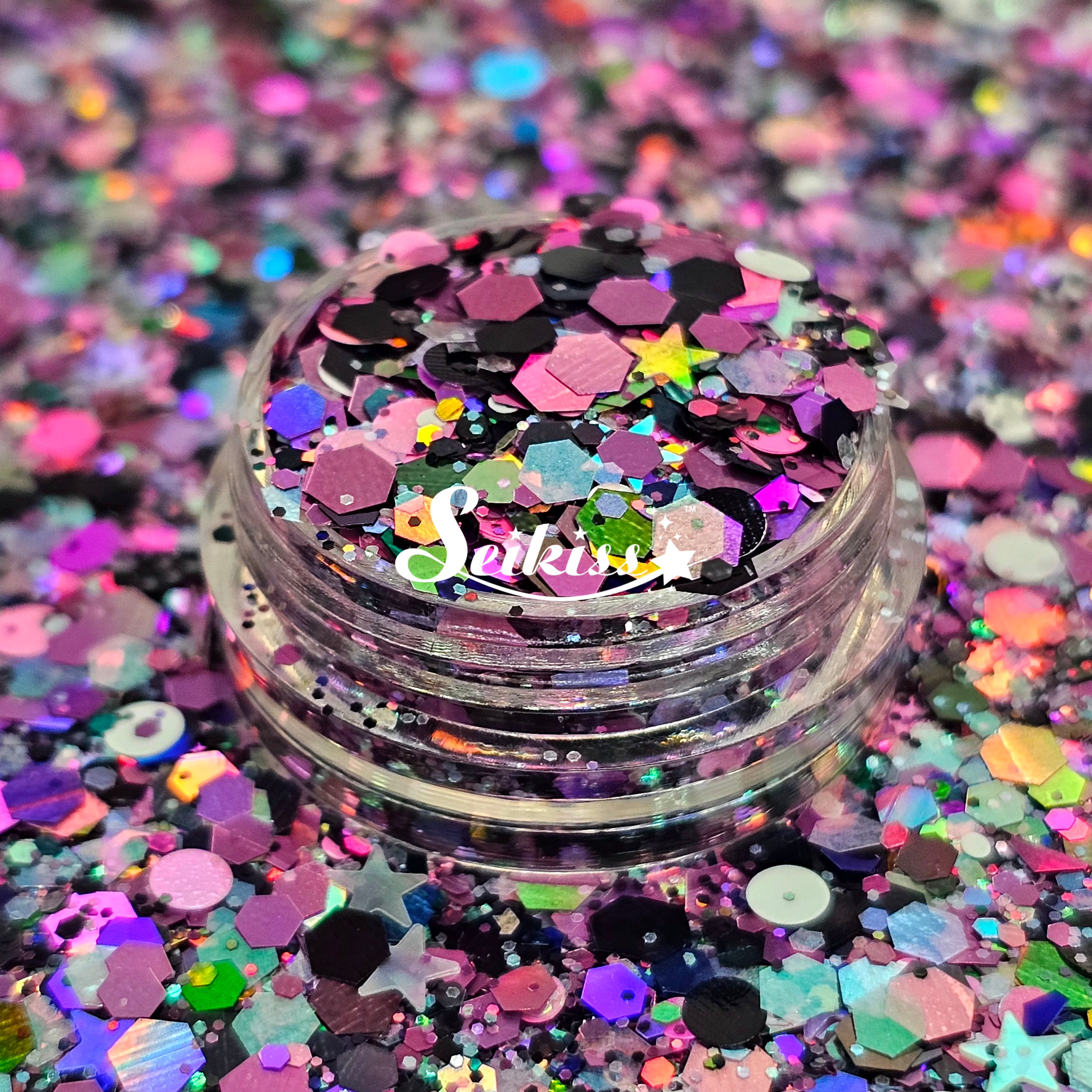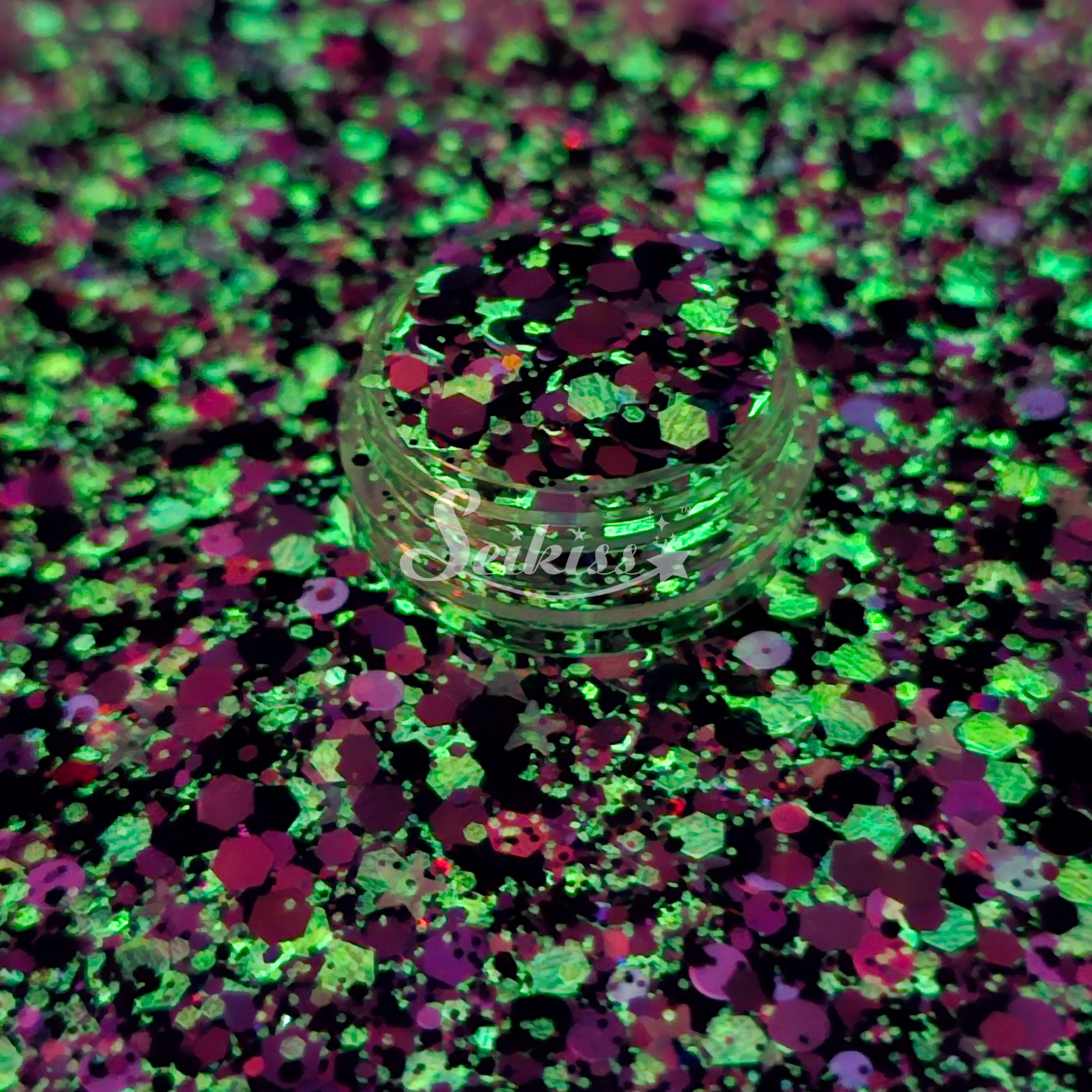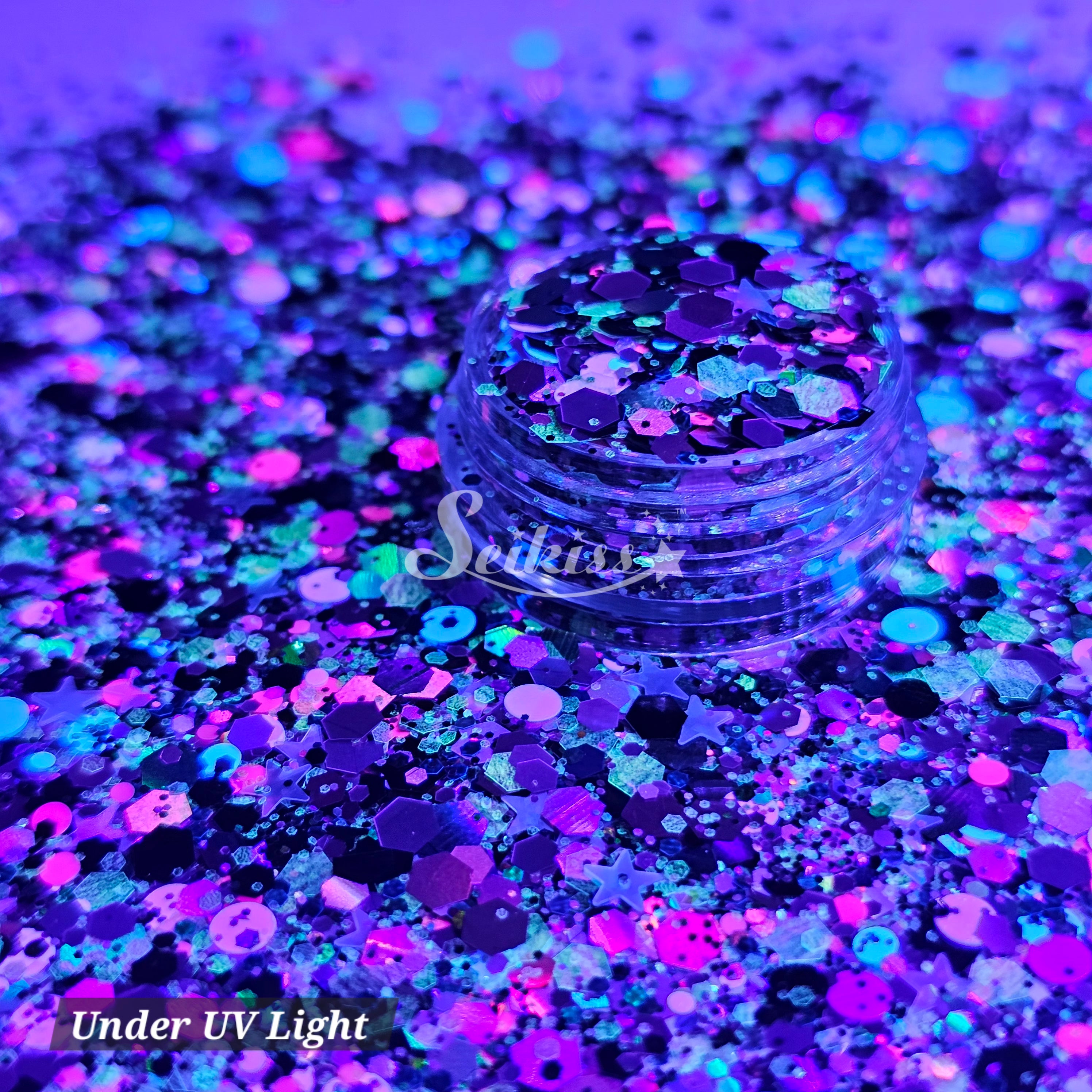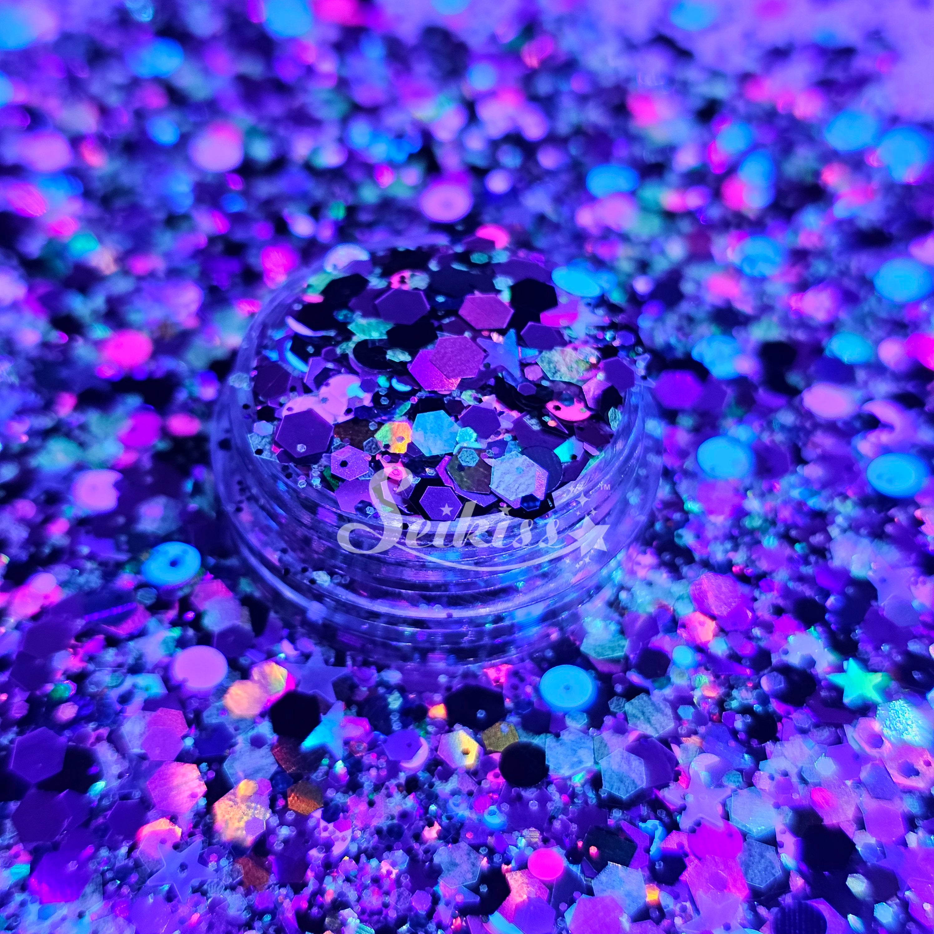 Volt Glow brings a dazzling pop to any creation with its vibrant shades of purple with black holographic finish and white stars. Under UV light, it has a soft fluorescent eye-catching effect, while in normal light it appears as a colorful glitter. Also, this lovely custom mix has a soft glow in the dark effect that you can see when turning lights off.