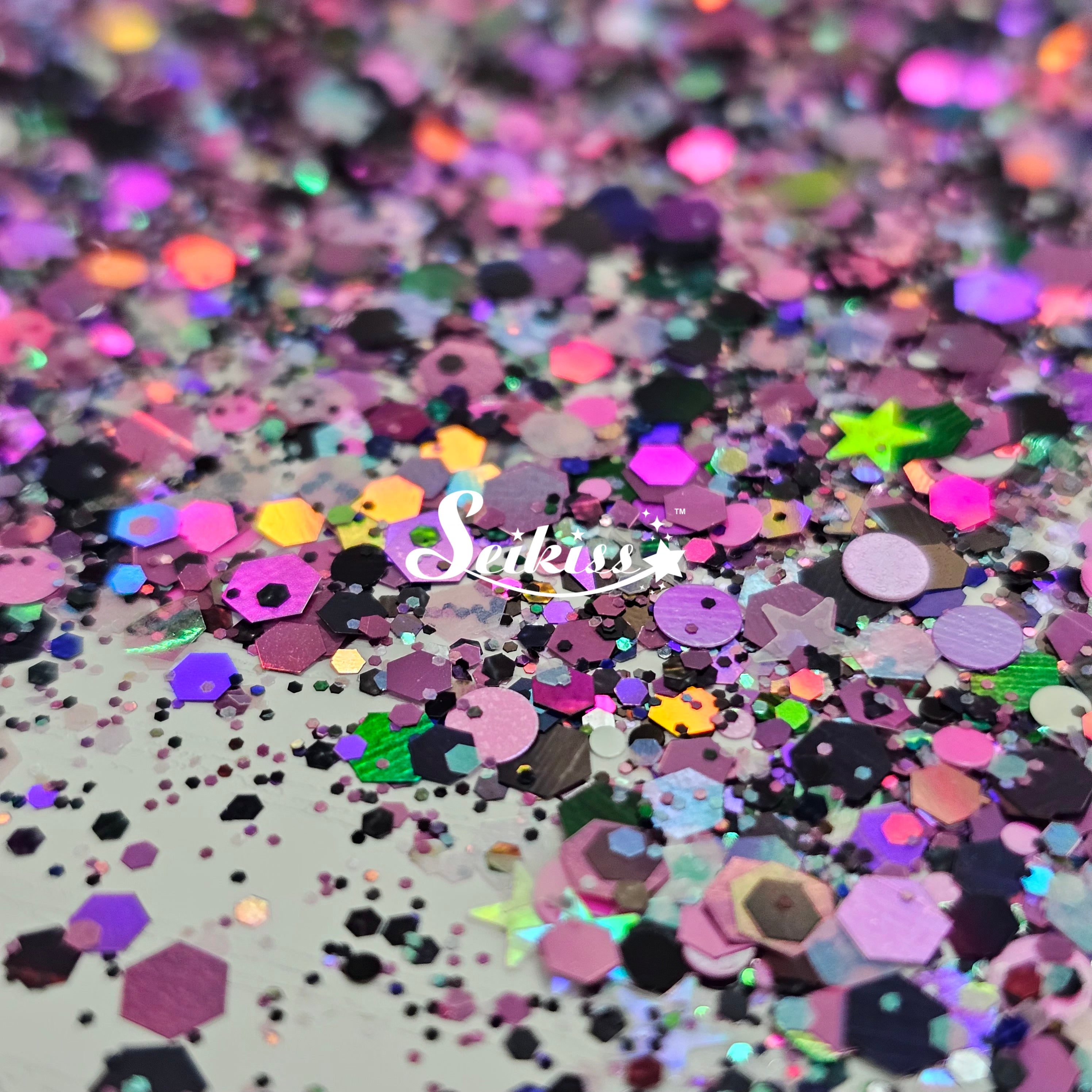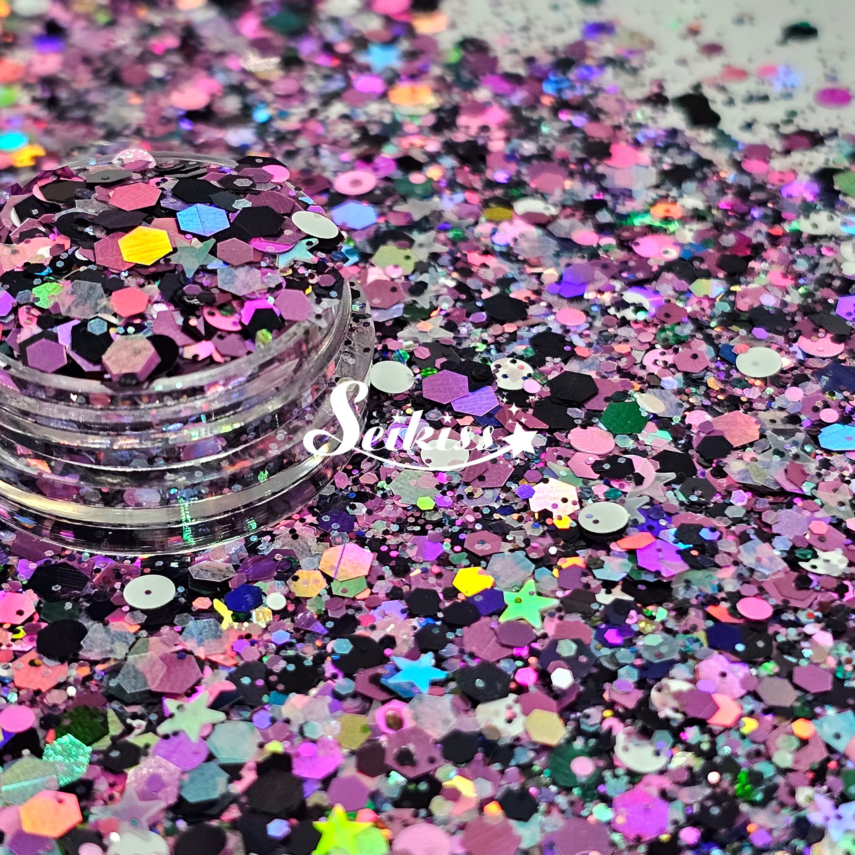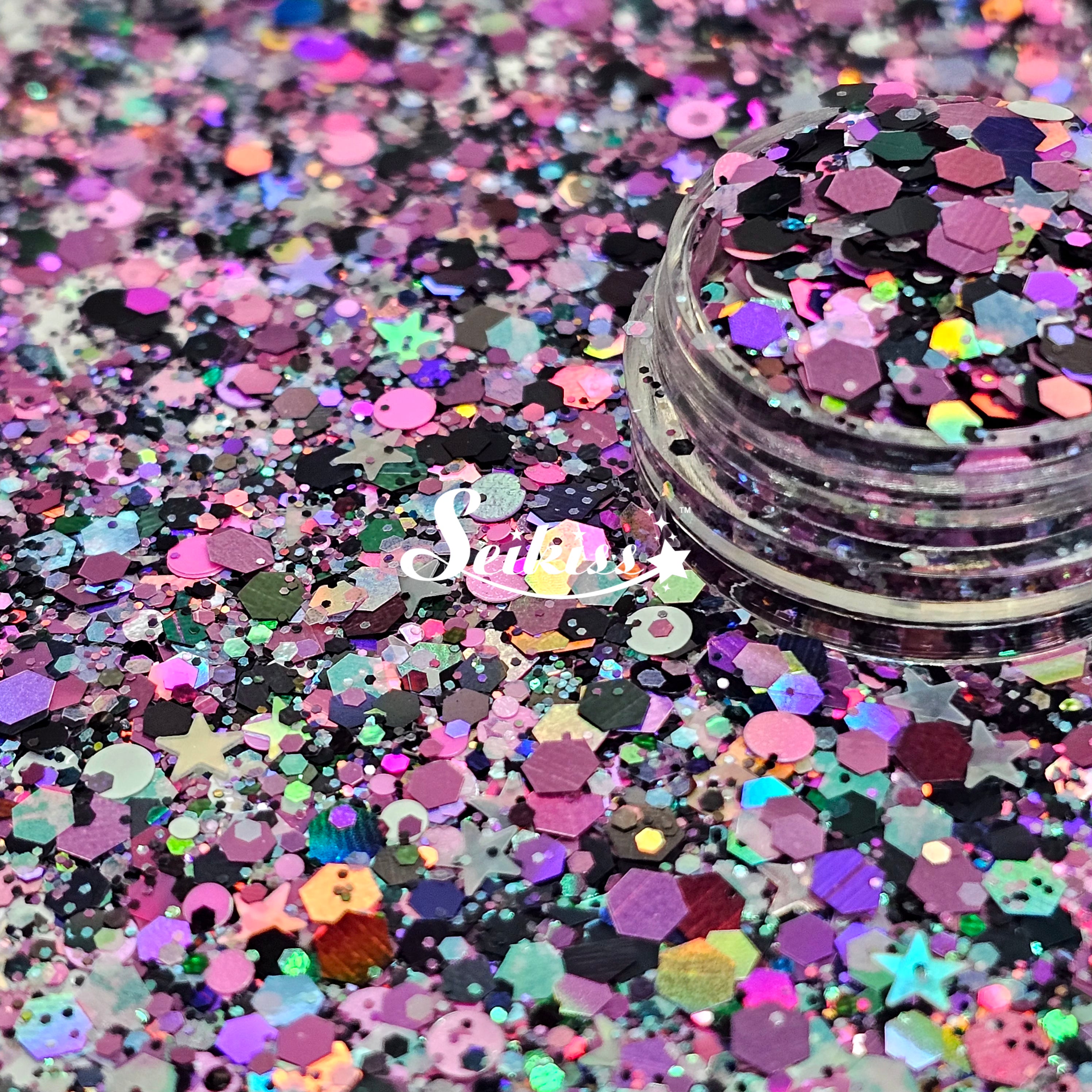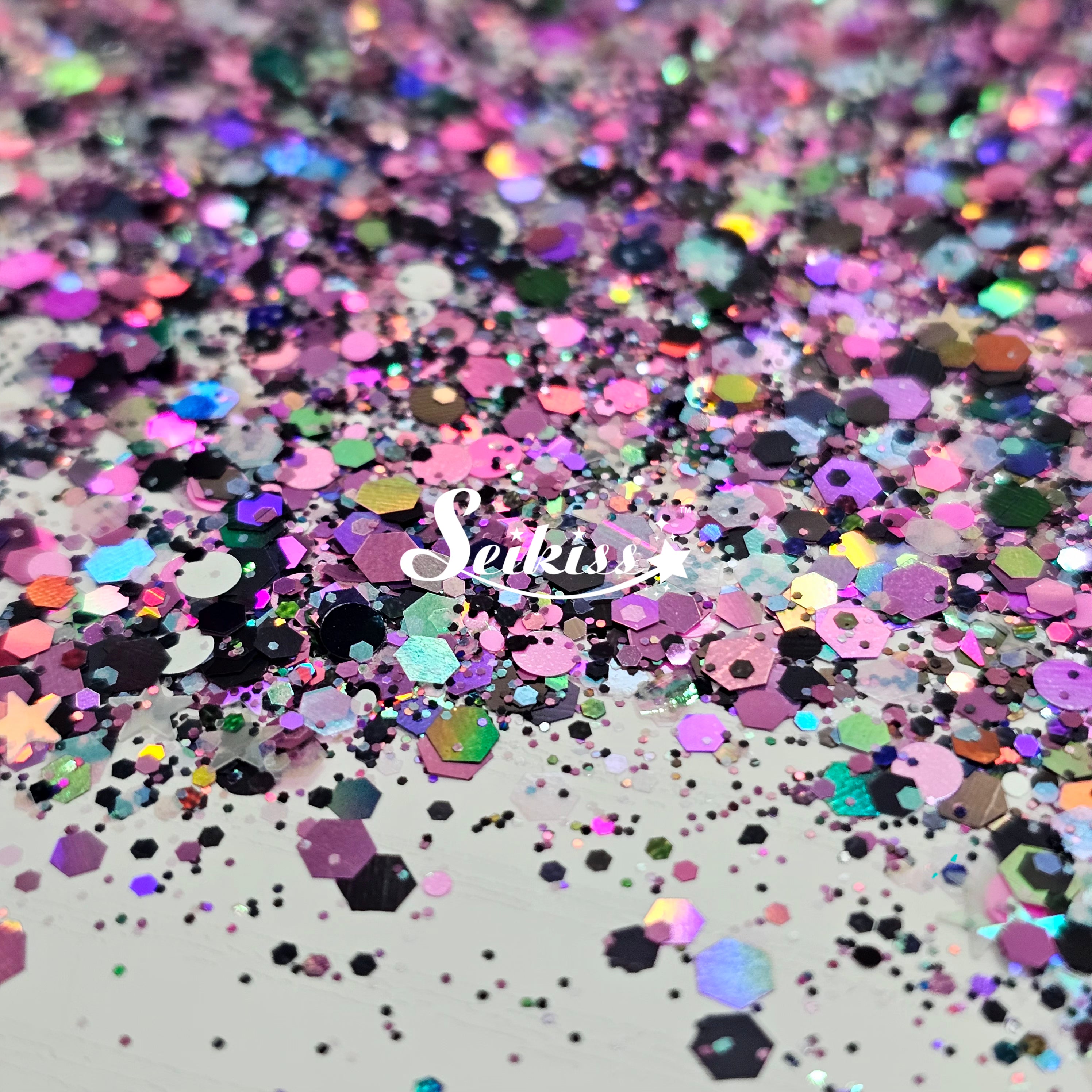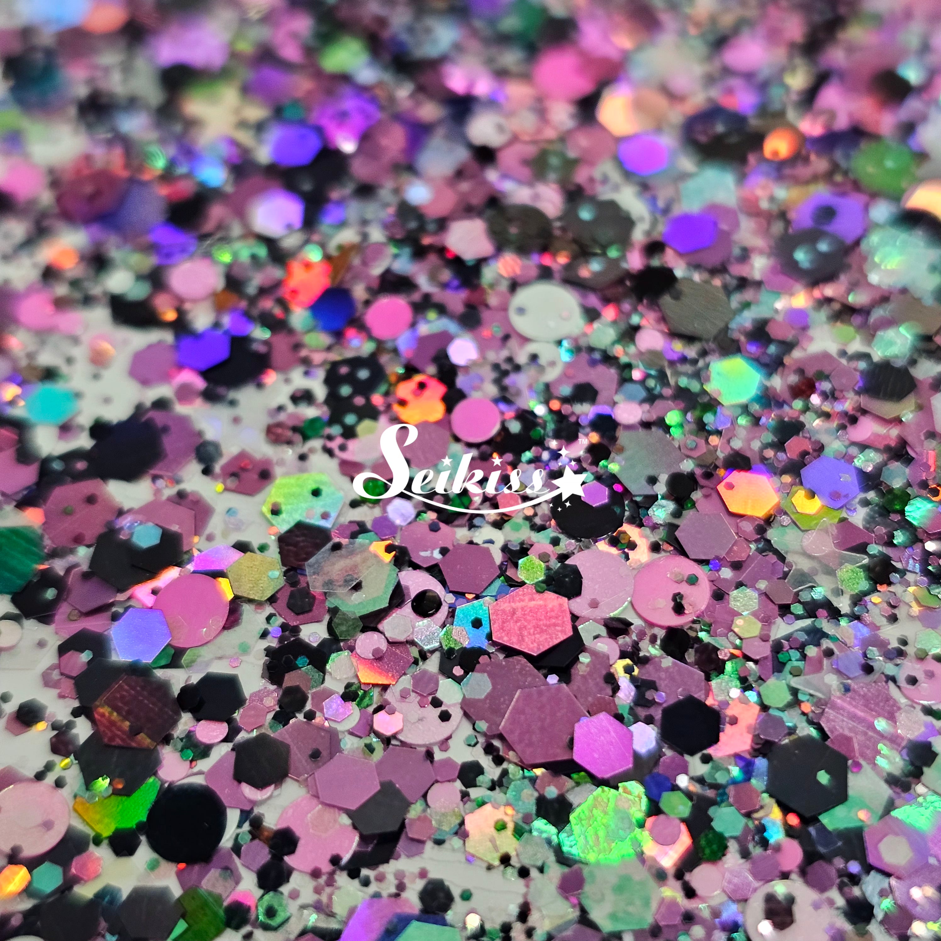 Volt Glow brings a dazzling pop to any creation with its vibrant shades of purple with black holographic finish and white stars. Under UV light, it has a soft fluorescent eye-catching effect, while in normal light it appears as a colorful glitter. Also, this lovely custom mix has a soft glow in the dark effect that you can see when turning lights off.