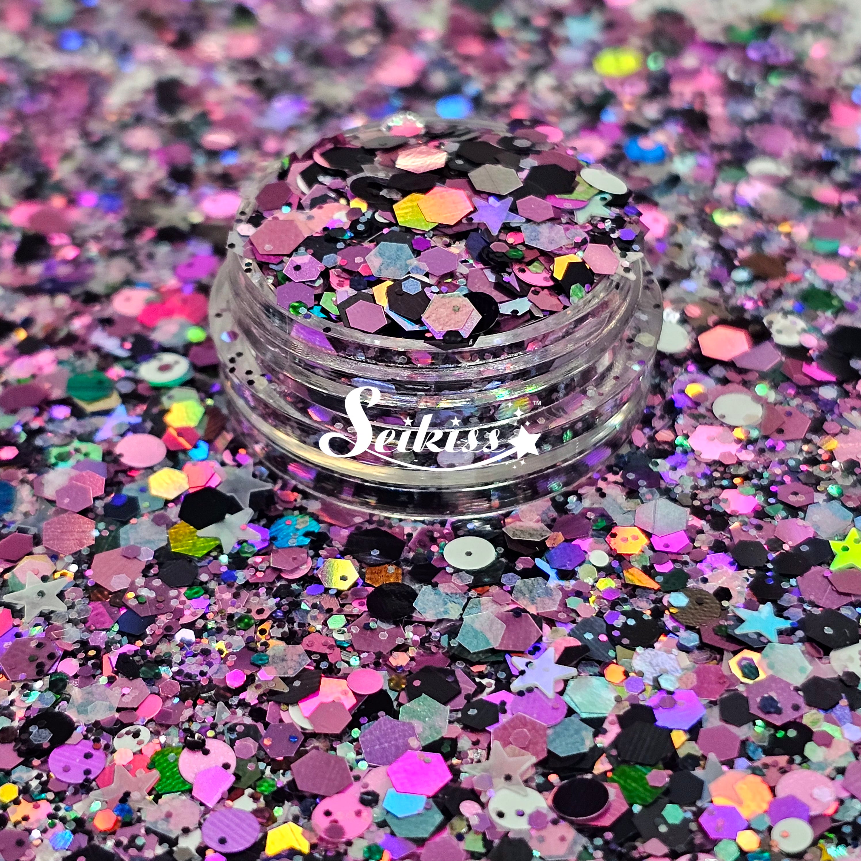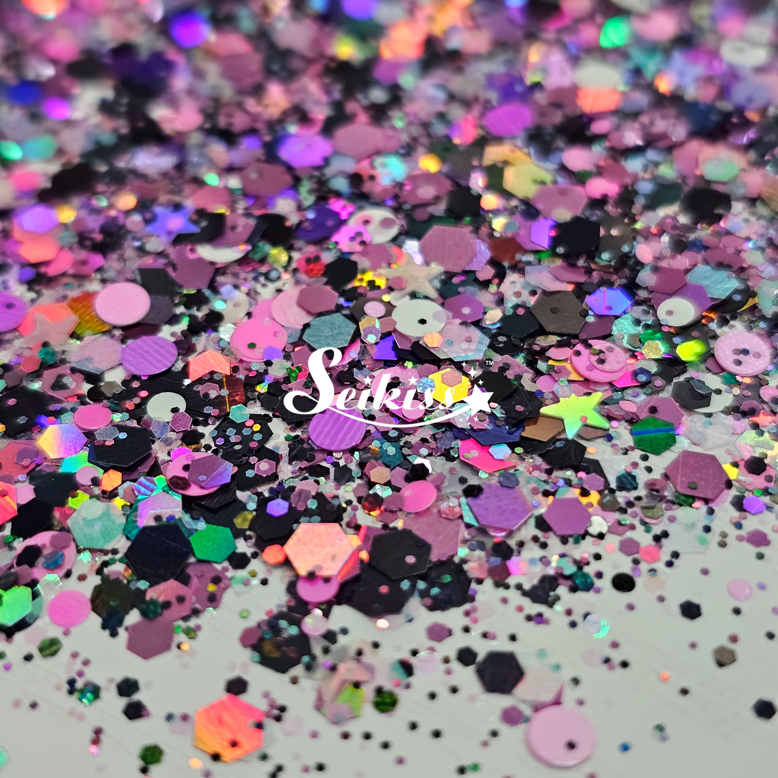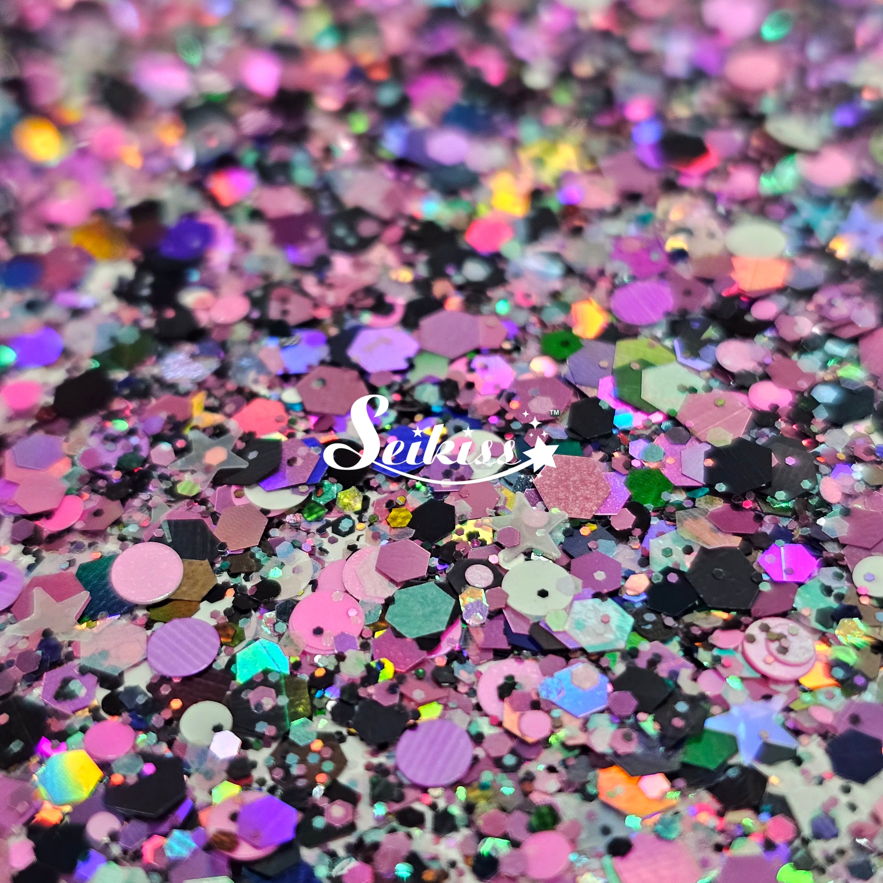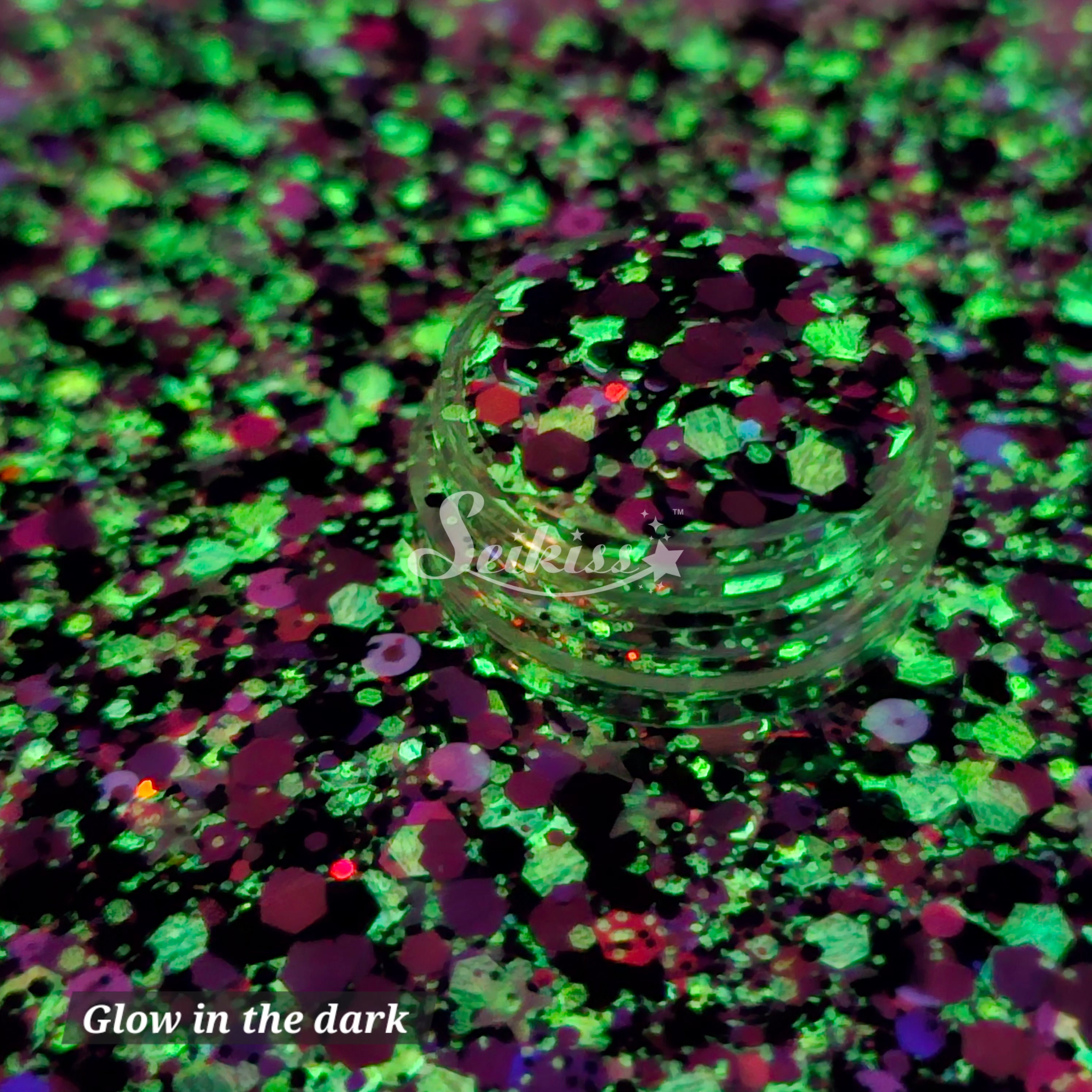 Volt Glow brings a dazzling pop to any creation with its vibrant shades of purple with black holographic finish and white stars. Under UV light, it has a soft fluorescent eye-catching effect, while in normal light it appears as a colorful glitter. Also, this lovely custom mix has a soft glow in the dark effect that you can see when turning lights off.