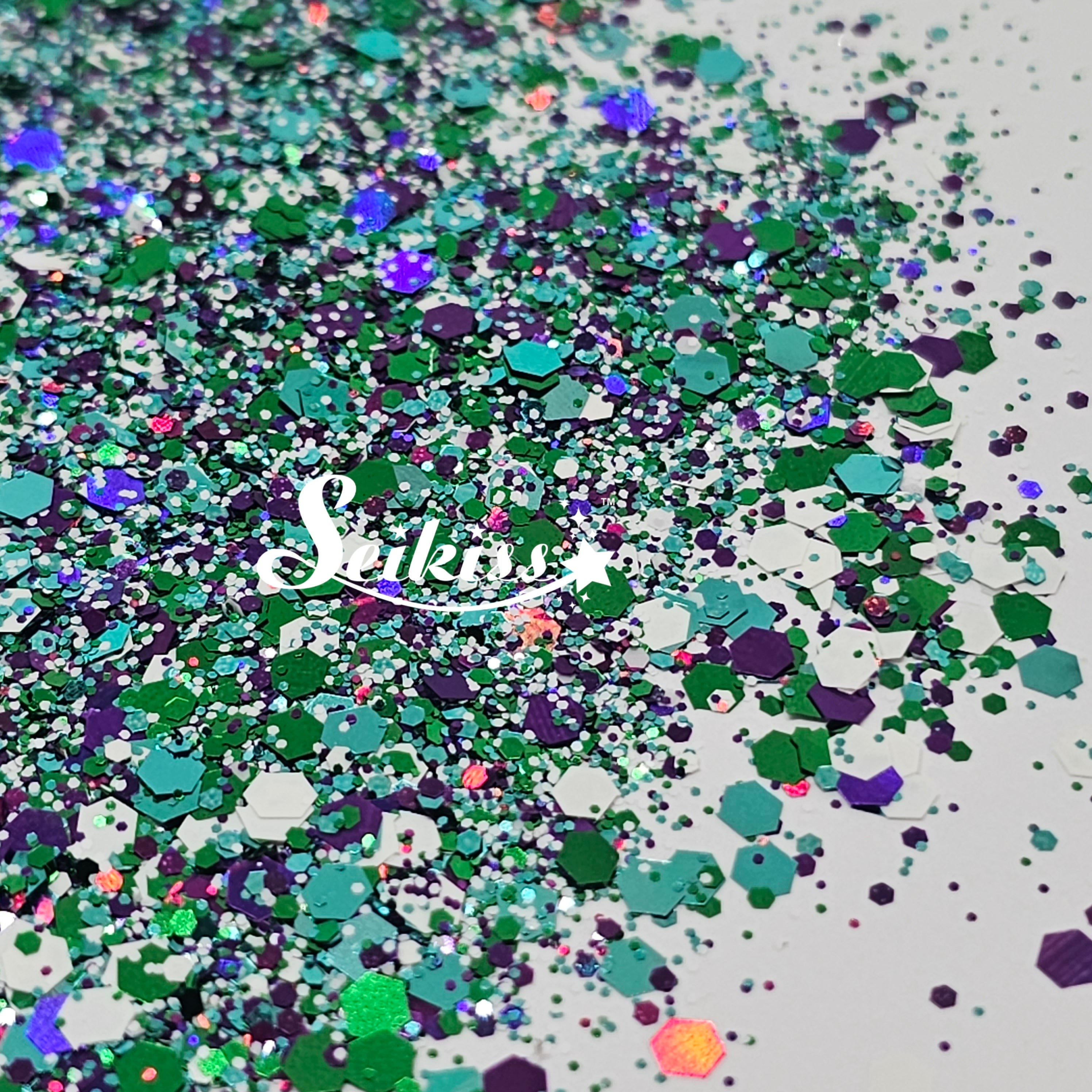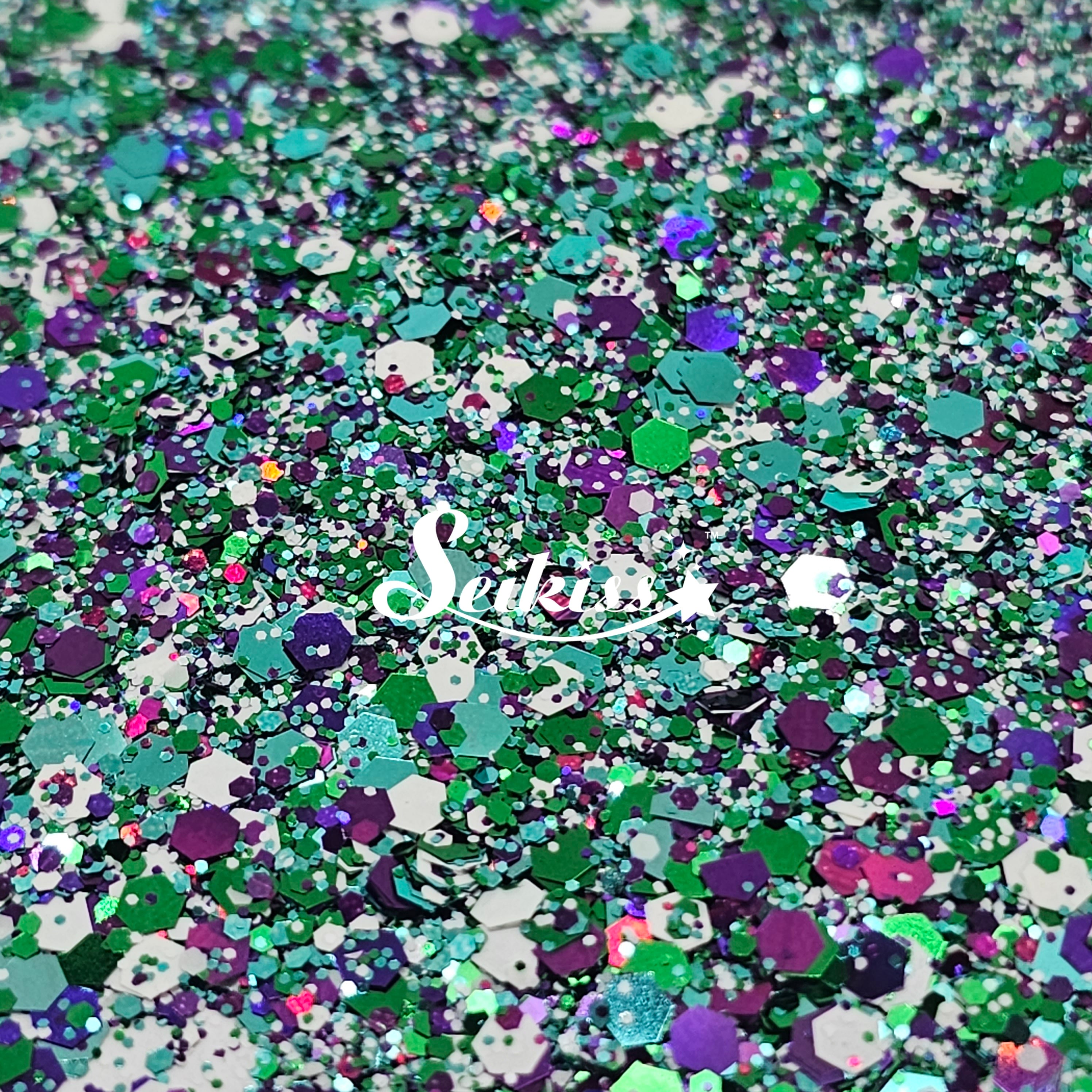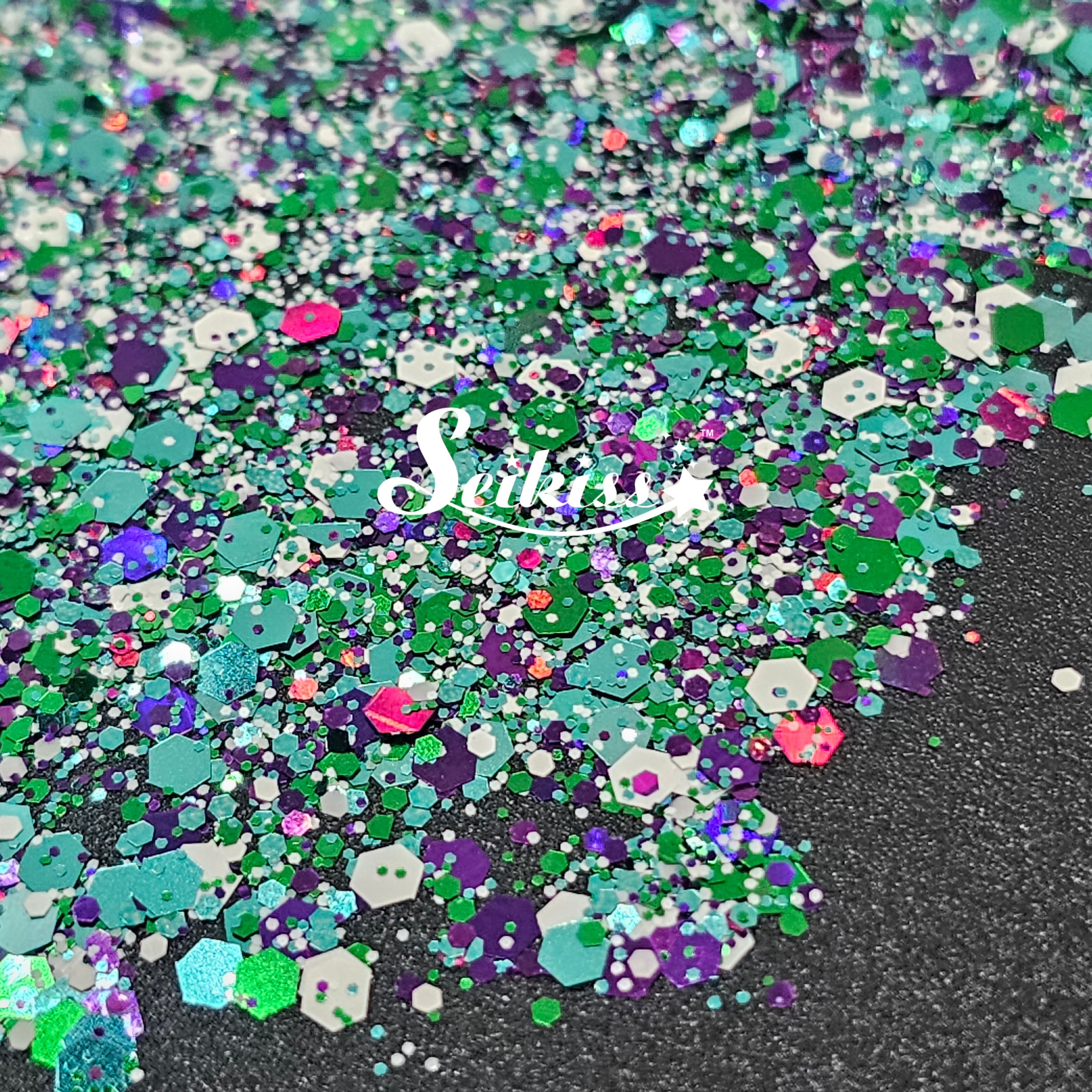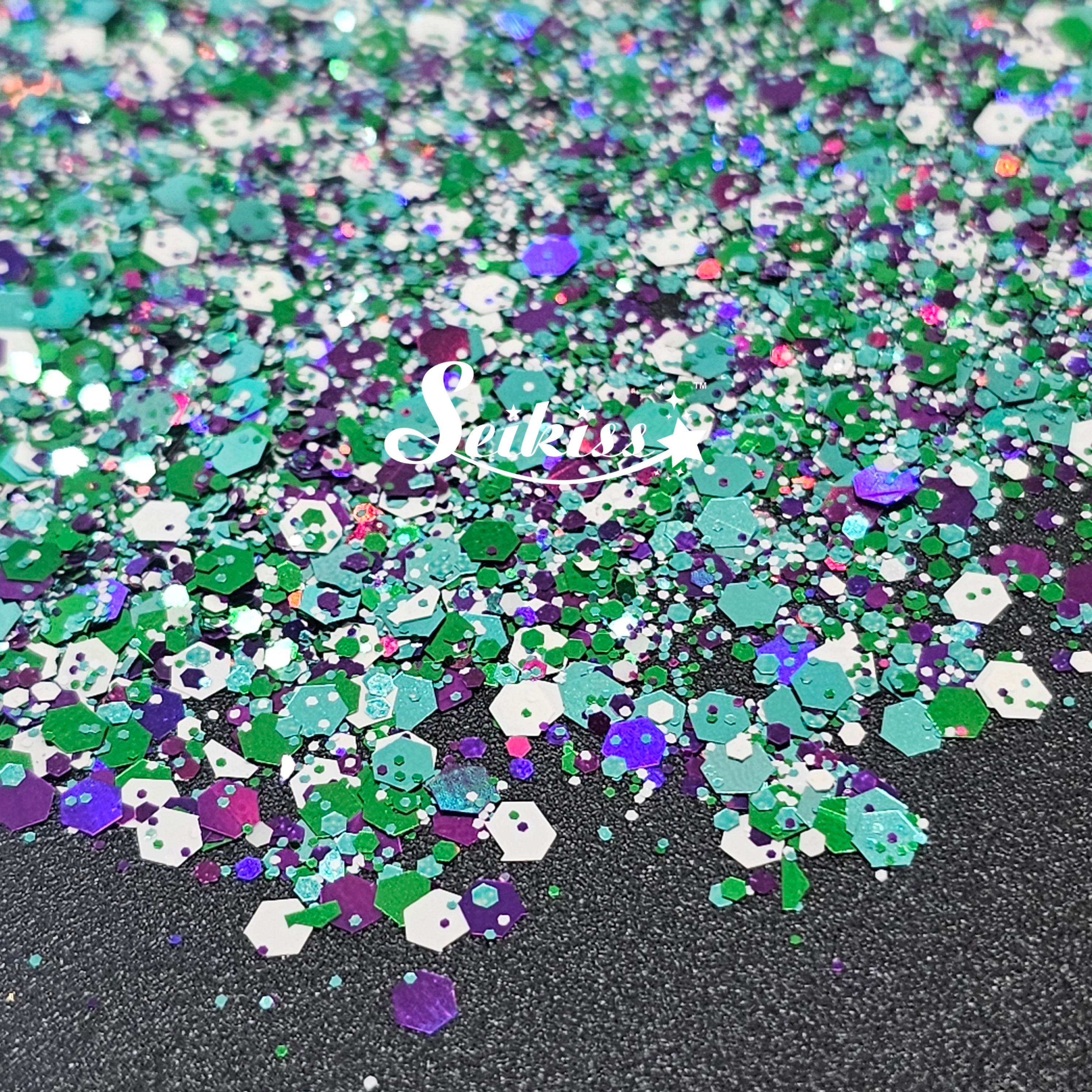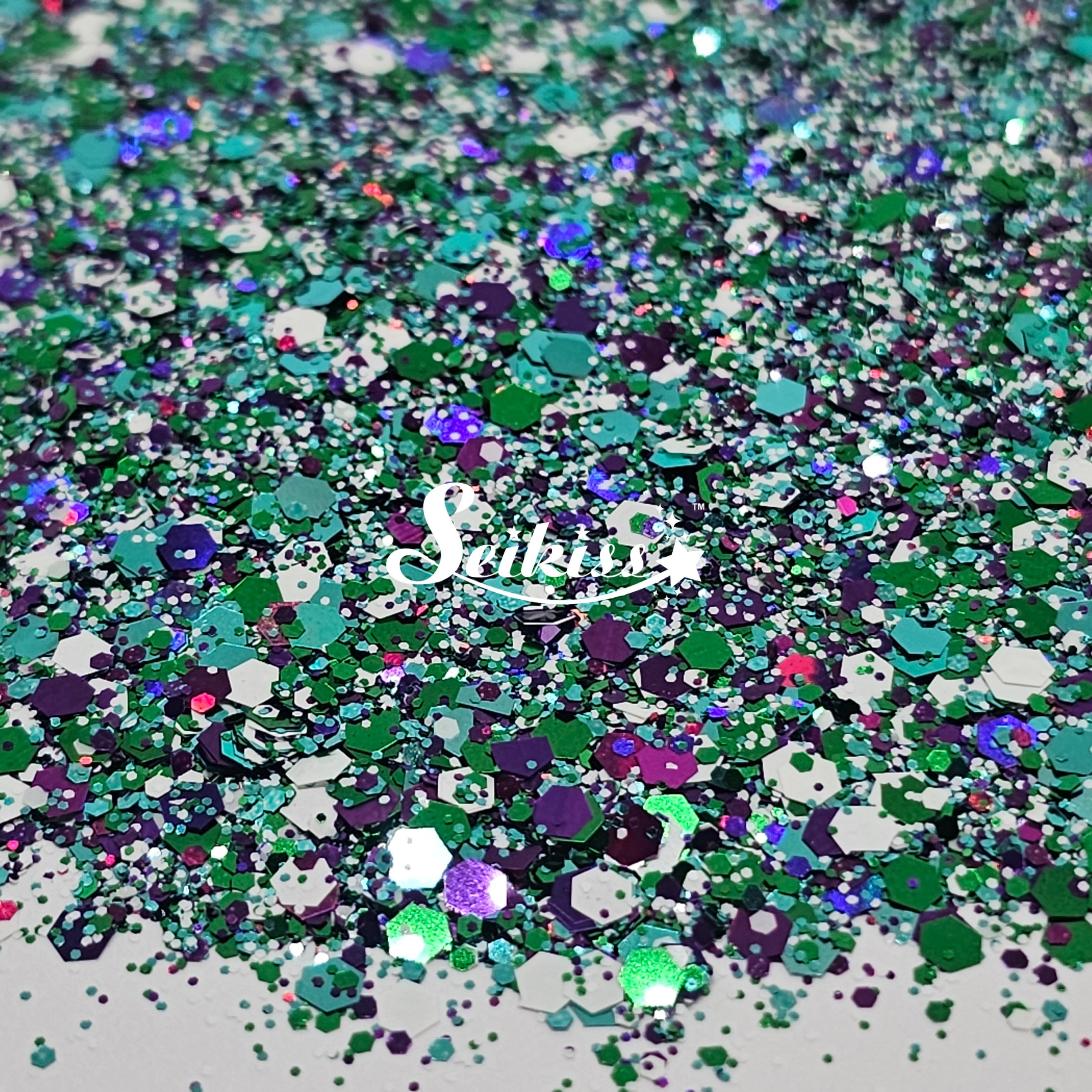 Cyber City is a holographic and metallic chunky mix of turquoise, purple, and white adding a stunning visual effect to your artwork. This makes your projects shine and is perfect for resin, nails, tumblers, jewelry, arts, and all types of crafts and projects.