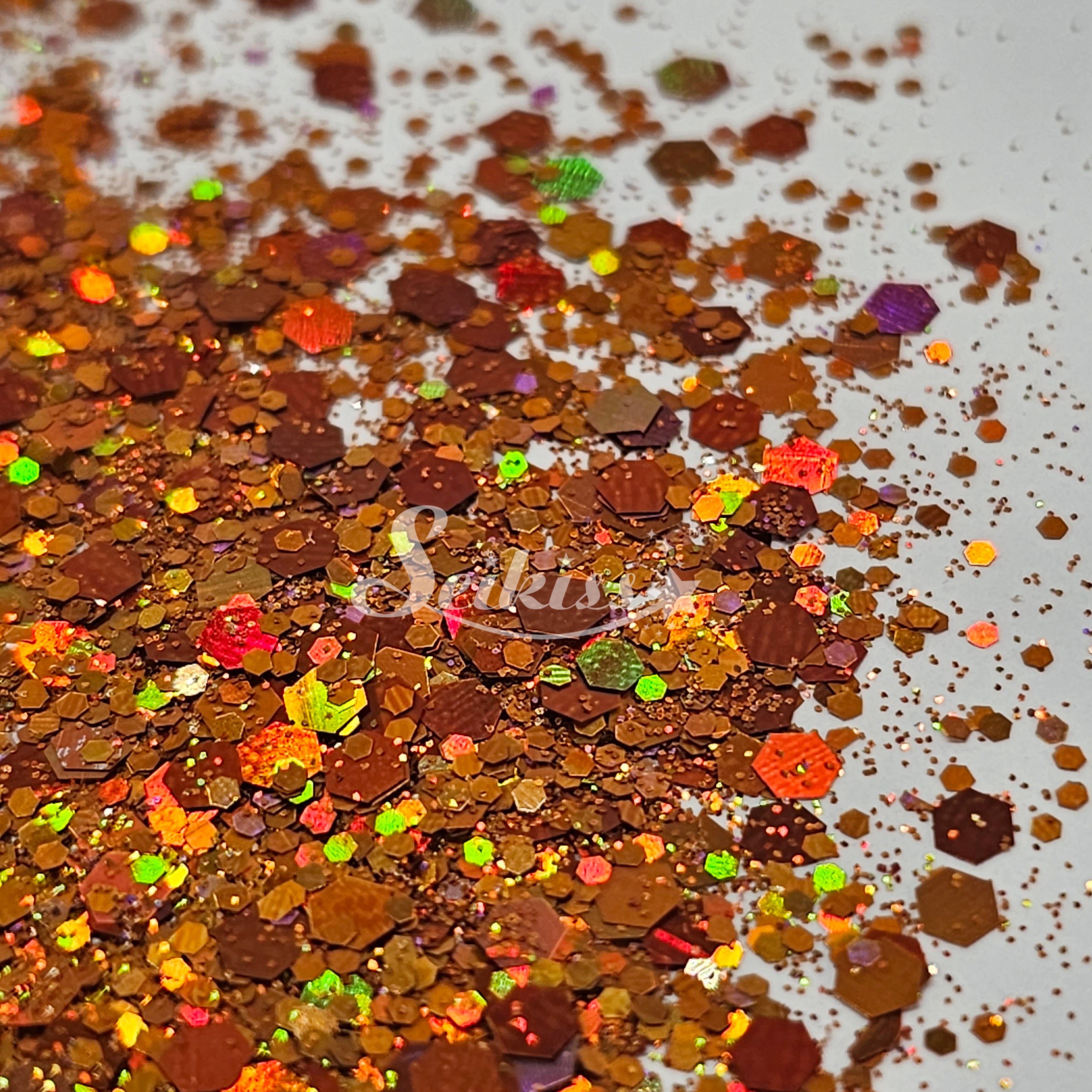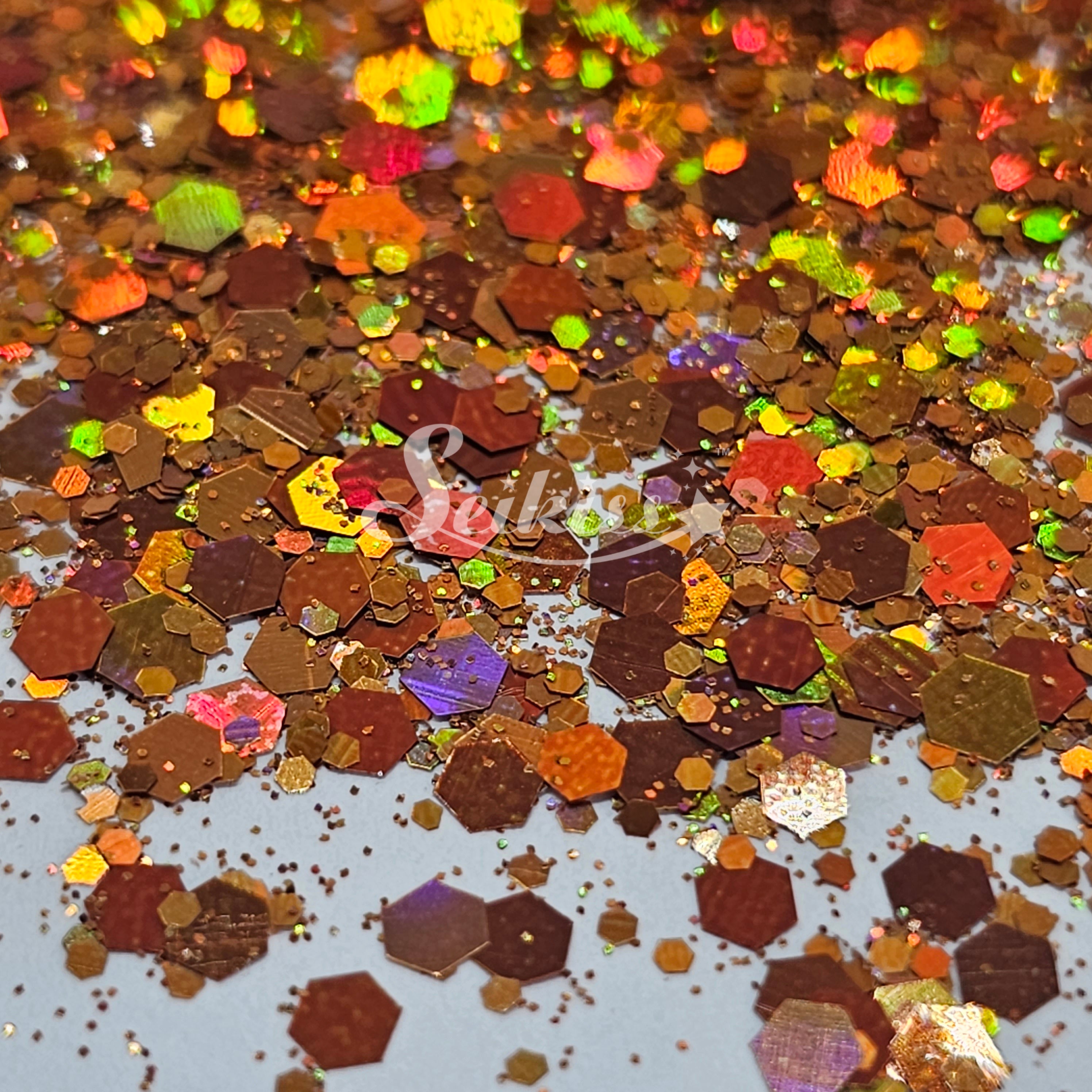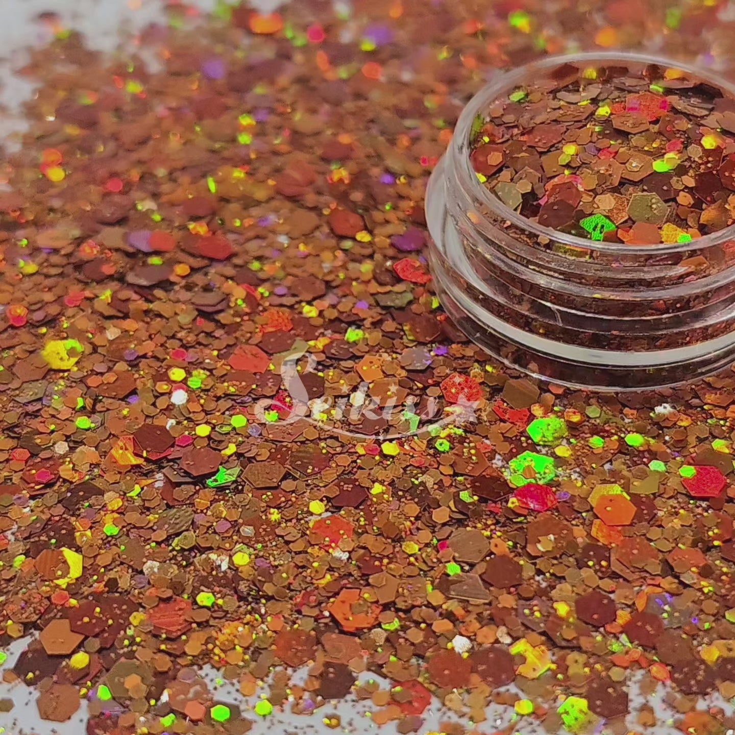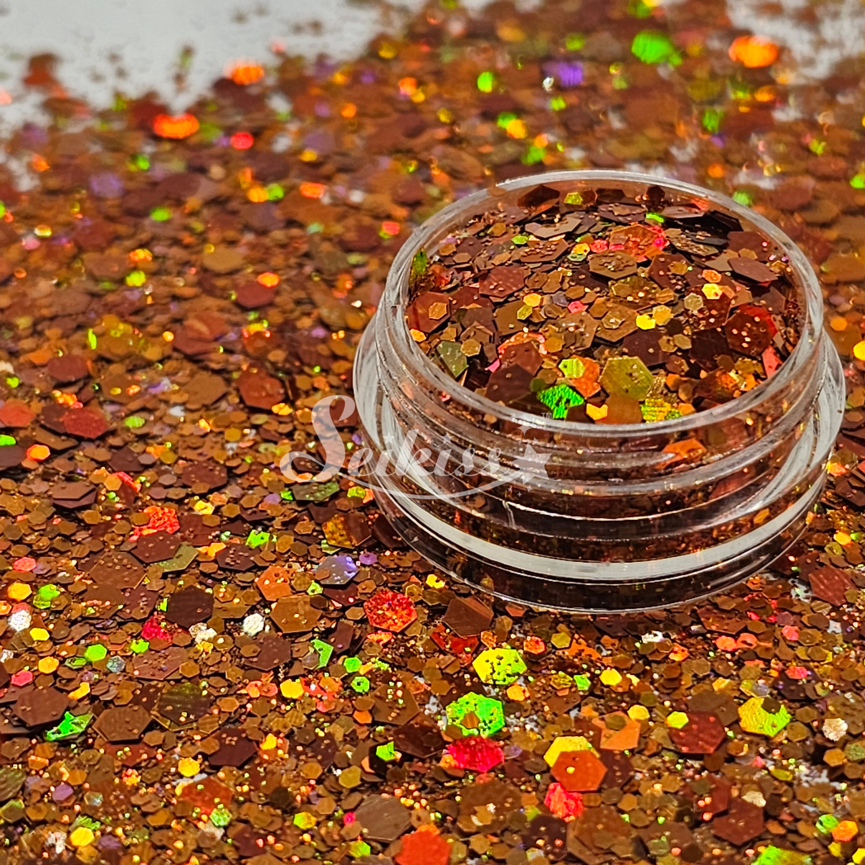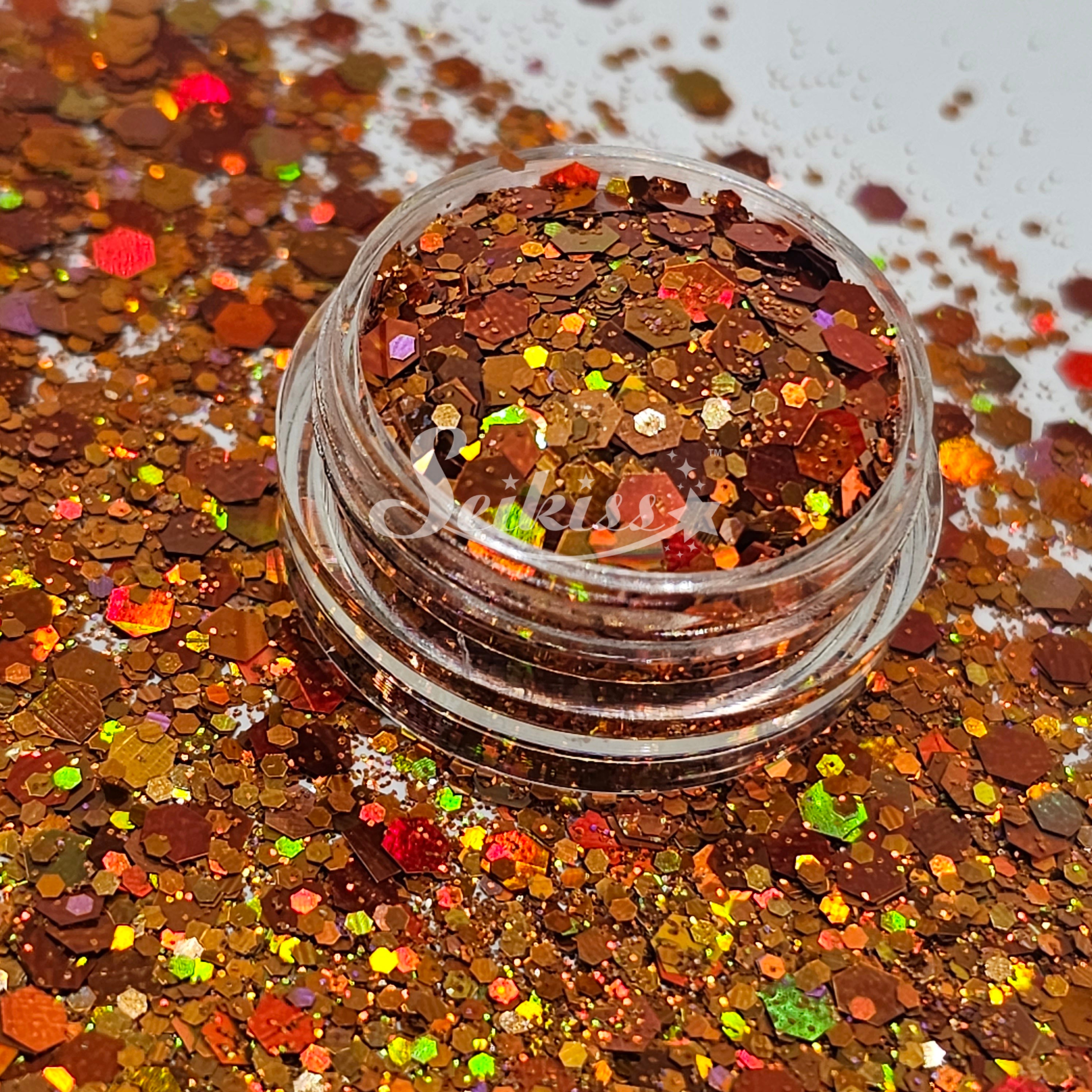 Fancy Ginger has a colorful chunky mix of sparkle in a burnt orange, adding a stunning visual effect to your artwork with its realistic holographic finish. This makes your projects shine and is perfect for resin, nails, tumblers, jewelry, arts, and all types of crafts and projects.