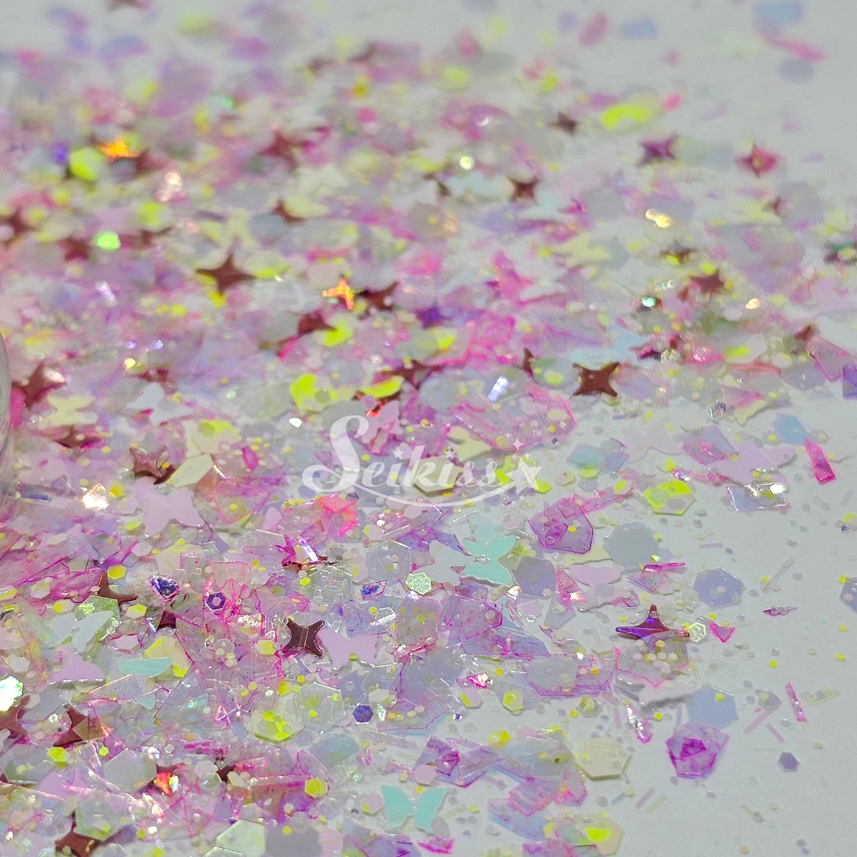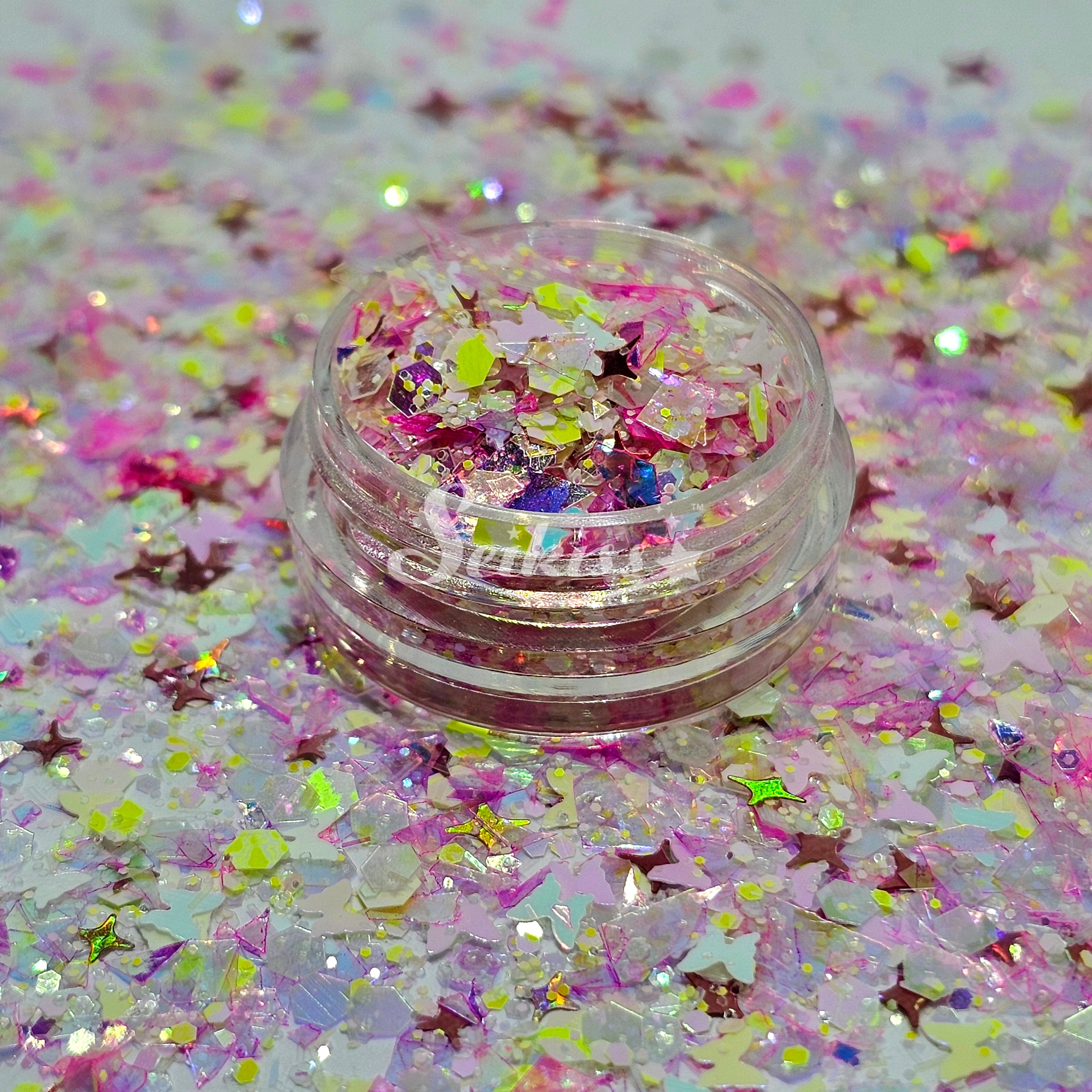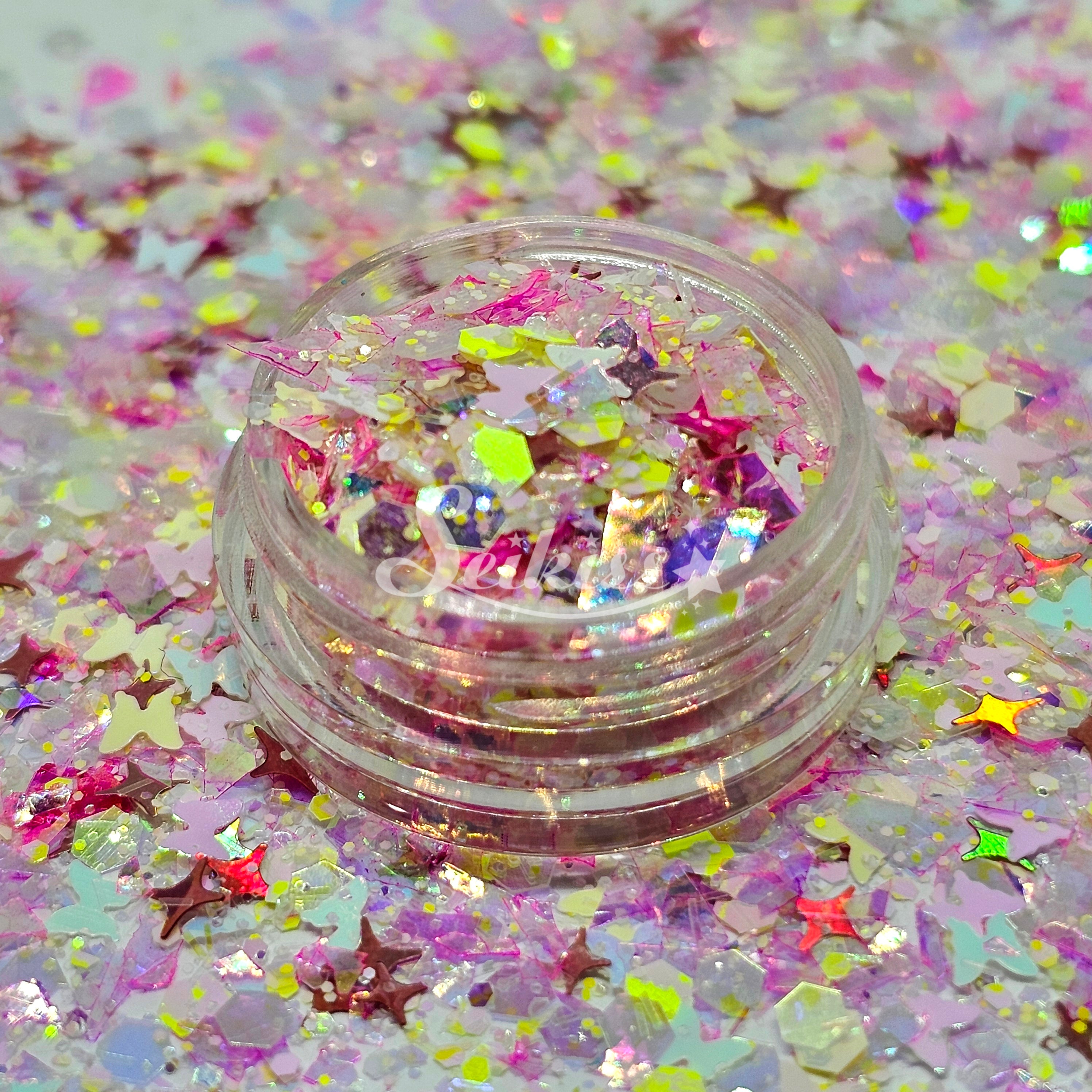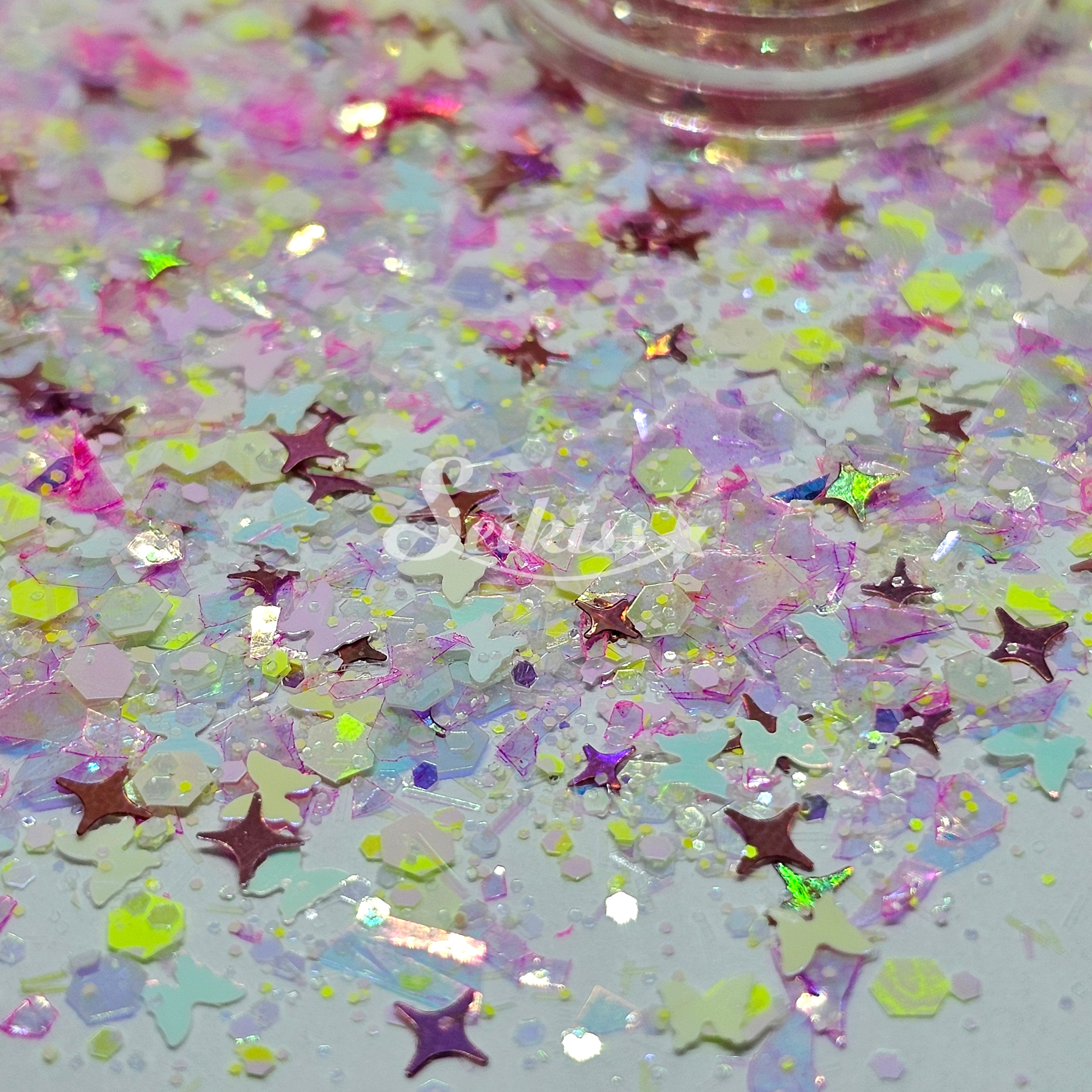 Fly Away is a unique custom mix of pink iridescent flakes, butterflies, a hint of vibrant yellow chunky mix and rose gold holographic shining stars.