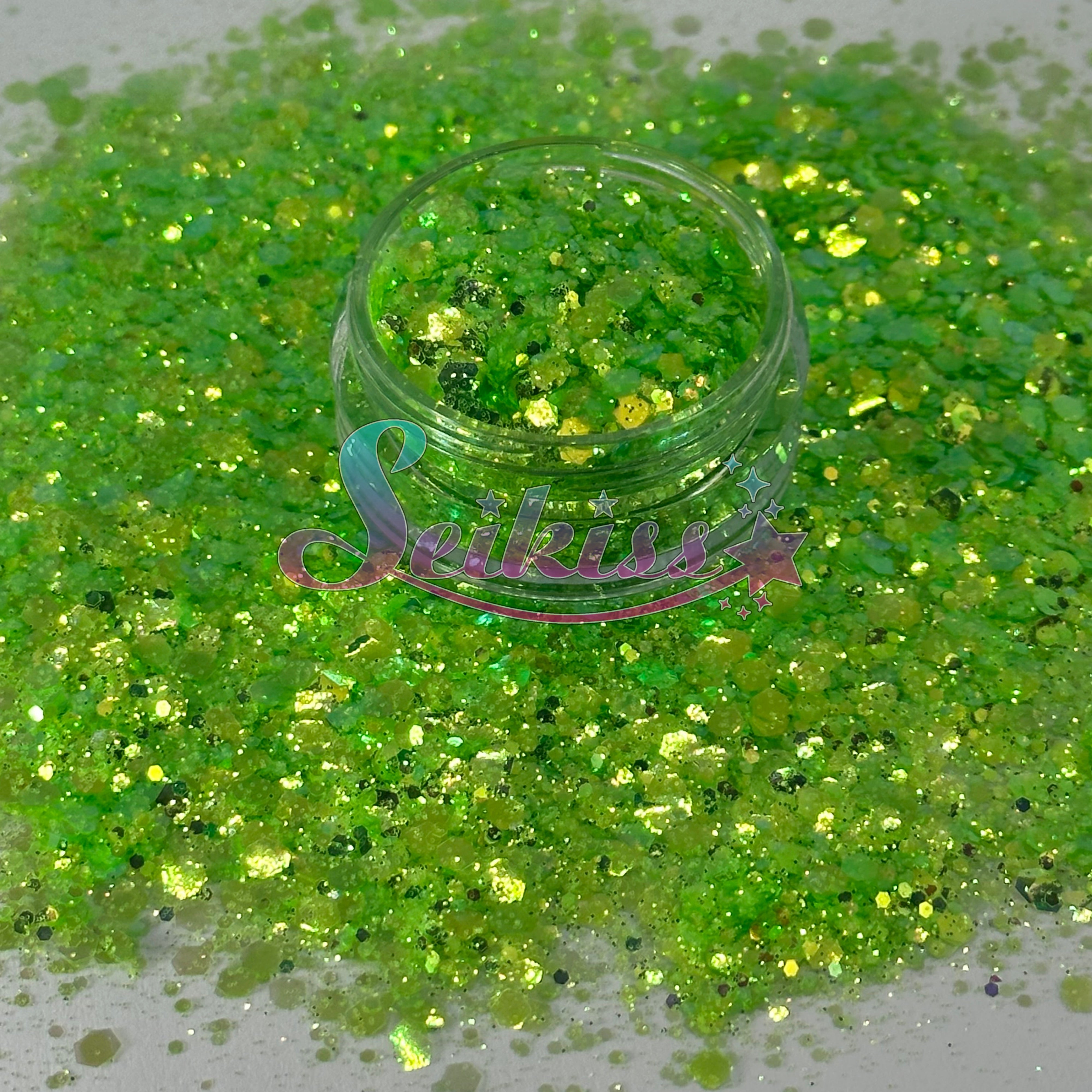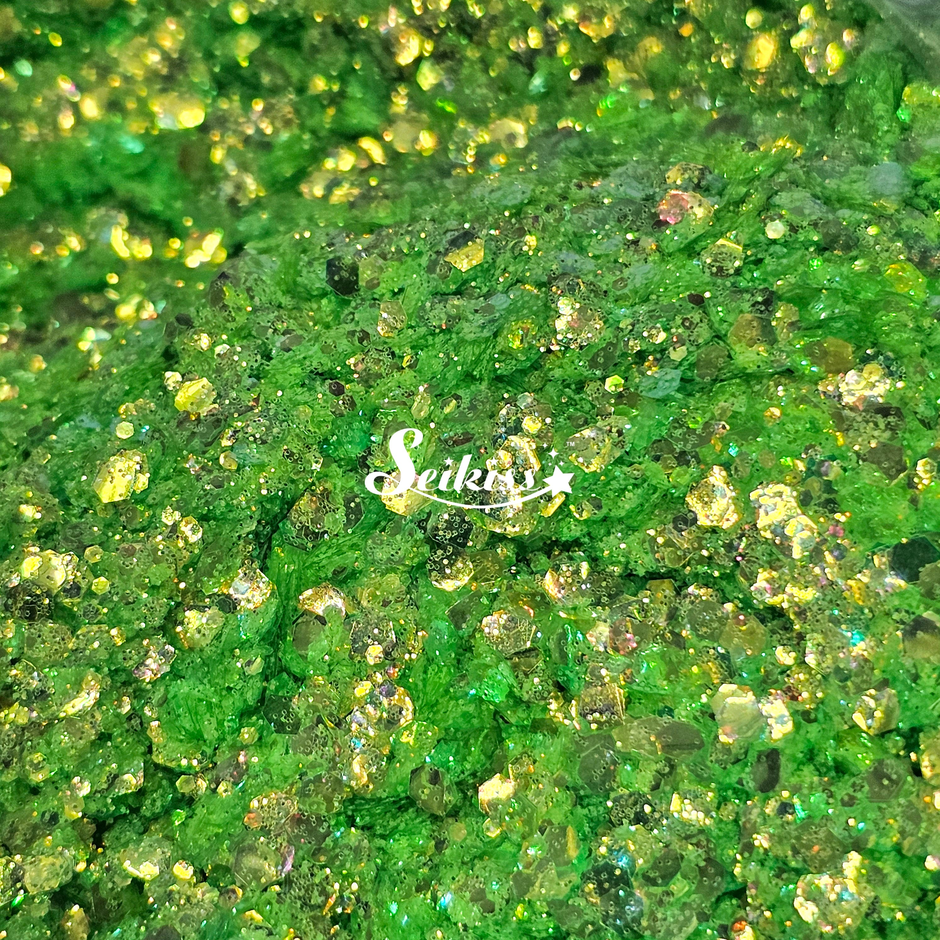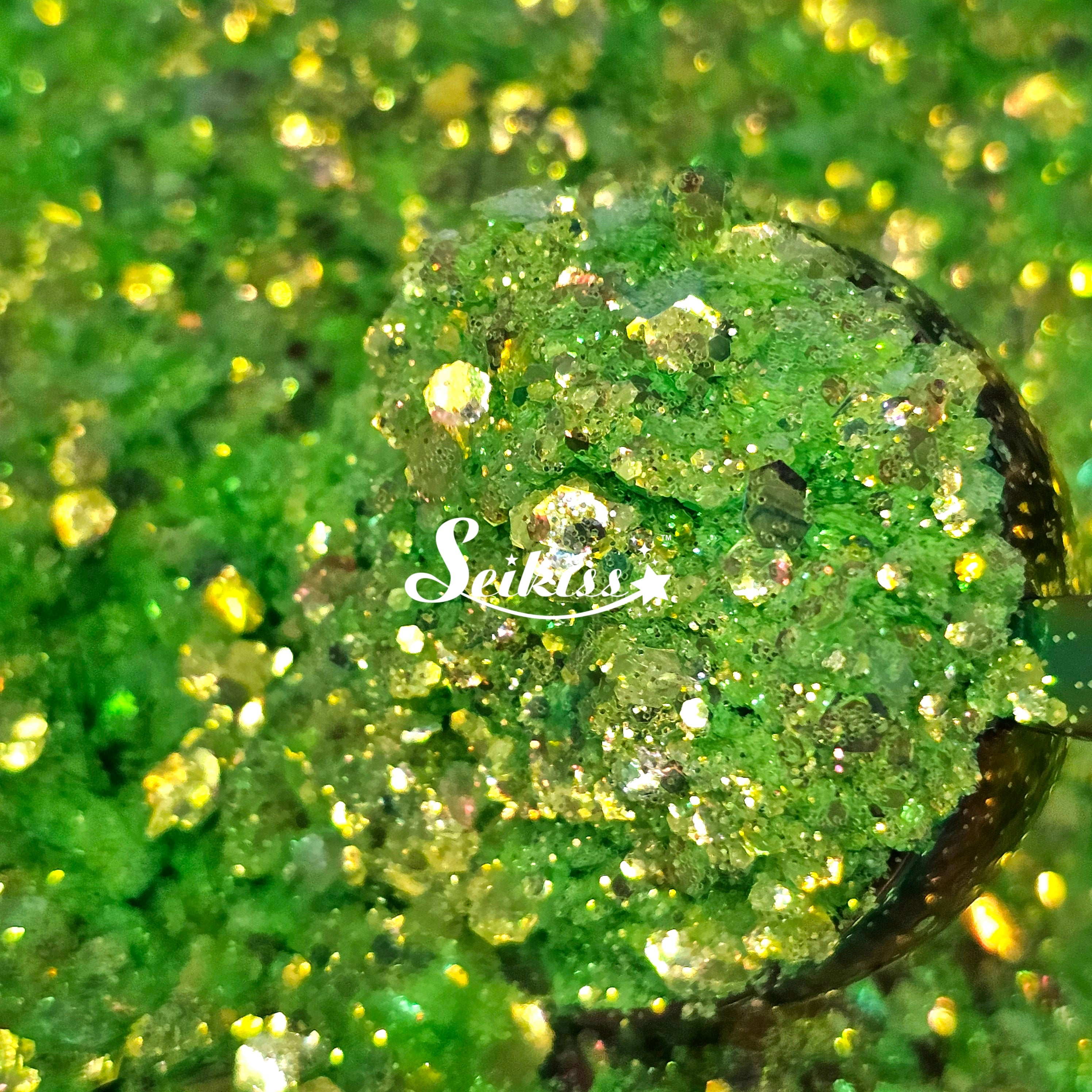 Gamma Chunky glitter mix is a bright green with a golden iridescent effect that makes your projects shine. Perfect for mixing with other colors and use with resin, nails, tumblers, jewelry, arts, and all types of crafts and projects.