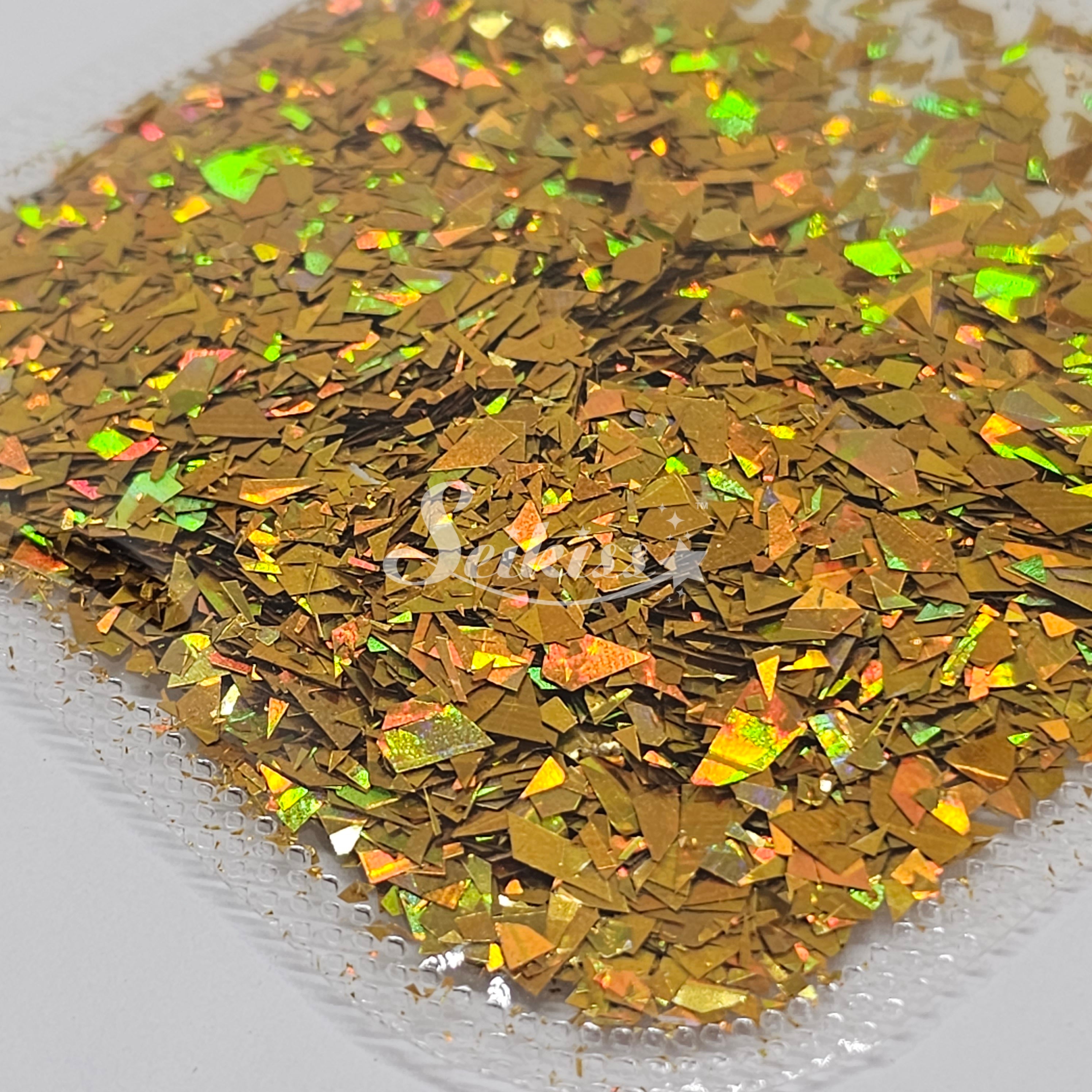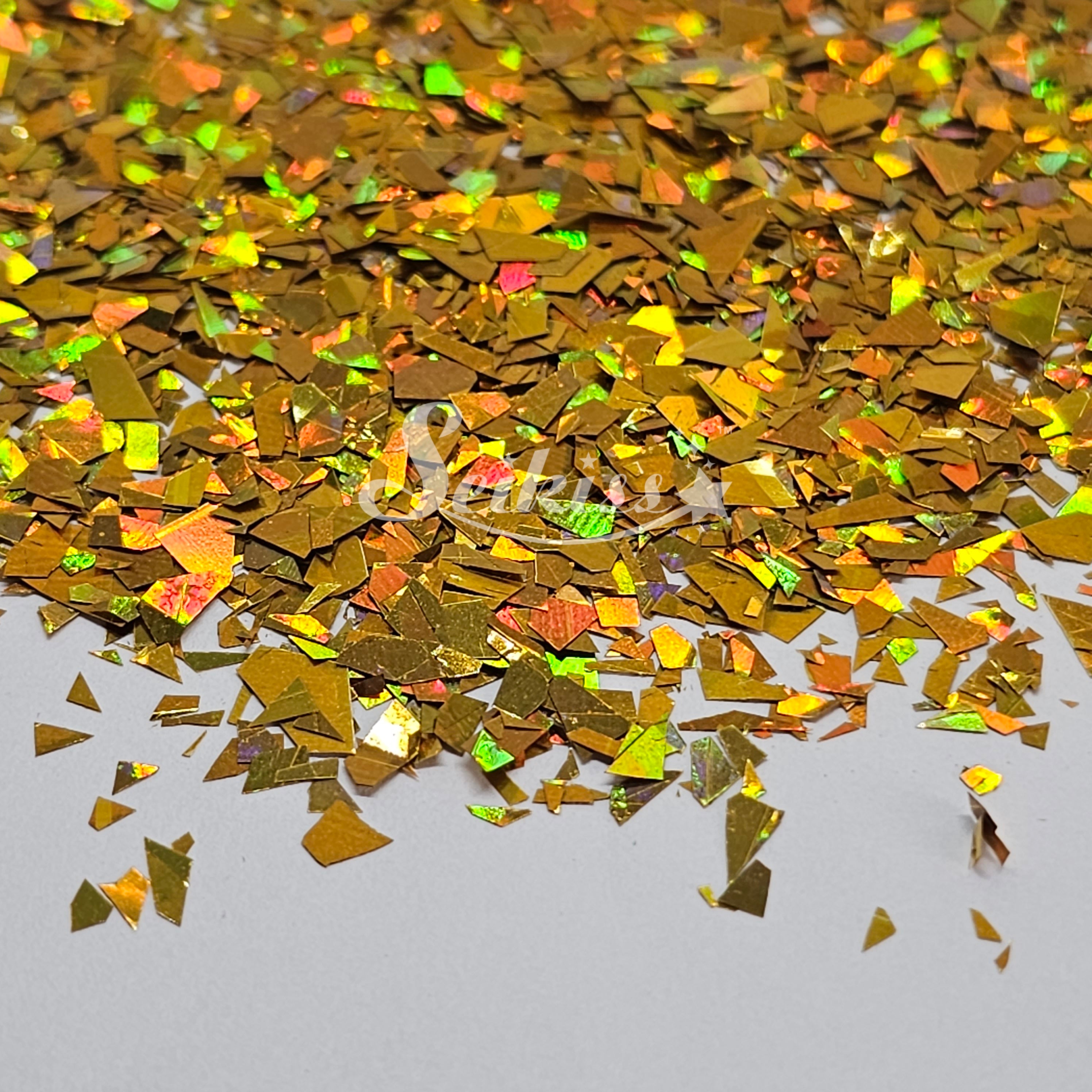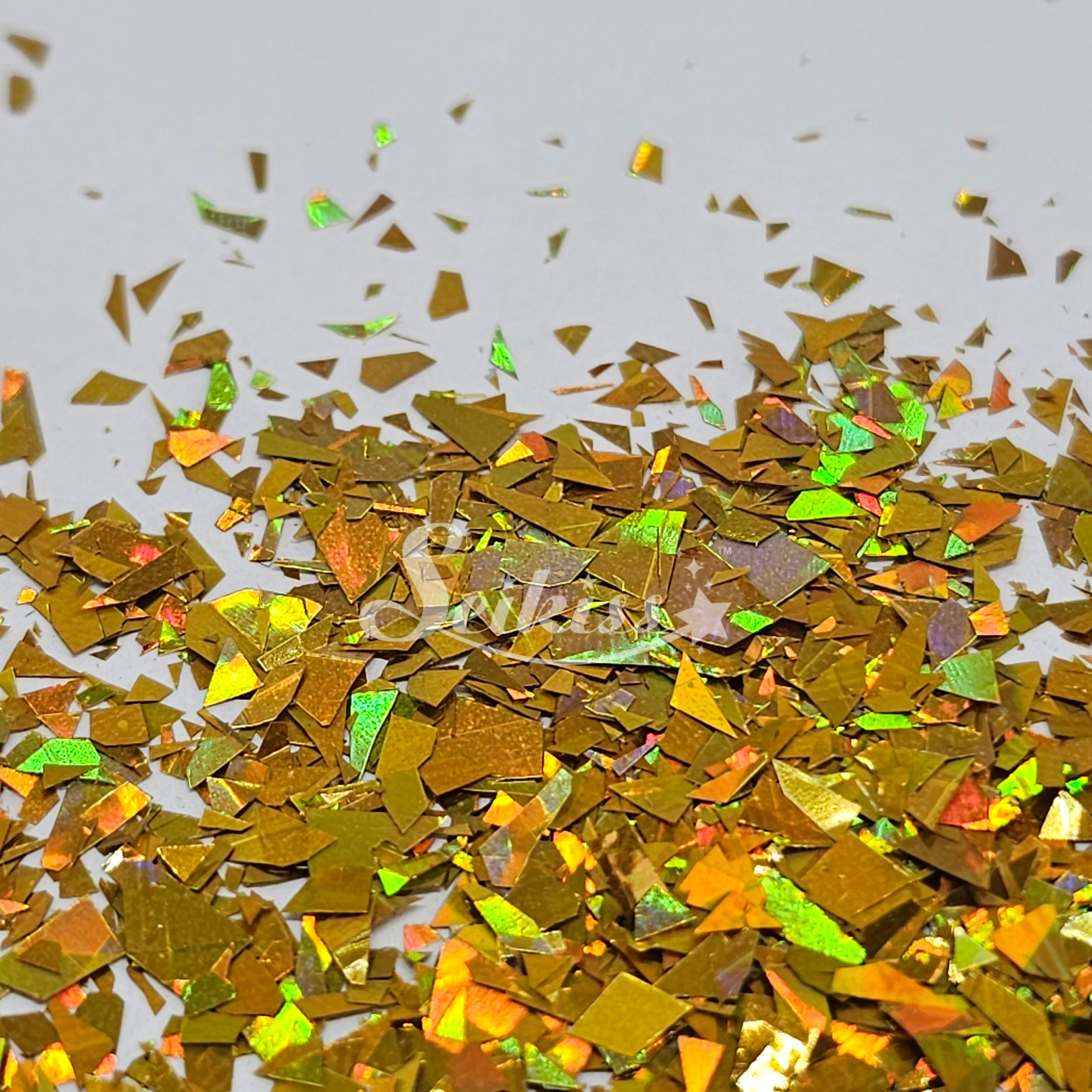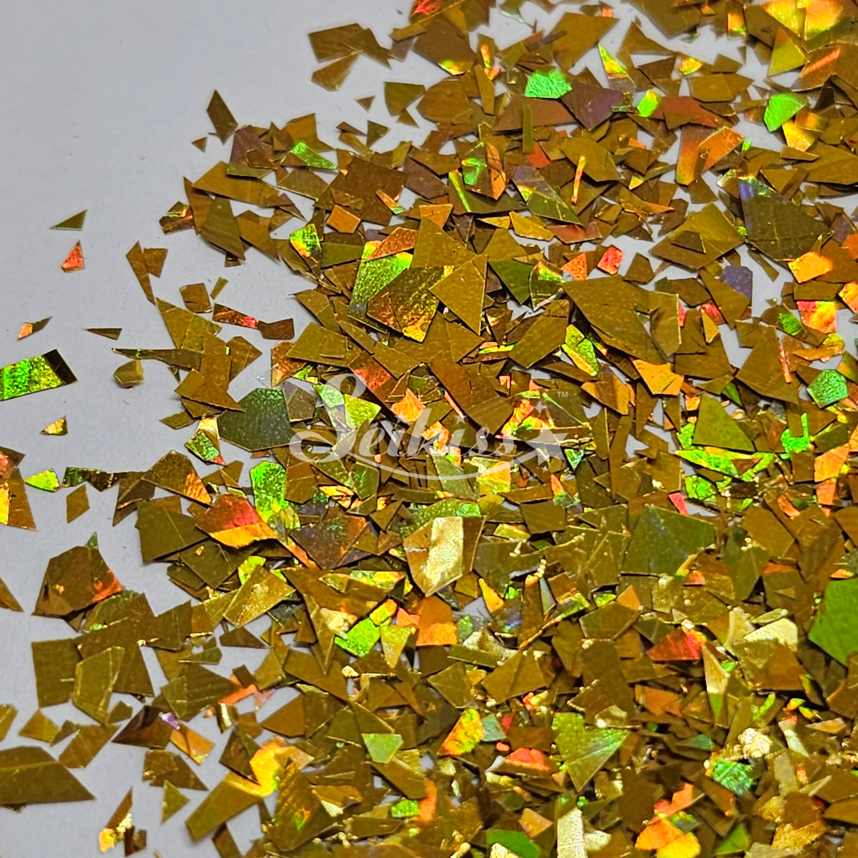 Golden Laser Flakes is a mix of gold flakes with a holographic finish. This makes your projects shine and is perfect for resin, nails, tumblers, jewelry, arts, and all types of crafts and projects.