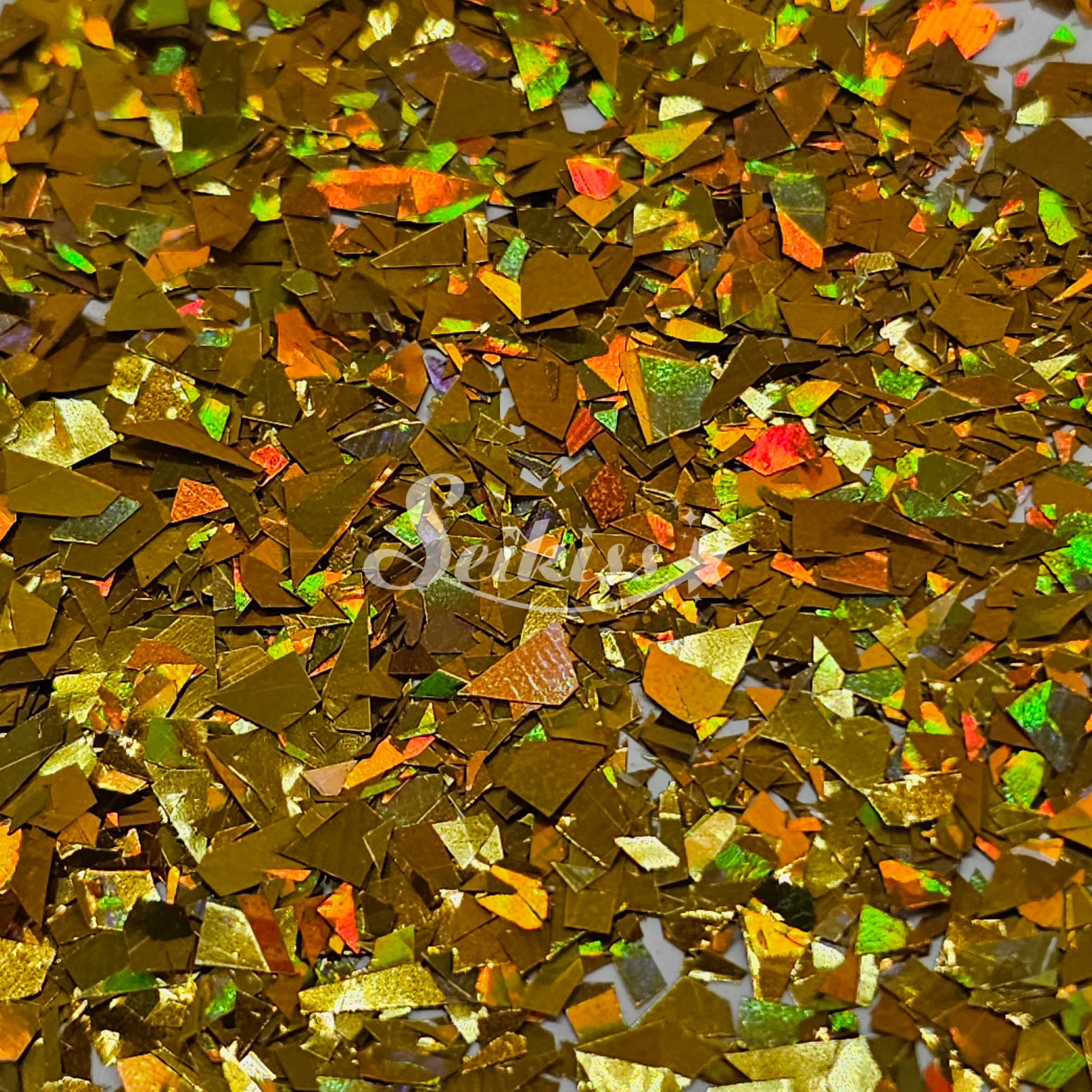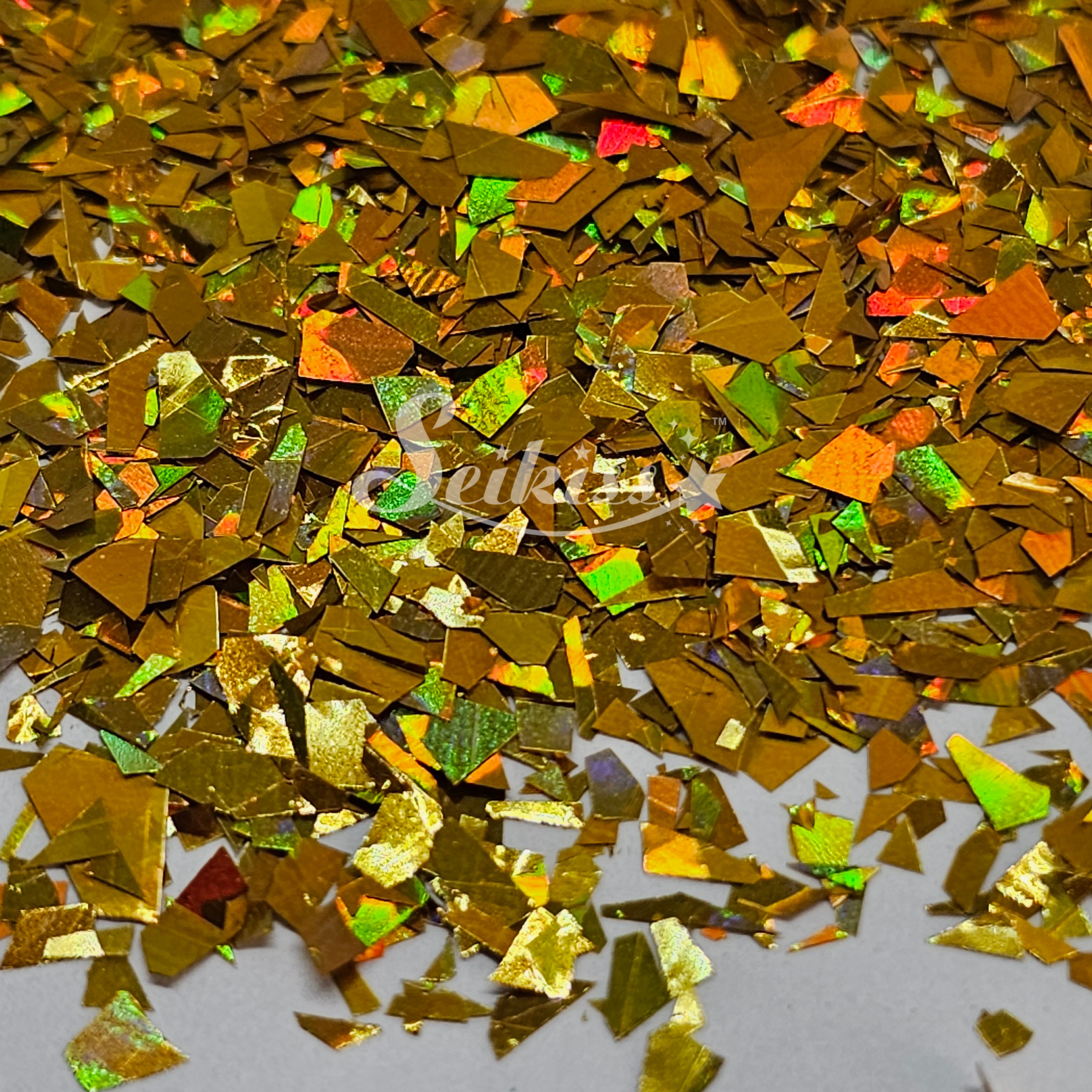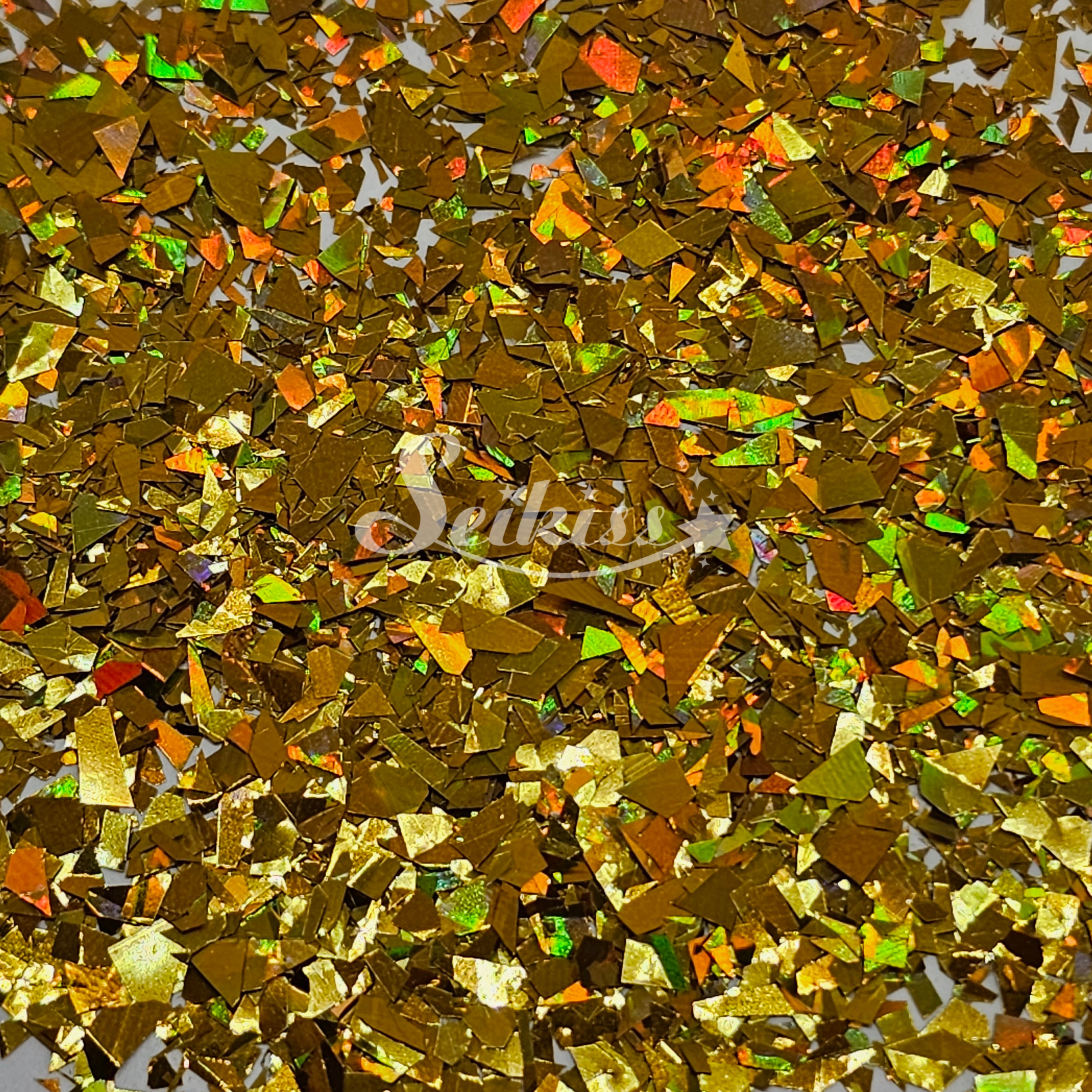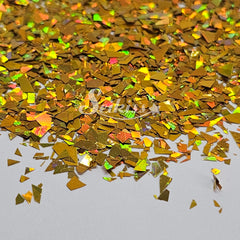 Golden Laser Flakes is a mix of gold flakes with a holographic finish. This makes your projects shine and is perfect for resin, nails, tumblers, jewelry, arts, and all types of crafts and projects.