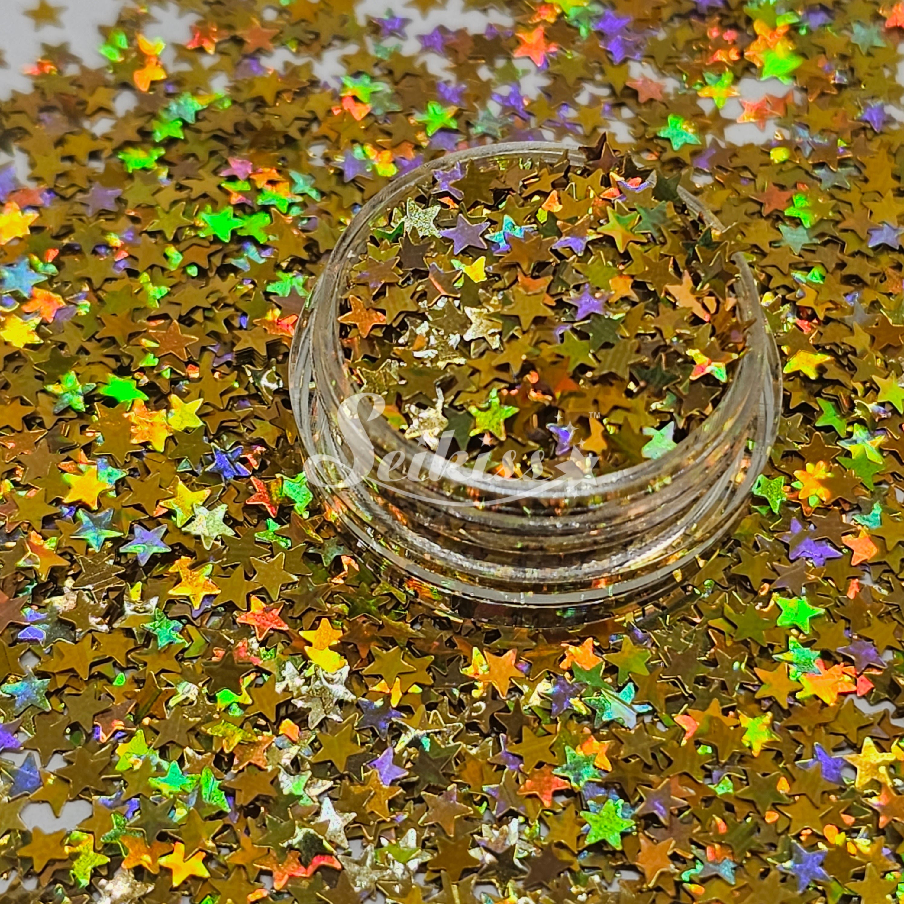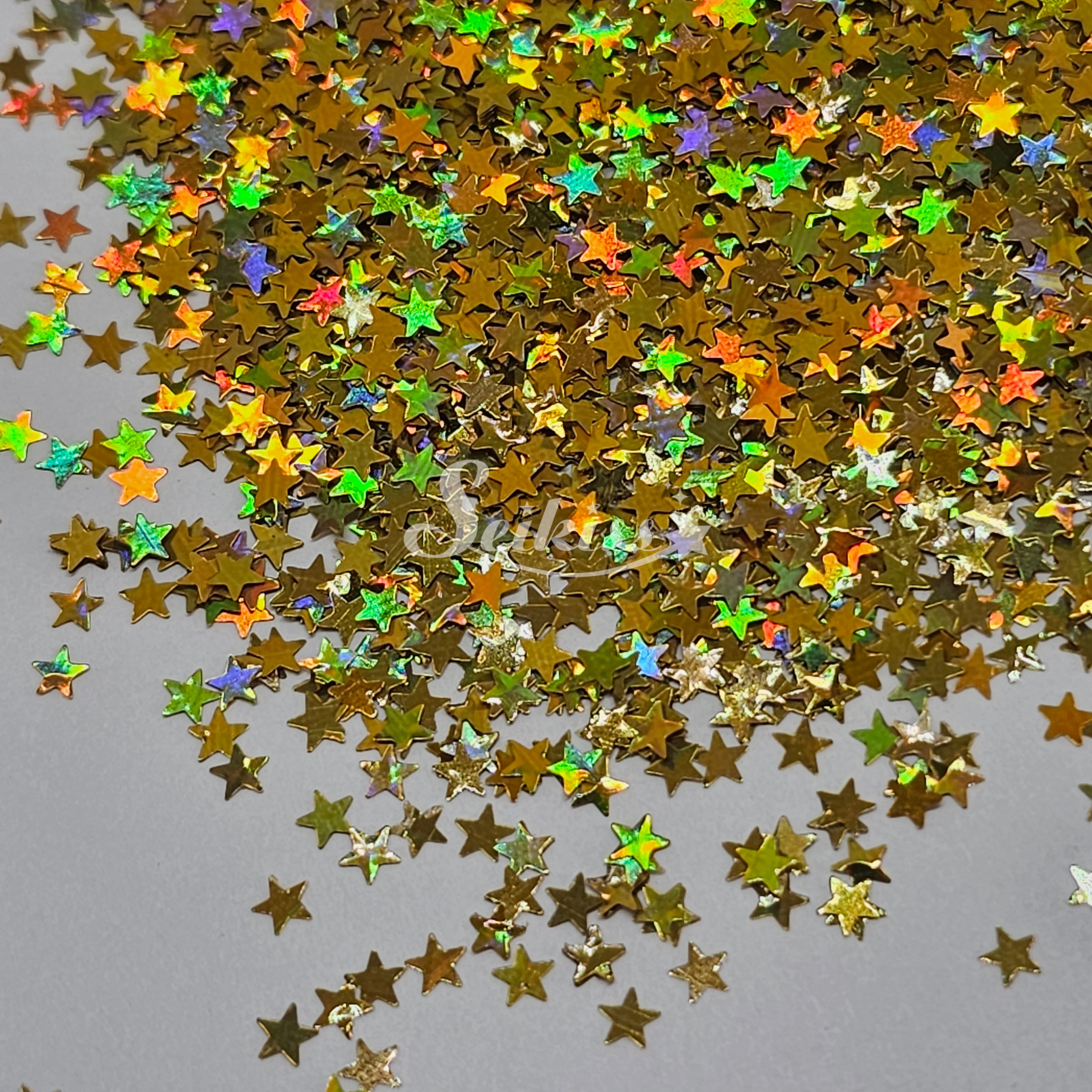 Holographic Gold Stars is a 4mm gold star shape with a holographic finish. This makes your projects shine and is perfect for resin, nails, tumblers, jewelry, arts, and all types of crafts and projects.