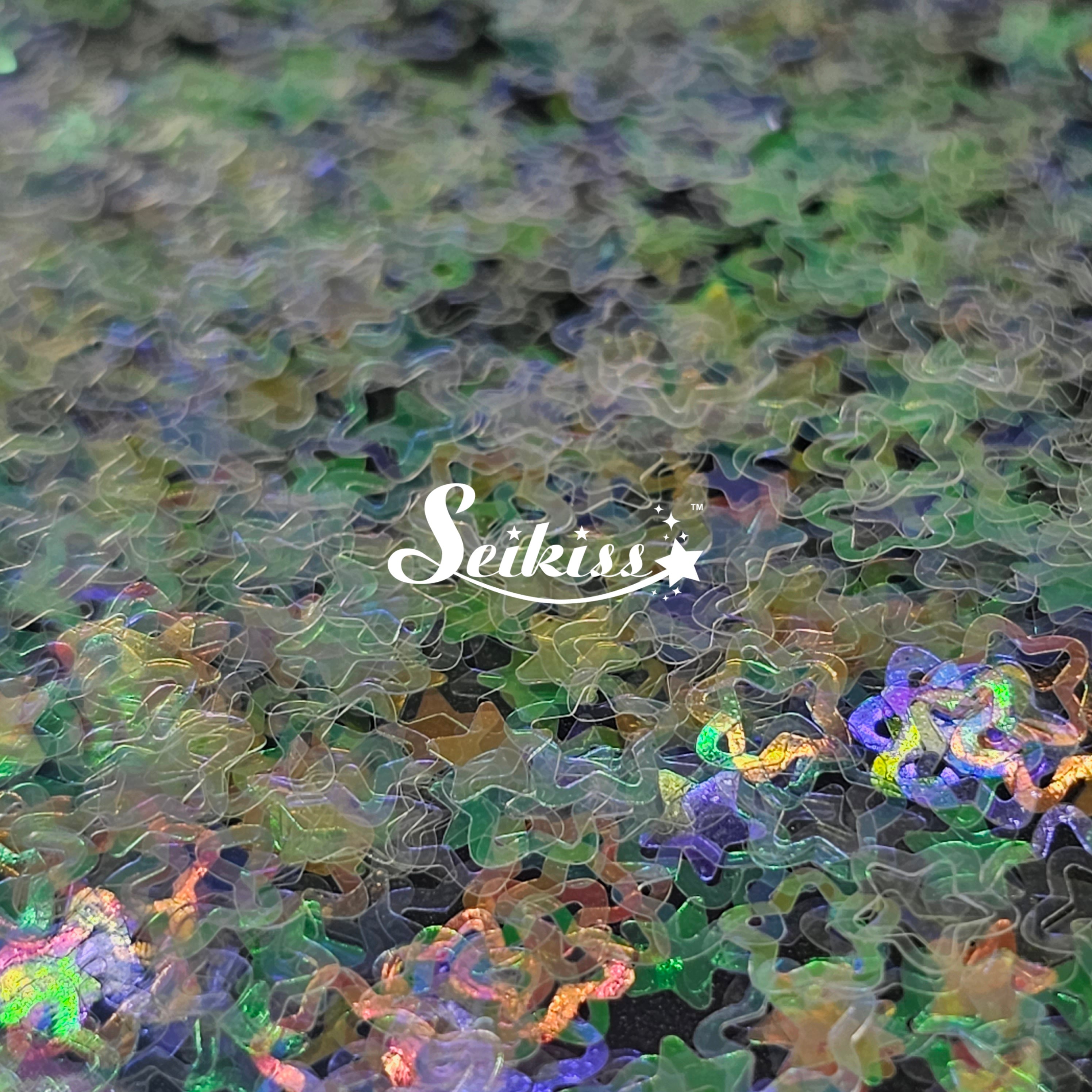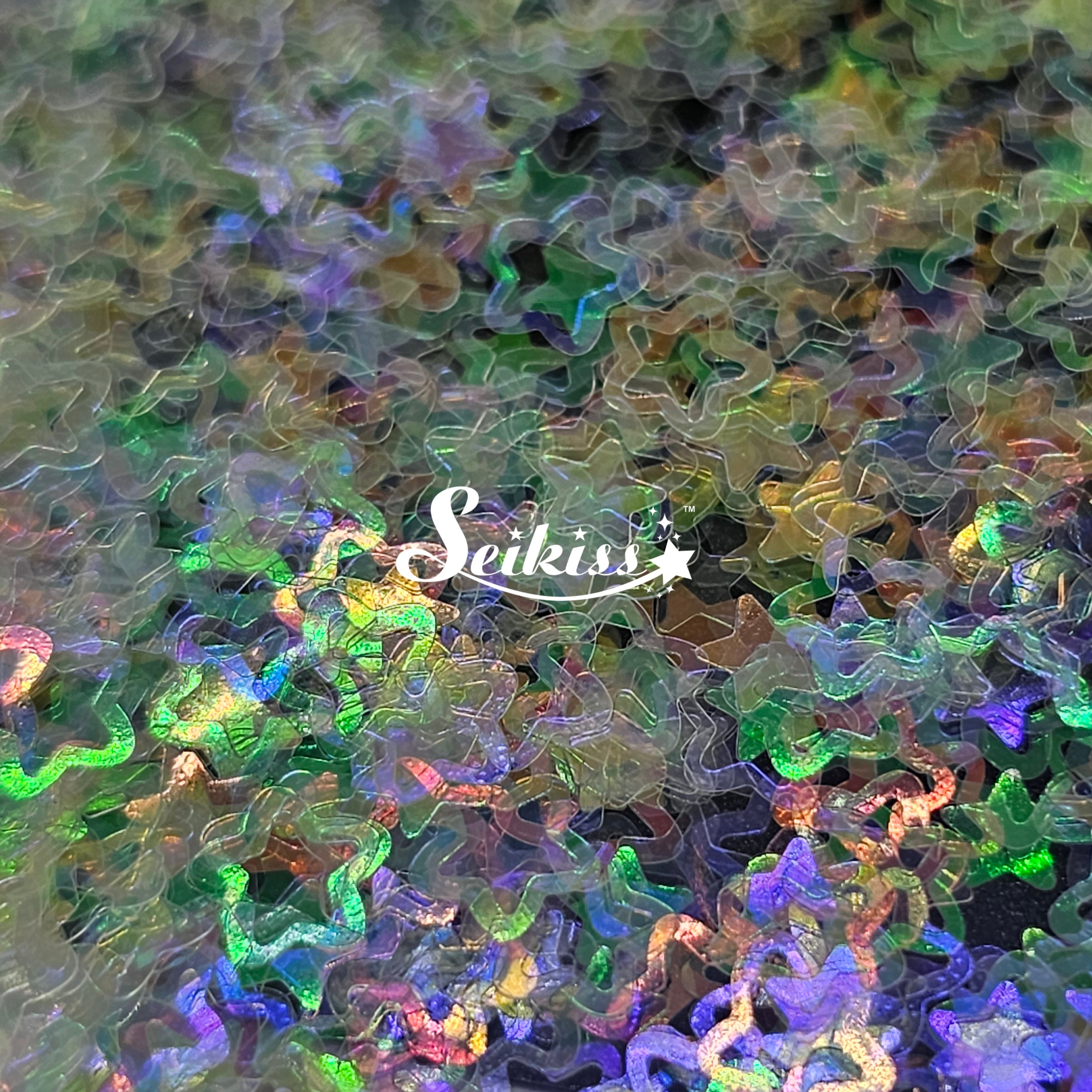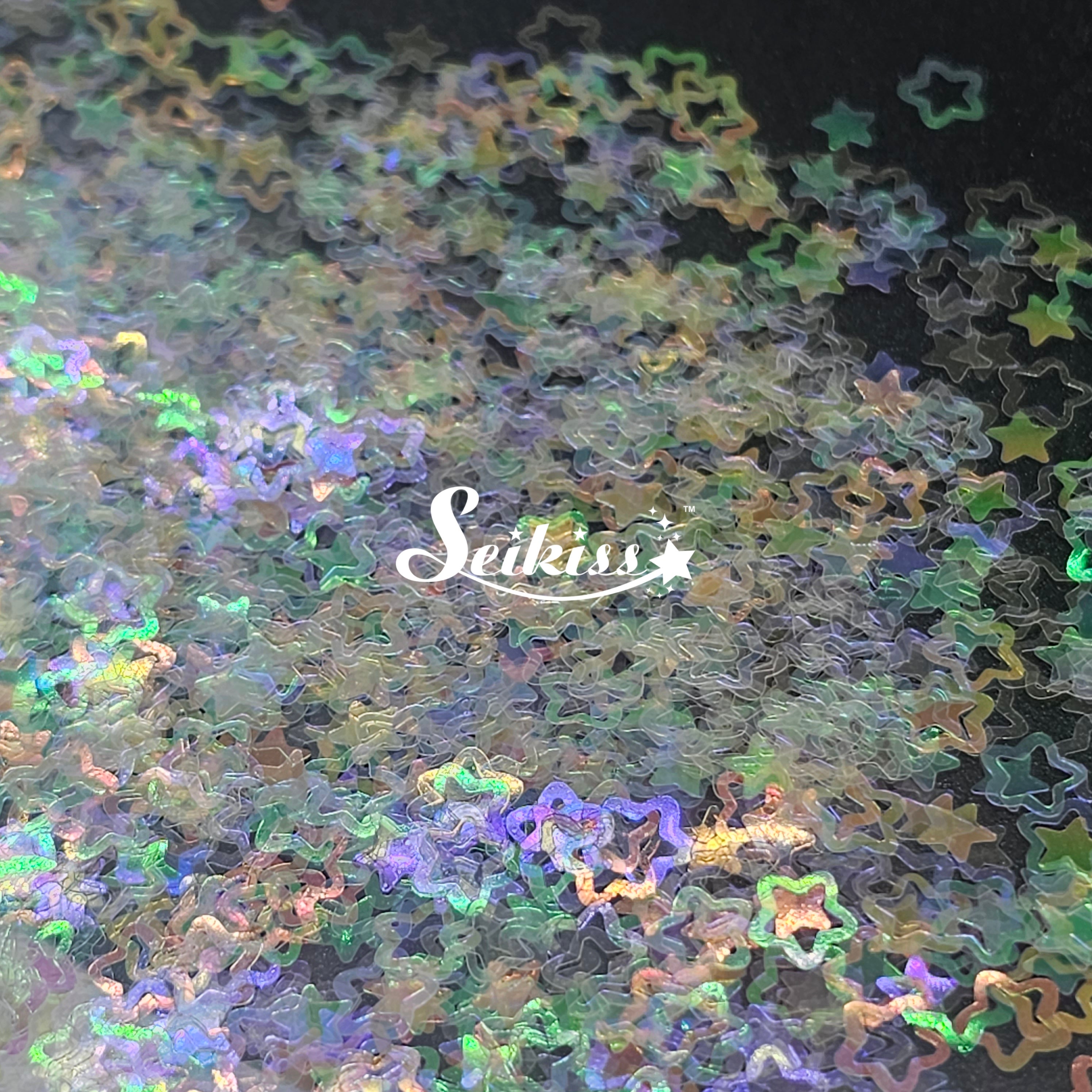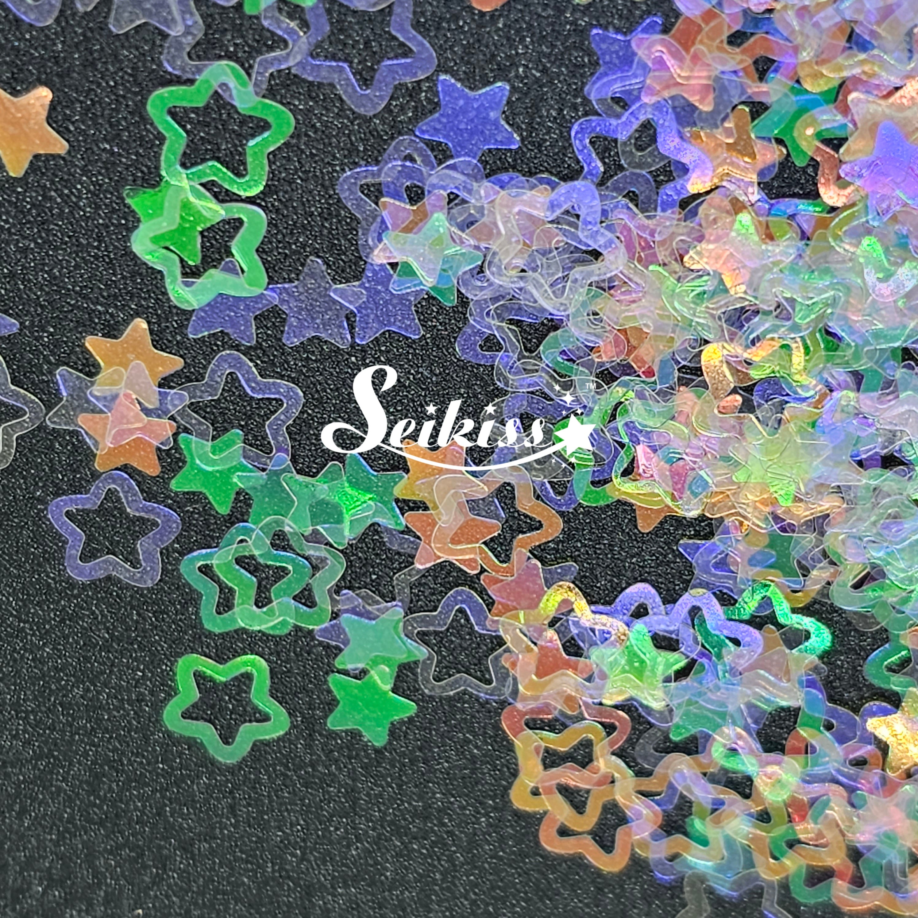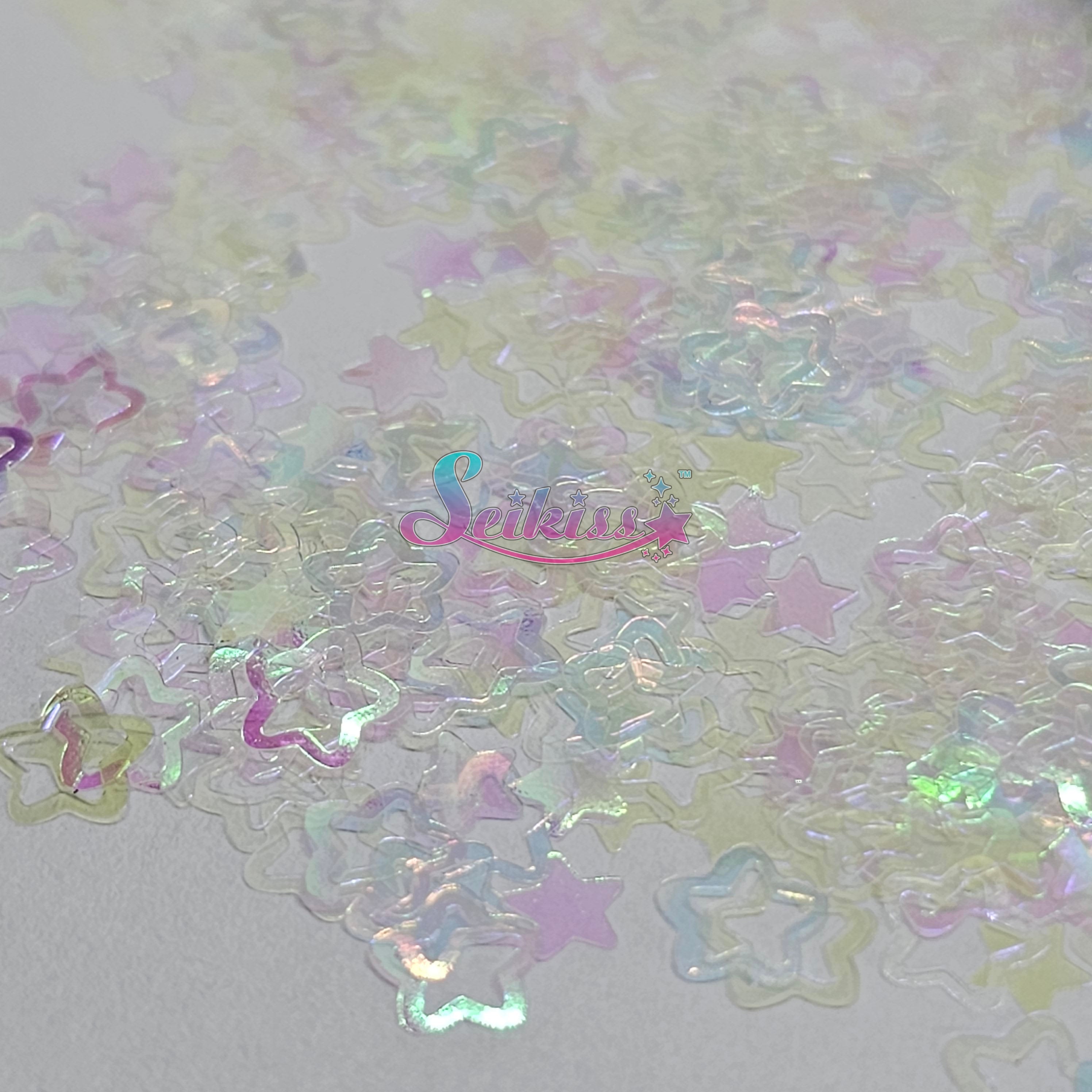 Iridescent Kawaii Stars is a mix of clear hollow star and regular star shapes with an iridescent finish. This makes your projects shine and is perfect for resin, nails, tumblers, jewelry, arts, and all types of crafts and projects.