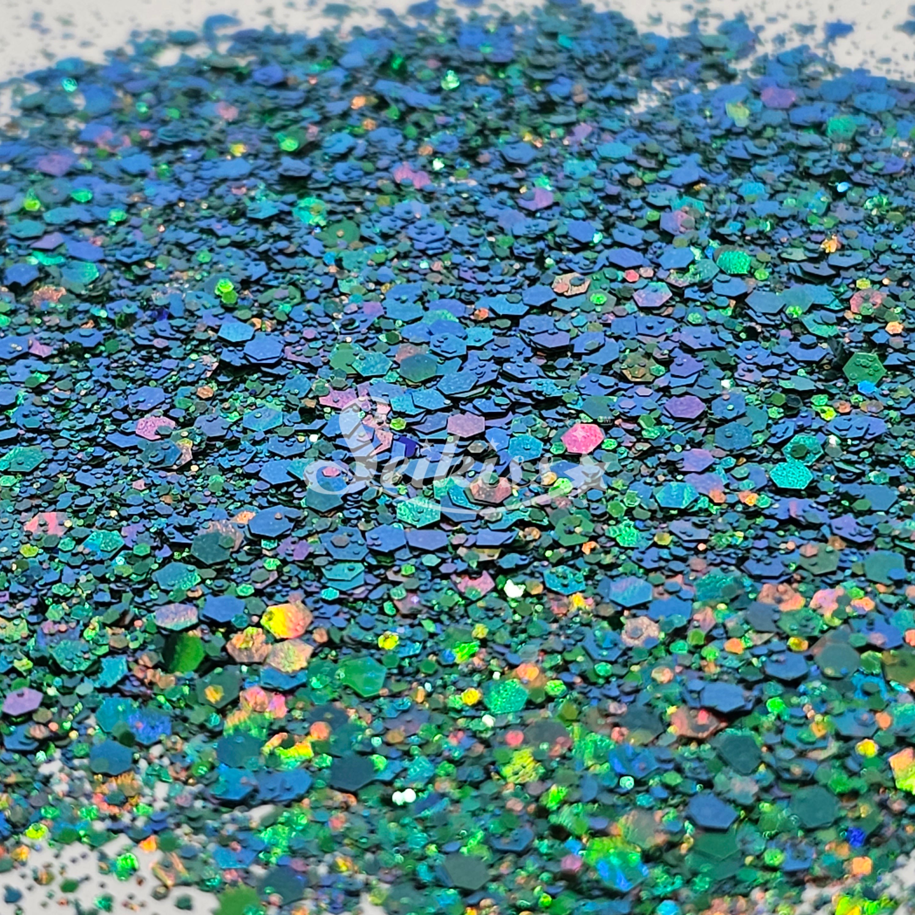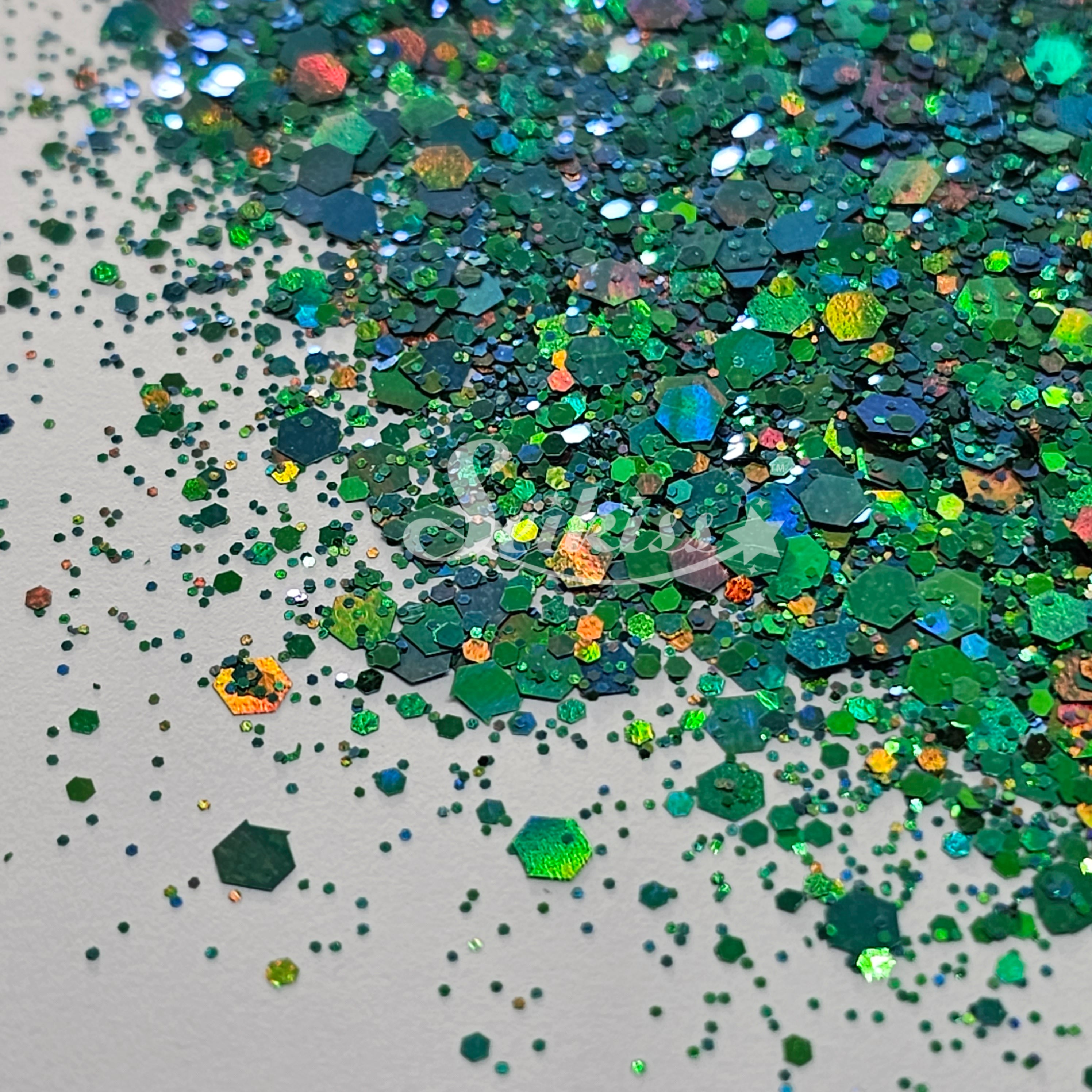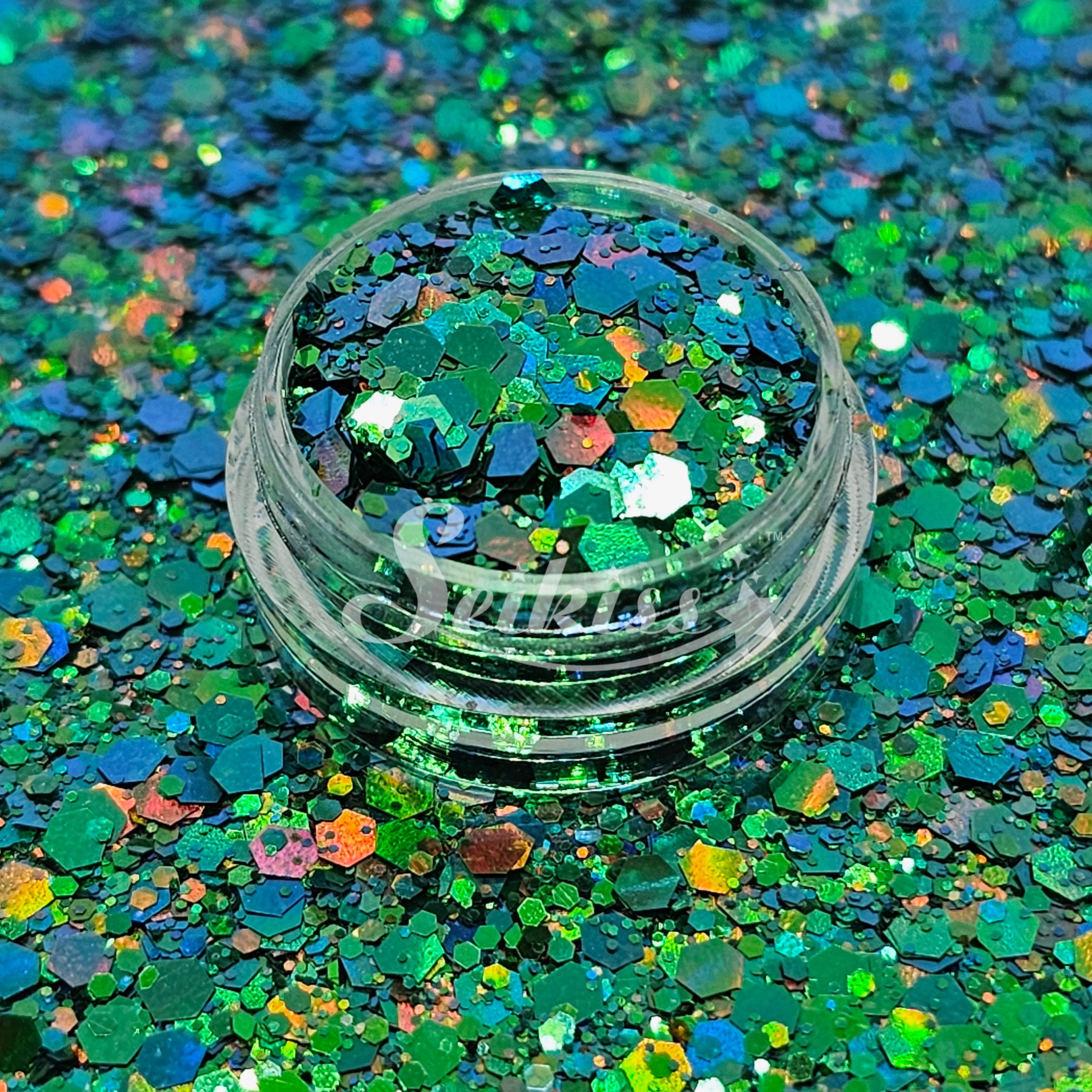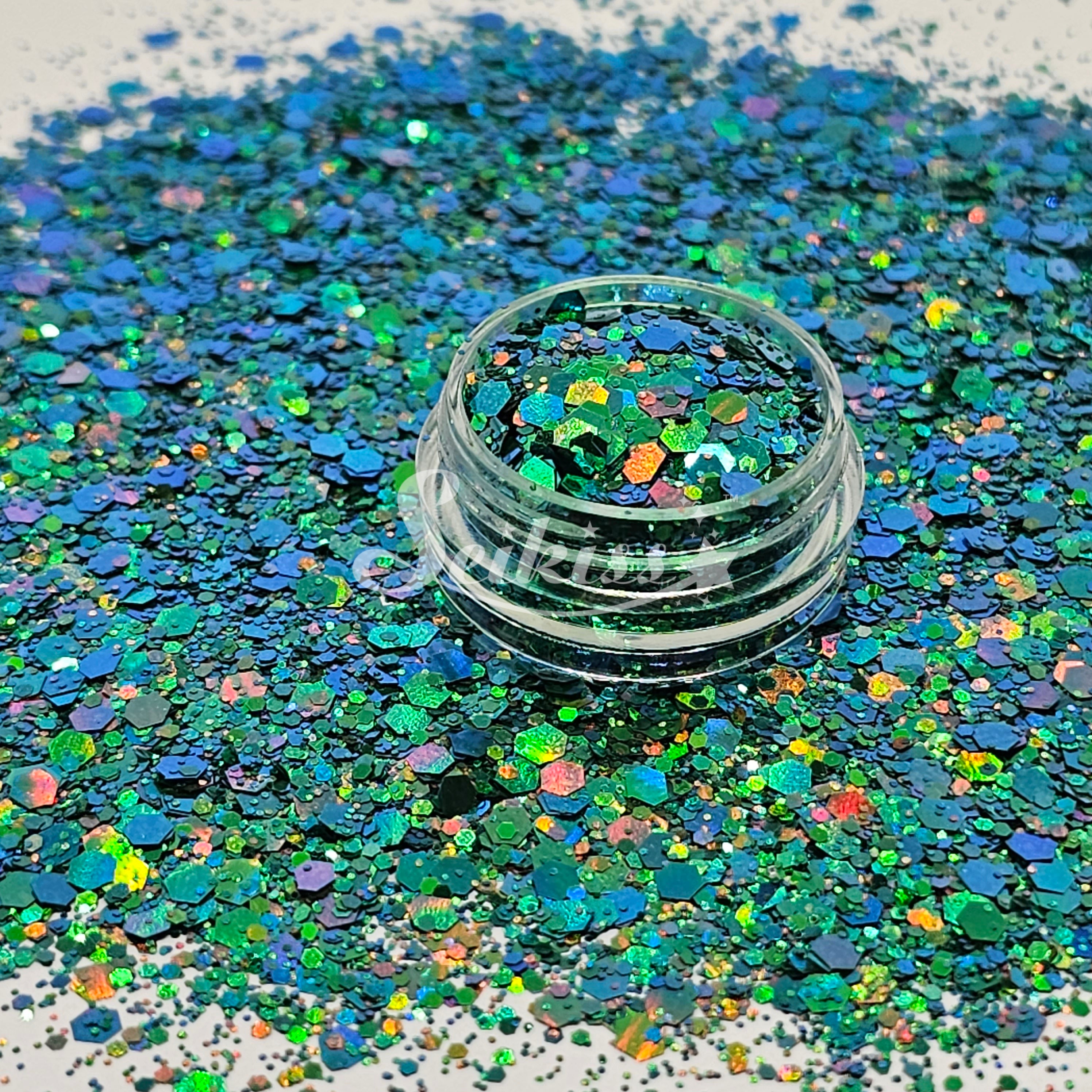 This colorful green chunky mix of sparkle, adds a stunning visual effect to your artwork with its realistic holographic and chameleon finish. Changing from green to blue