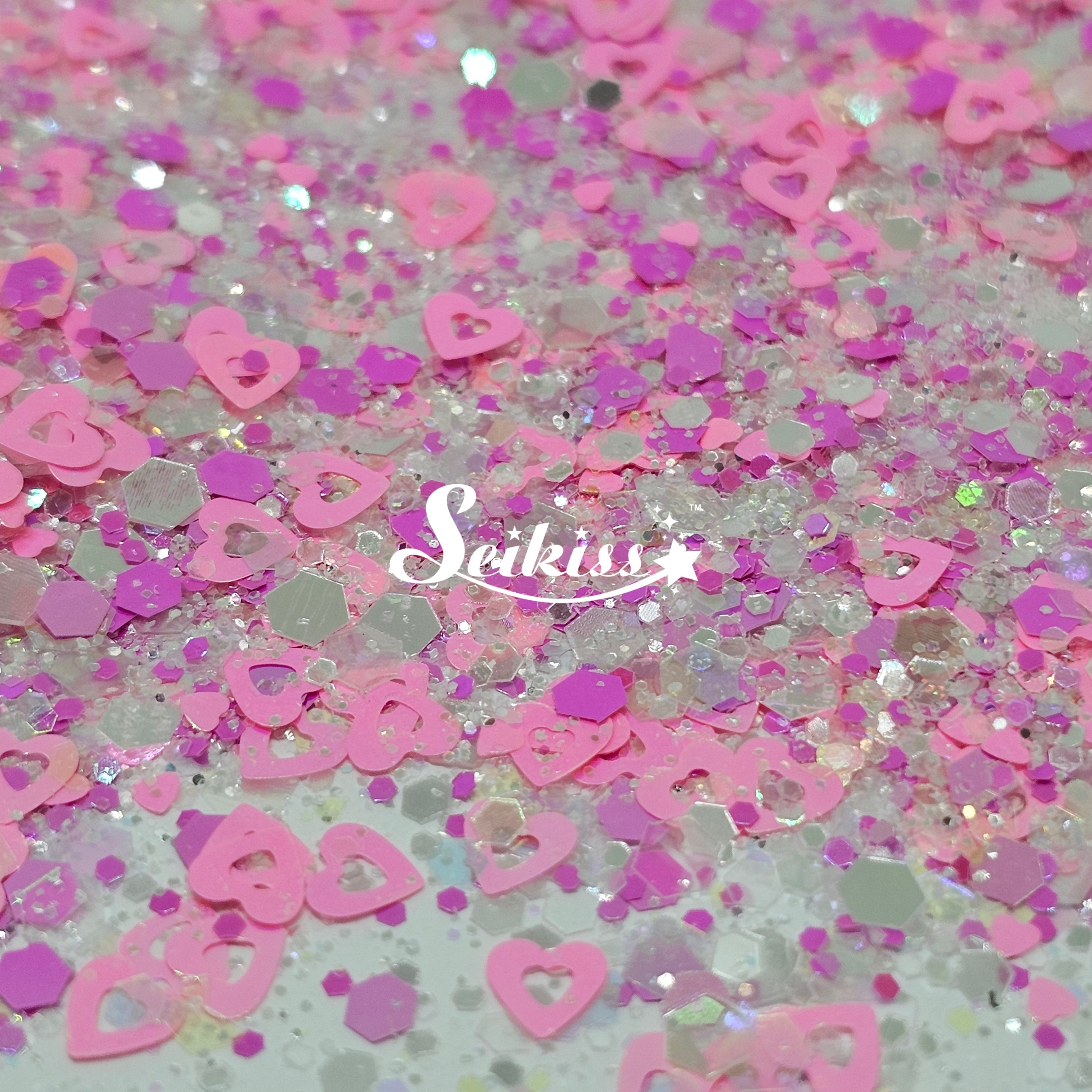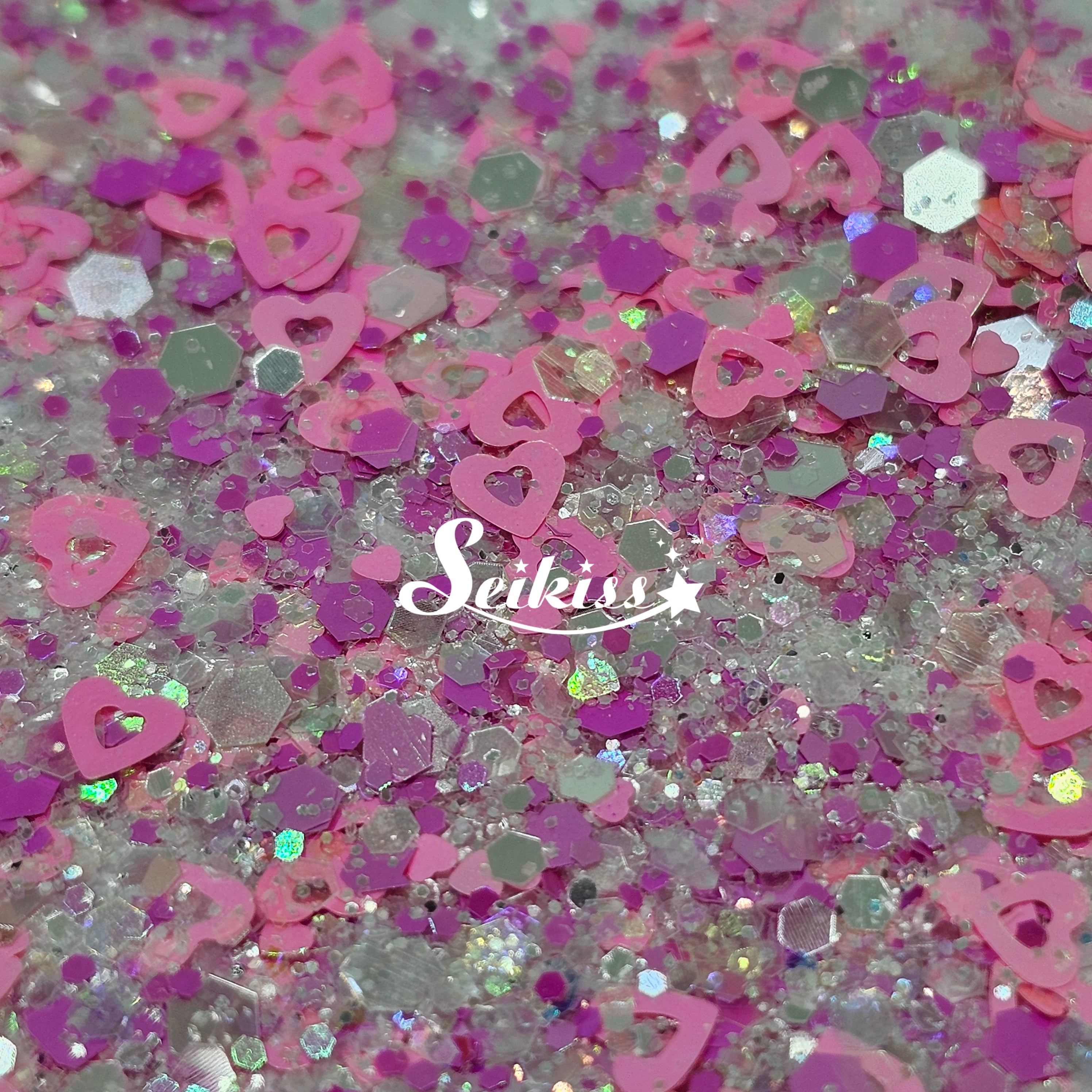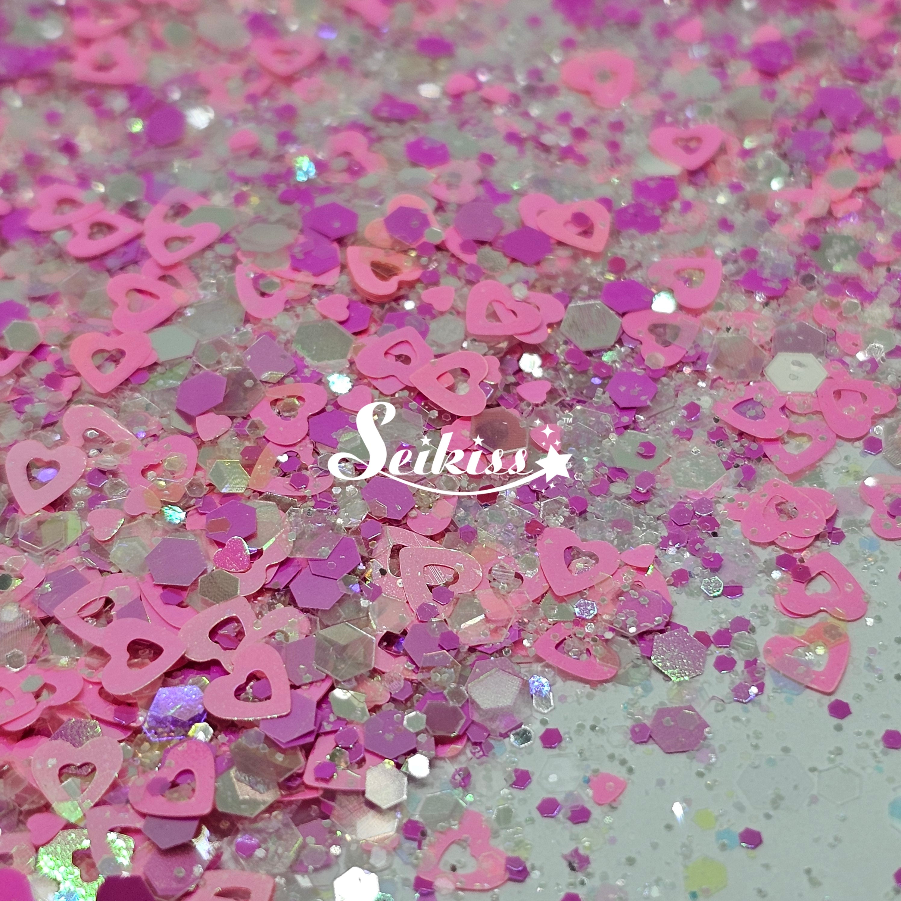 Juliet is a mix of iridescent pink hollow hearts with Iridescent pink chunky mix and a little of purple. Perfect for all your projects like resin, nails, tumblers, jewelry, arts, and all types of crafts.