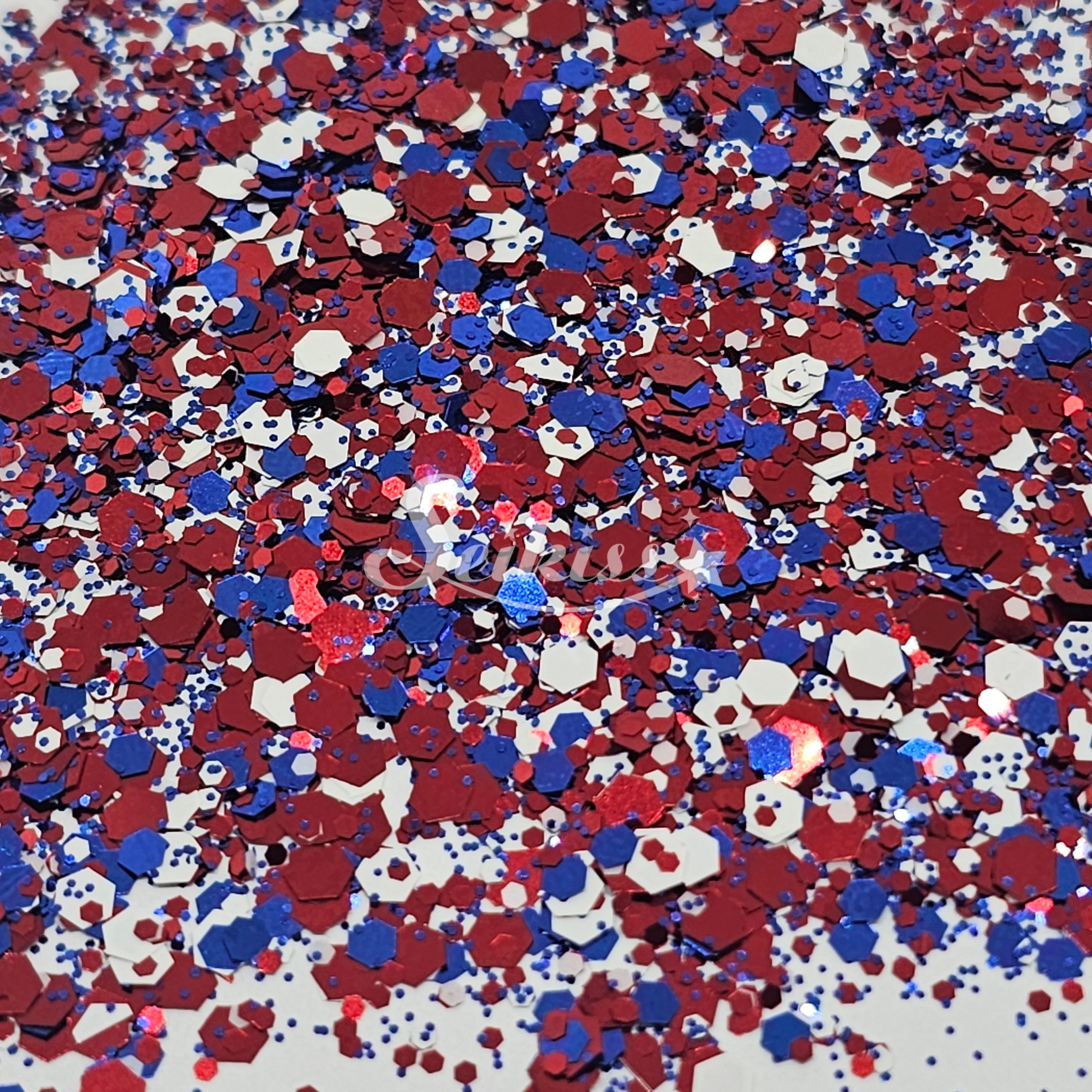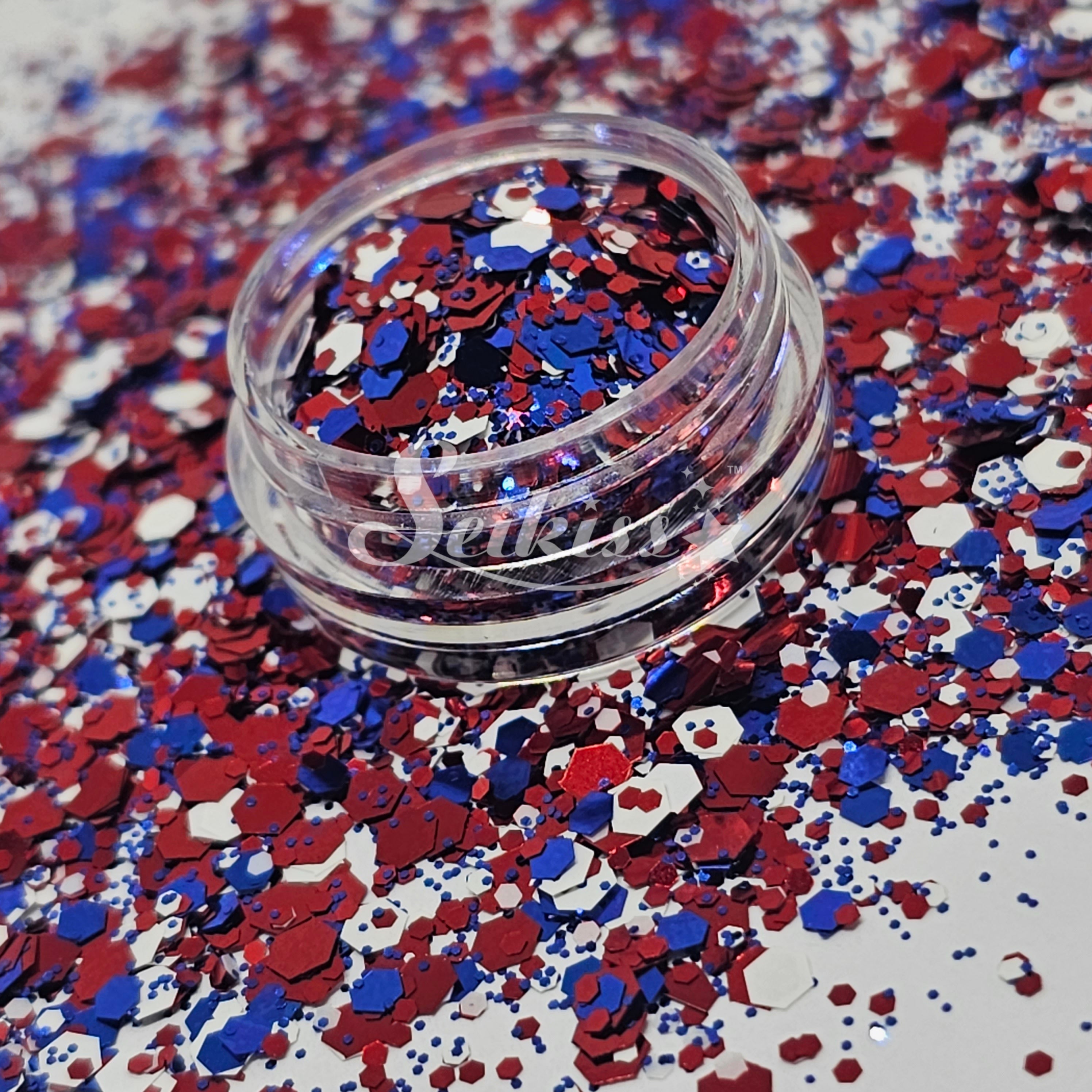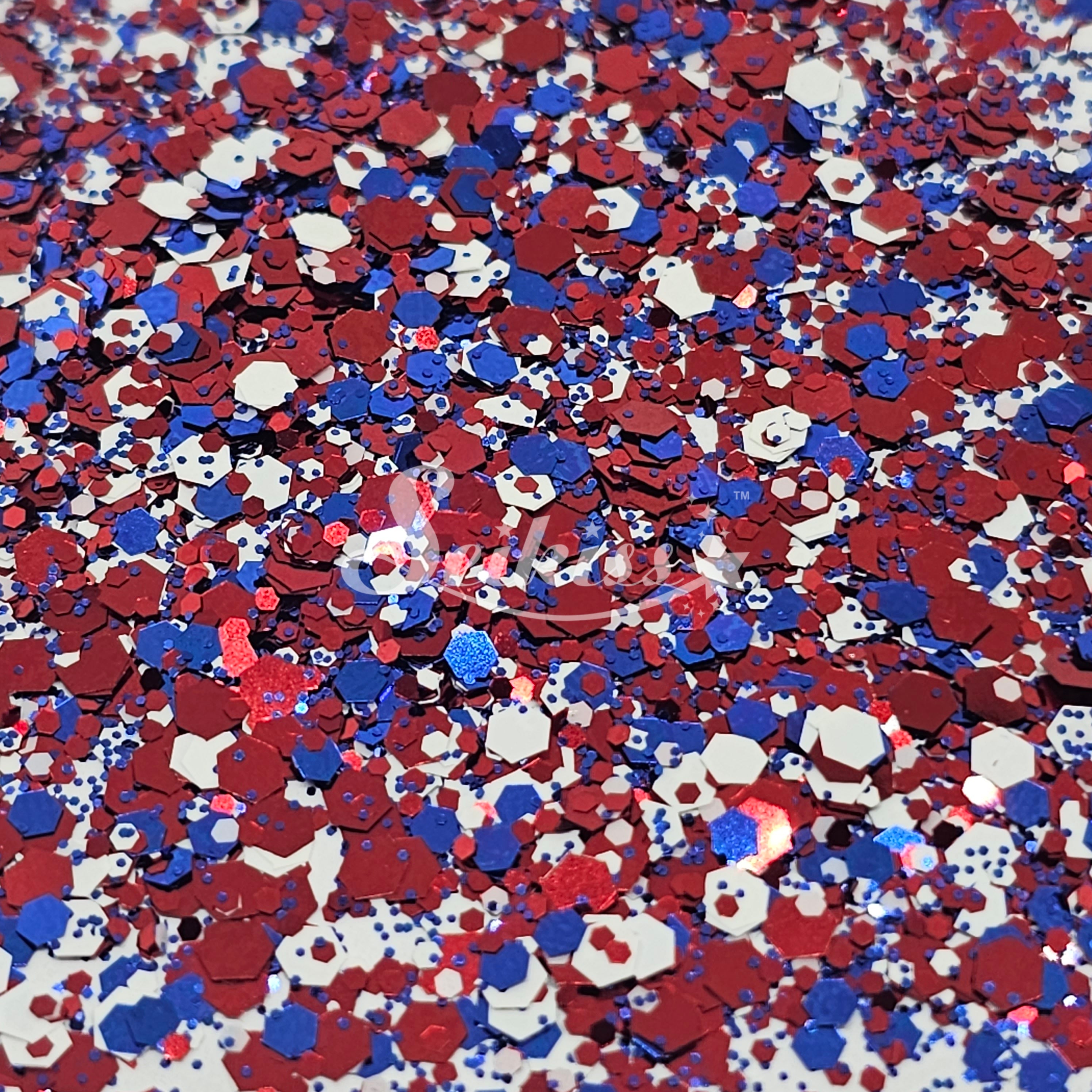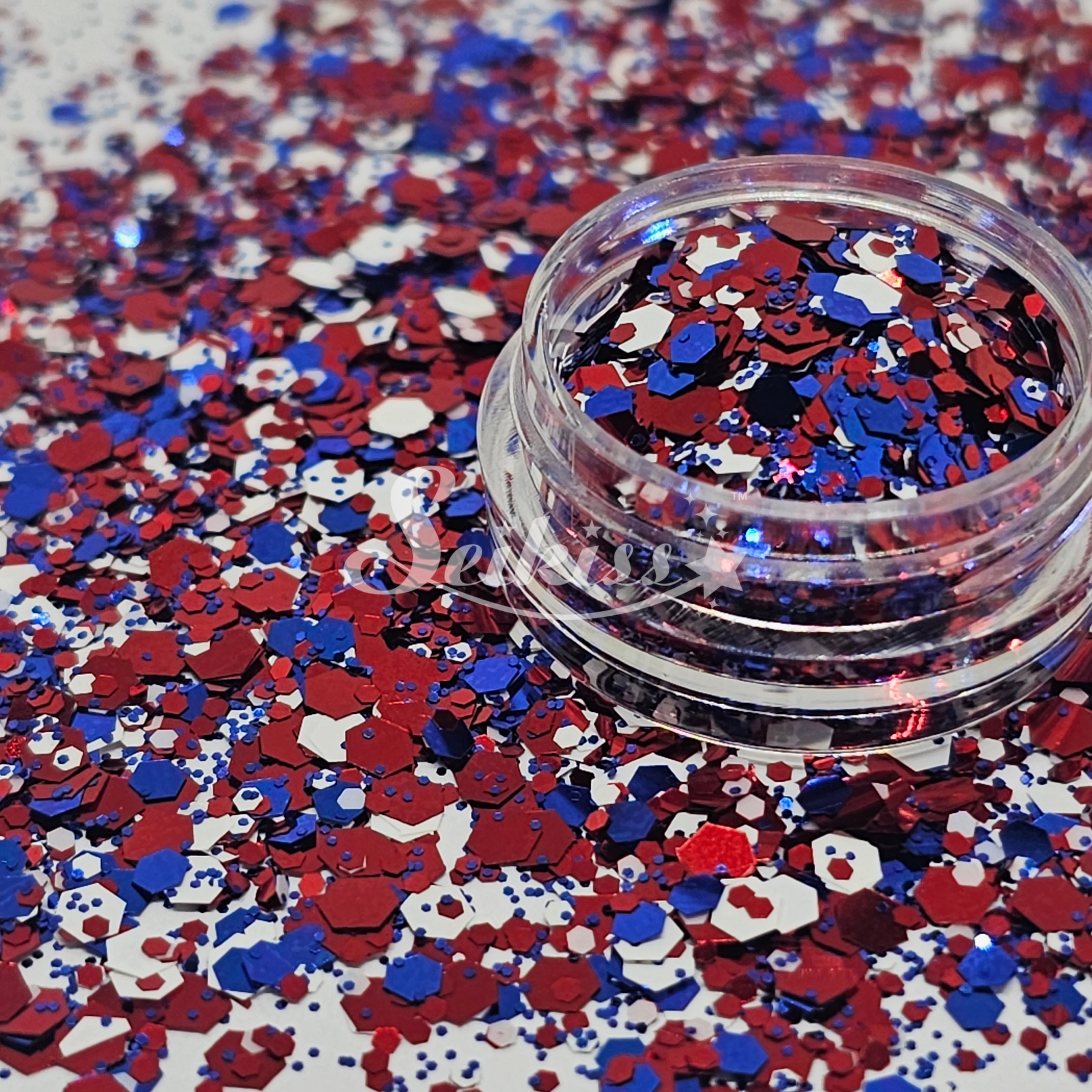 July is a metallic chunky mix of blue, white, and copper red adding a stunning visual effect to your artwork and patriotic spirit. This makes your projects shine and is perfect for resin, nails, tumblers, jewelry, arts, and all types of crafts and projects.