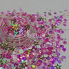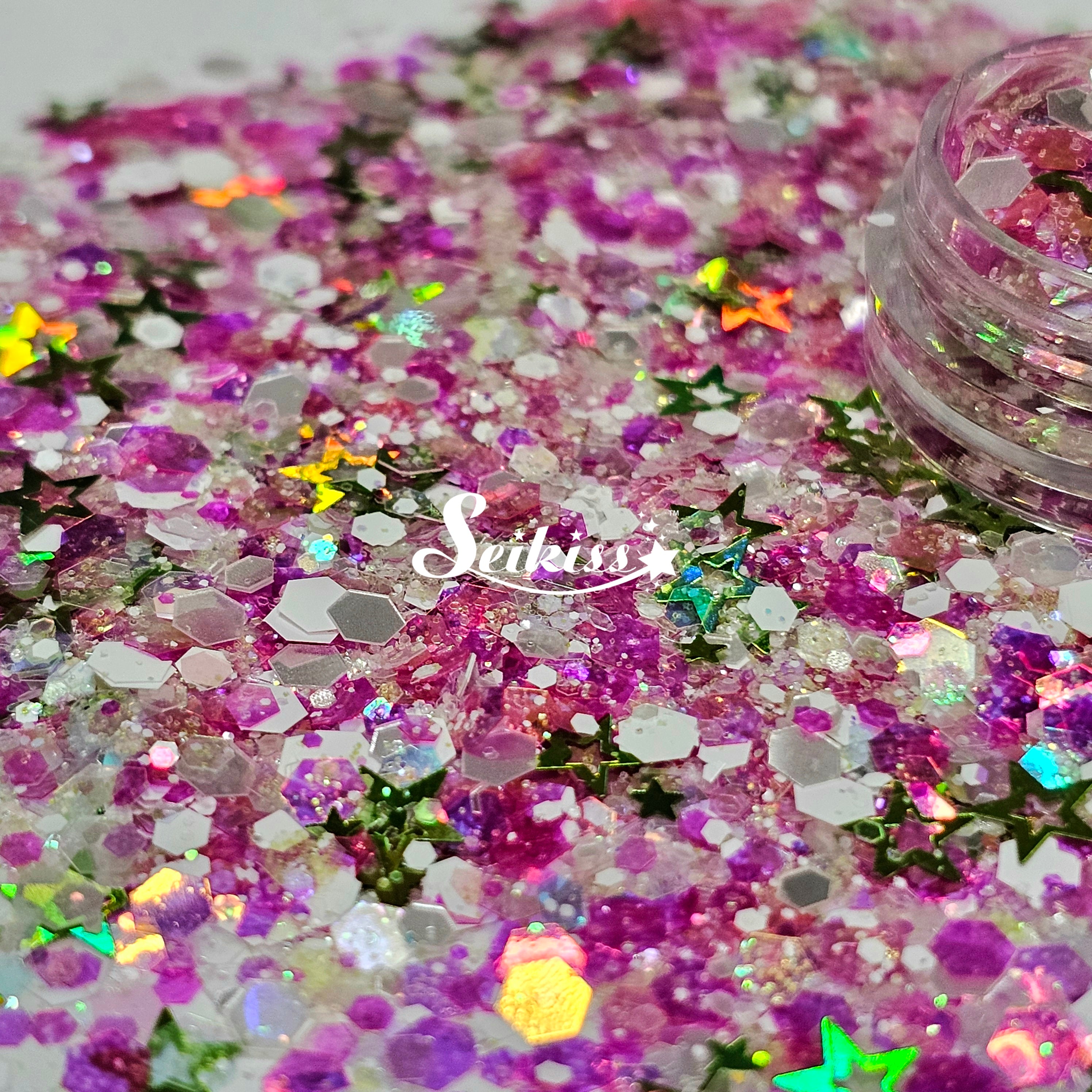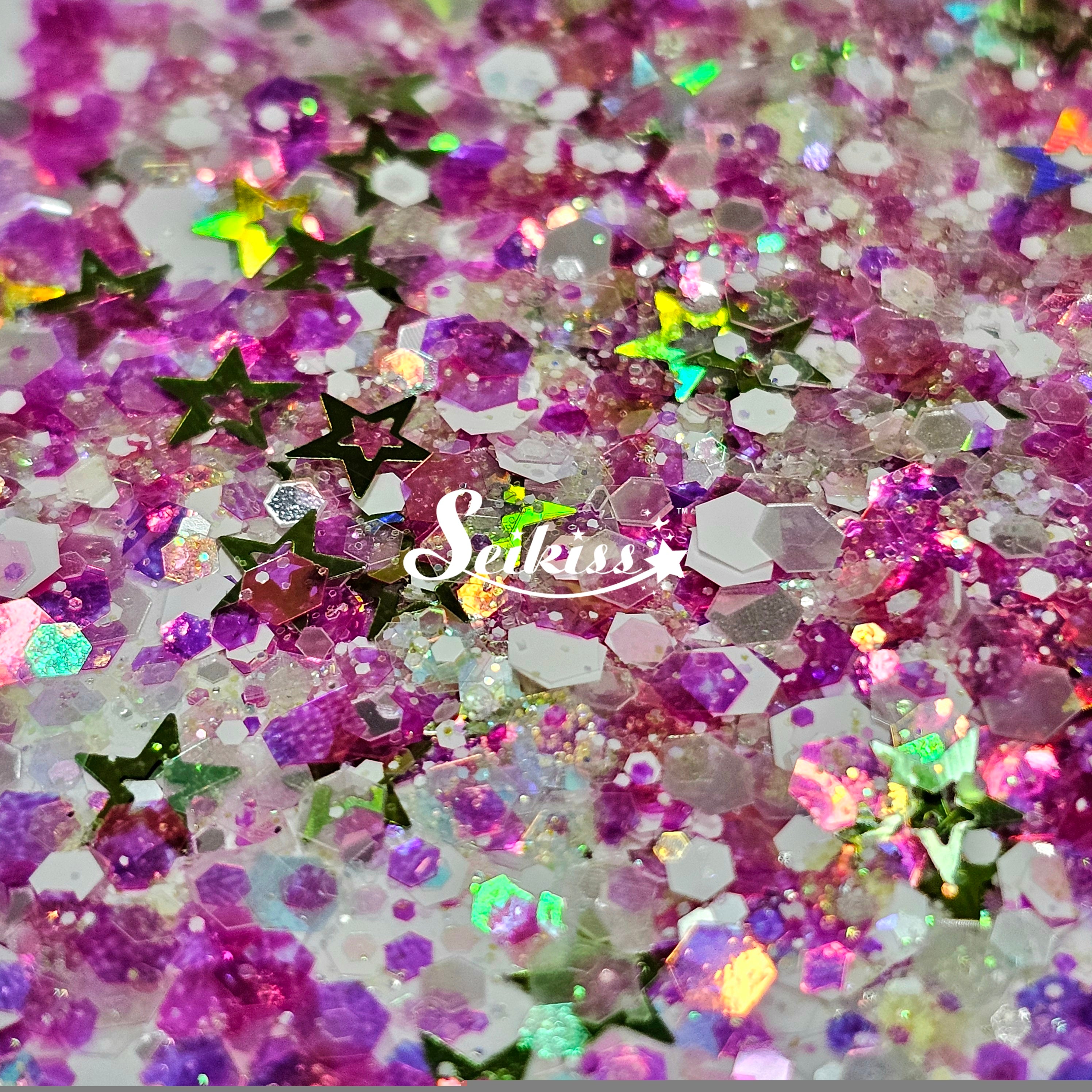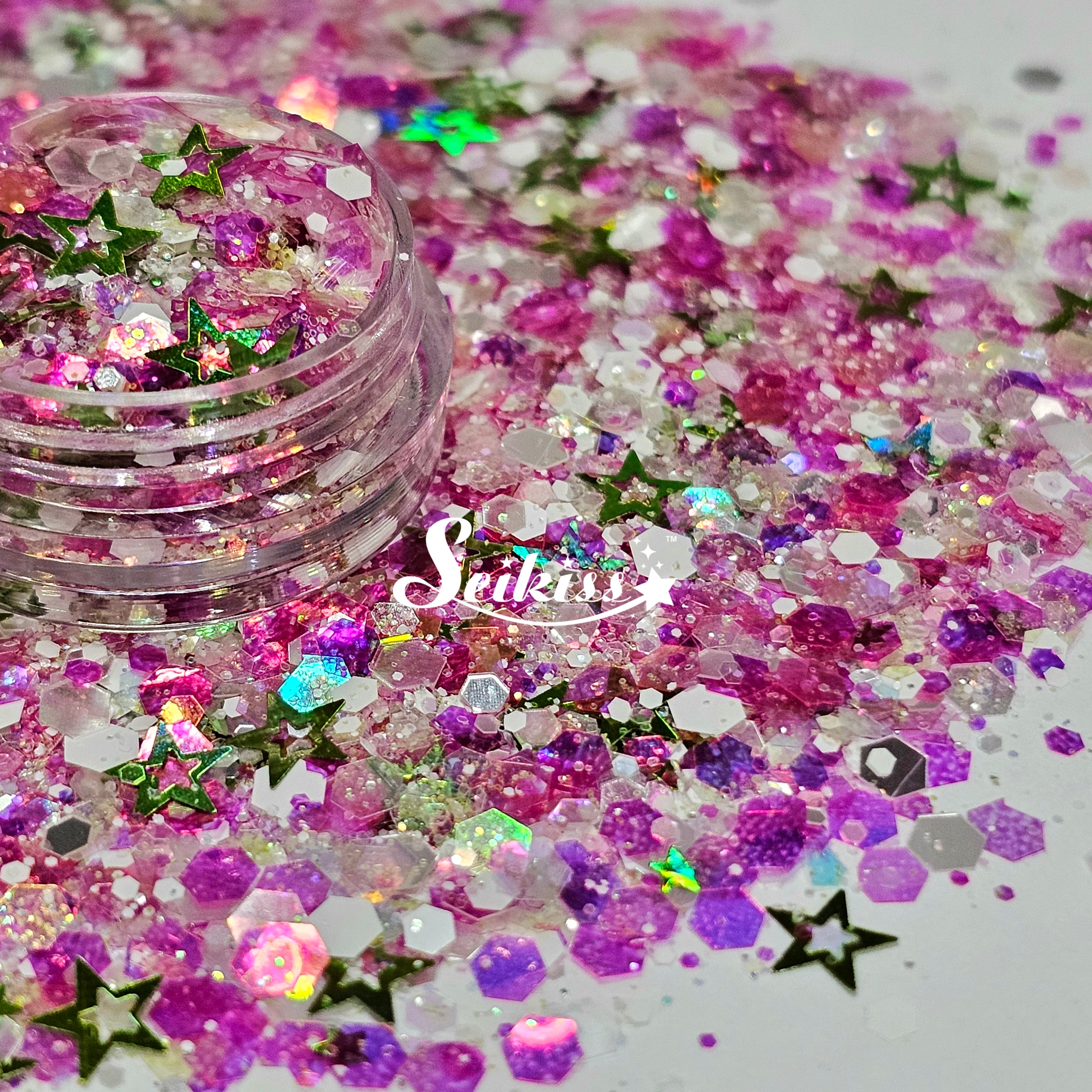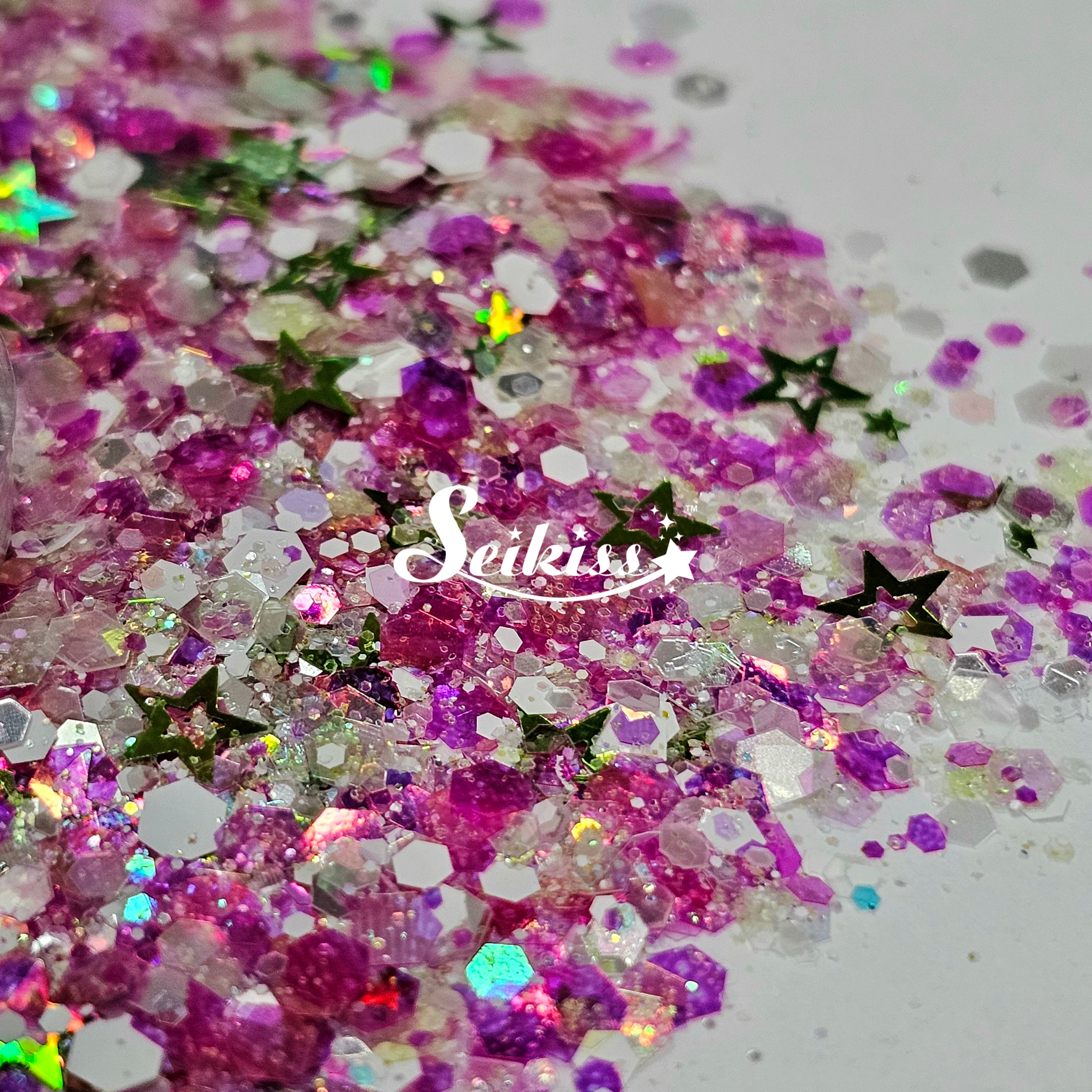 Melon Splash is a fresh custom chunky mix of fuchsia red, green holographic stars, pastel iridescent green, clear & metallic white. Perfect for all your projects like resin, nails, tumblers, jewelry, arts, and all types of crafts.