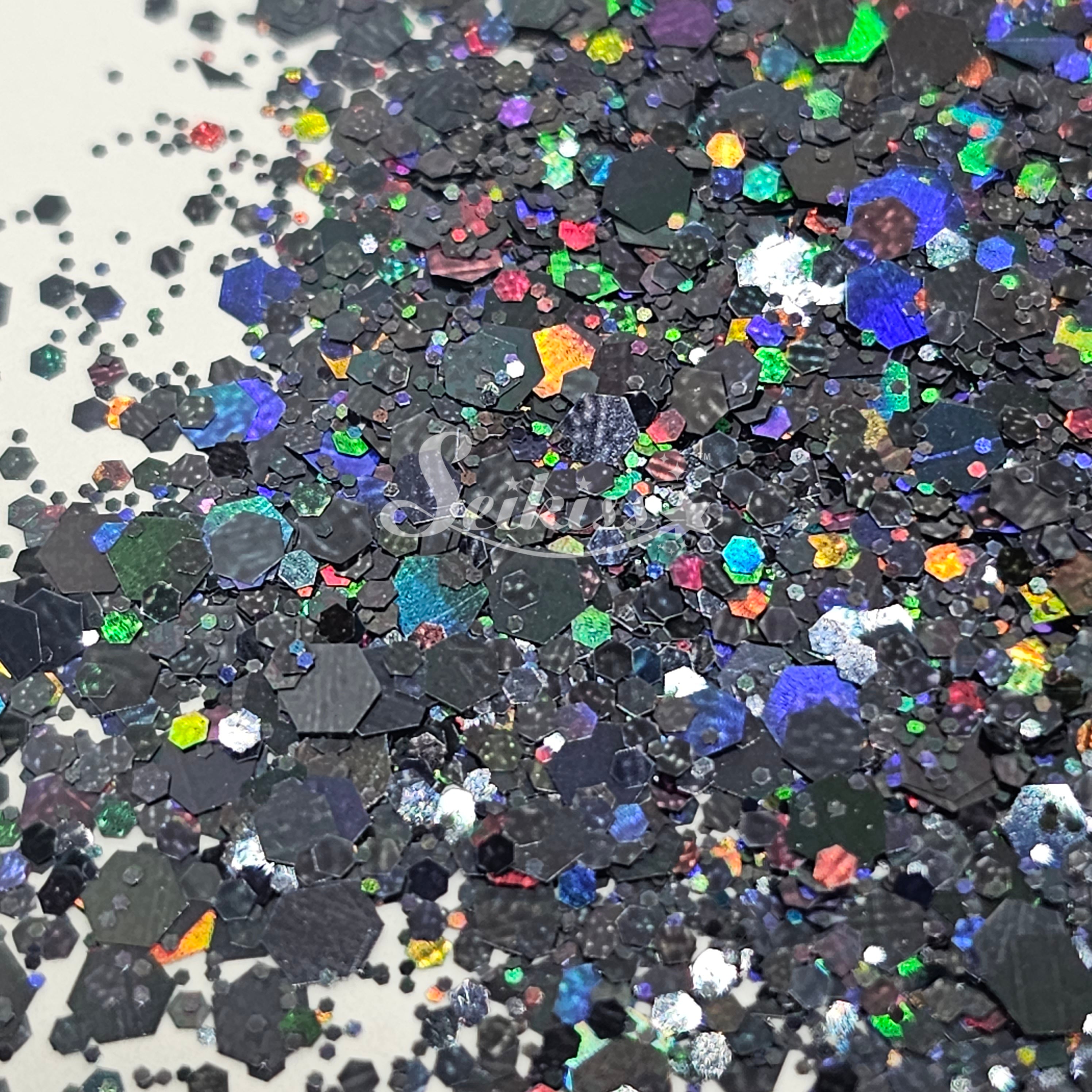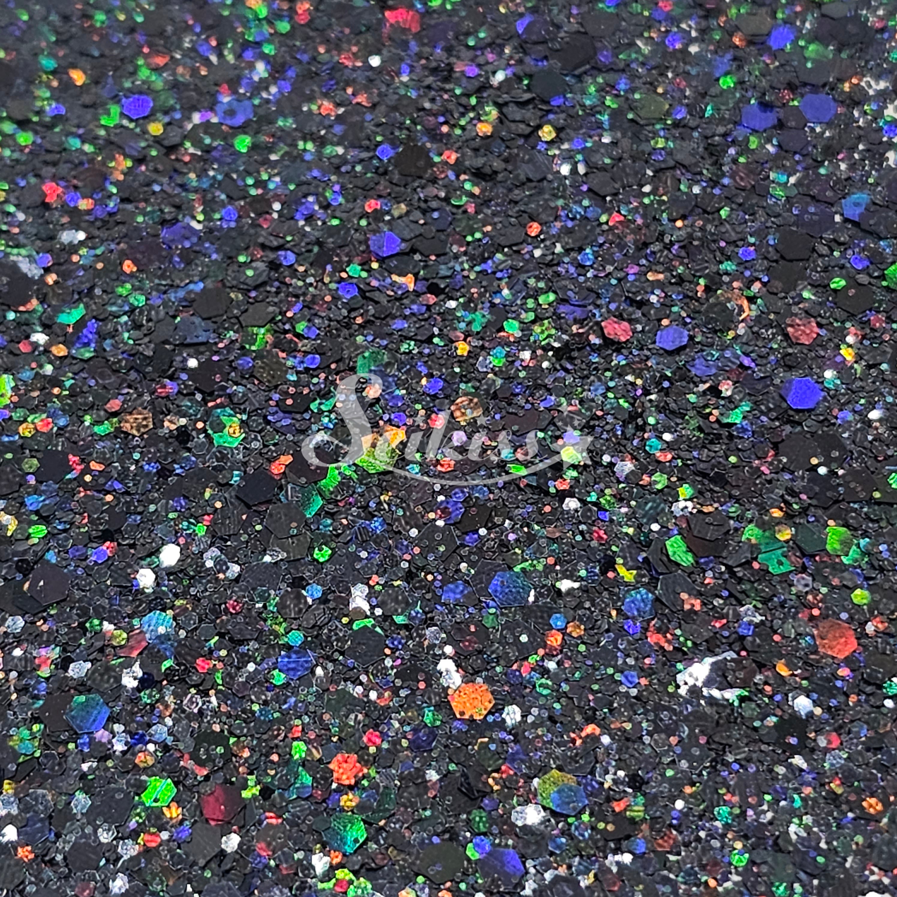 Midnight Galaxy™ is a metallic black glitter with colorful chunky mix. Adding a stunning visual effect to your artwork with its realistic holographic finish.