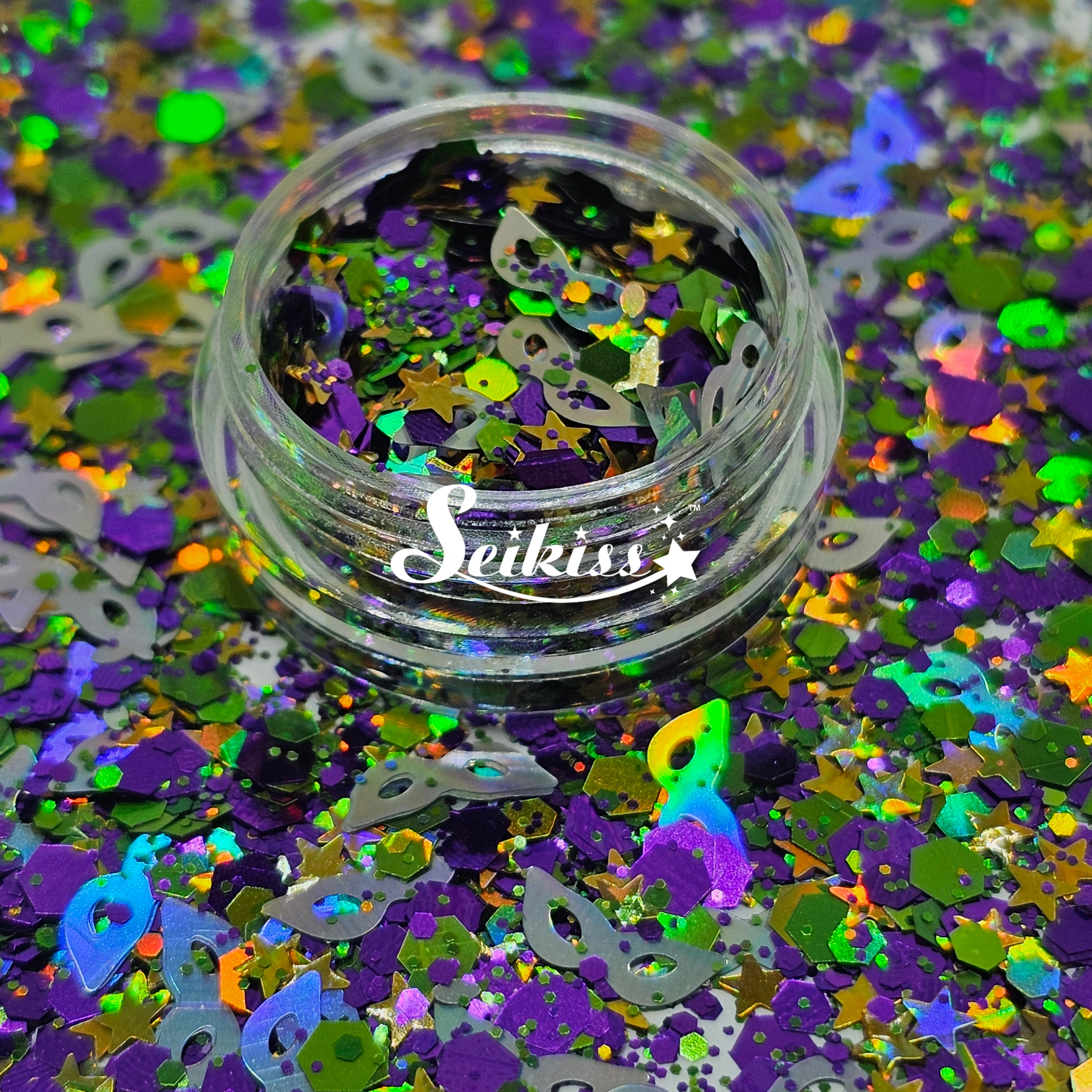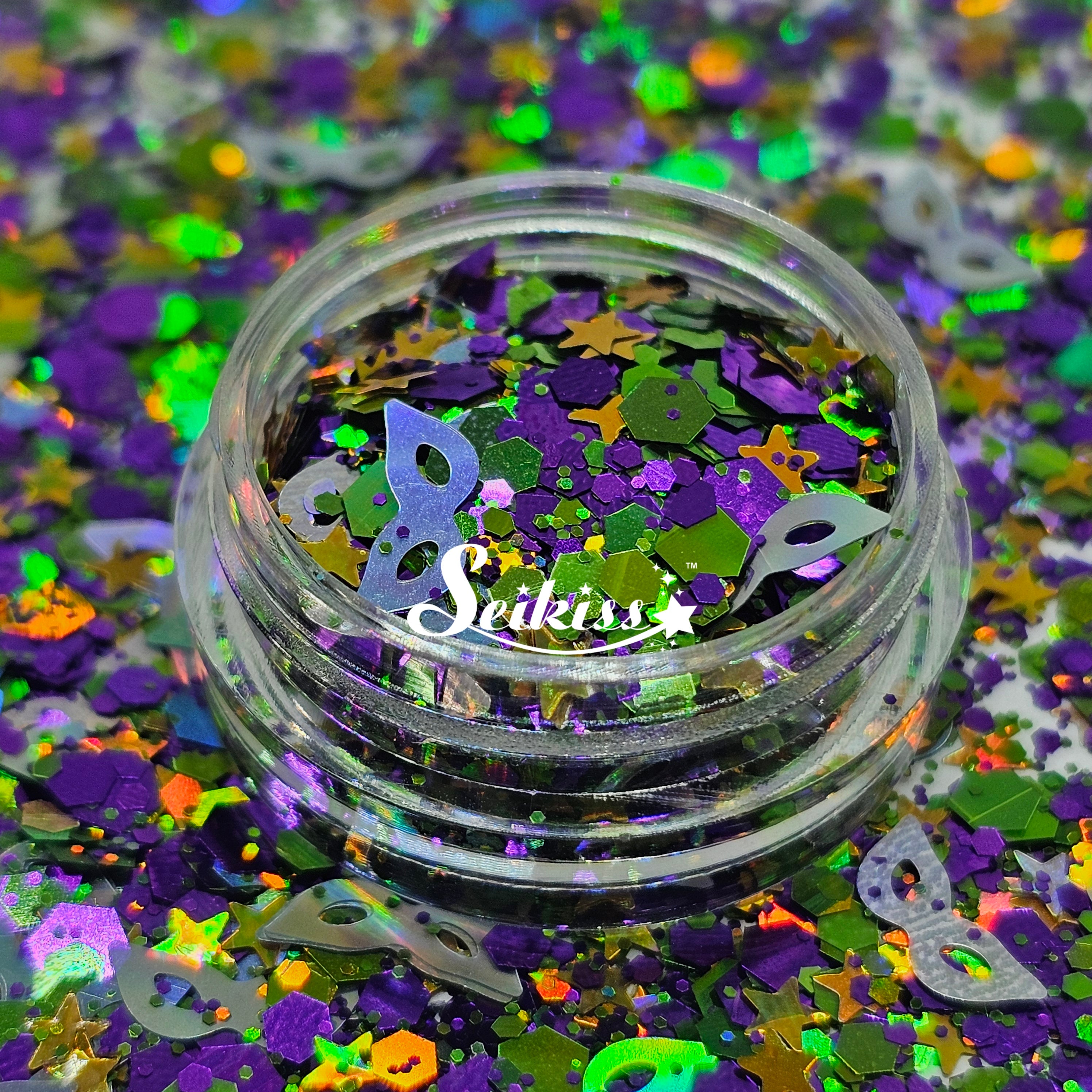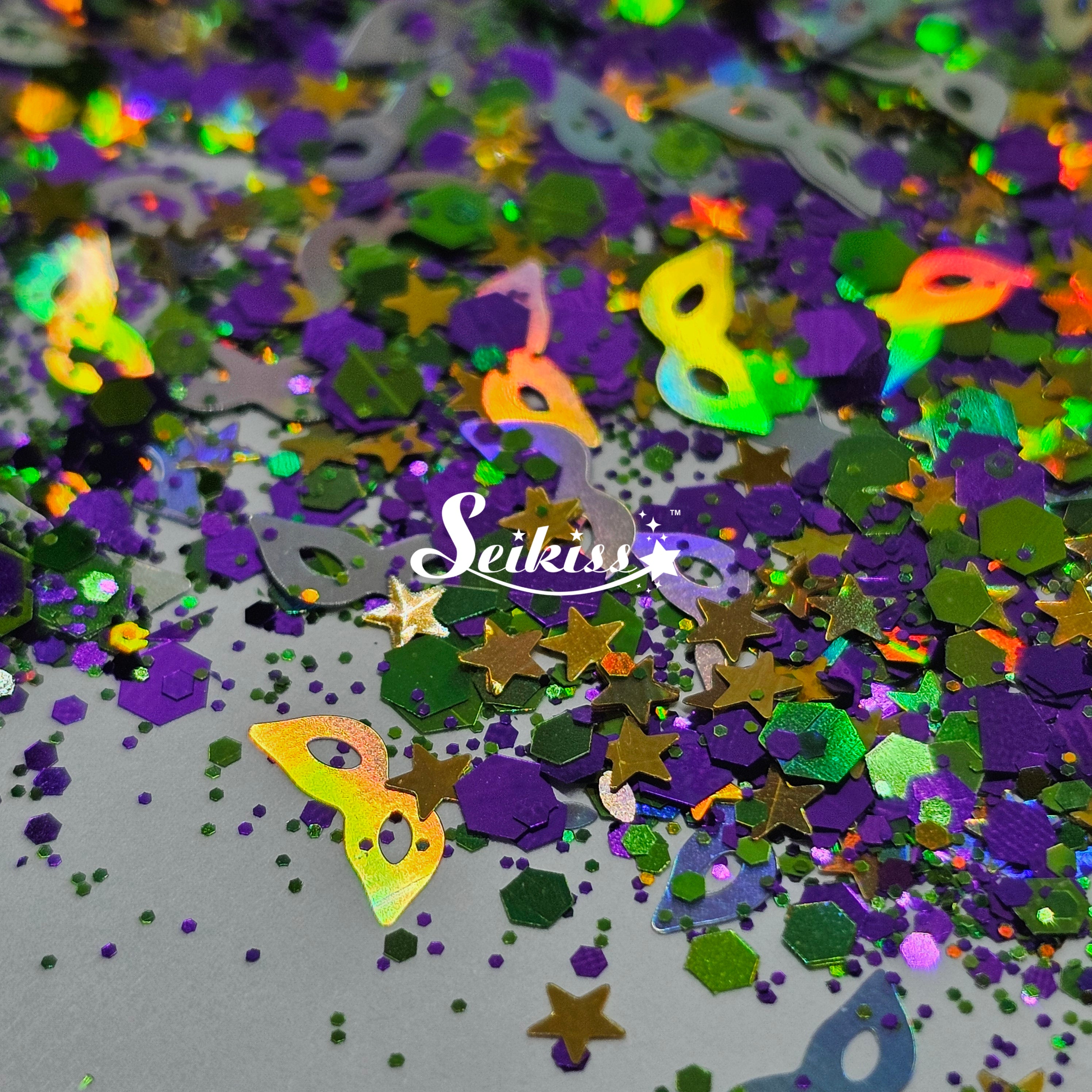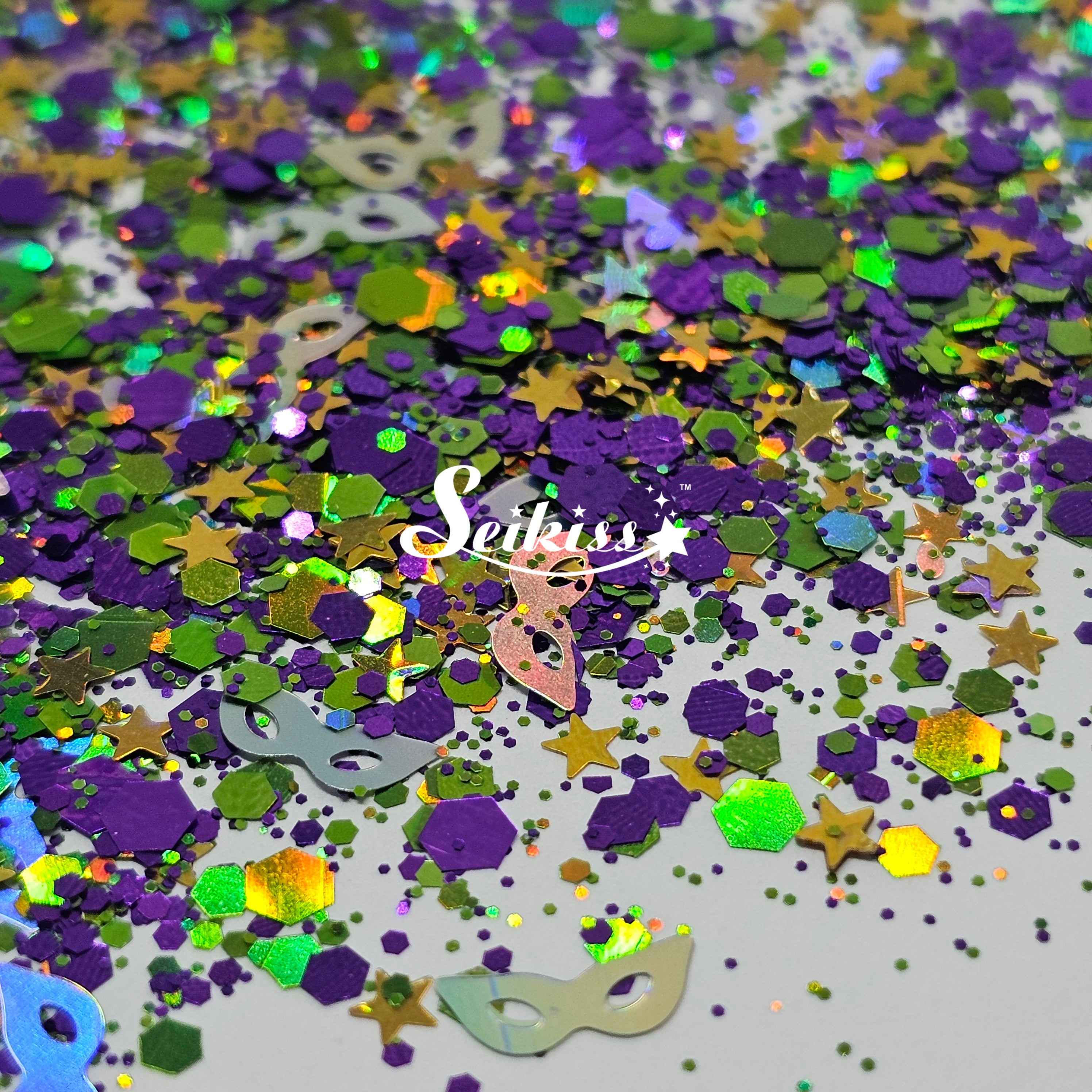 New Orleans glitter is a mix of dark metallic purple, holographic stars and green chunky mix with a unique touch of holographic silver masks.