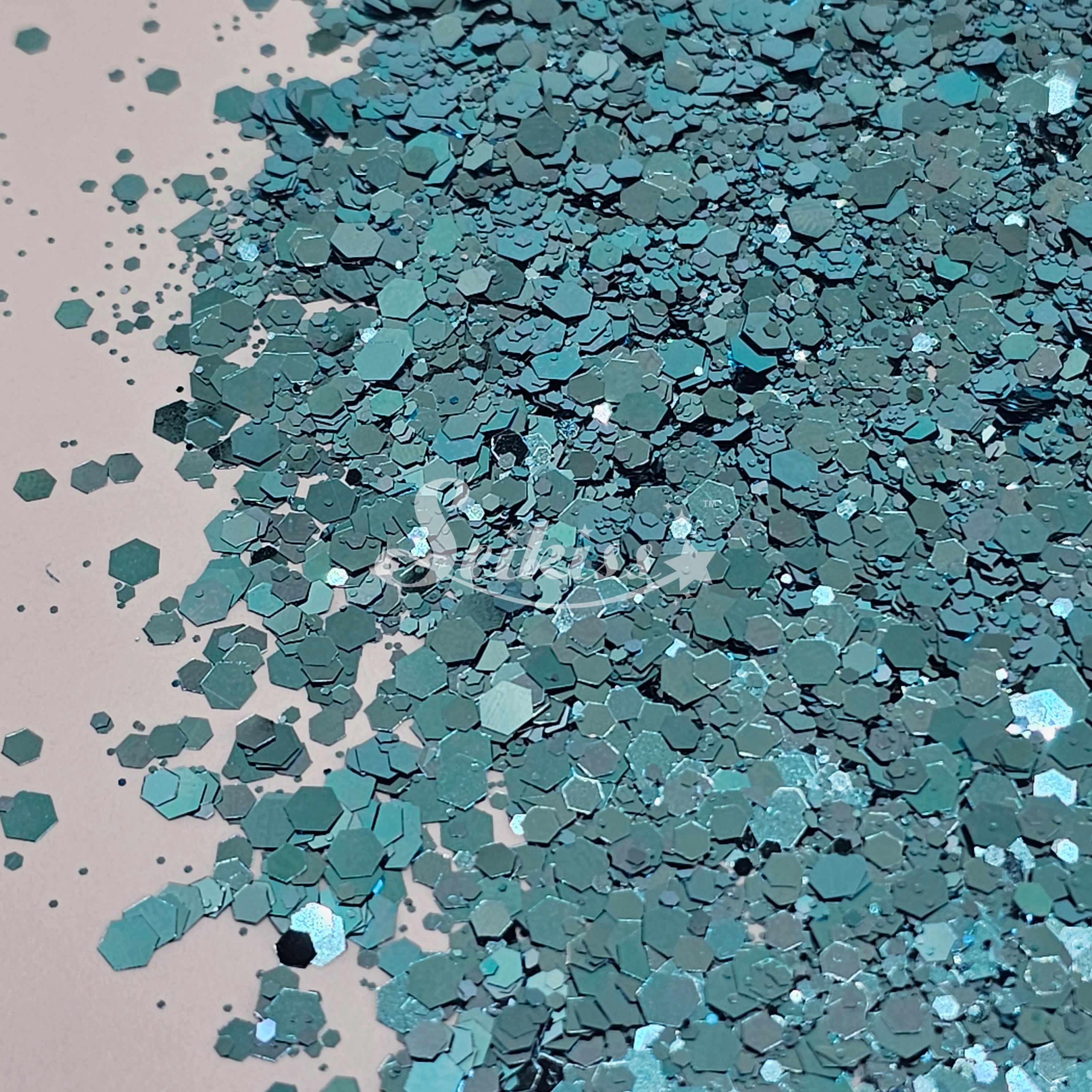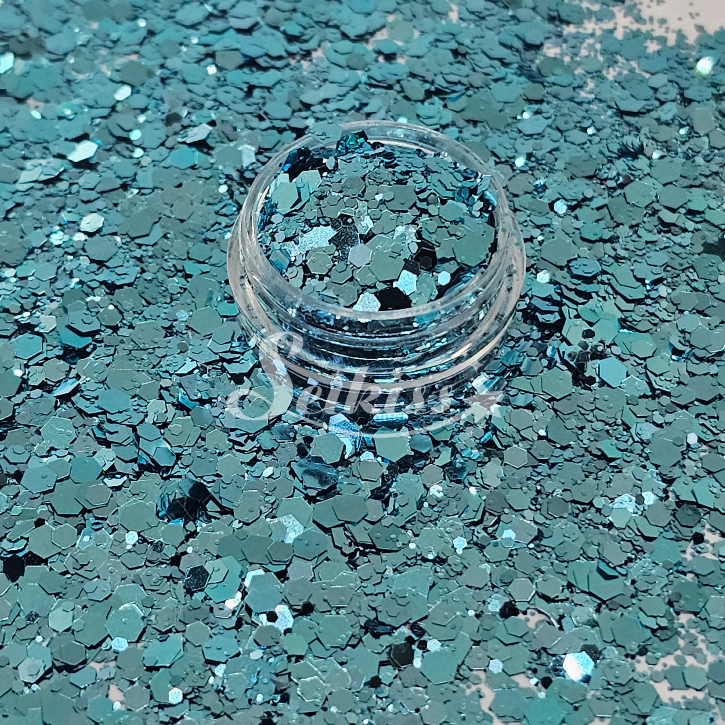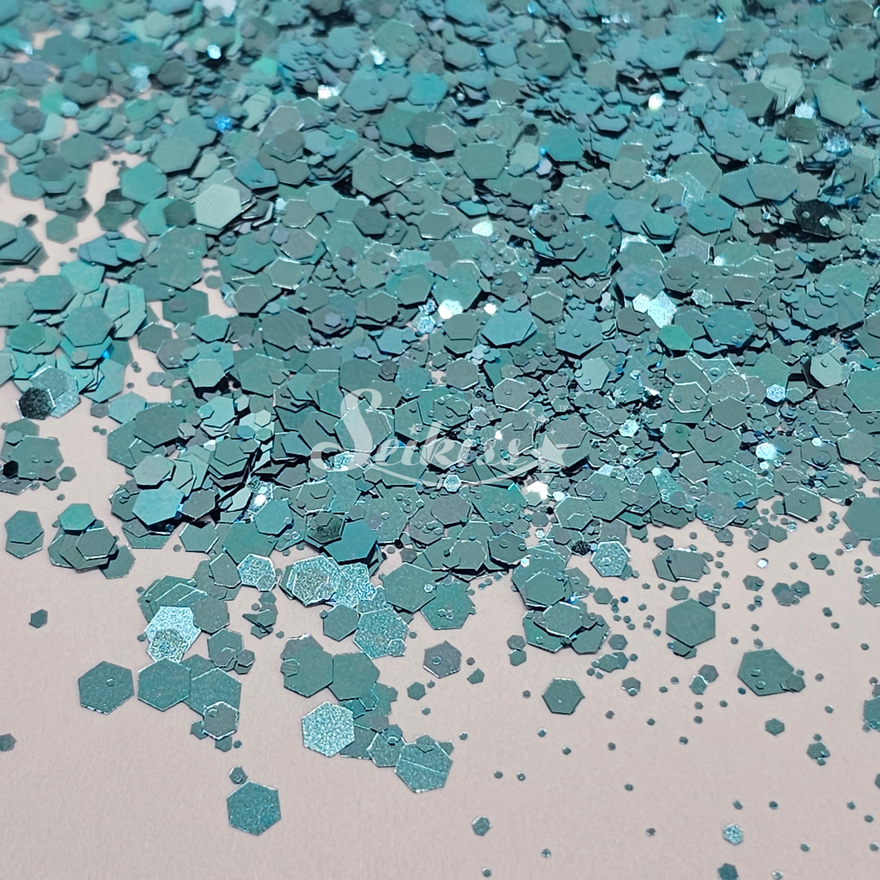 Pacific Blue Chunky Glitter Mix features a metallic aqua blue. Perfect for mixing with other colors and use with resin, nails, tumblers, jewelry, arts, and all types of crafts and projects.