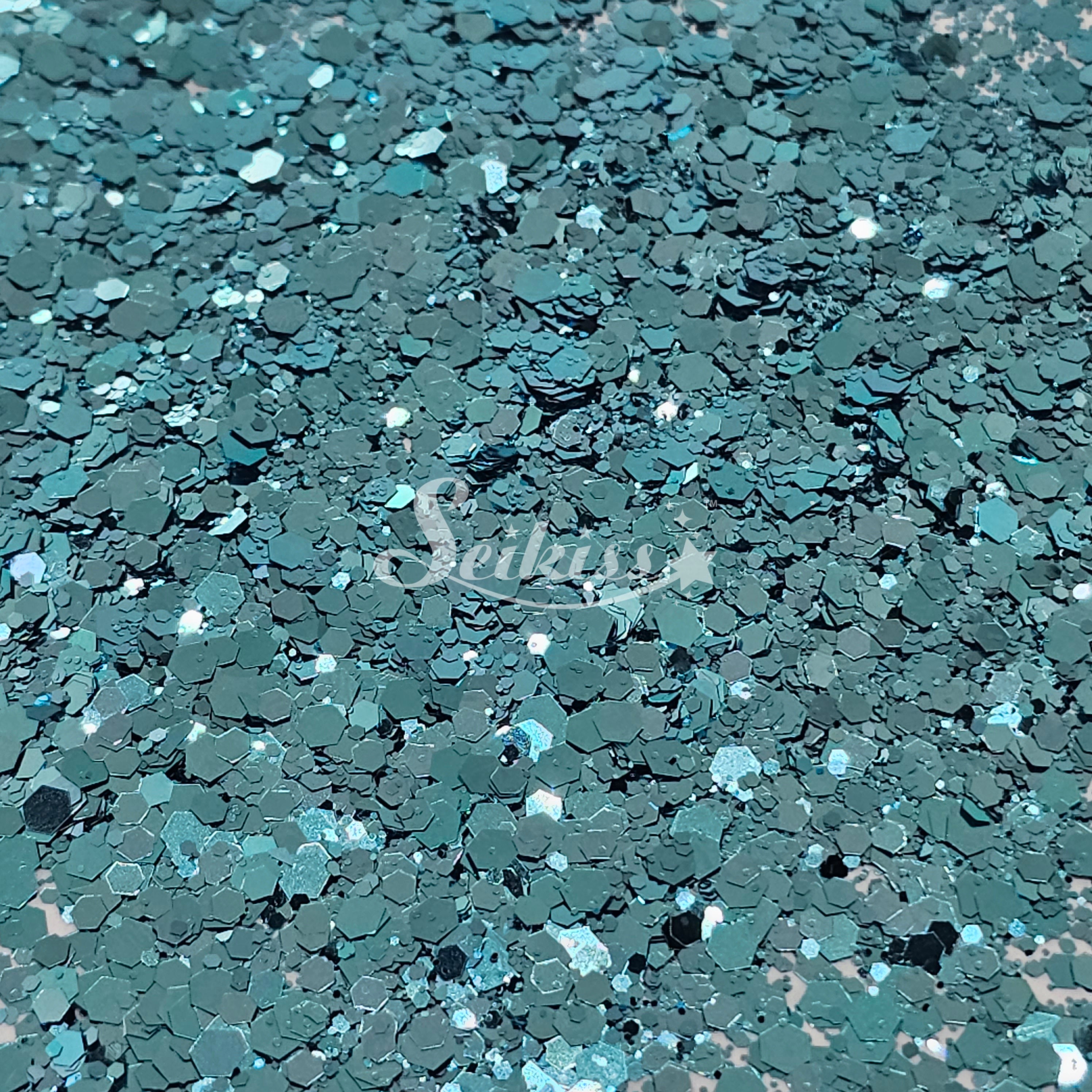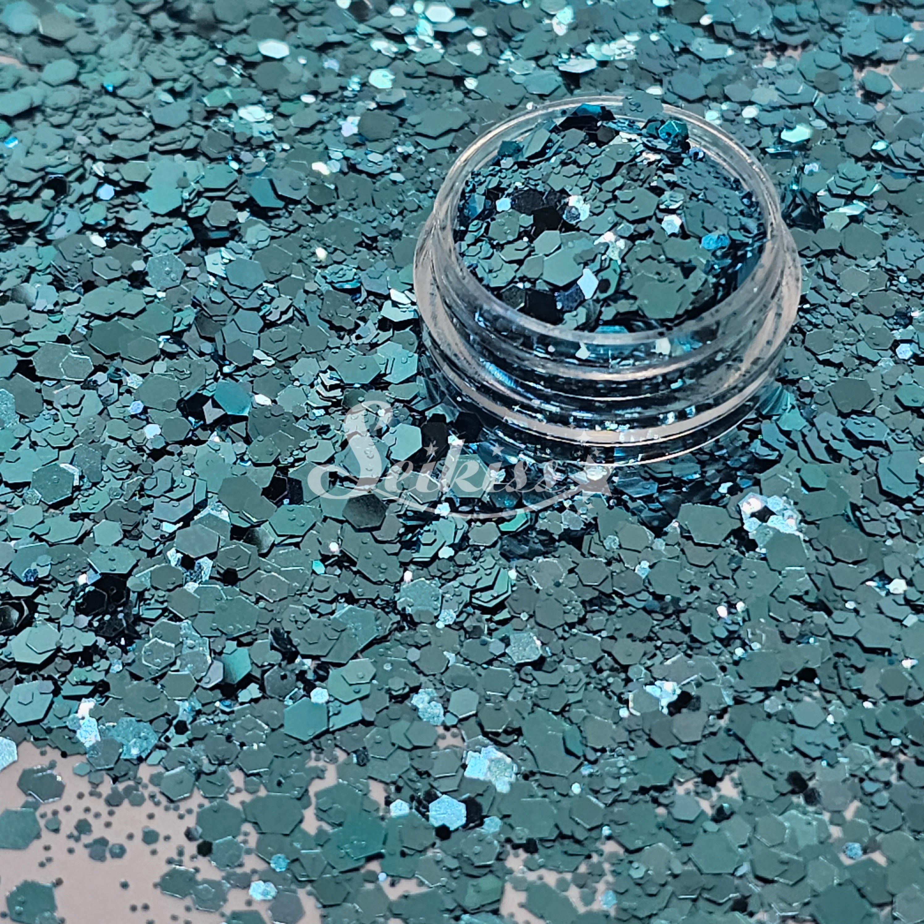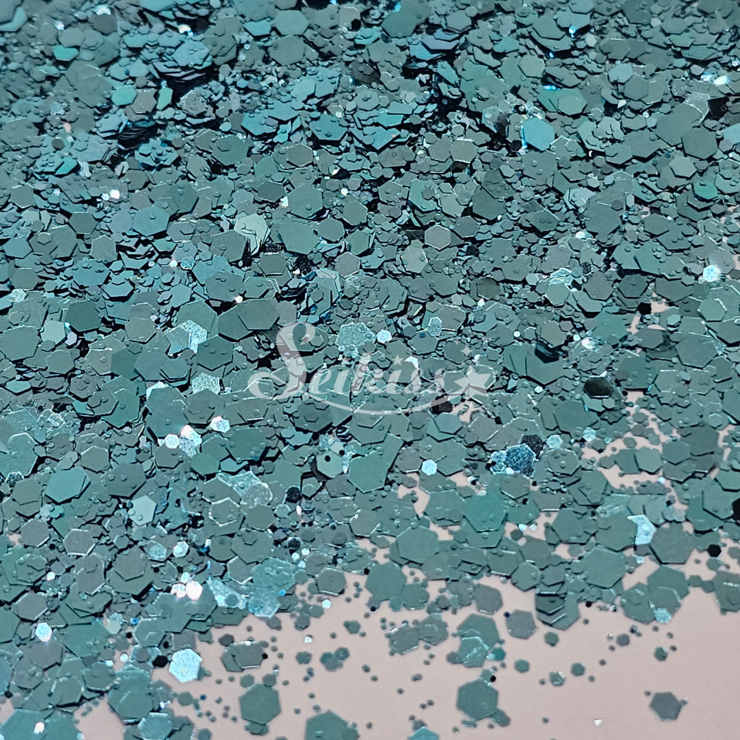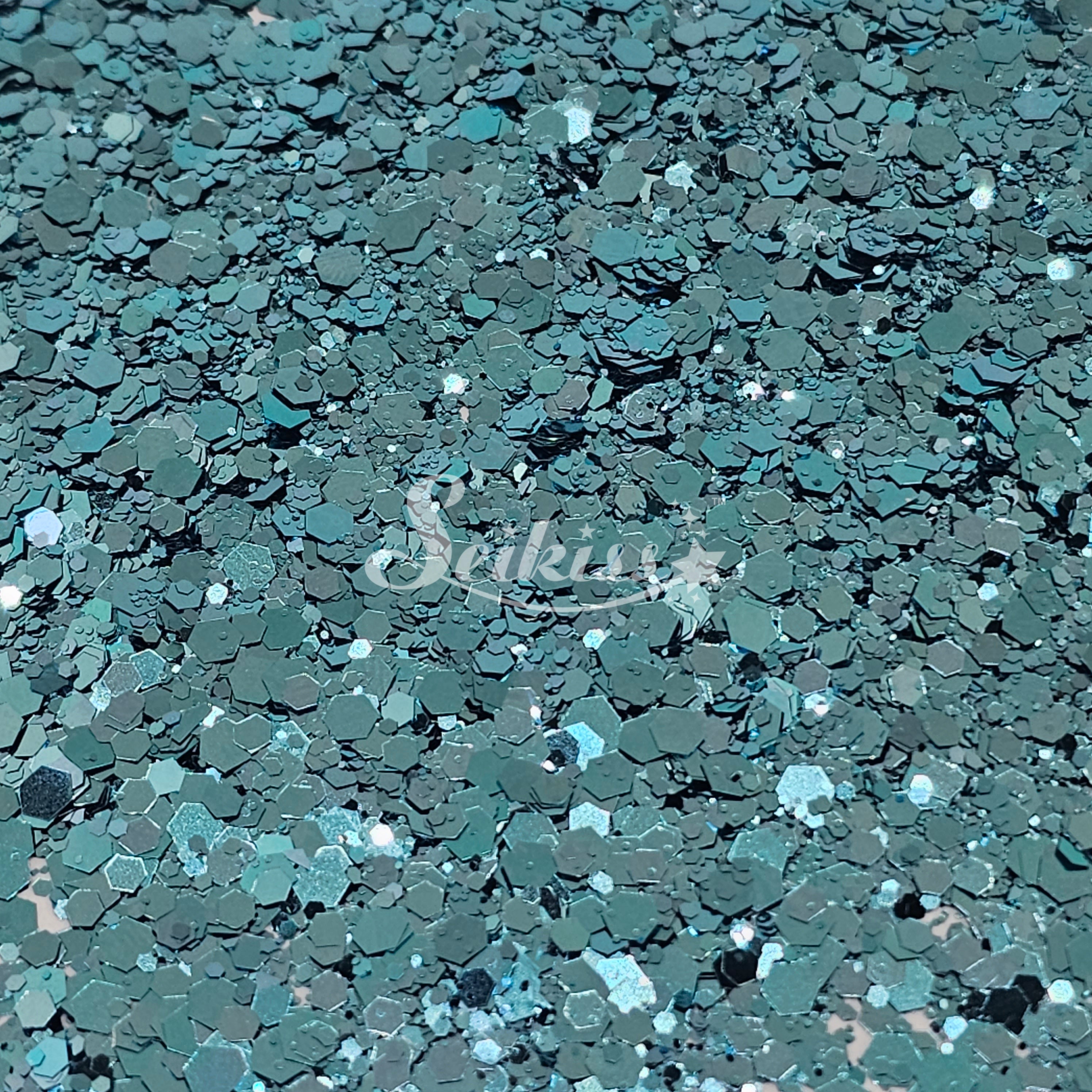 Pacific Blue Chunky Glitter Mix features a metallic aqua blue. Perfect for mixing with other colors and use with resin, nails, tumblers, jewelry, arts, and all types of crafts and projects.