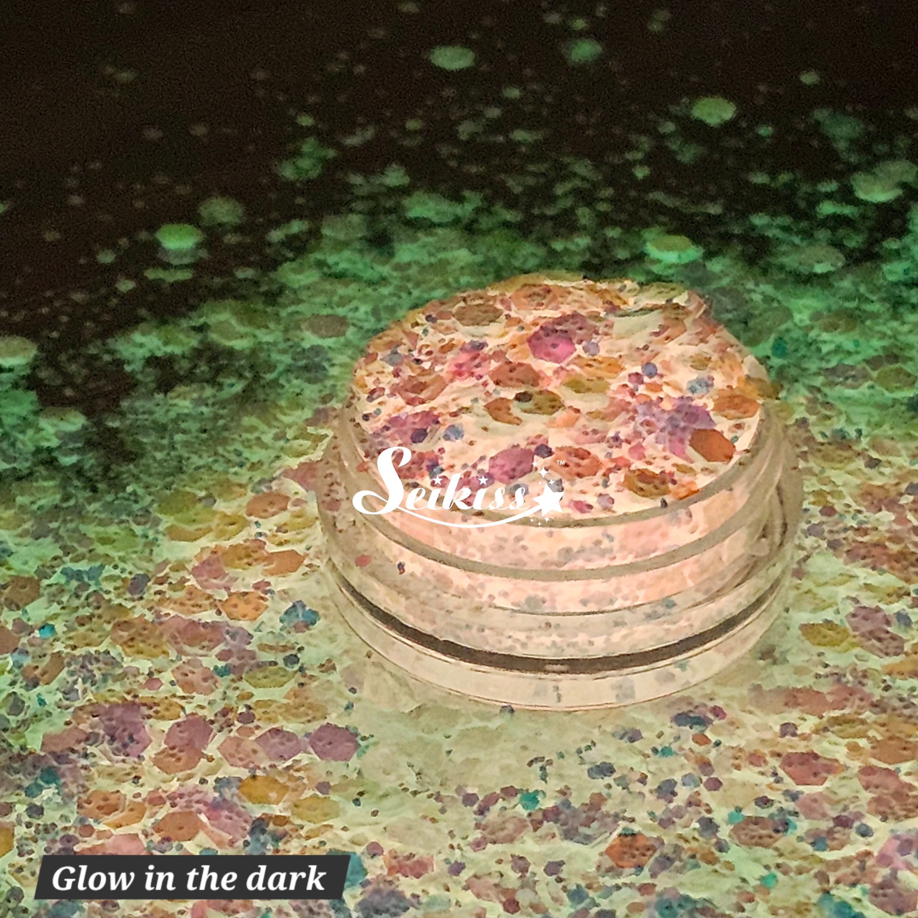 Pink Glow in the dark Chunky Glitter brings a dazzling pop of color to any creation with its shimmering iridescent finish. Under UV light, it glows brilliantly for an eye-catching effect, while in normal light it appears as a soft pastel pink color. Also, this lovely custom mix has a soft glow in the dark effect that you can see when turning lights off Perfect for adding a glamorous touch to nails, resin art, tumblers, jewelry, and all your favorite craft projects.