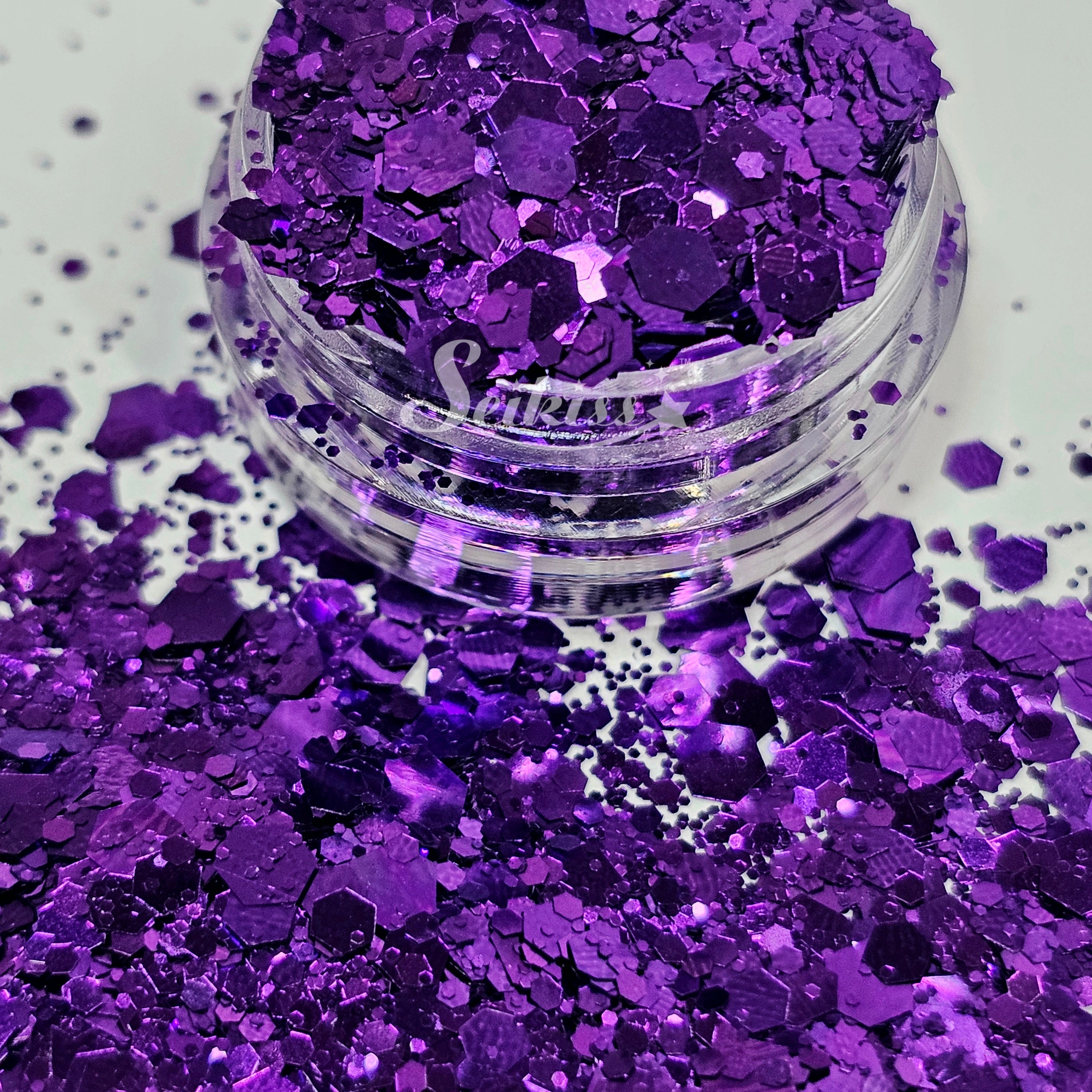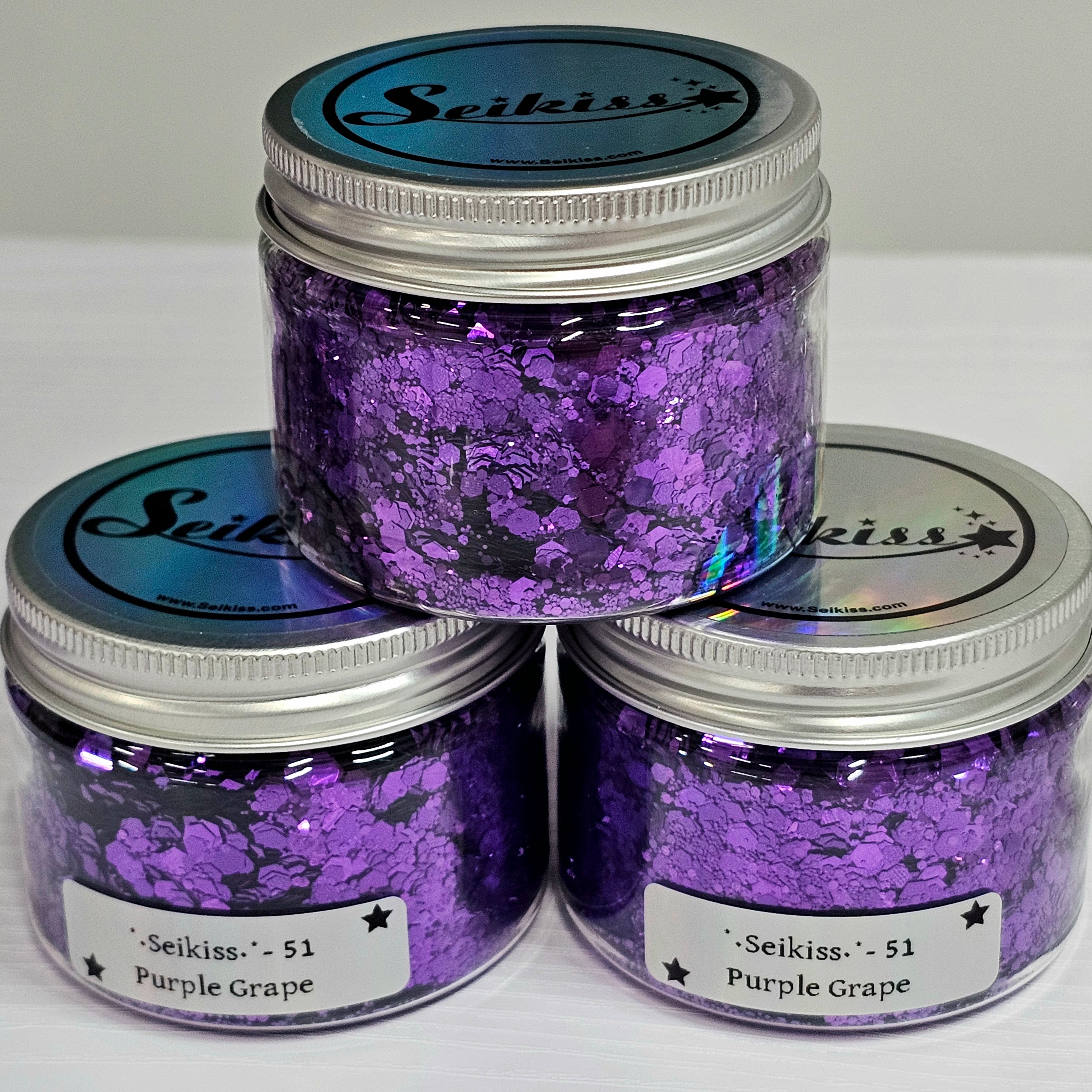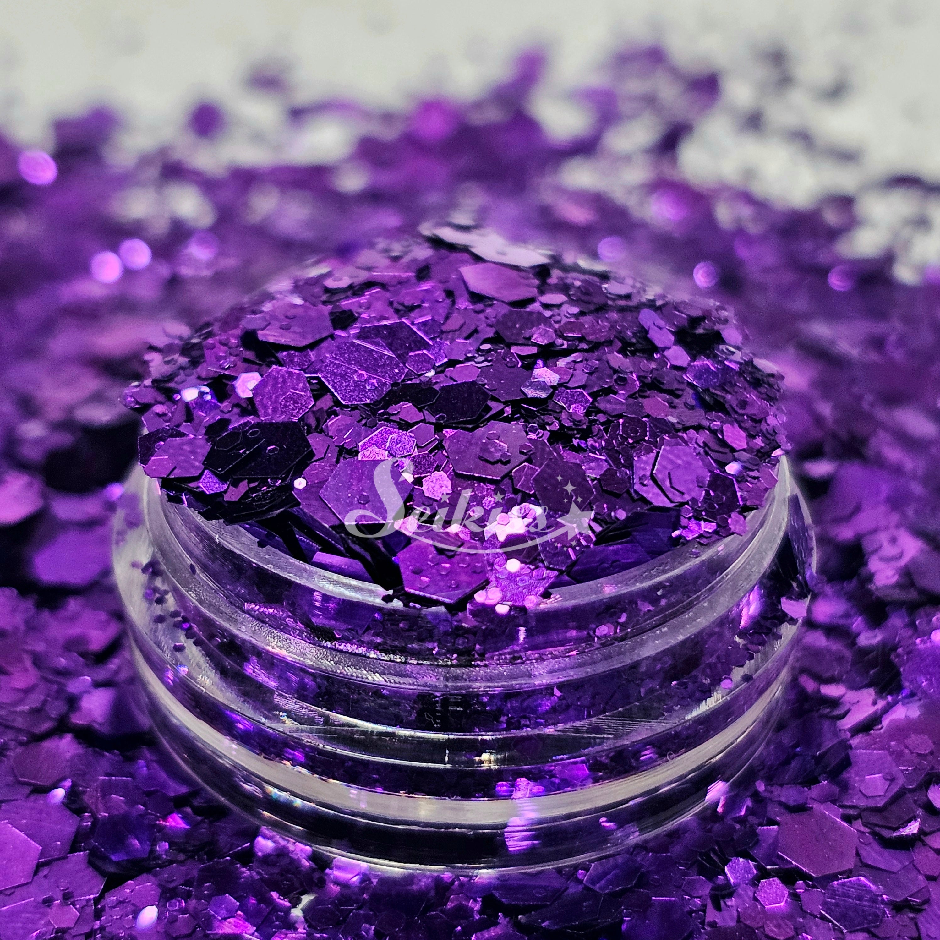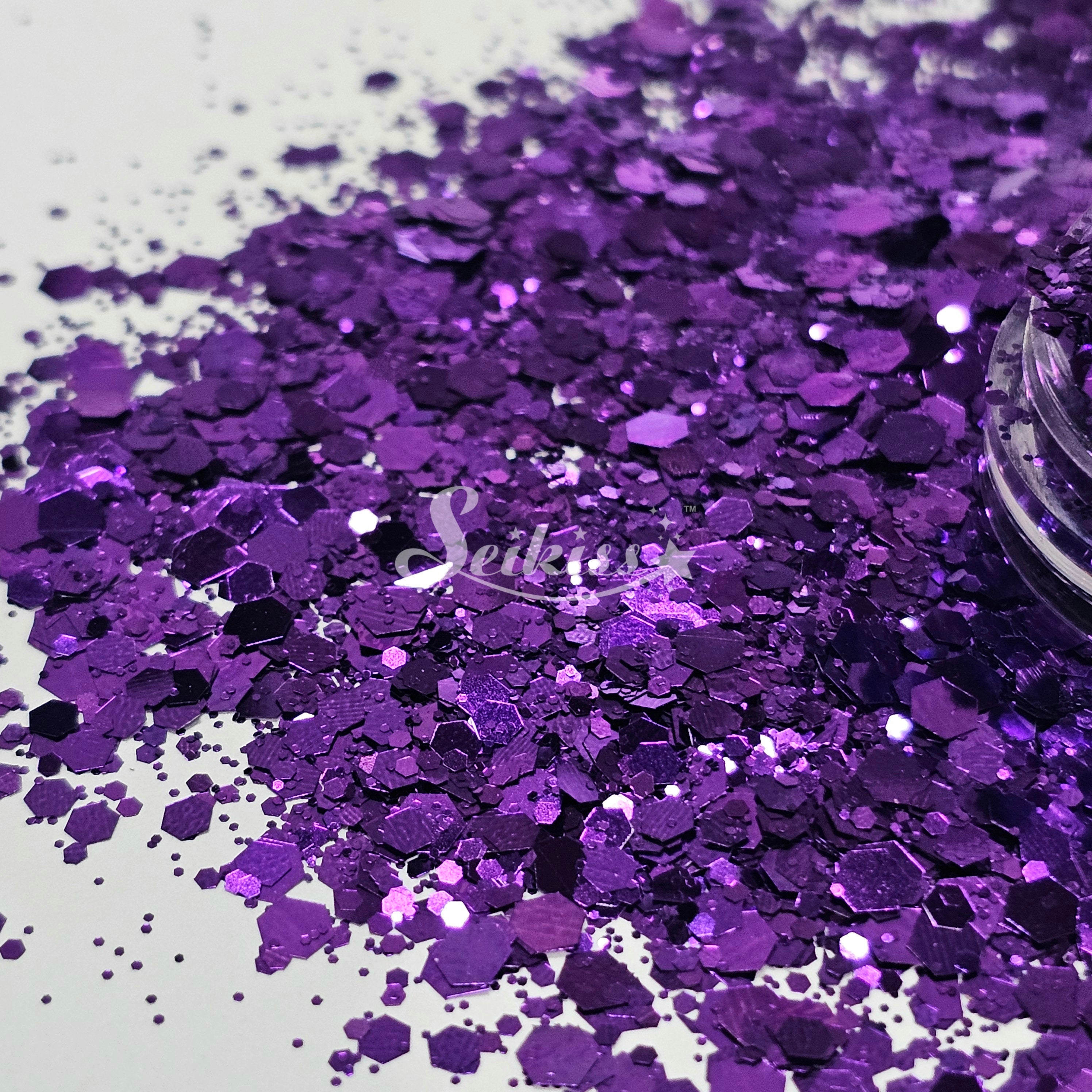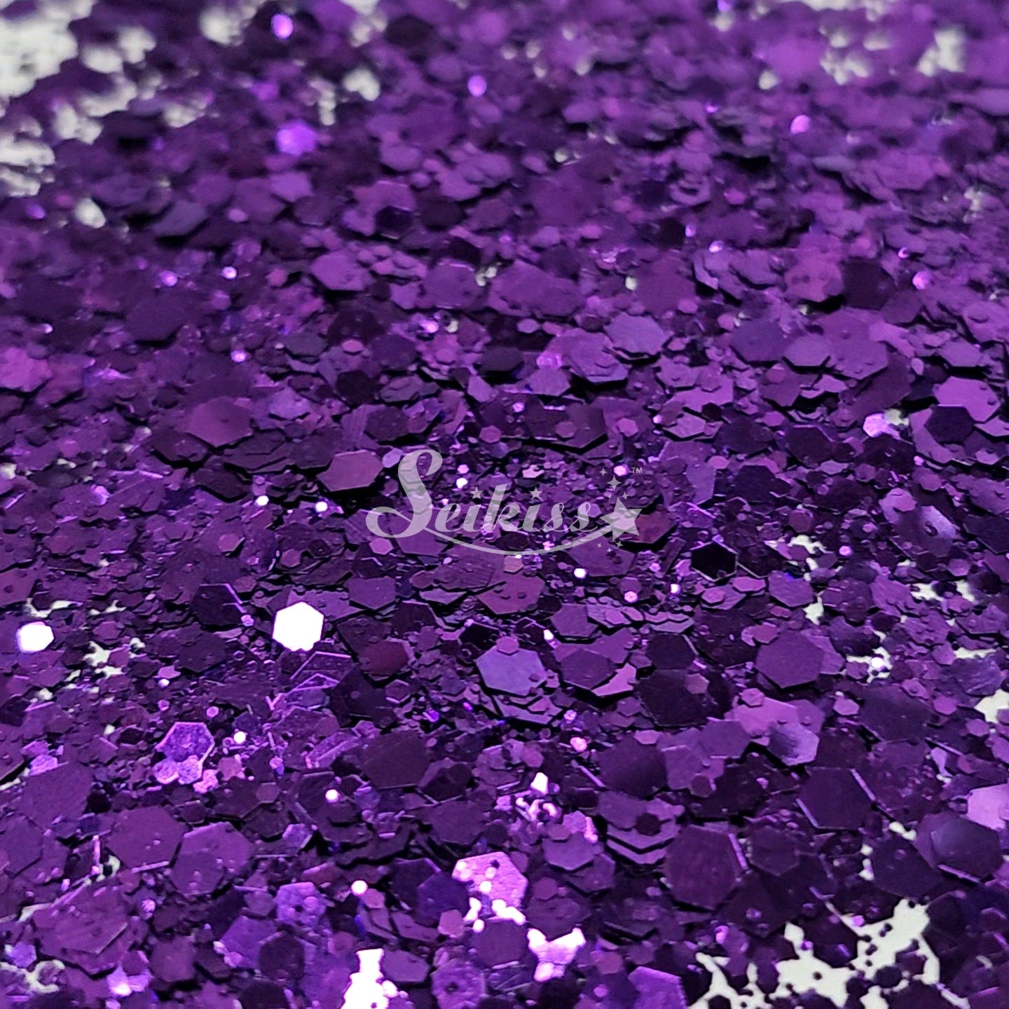 Purple Grape Metallic Chunky Mix Glitter features a dark purple with sparkly metallic finish. Perfect for mixing with other colors and use with resin, nails, tumblers, jewelry, arts, and all types of crafts and projects.
