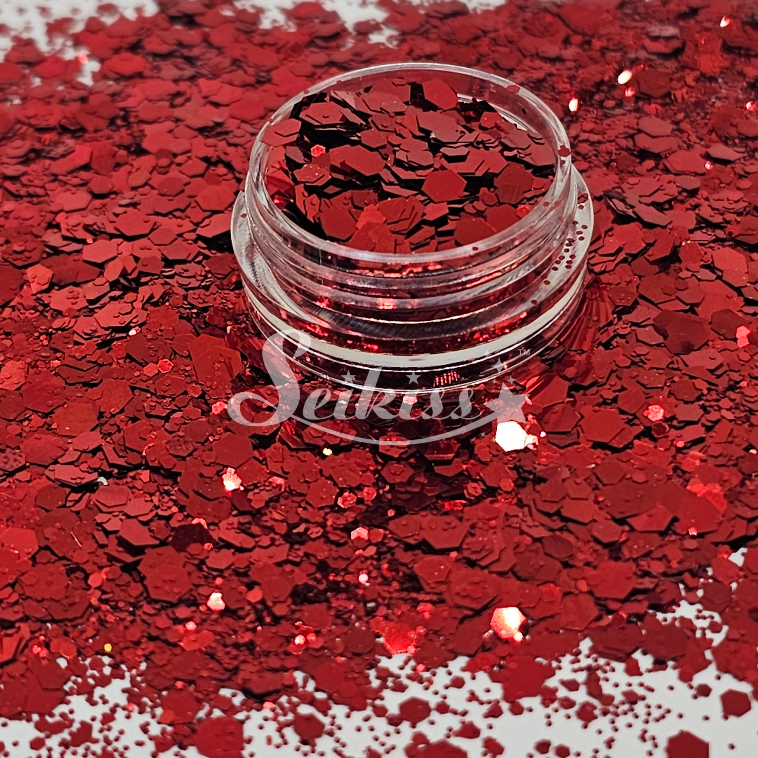 Red Dress Chunky Mix Glitter features a metallic deep red show ready for any project. Perfect for mixing with other colors and use with resin, nails, tumblers, jewelry, arts, and all types of crafts.