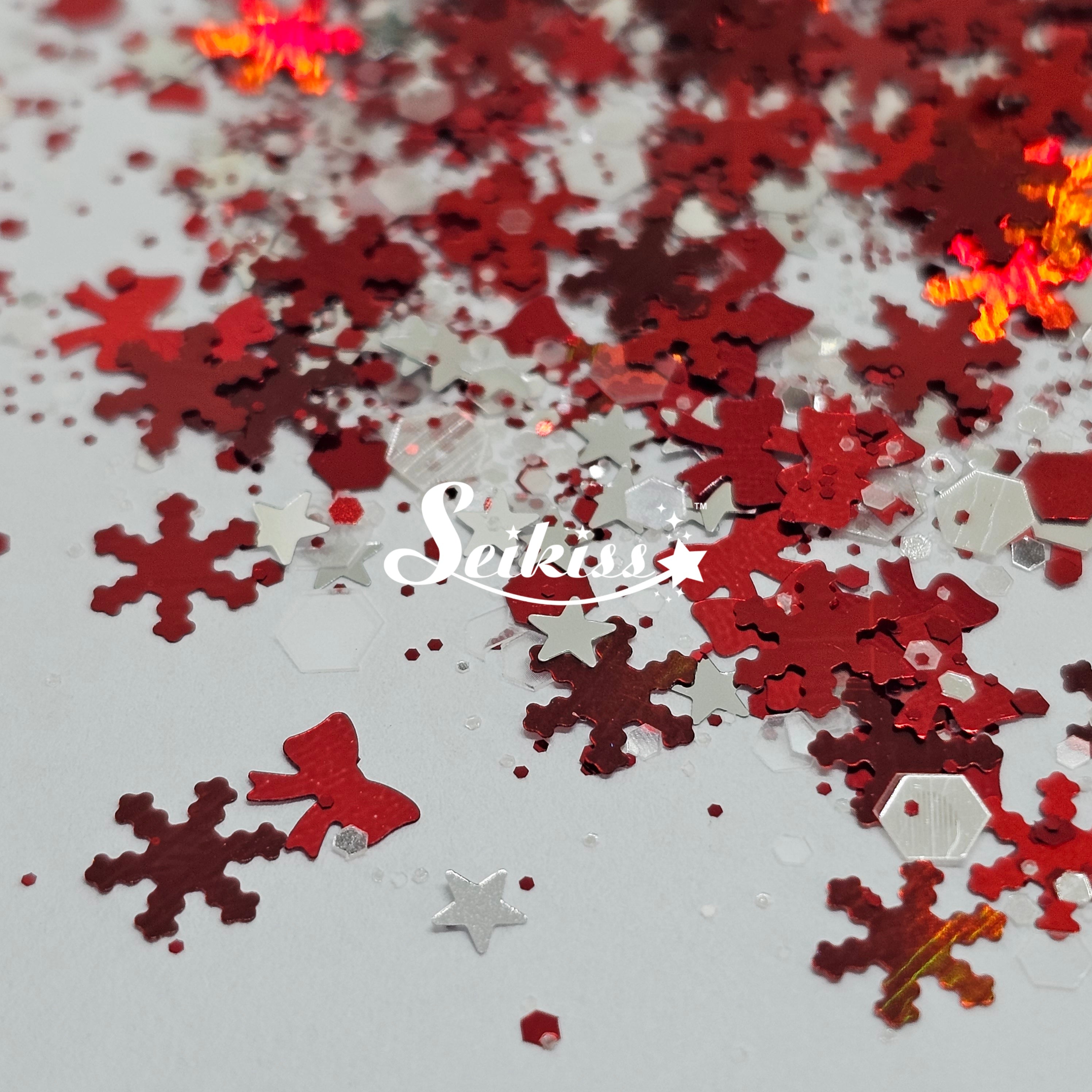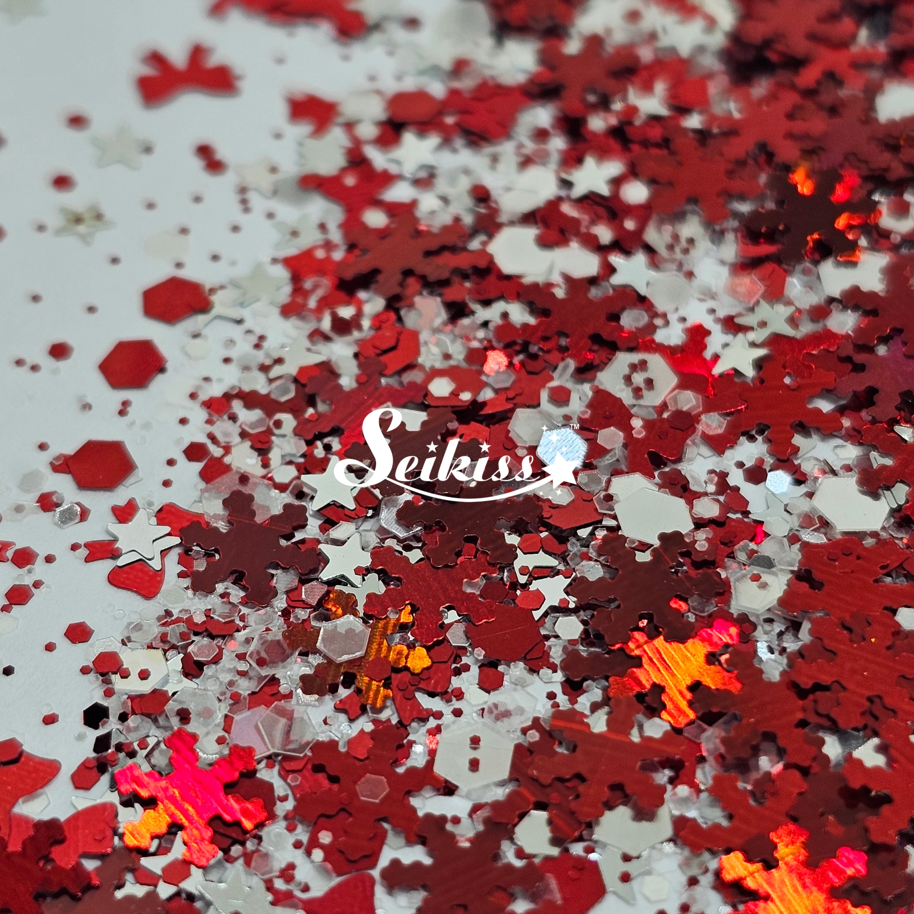 Red Holiday is a frost white, red and silver chunky mix with red holographic snowflakes, red bows, and silver stars adding a stunning visual effect to your artwork. This makes your projects shine and is perfect for resin, nails, tumblers, jewelry, arts, and all types of crafts and projects.