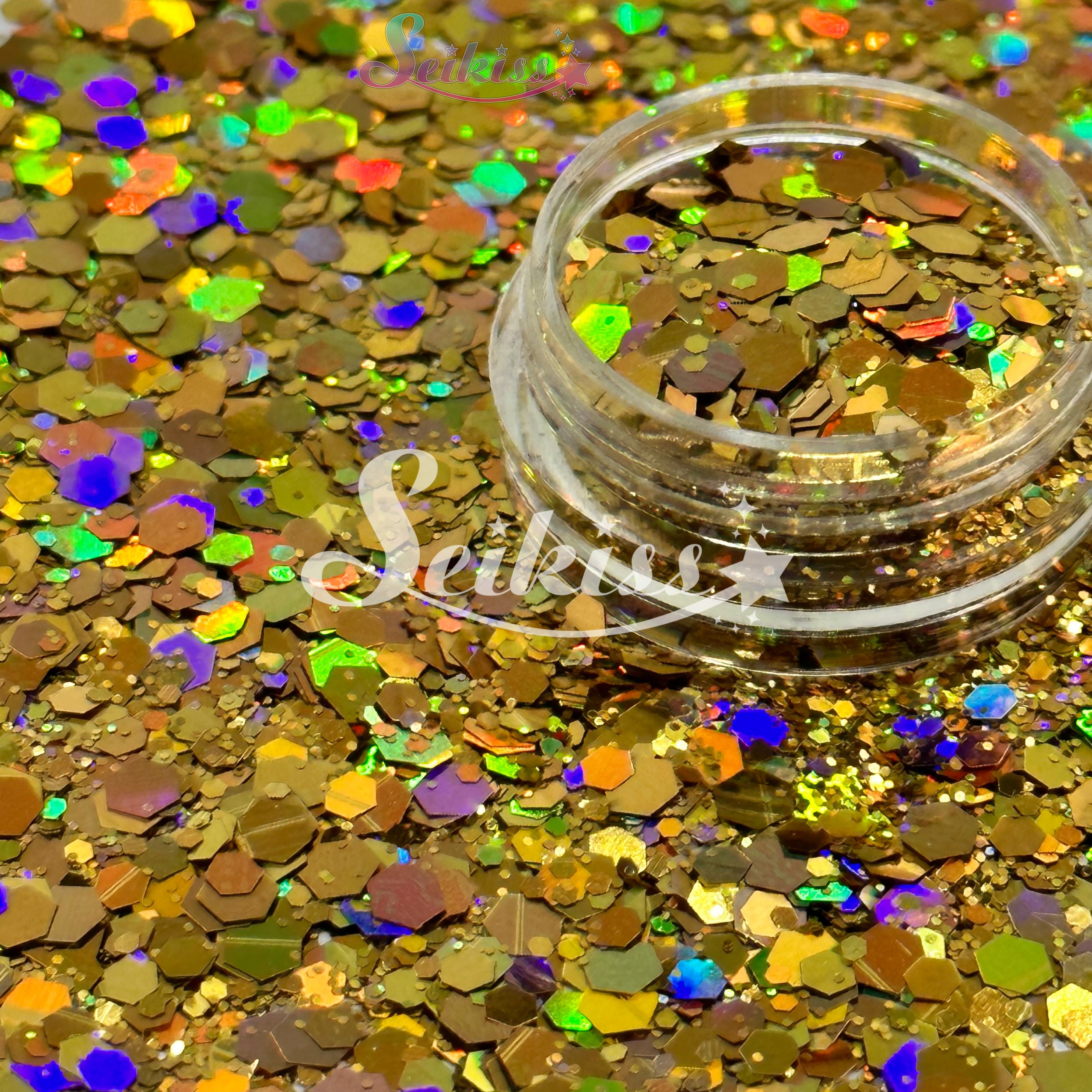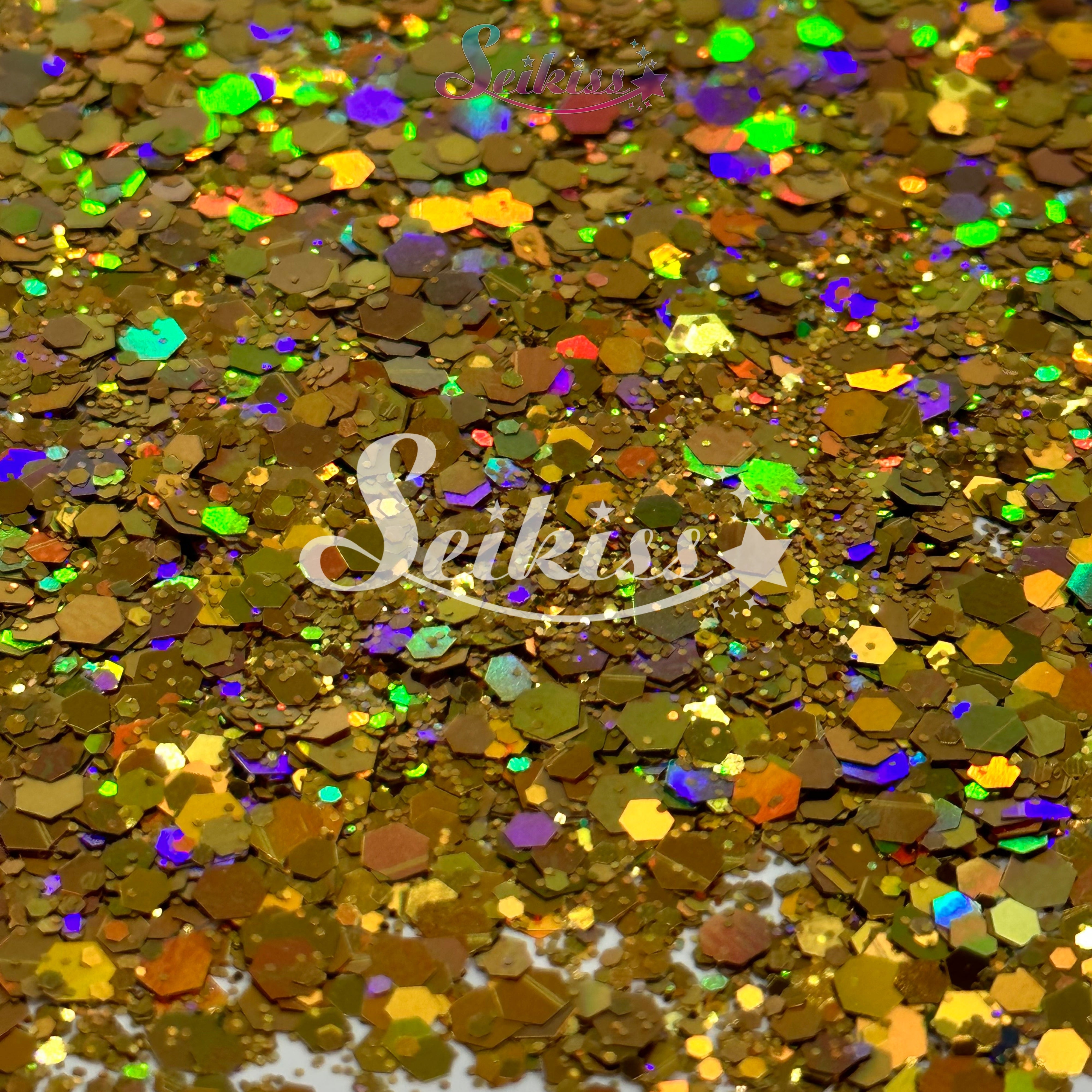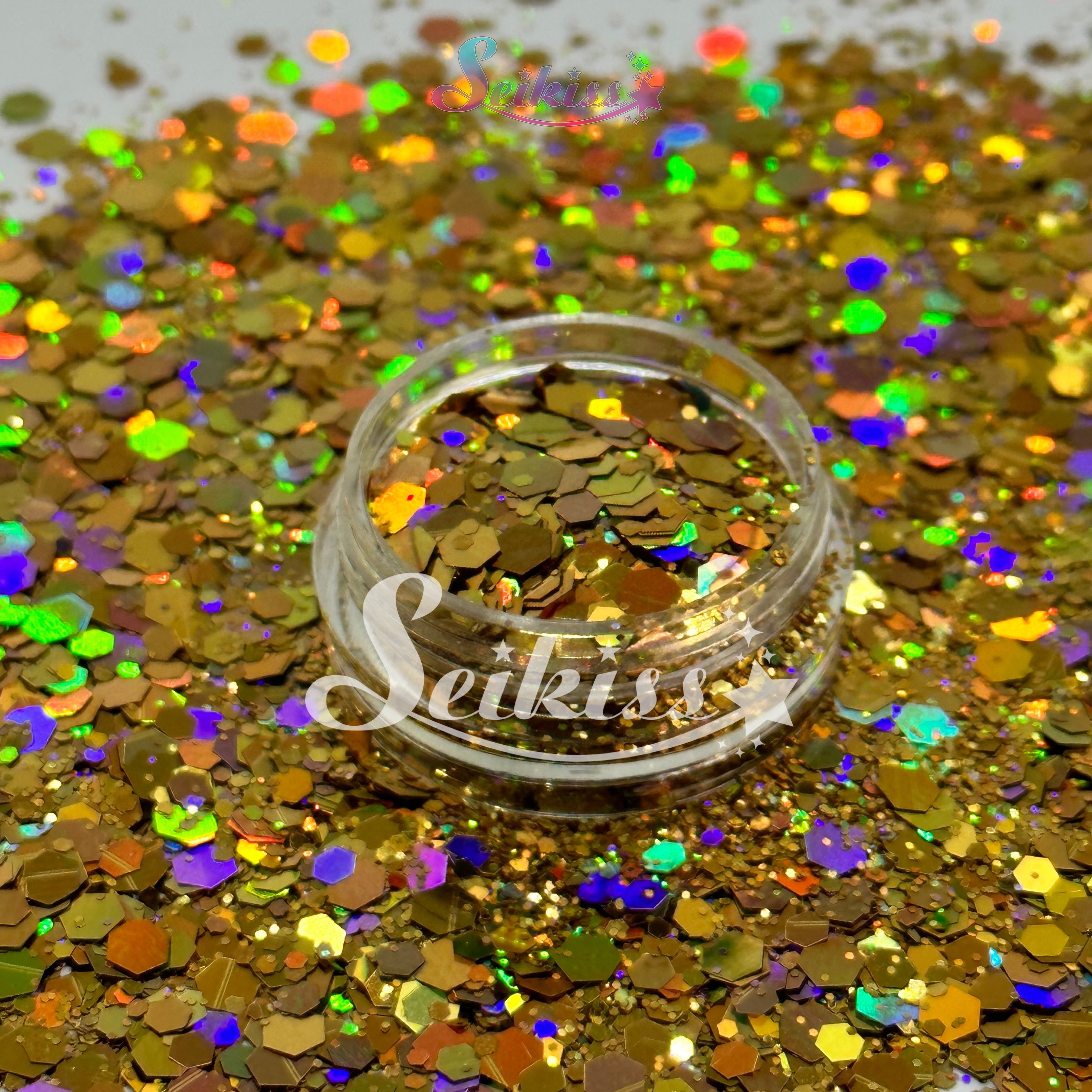 Golden Mirage has a colorful chunky gold mix adding a stunning visual effect to your artwork with its realistic holographic finish. This makes your projects shine and is perfect for resin, nails, tumblers, jewelry, arts, and all types of crafts and projects.
