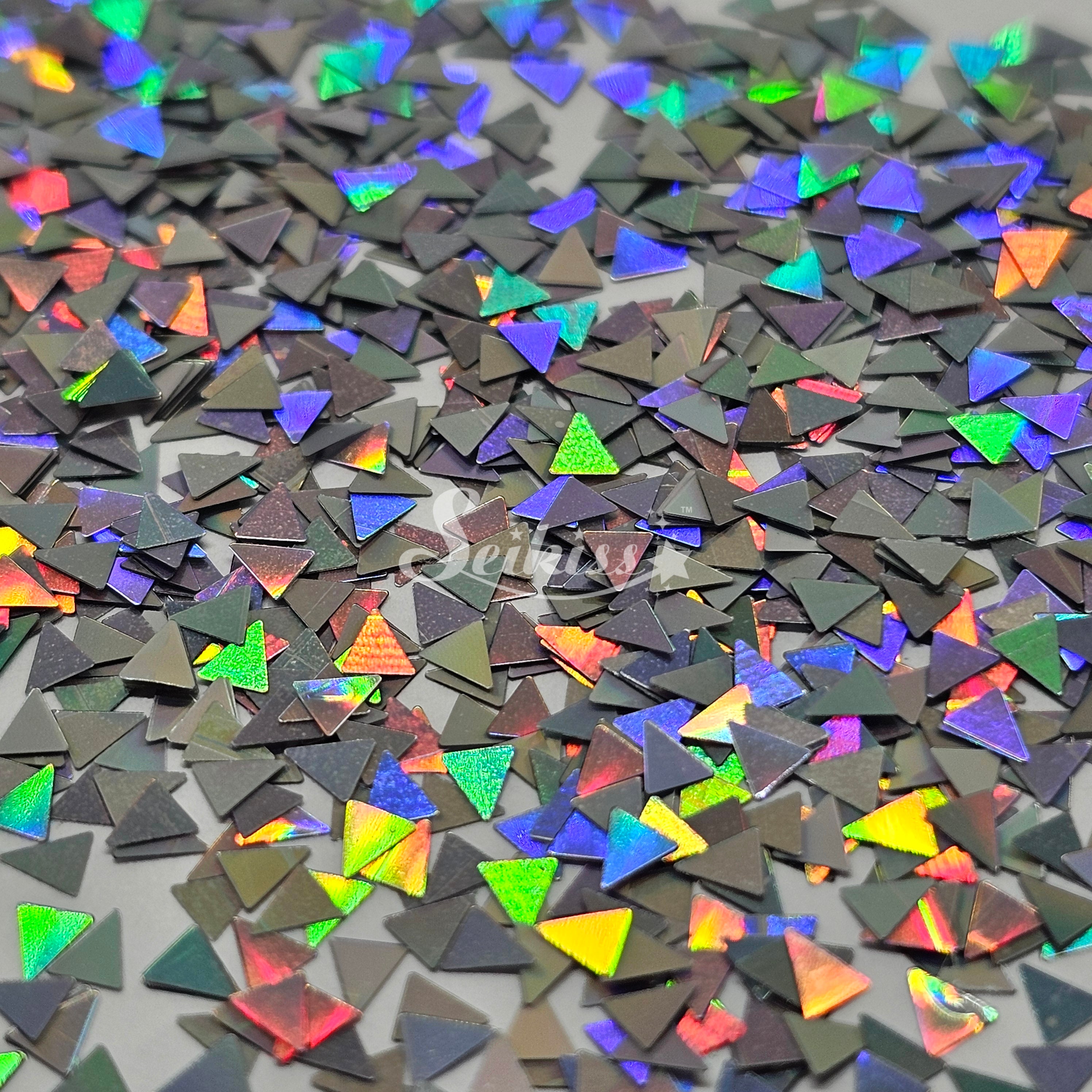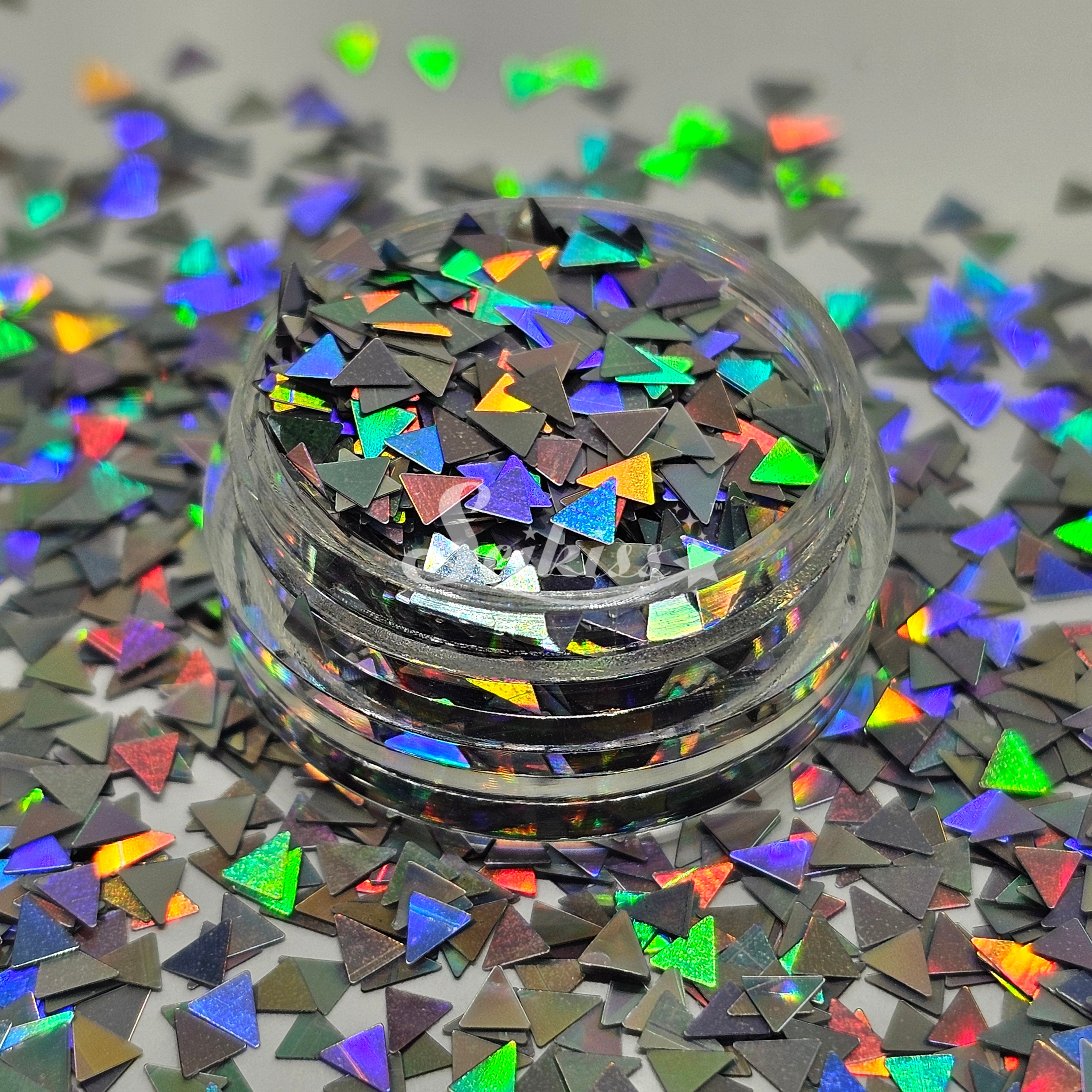 Silver Triangles glitter has a metallic color with holographic finish. Perfect for mixing with other colors and use with resin, nails, tumblers, jewelry, arts, and all types of crafts and projects.