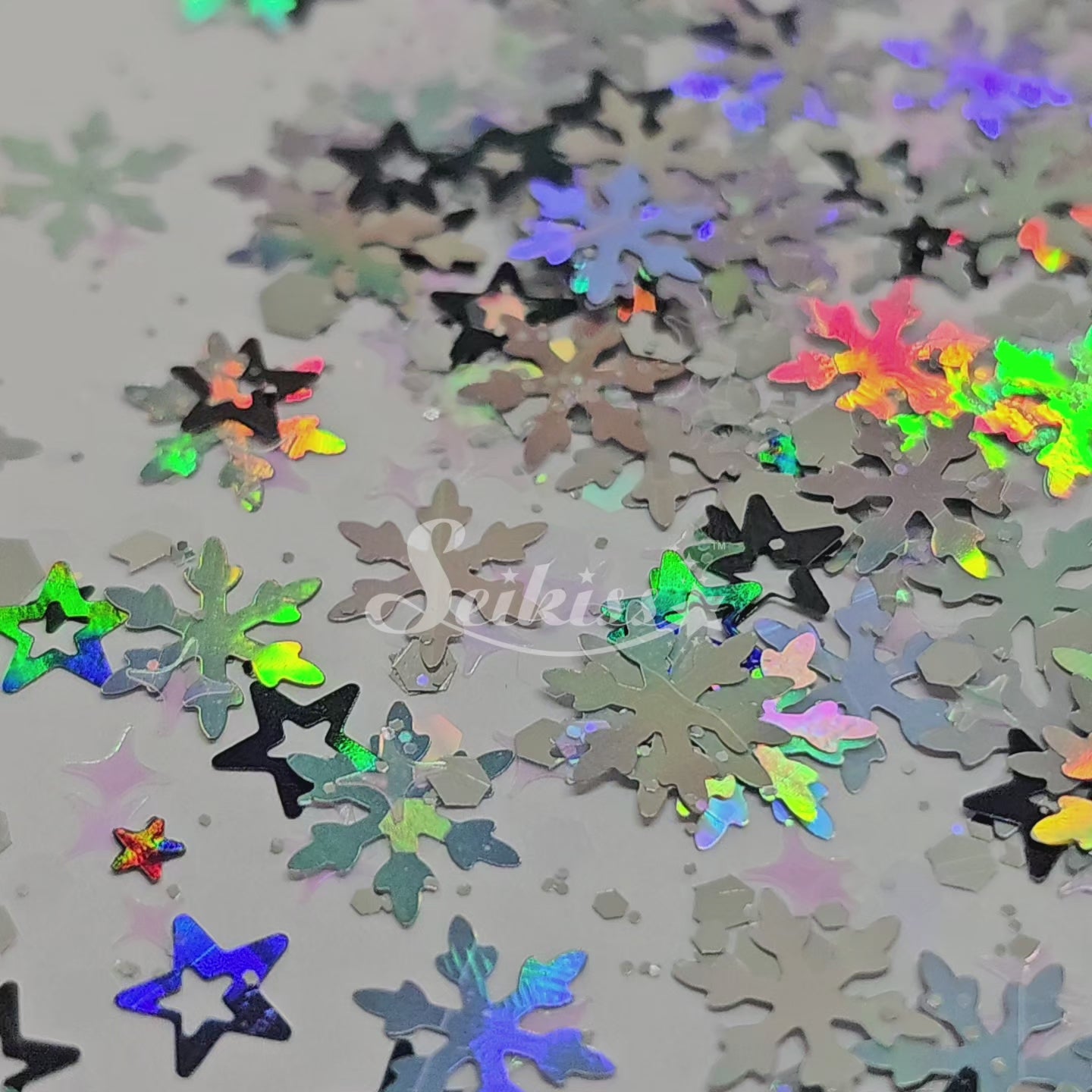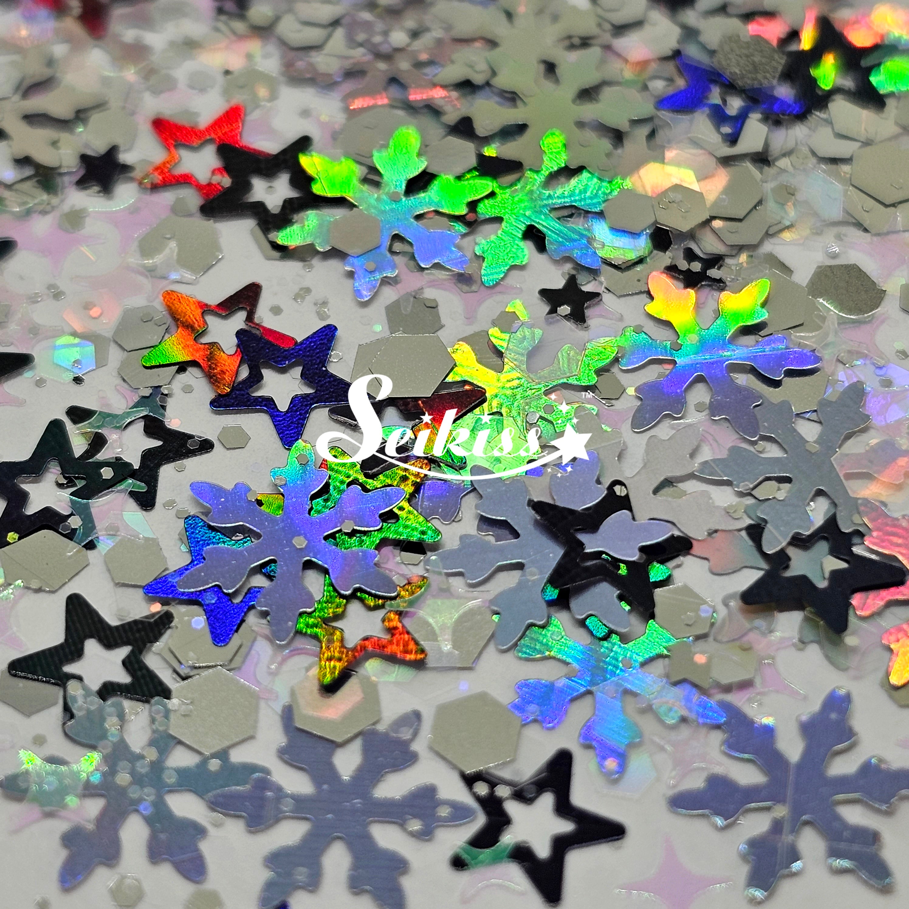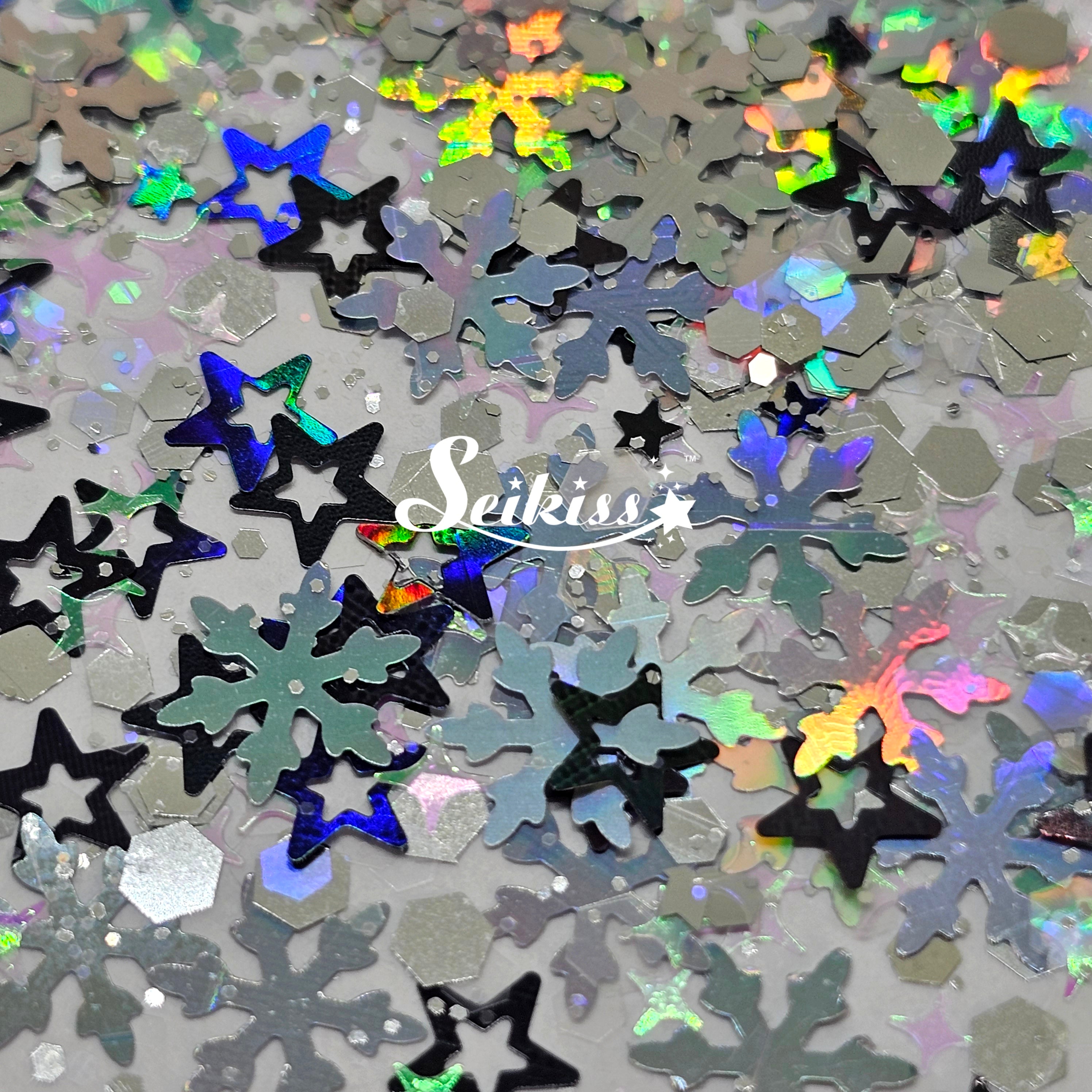 Silver Winter is a metallic chunky mix with silver holographic snowflakes, black stars, and iridescent small shining stars. This makes your projects shine and is perfect for resin, nails, tumblers, jewelry, arts, and all types of crafts and projects.