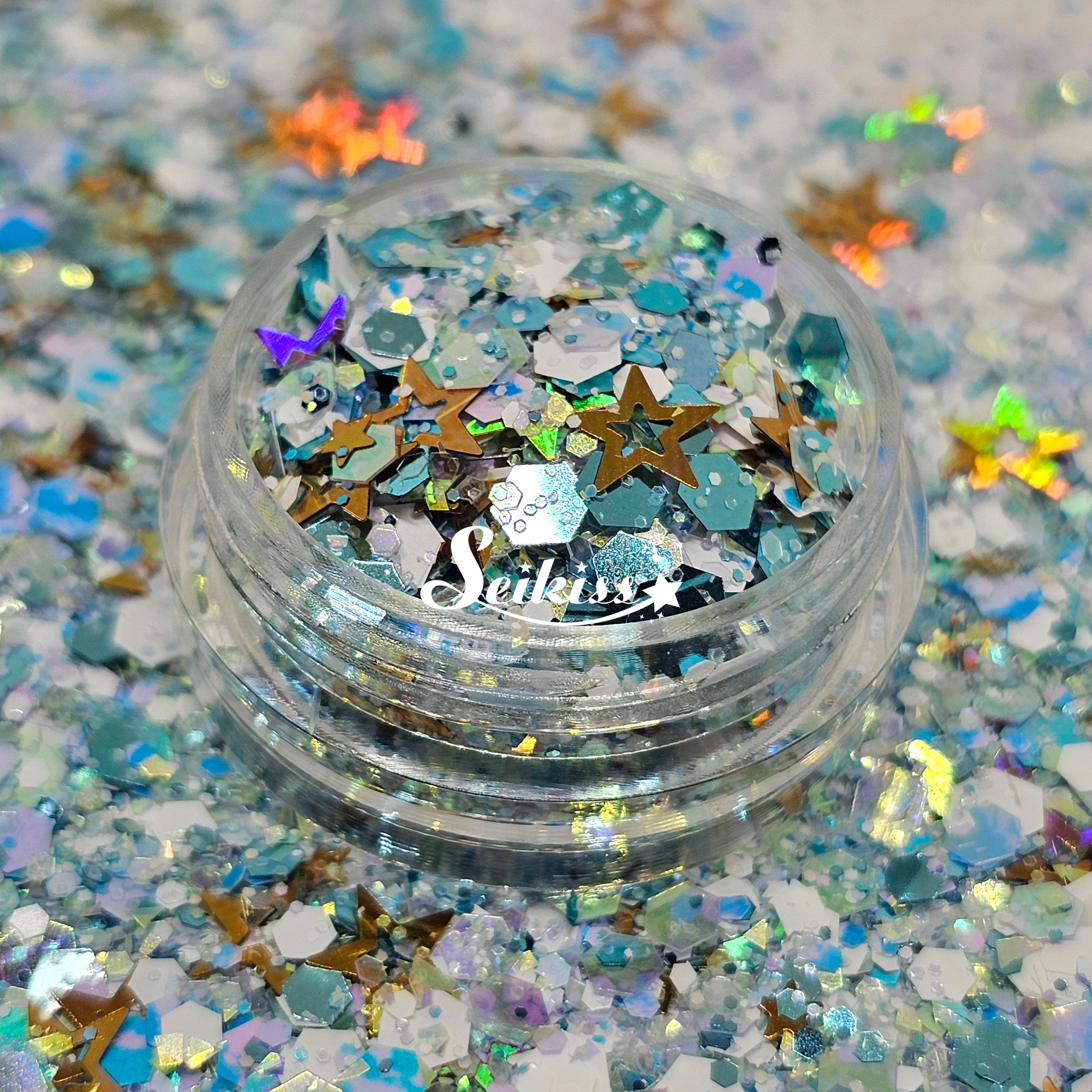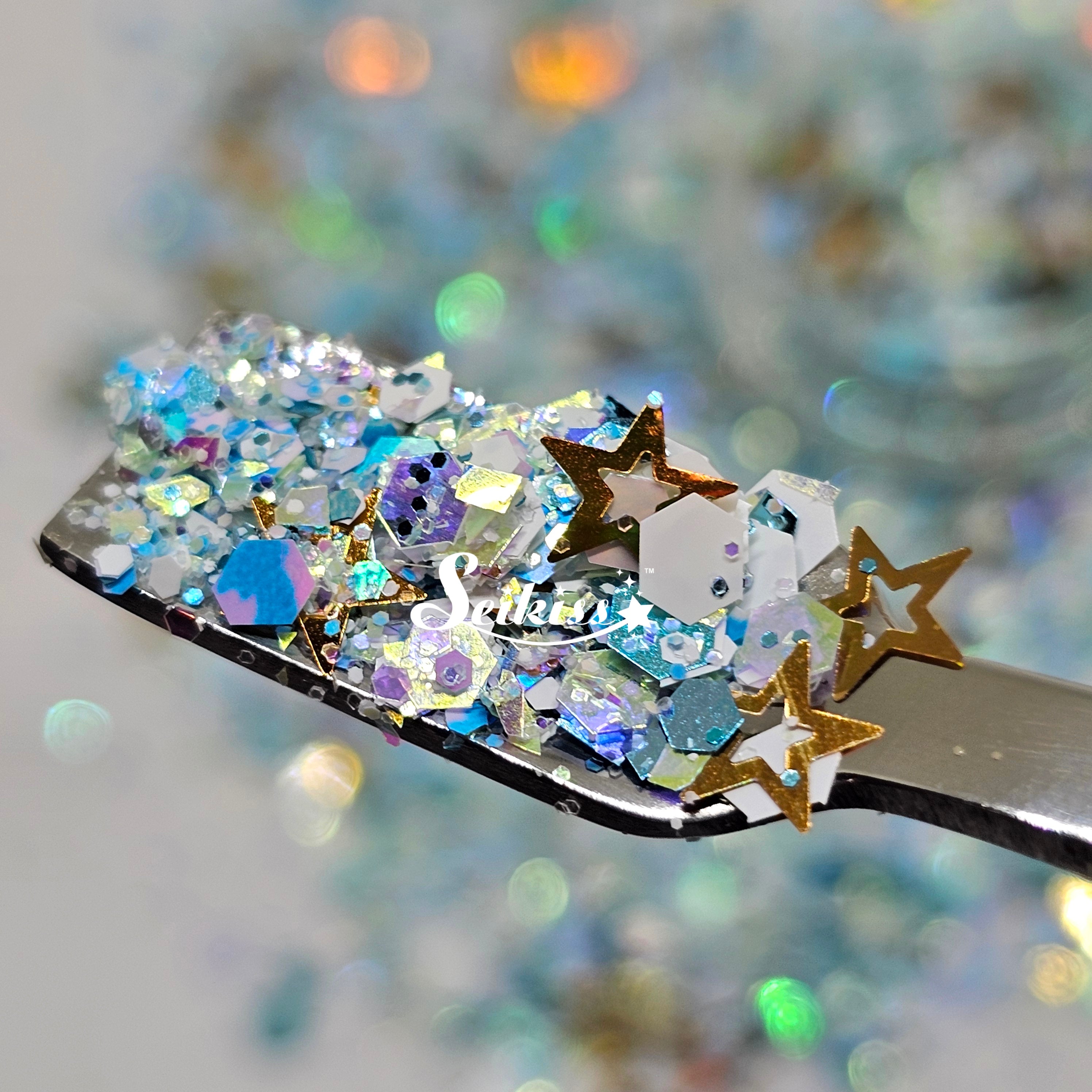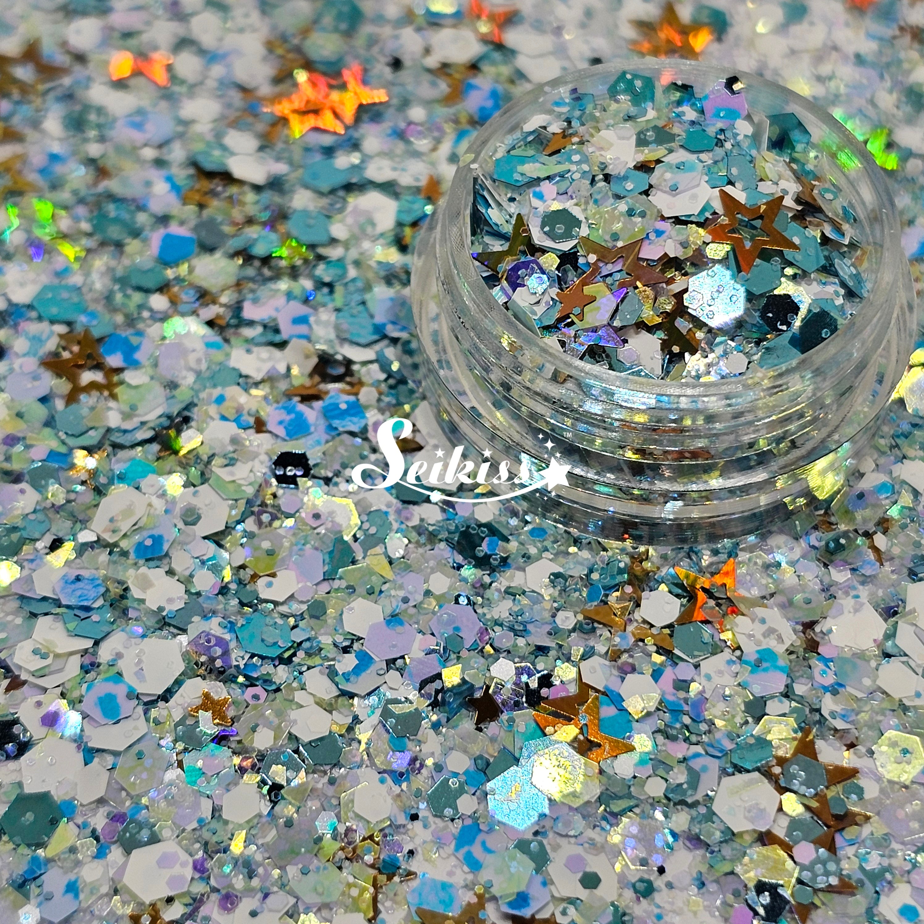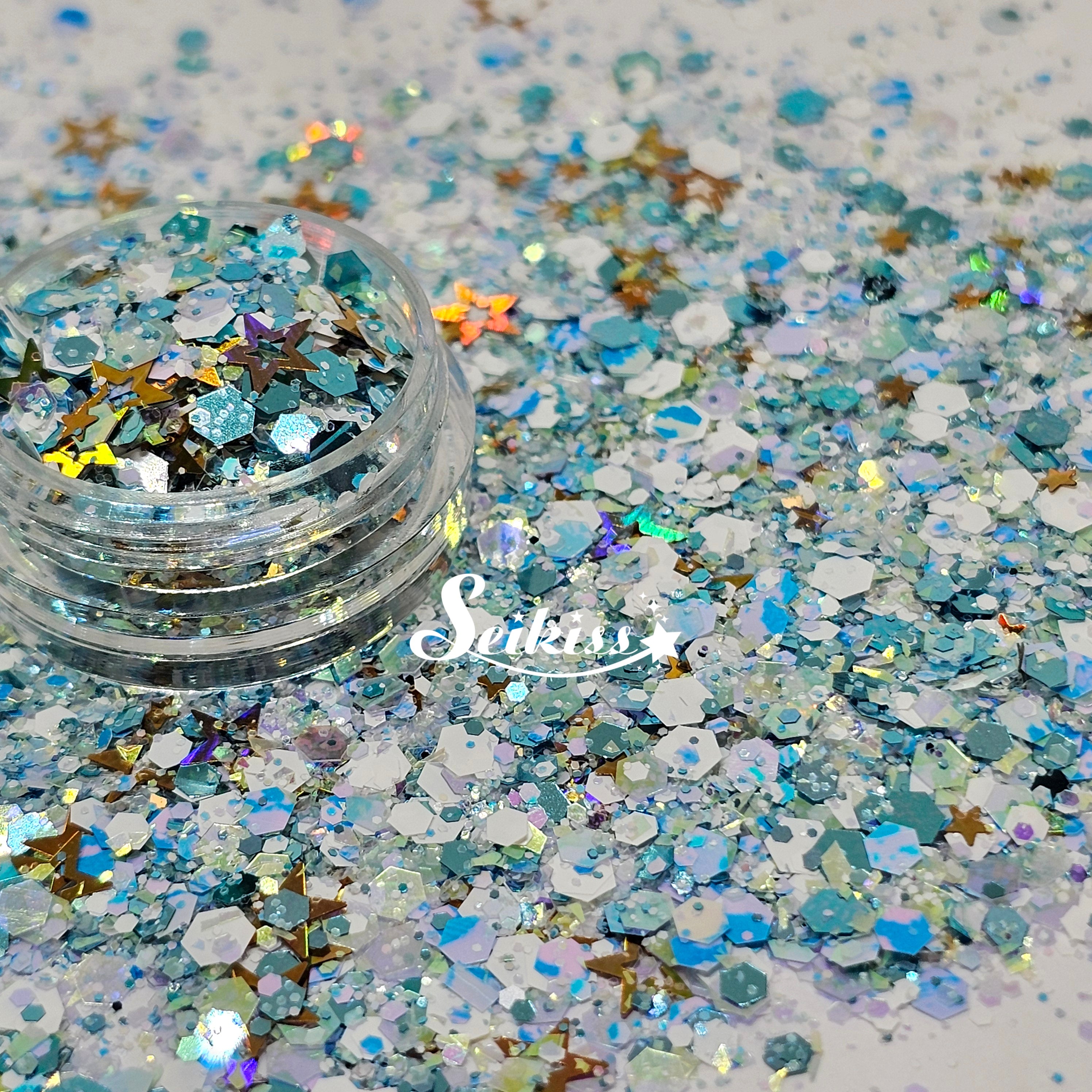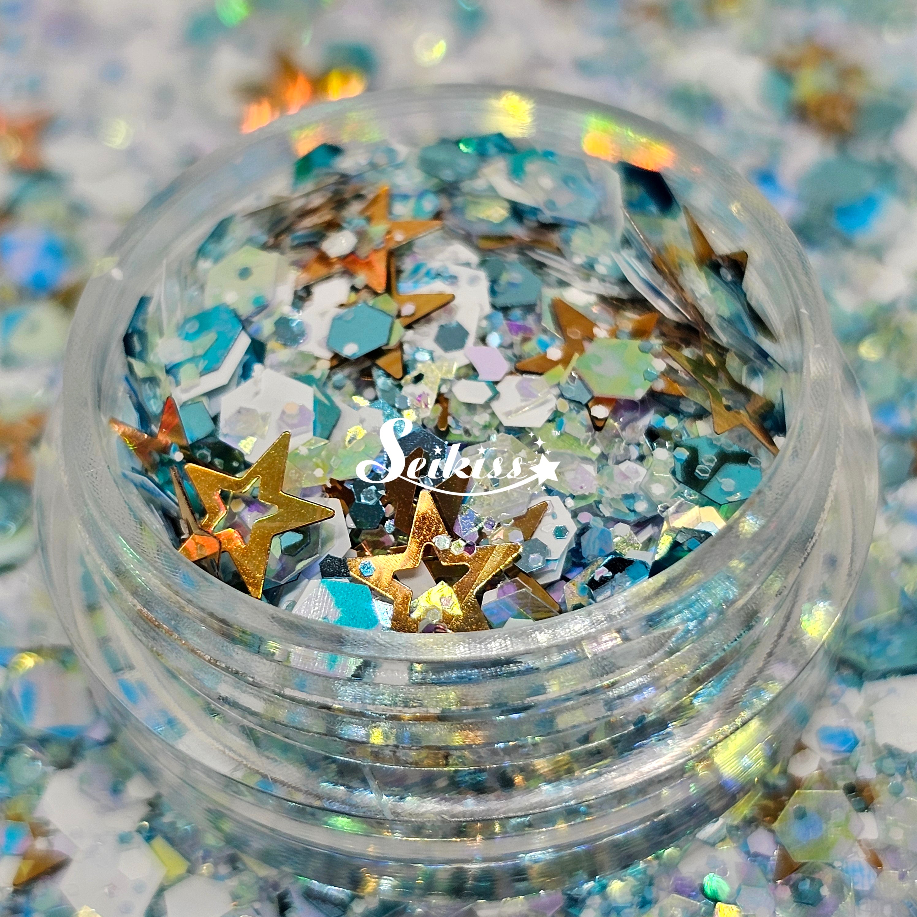 Starry sky is a mix of metallic white and turquoise, holographic gold stars and iridescent blue adding a stunning visual effect to your artwork. This makes your projects shine and is perfect for resin, nails, tumblers, jewelry, arts, and all types of crafts and projects.