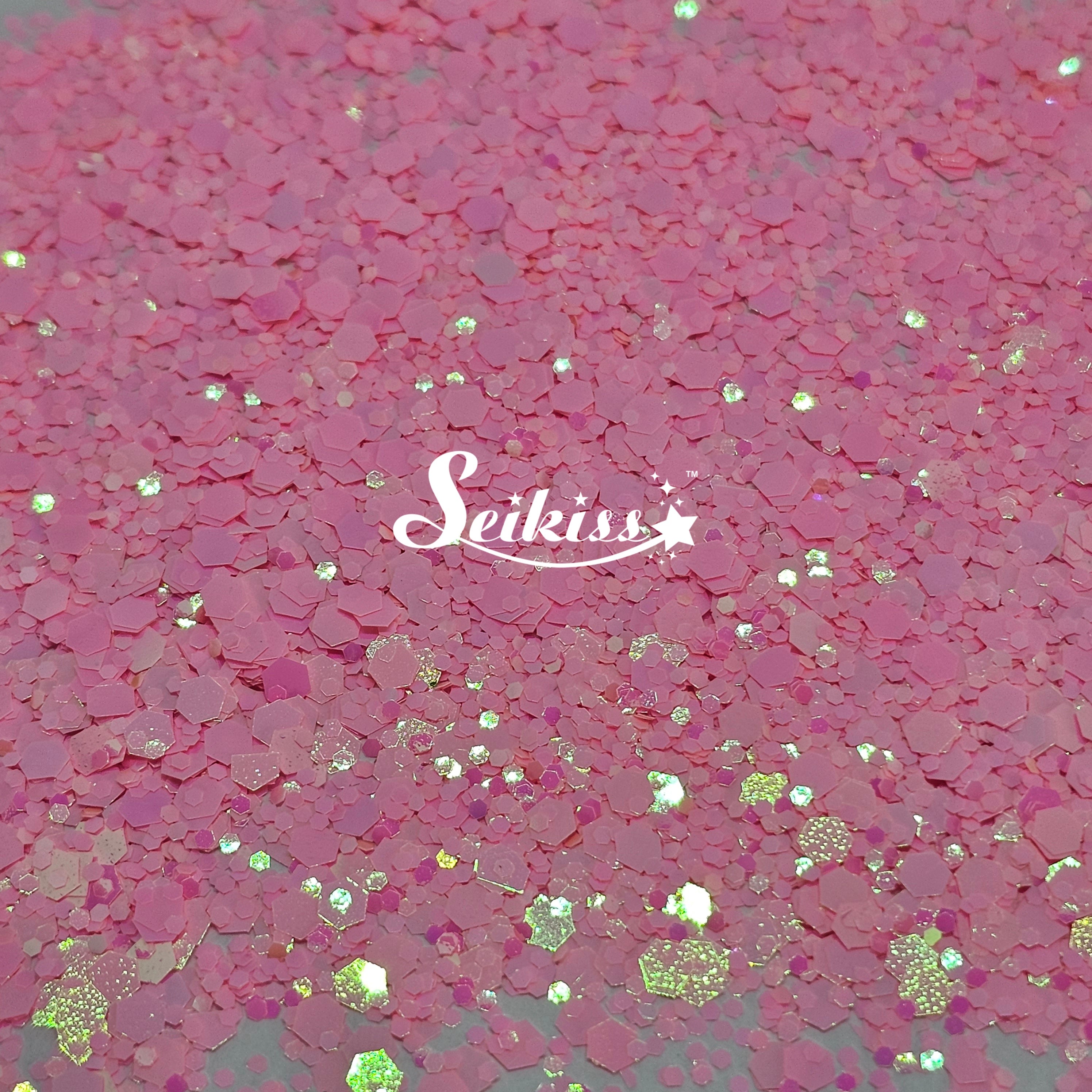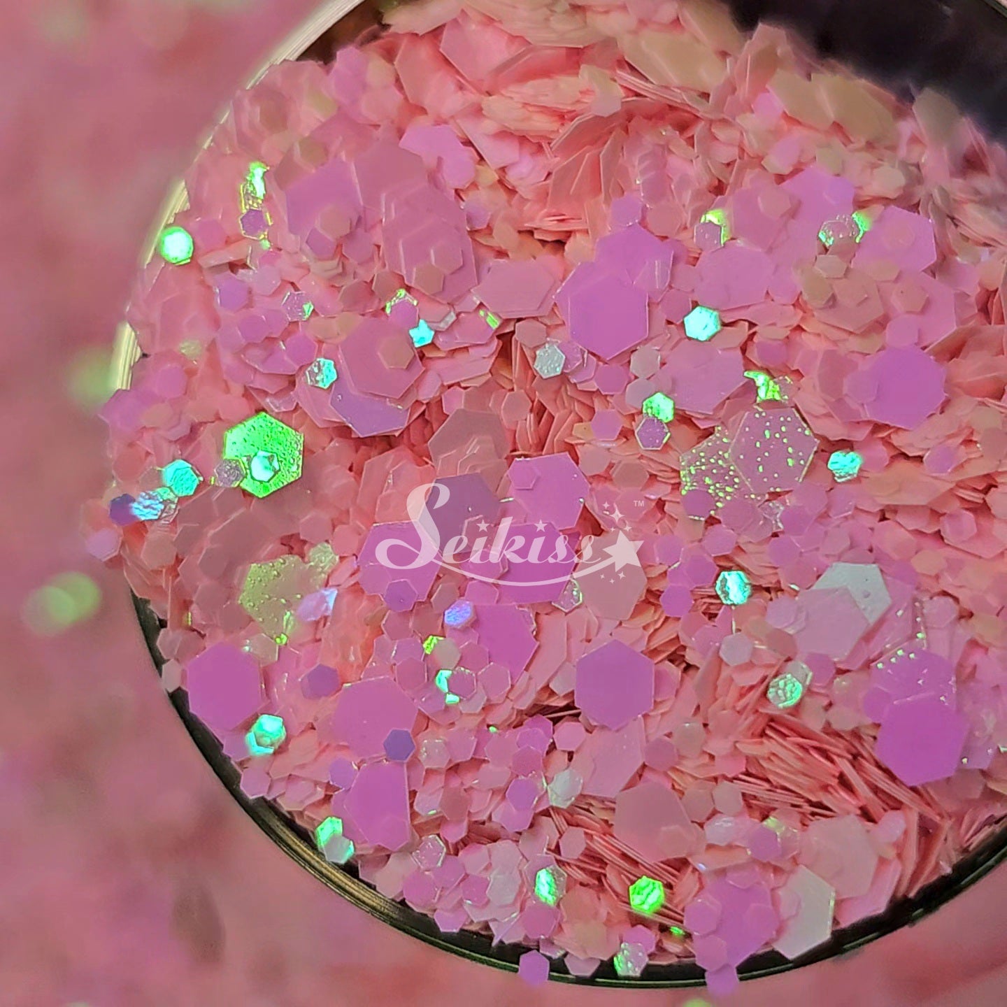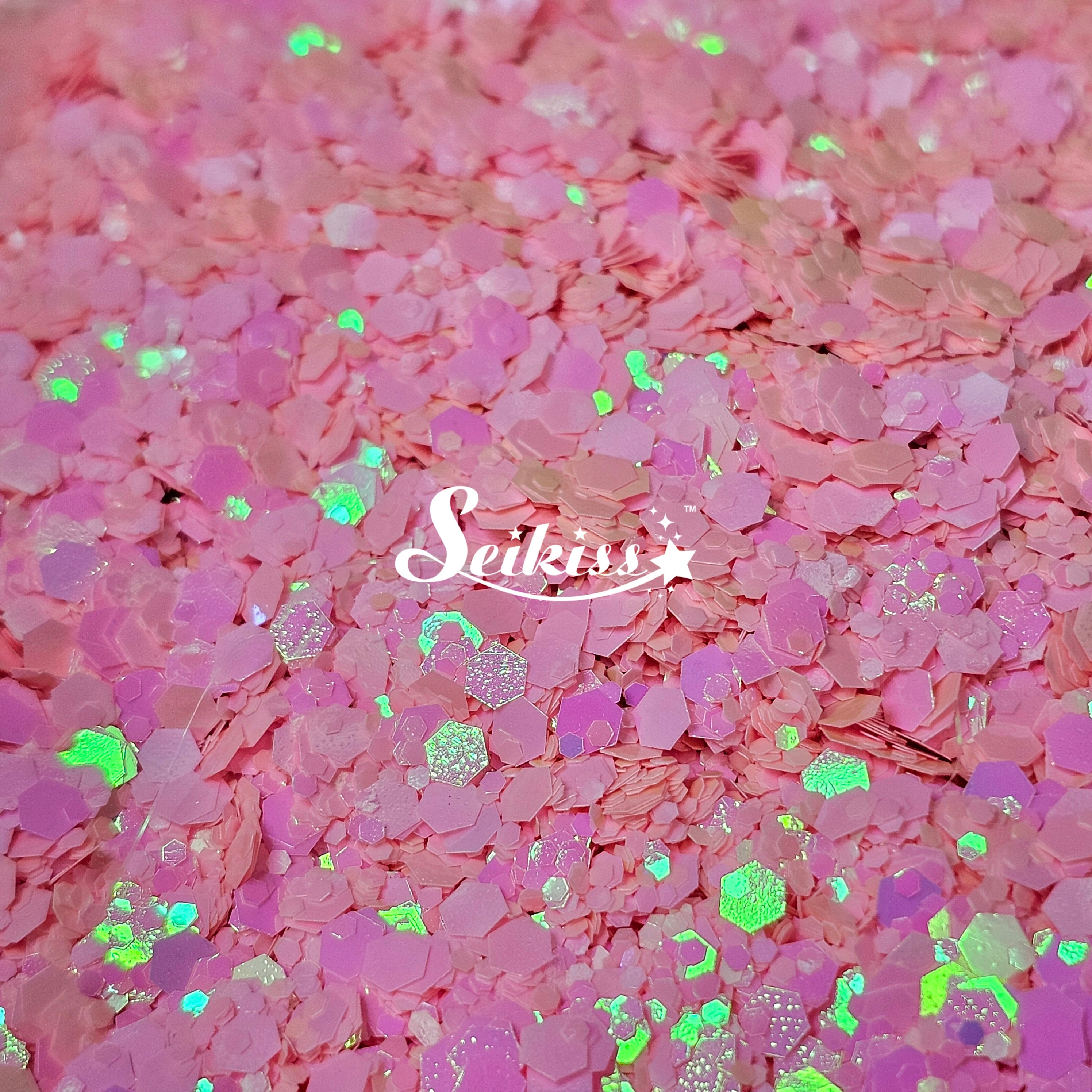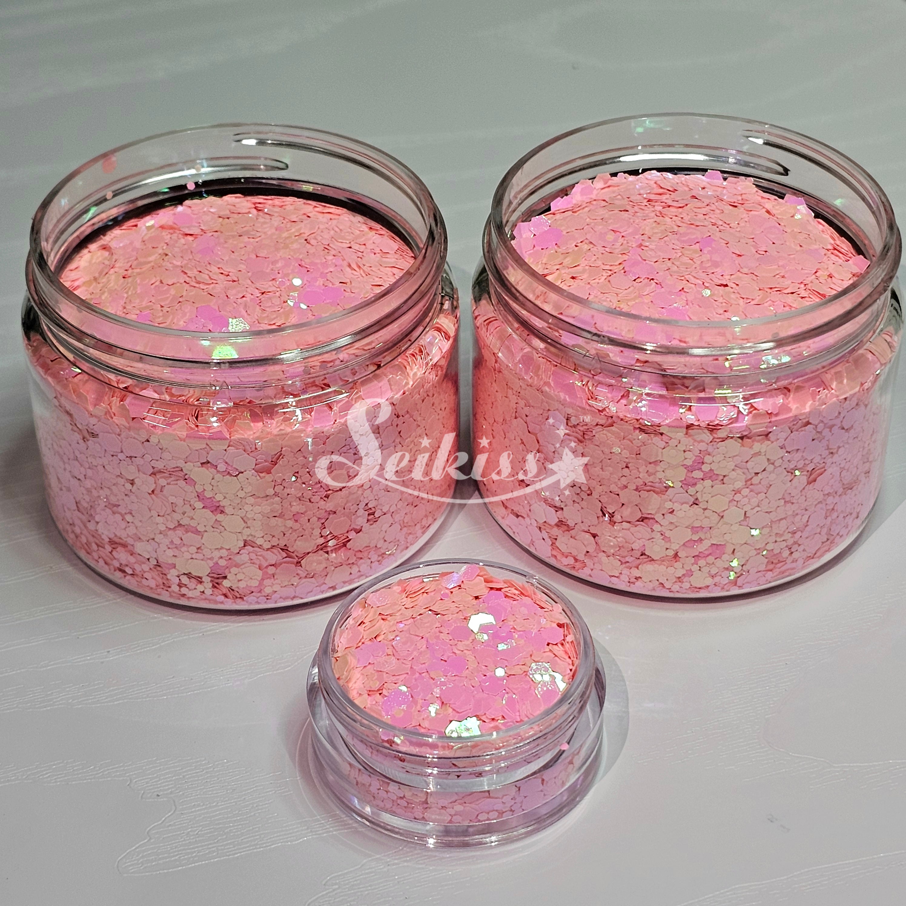 Strawberry Shake Chunky Mix Glitter features a metallic pink/peach with iridescent finish. Perfect for mixing with other colors and use with resin, nails, tumblers, jewelry, arts, and all types of crafts and projects.