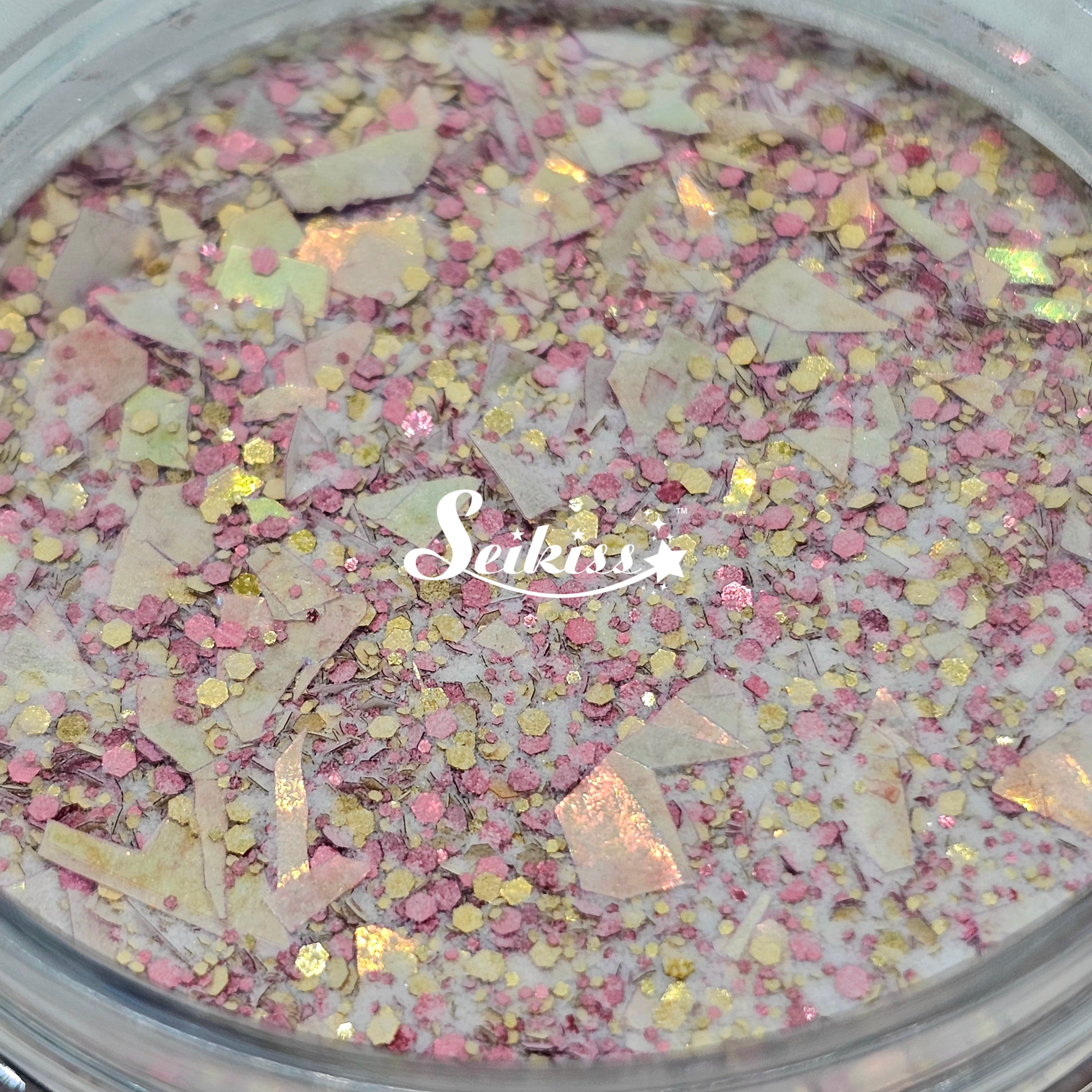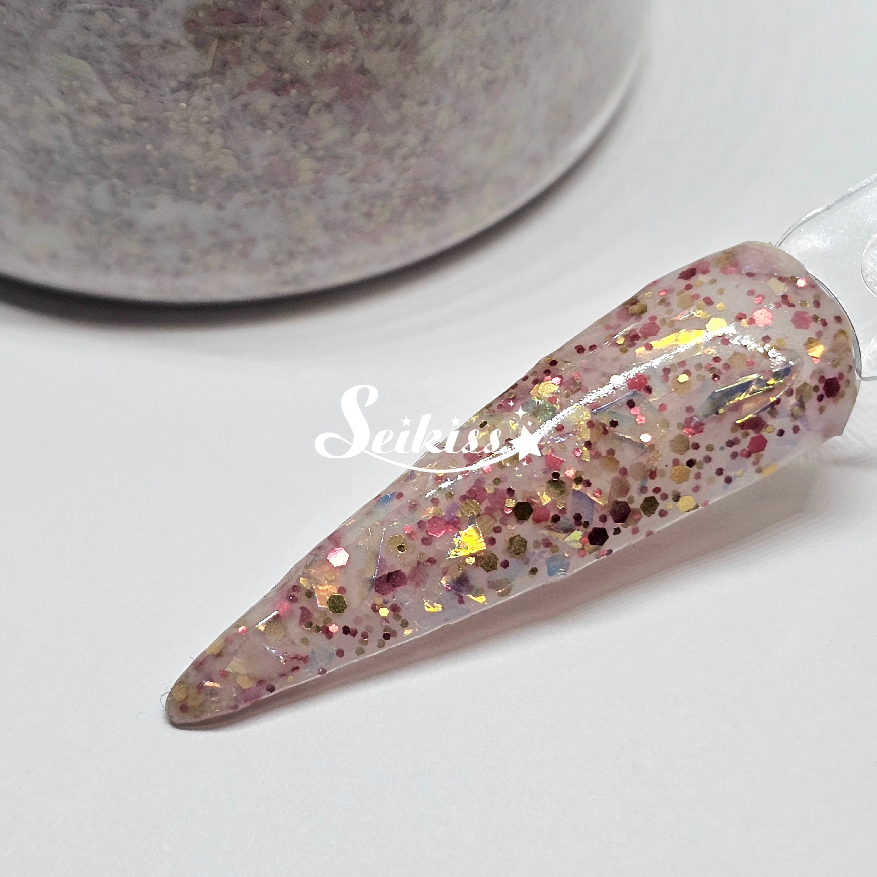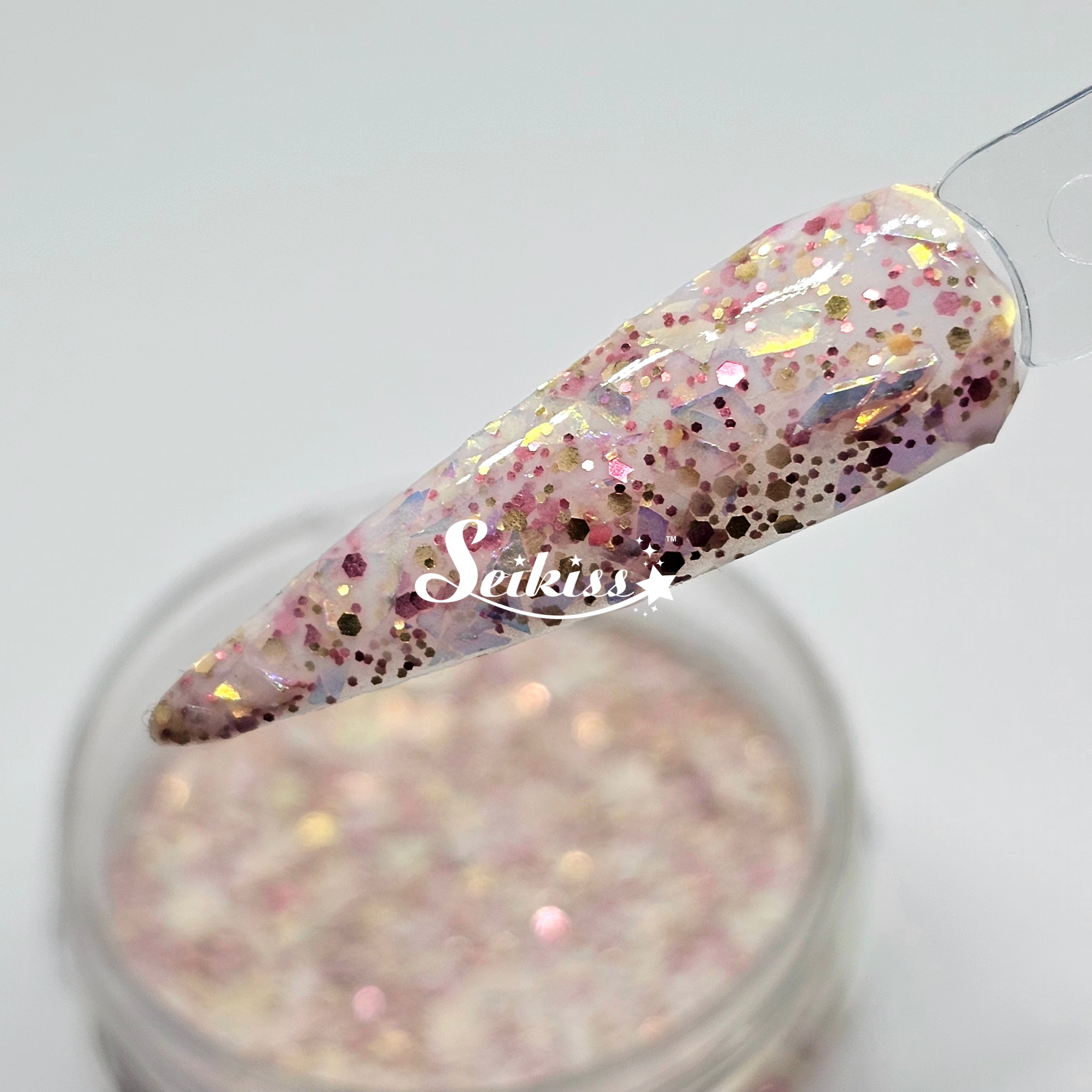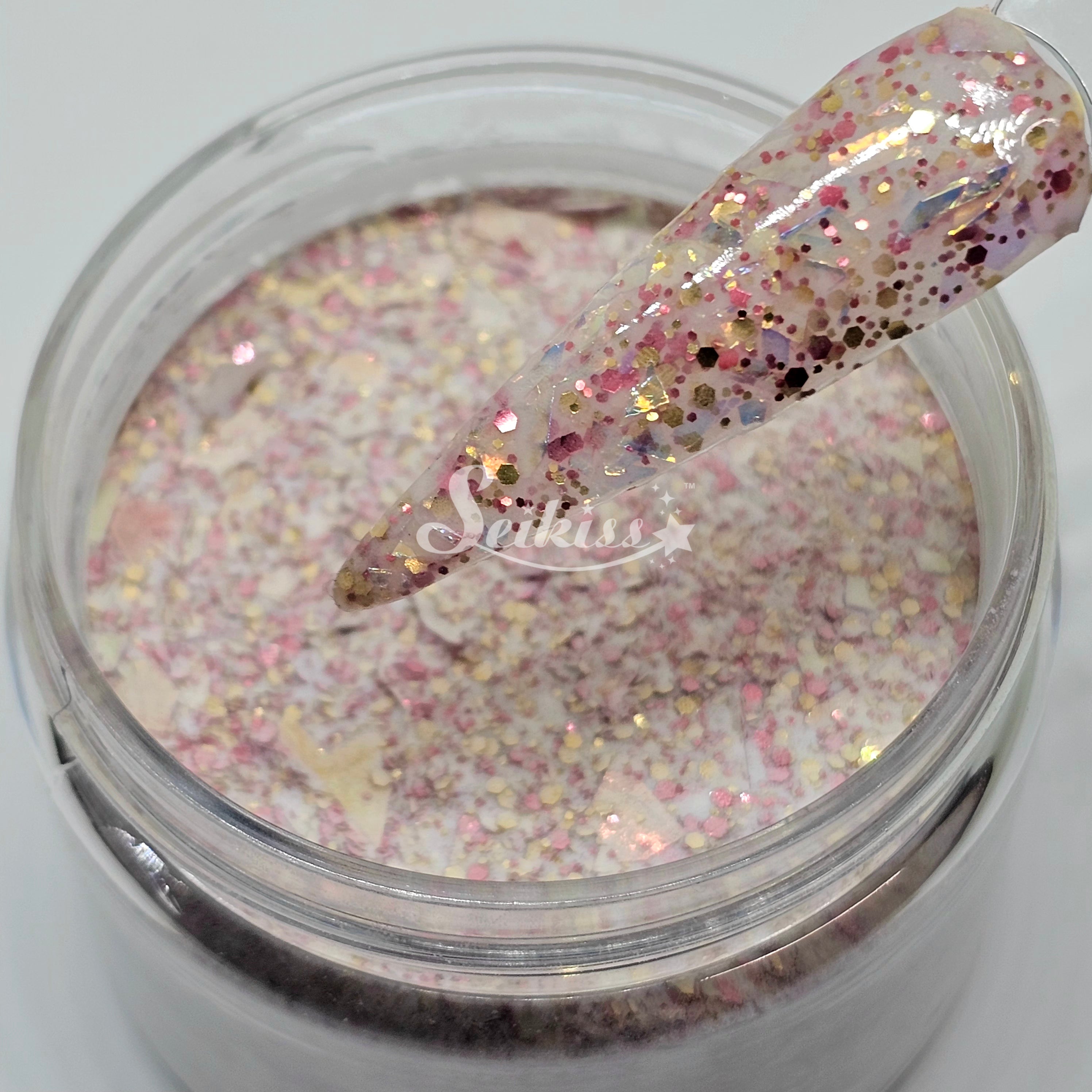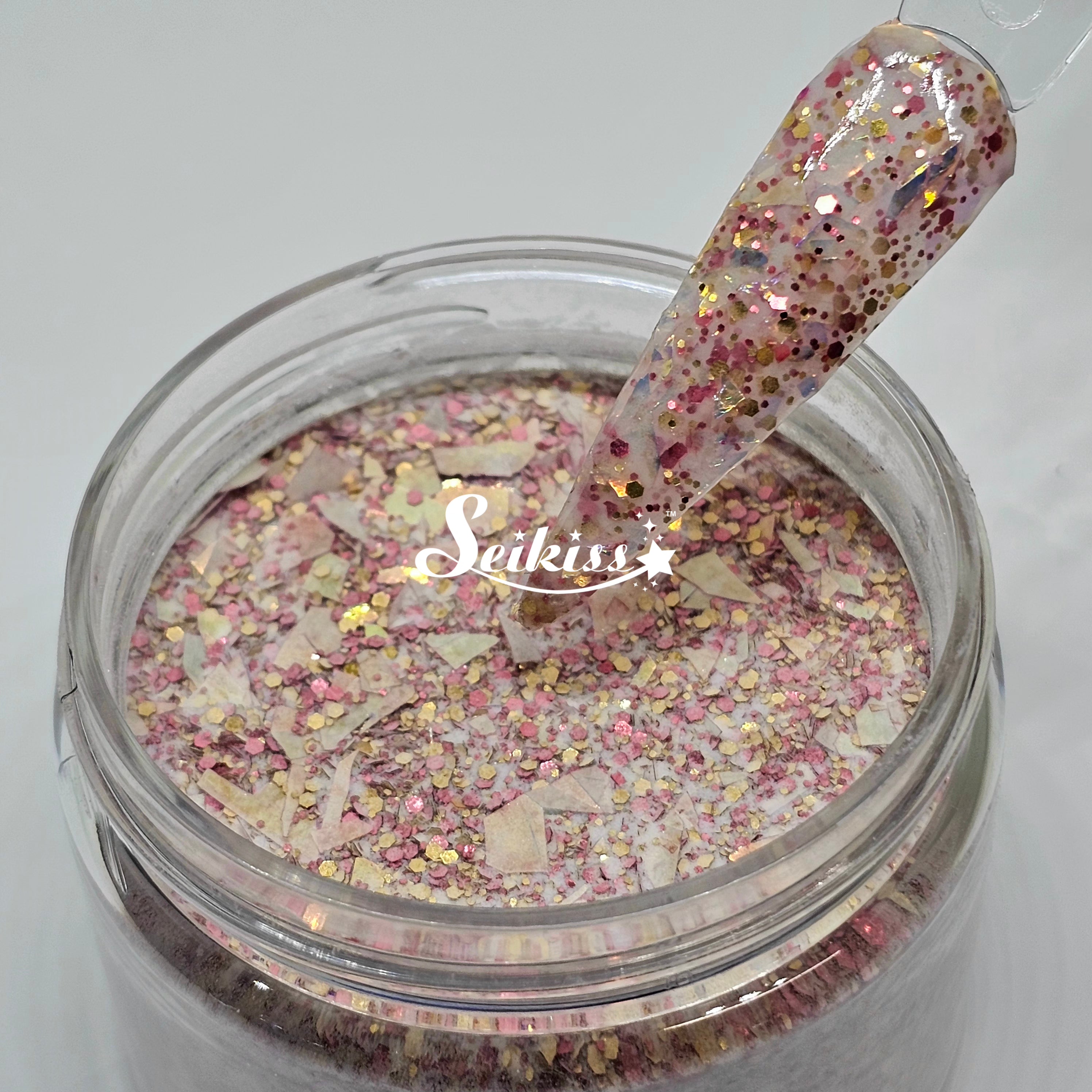 Sunrise Champagne is a high quality acrylic nail powder mix with metallic gold, and rose gold glitter with a golden iridescent flakes making your nails look stunning.
