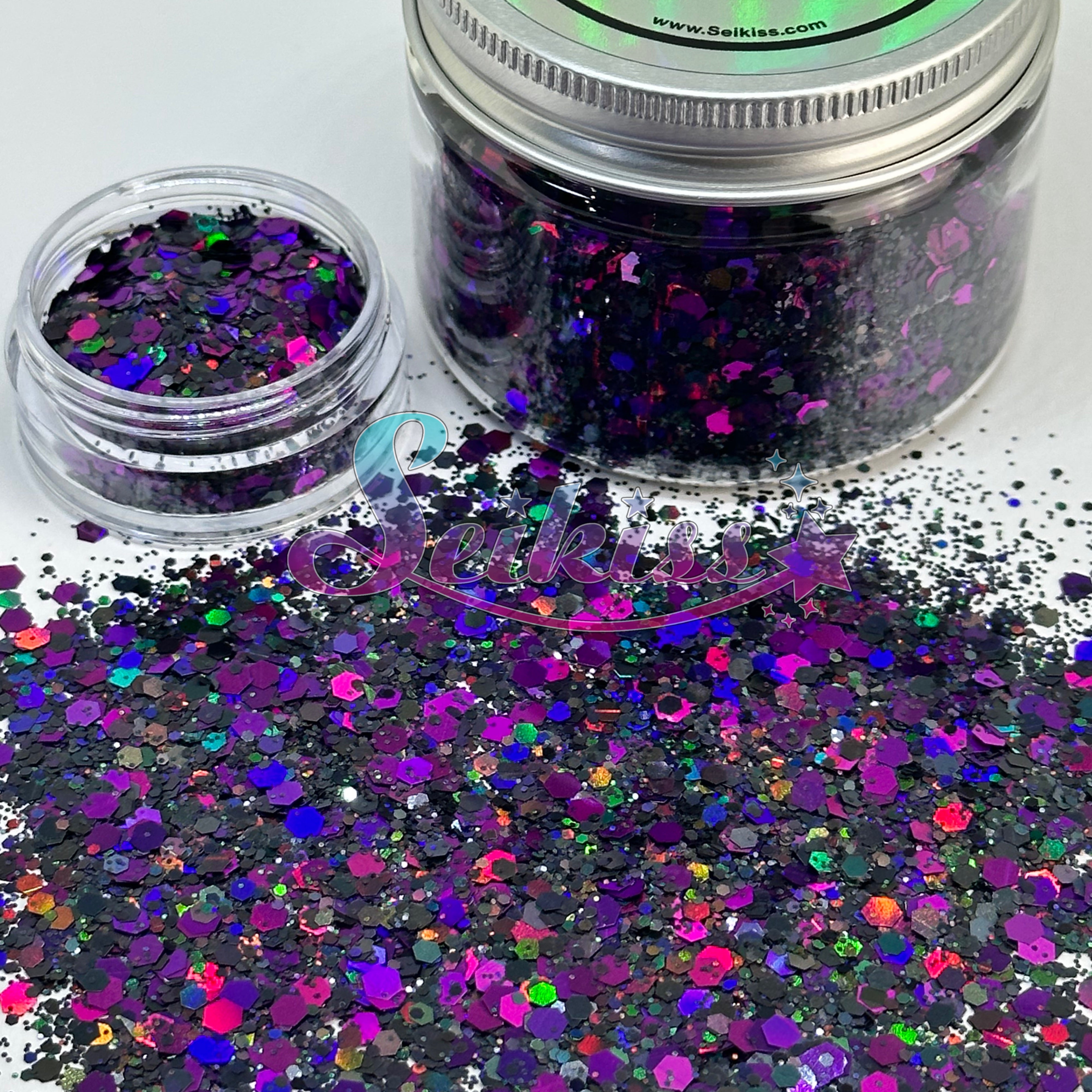Super Nova Galaxy has a colorful chunky mix with black and purple holographic effect with metallic finish, you can see different hues of purple/ magenta among other colors in different angles.