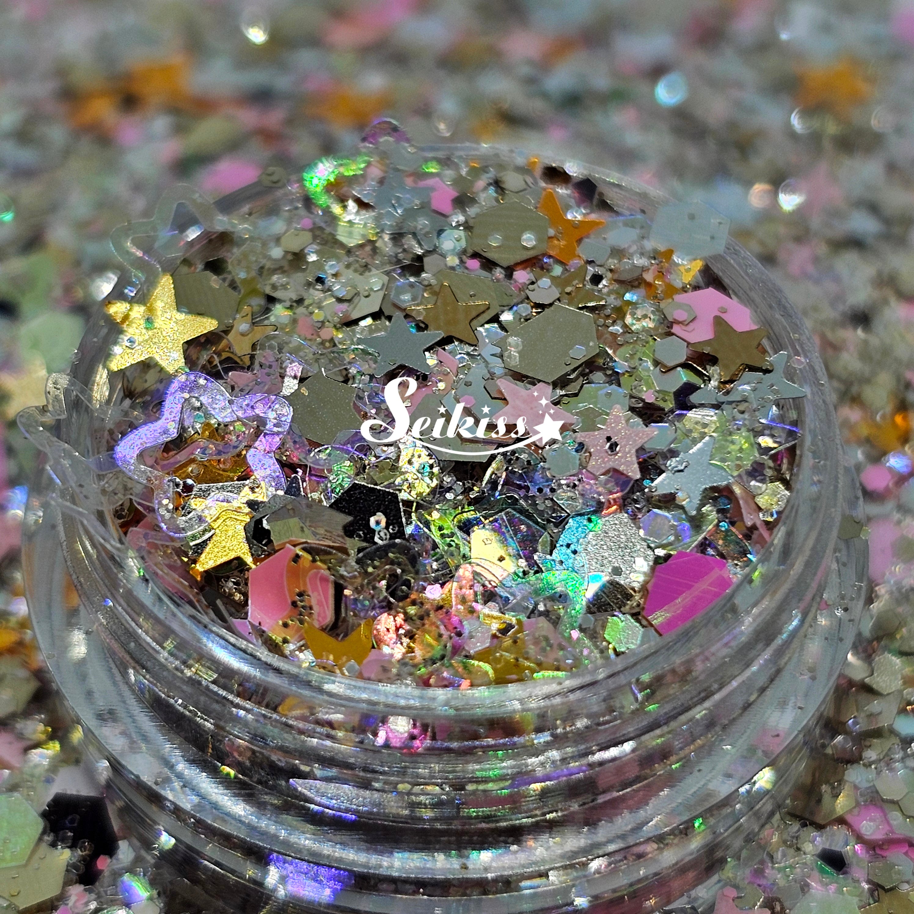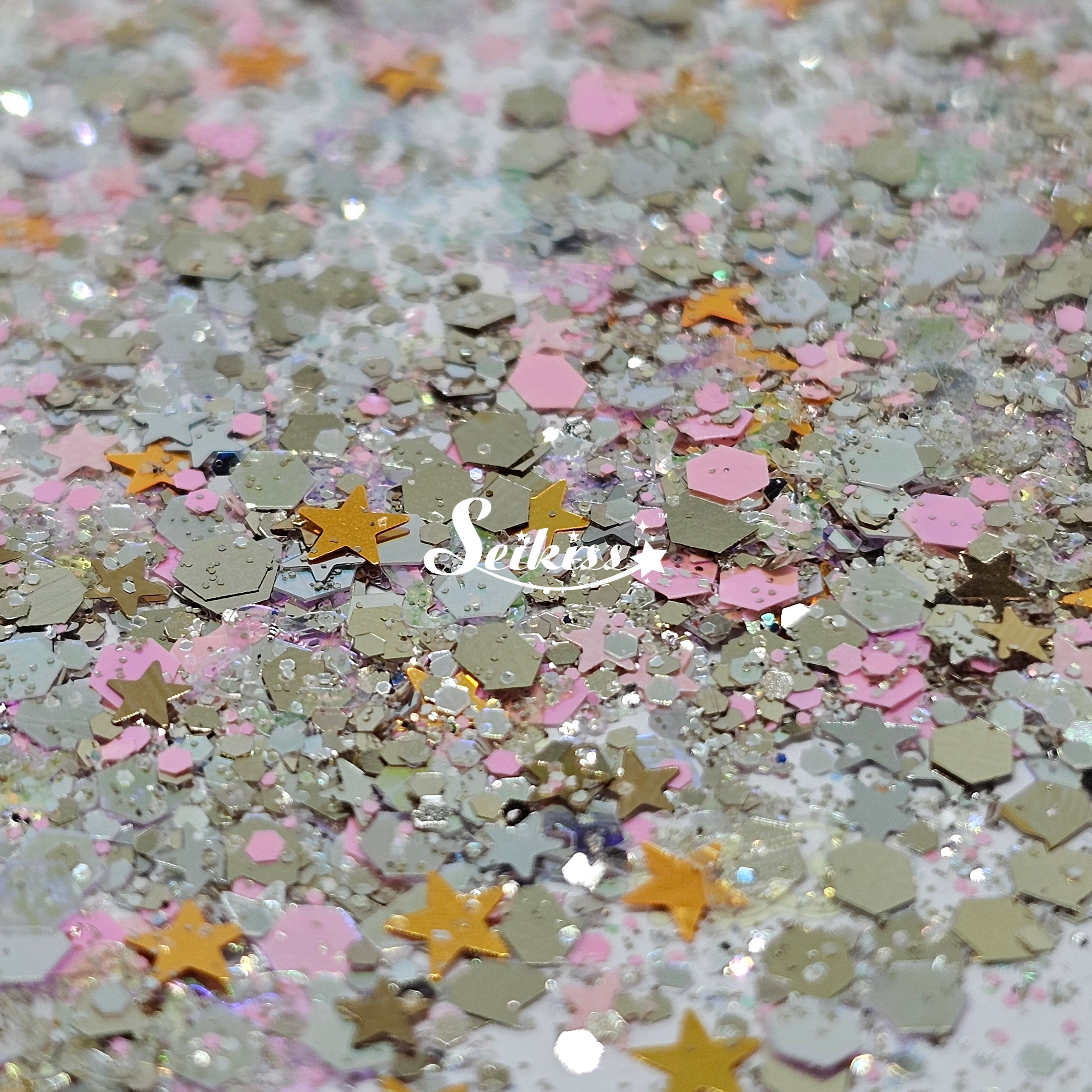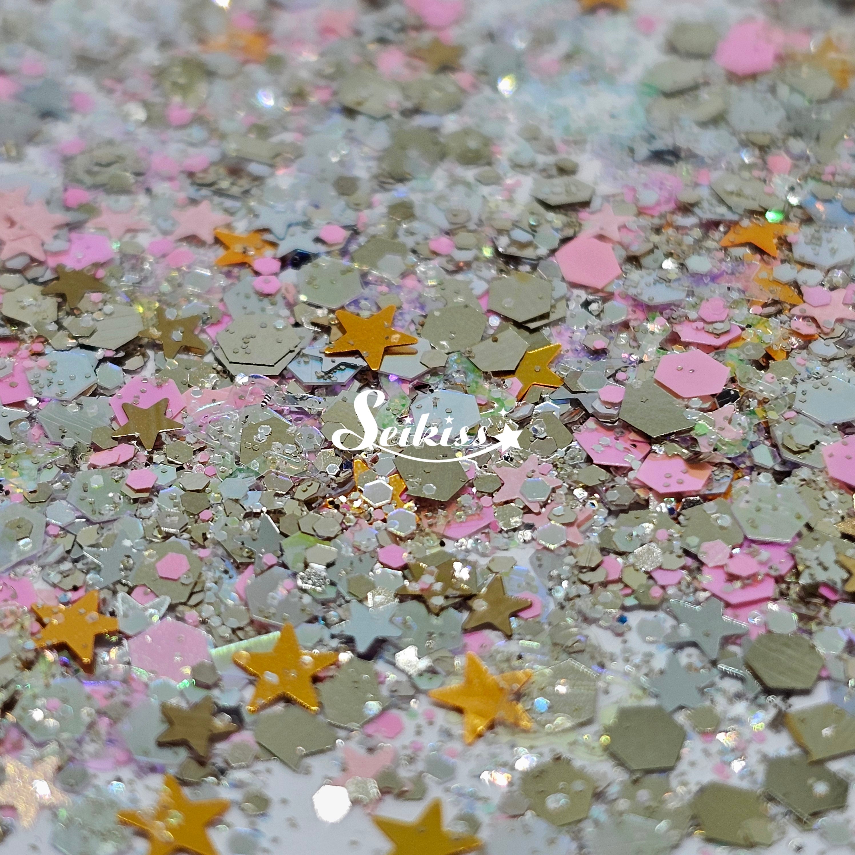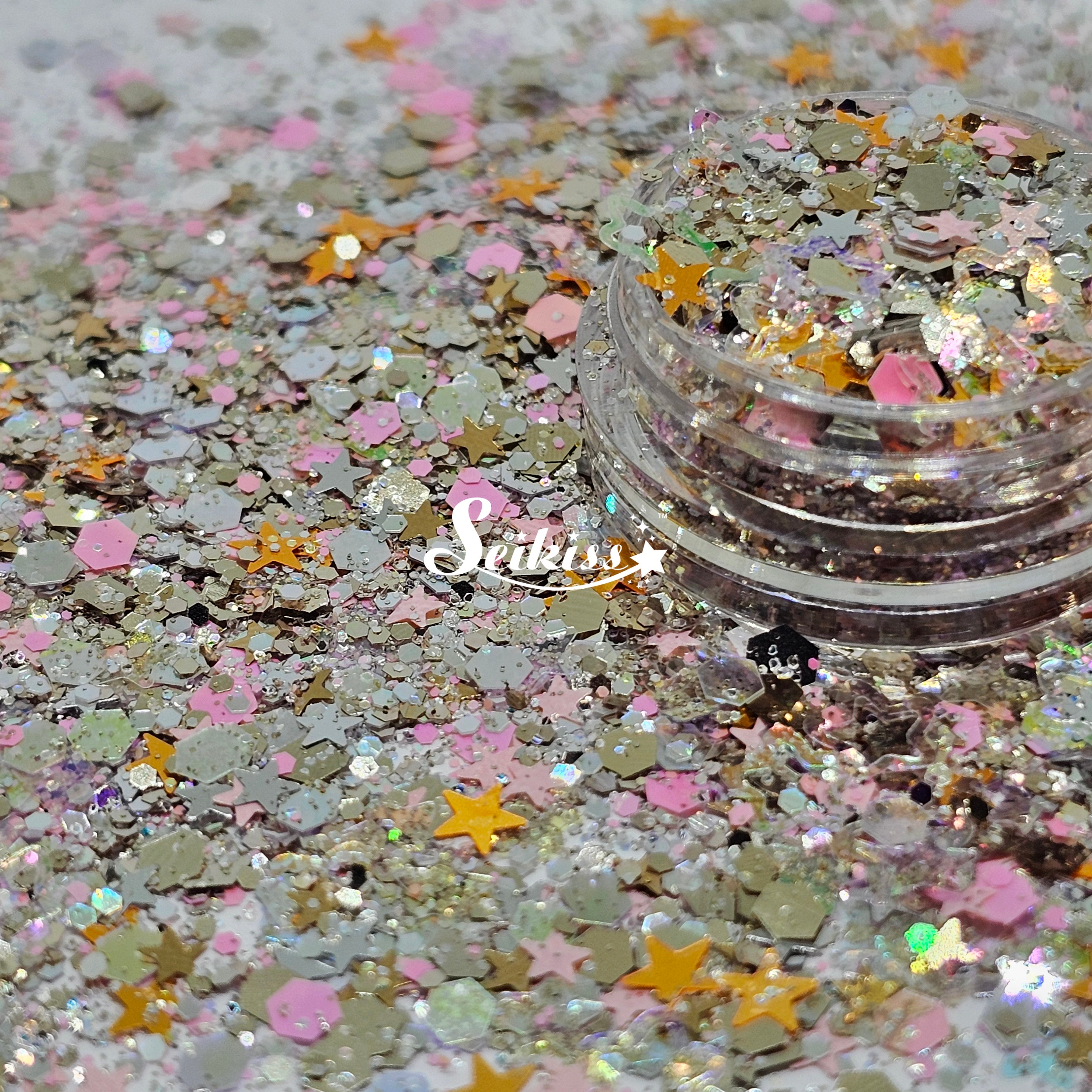 Superstar is a unique custom mix with gold, silver, pink, and iridescent stars. In this mix, you can also find a very sparkly soft gold flakes and diamond white chunky mix. Perfect for all your projects like resin, nails, tumblers, jewelry, arts, and all types of crafts.