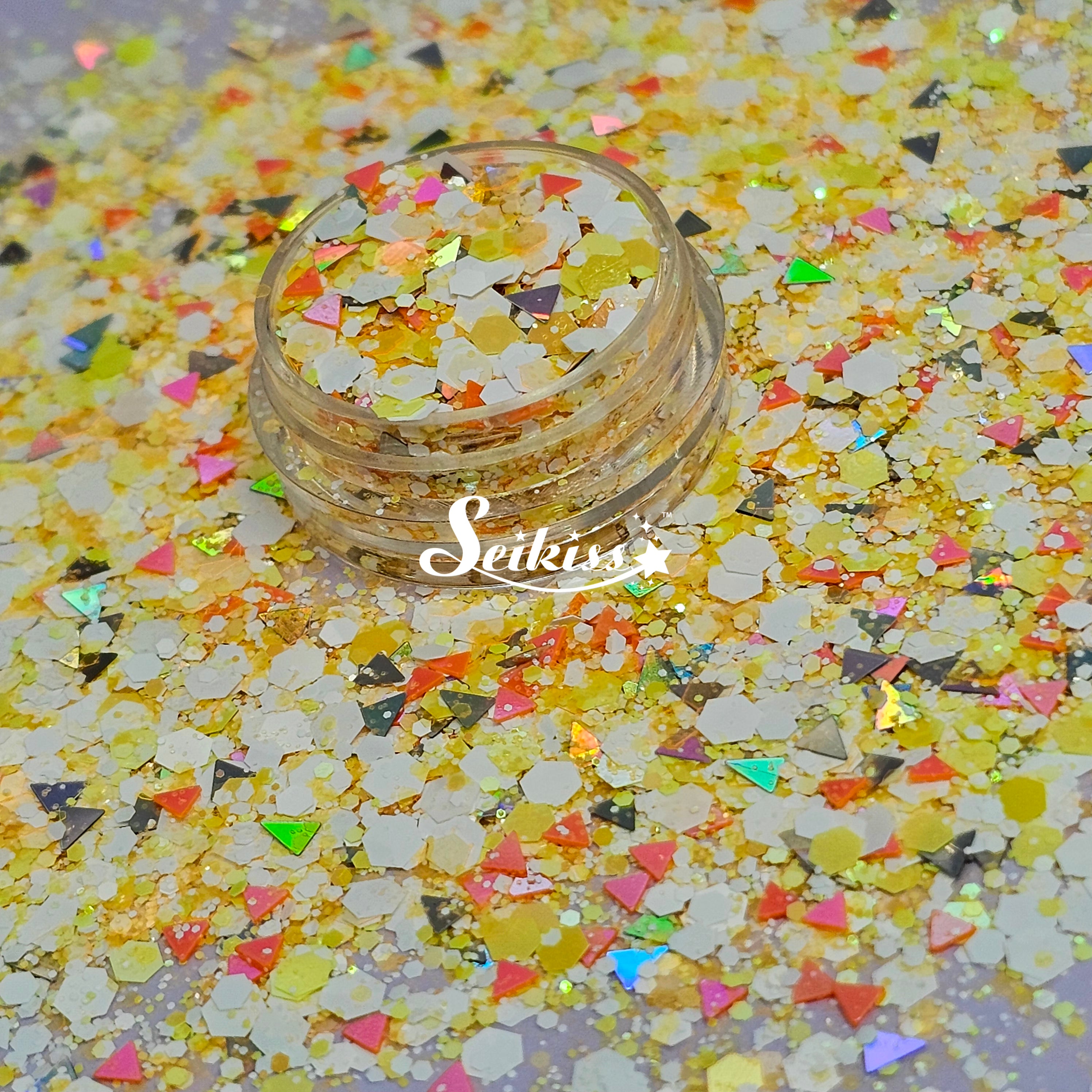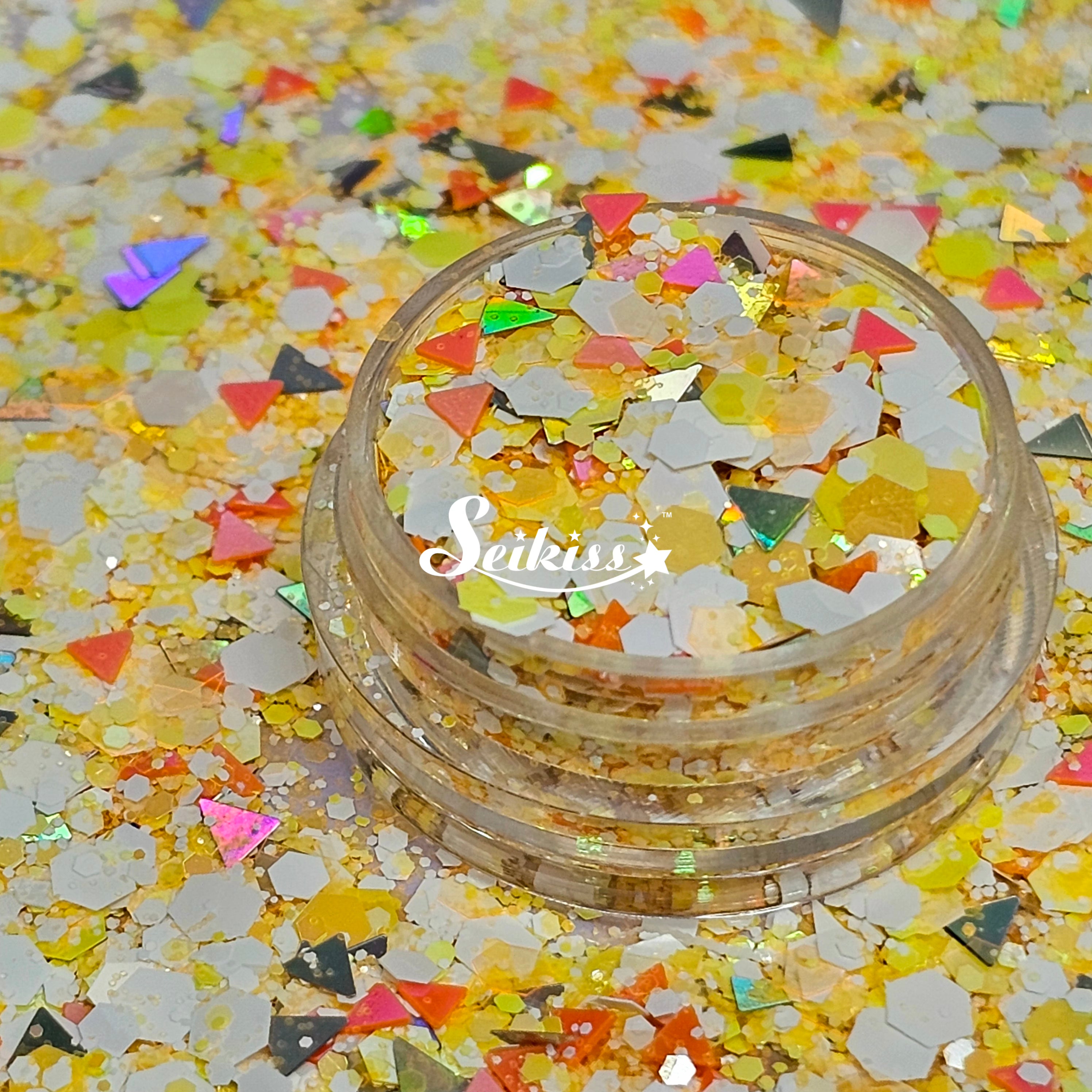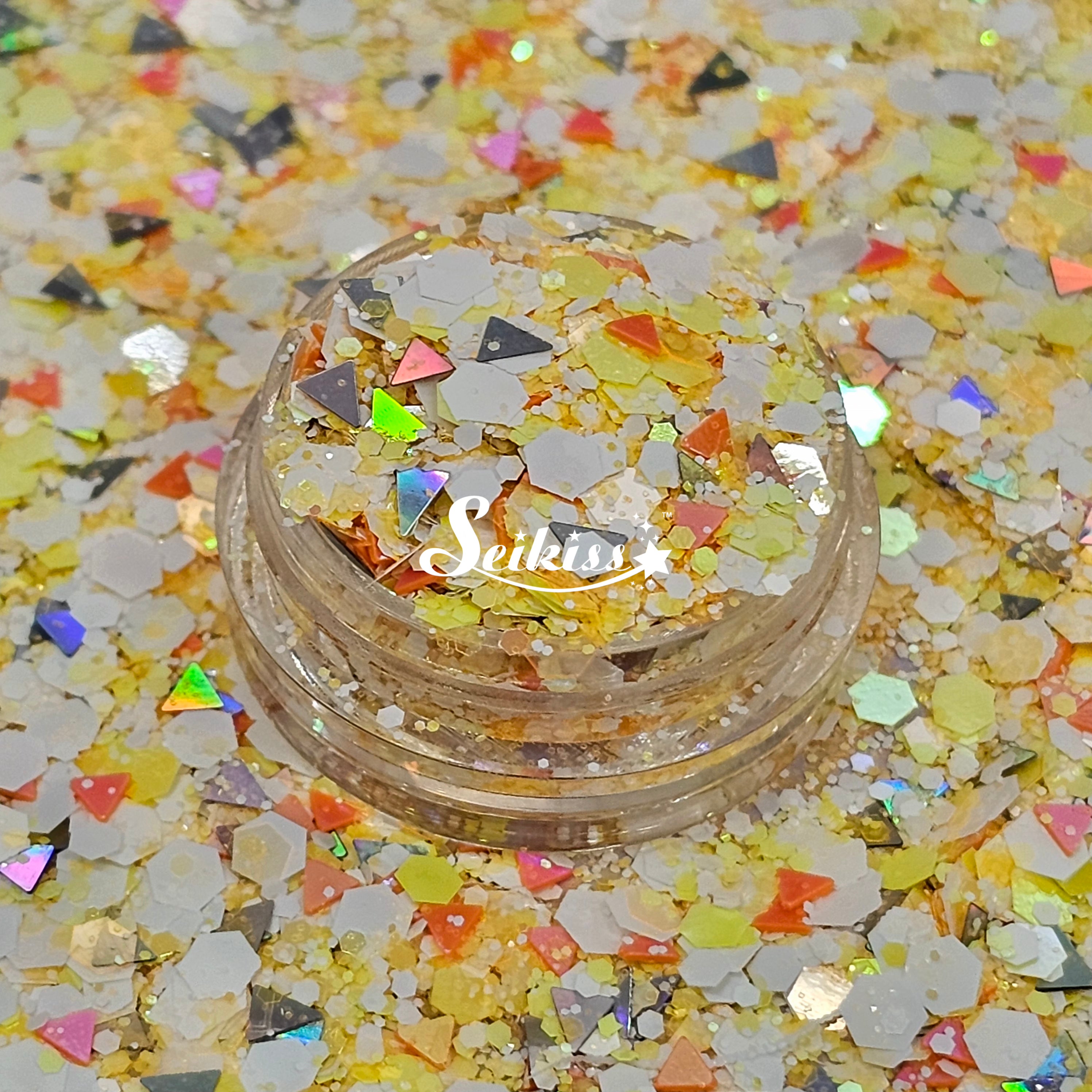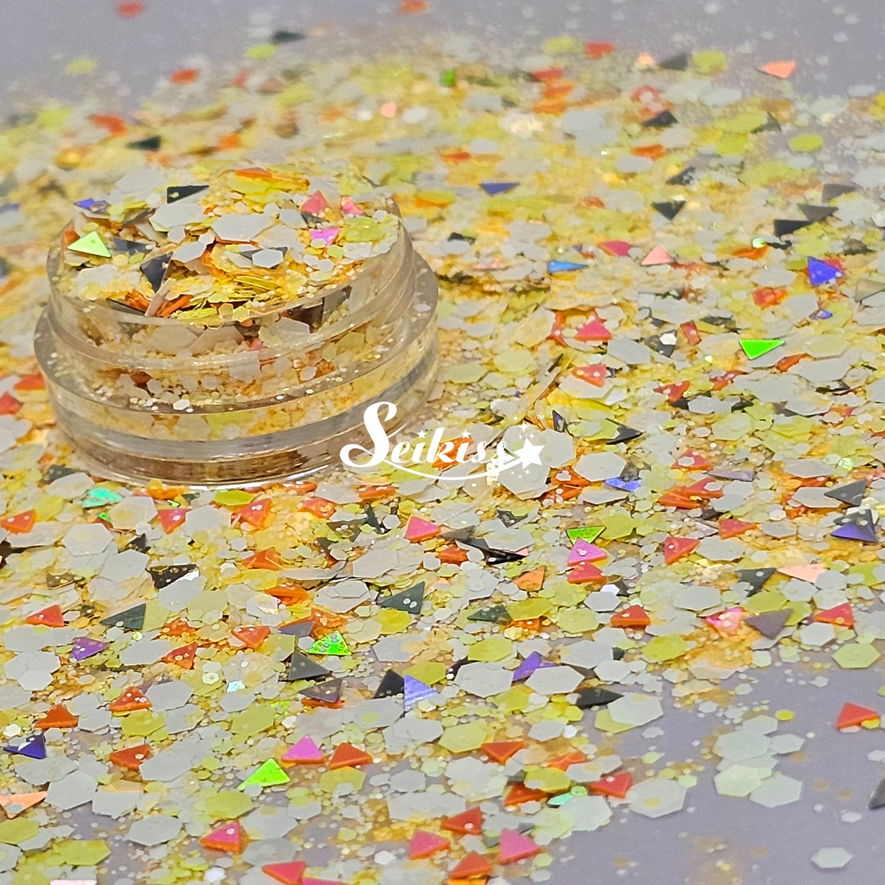 Sweet Fall features a stunning blend of white, iridescent yellow, and orange glitters. This mix is accented with silver and orange triangle shapes for an extra pop. The metallic and fluorescent finish gives it a high-impact sparkle that shifts beautifully in UV light—perfect for nails, resin art, tumblers, crafts, and more.