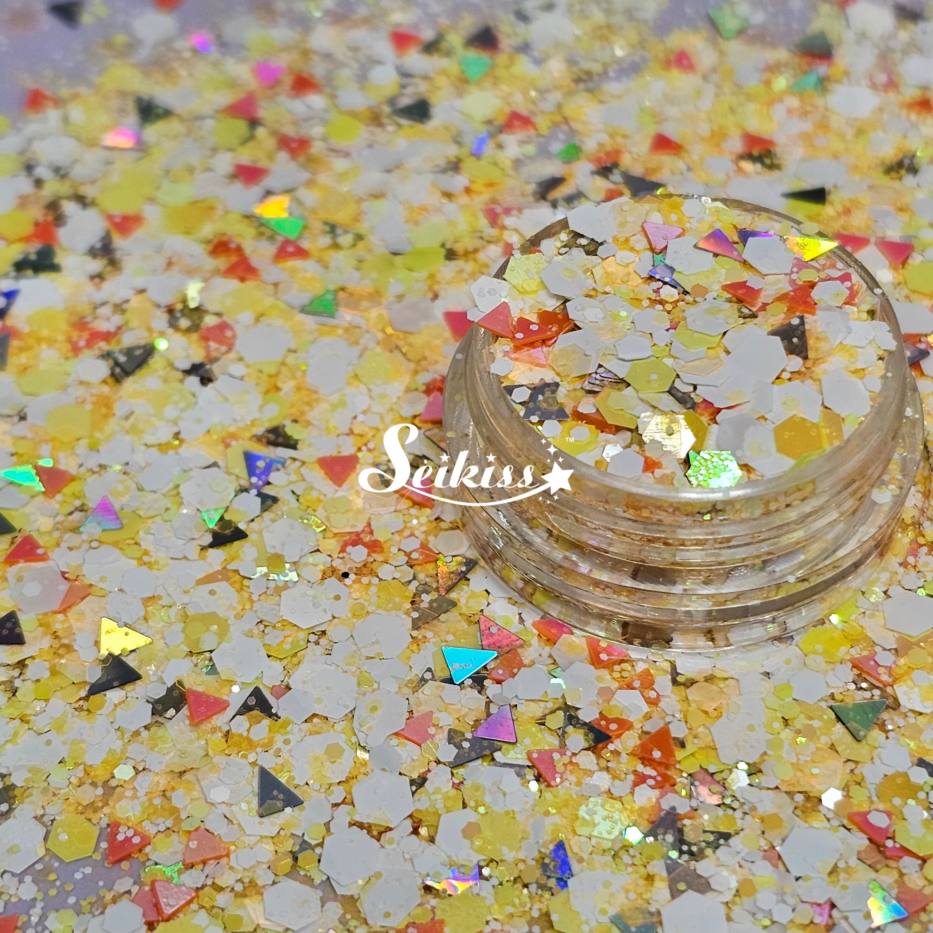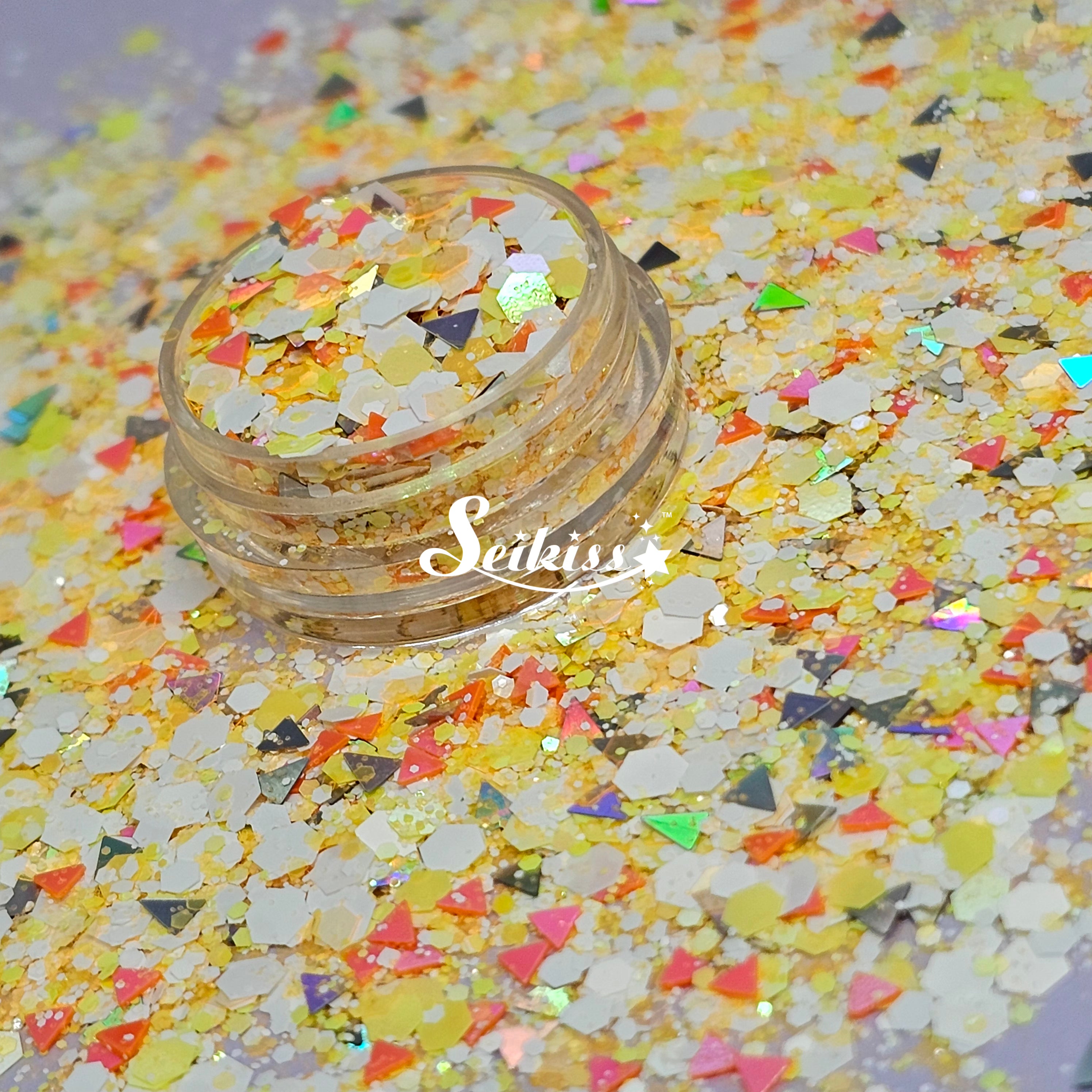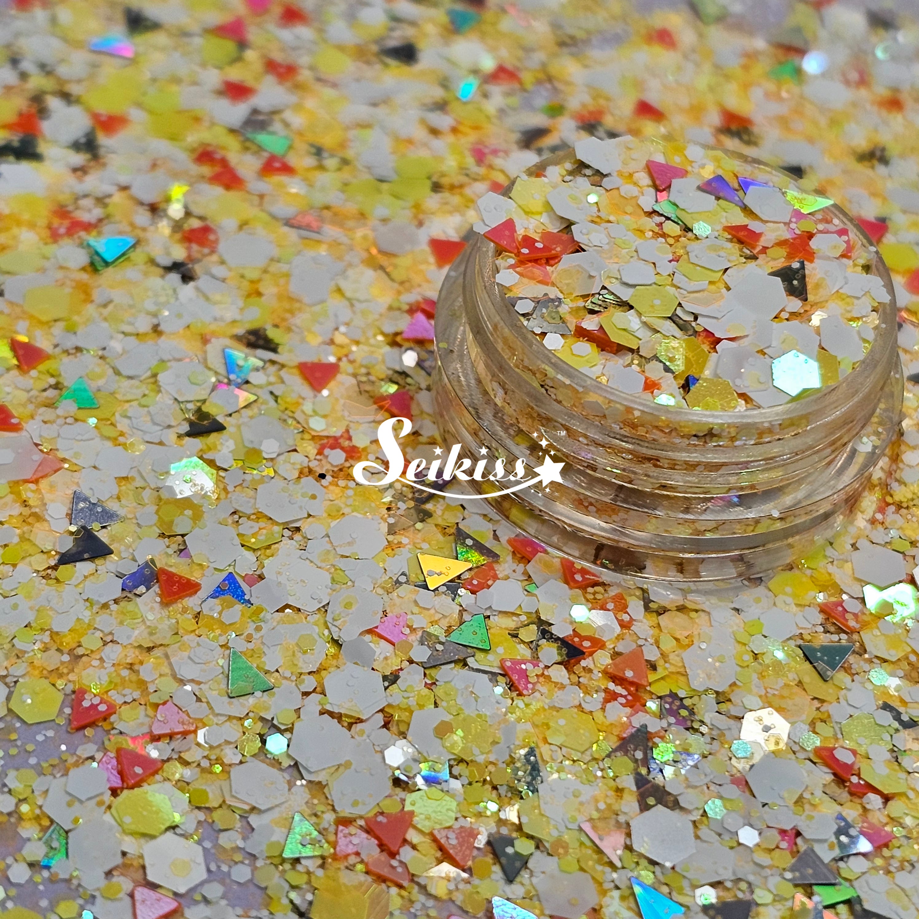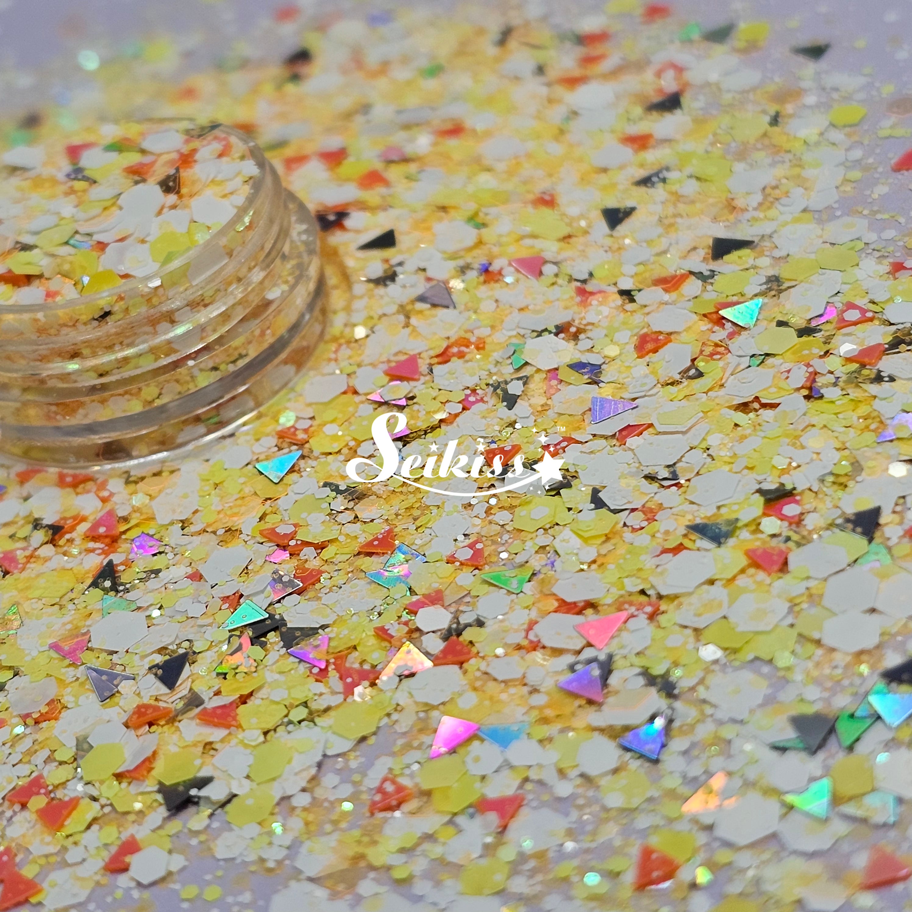 Sweet Fall features a stunning blend of white, iridescent yellow, and orange glitters. This mix is accented with silver and orange triangle shapes for an extra pop. The metallic and fluorescent finish gives it a high-impact sparkle that shifts beautifully in UV light—perfect for nails, resin art, tumblers, crafts, and more.