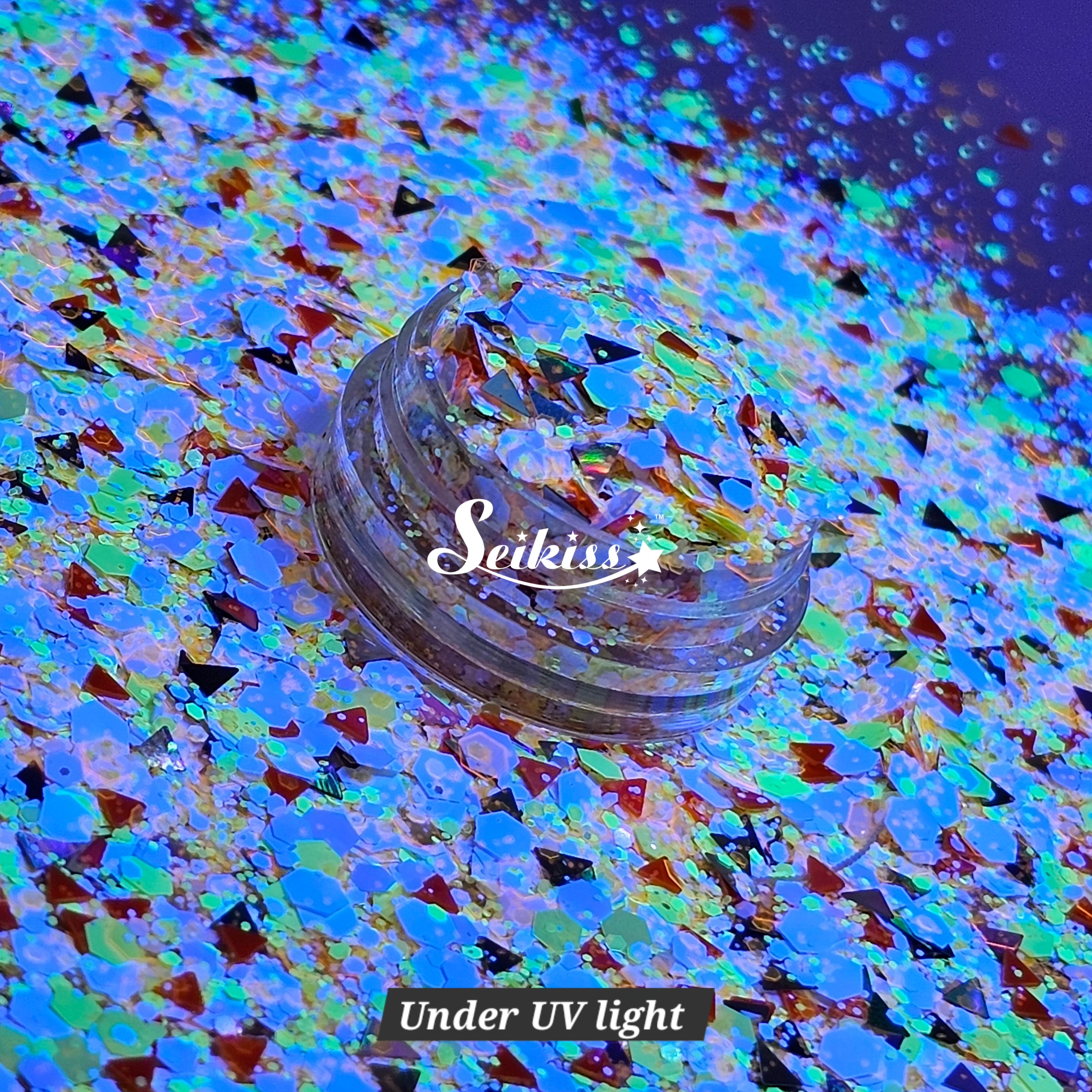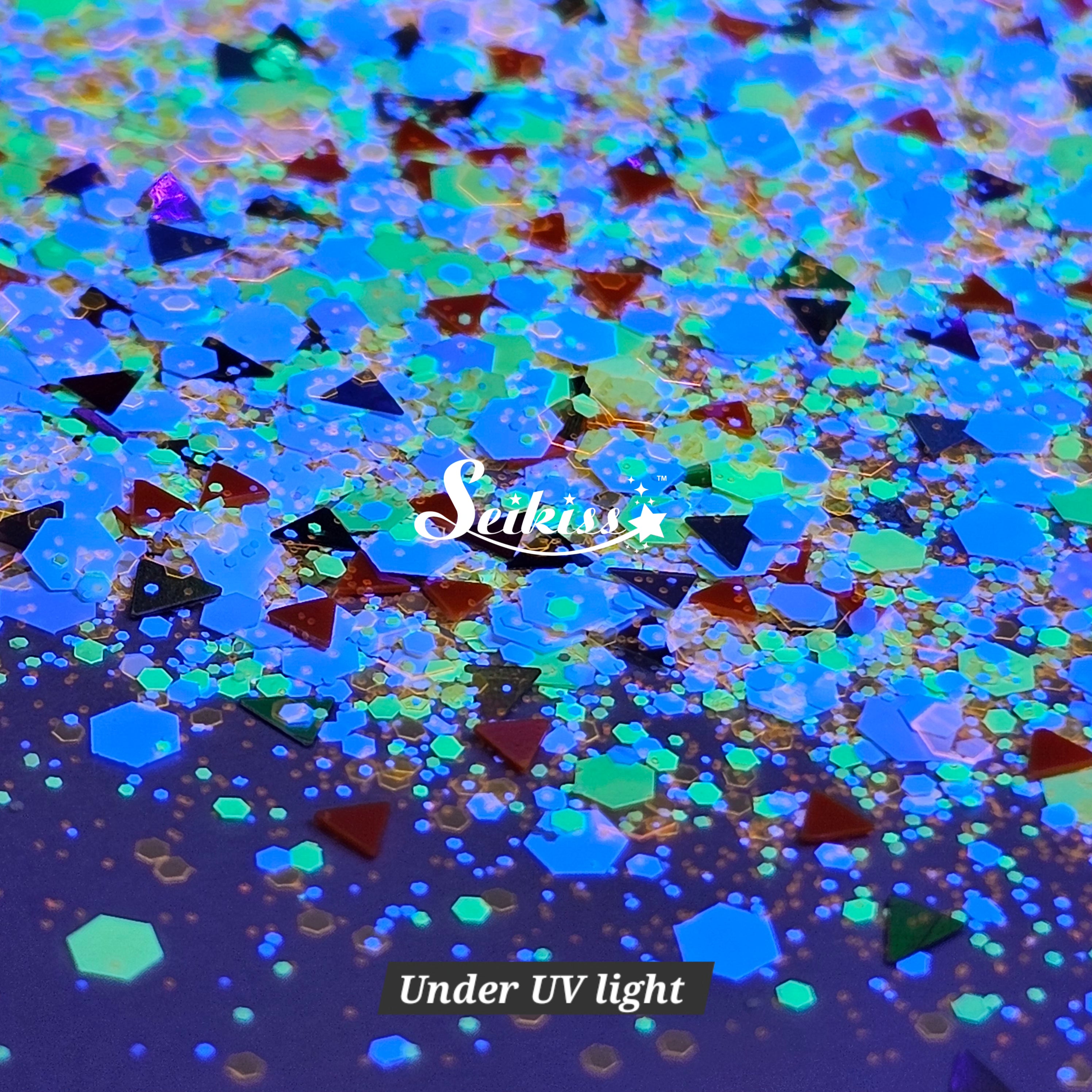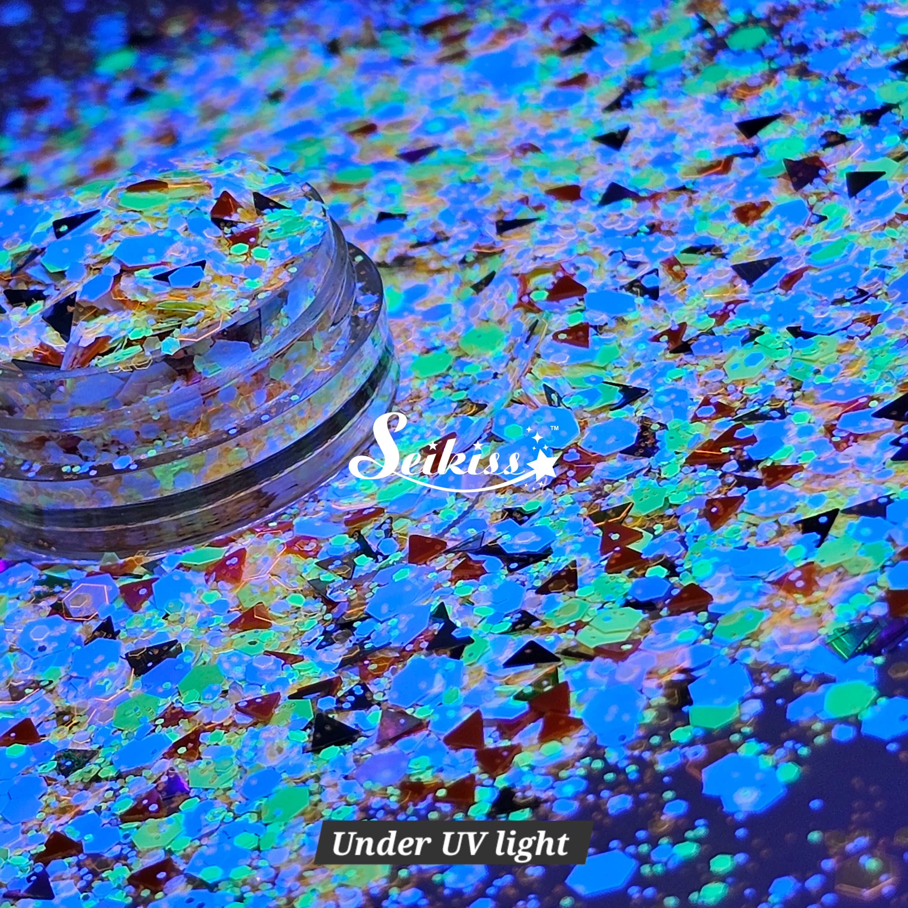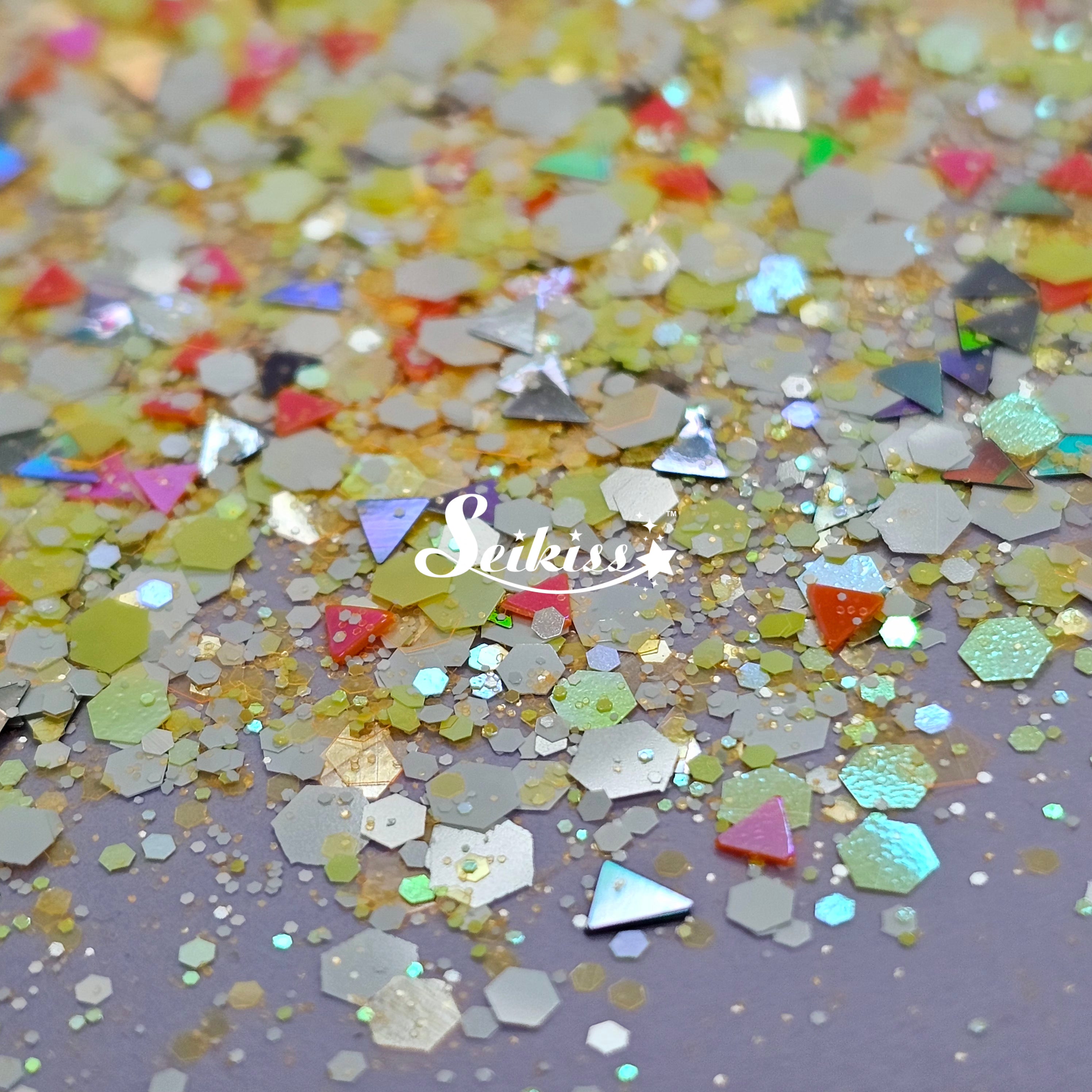 Sweet Fall features a stunning blend of white, iridescent yellow, and orange glitters. This mix is accented with silver and orange triangle shapes for an extra pop. The metallic and fluorescent finish gives it a high-impact sparkle that shifts beautifully in UV light—perfect for nails, resin art, tumblers, crafts, and more.