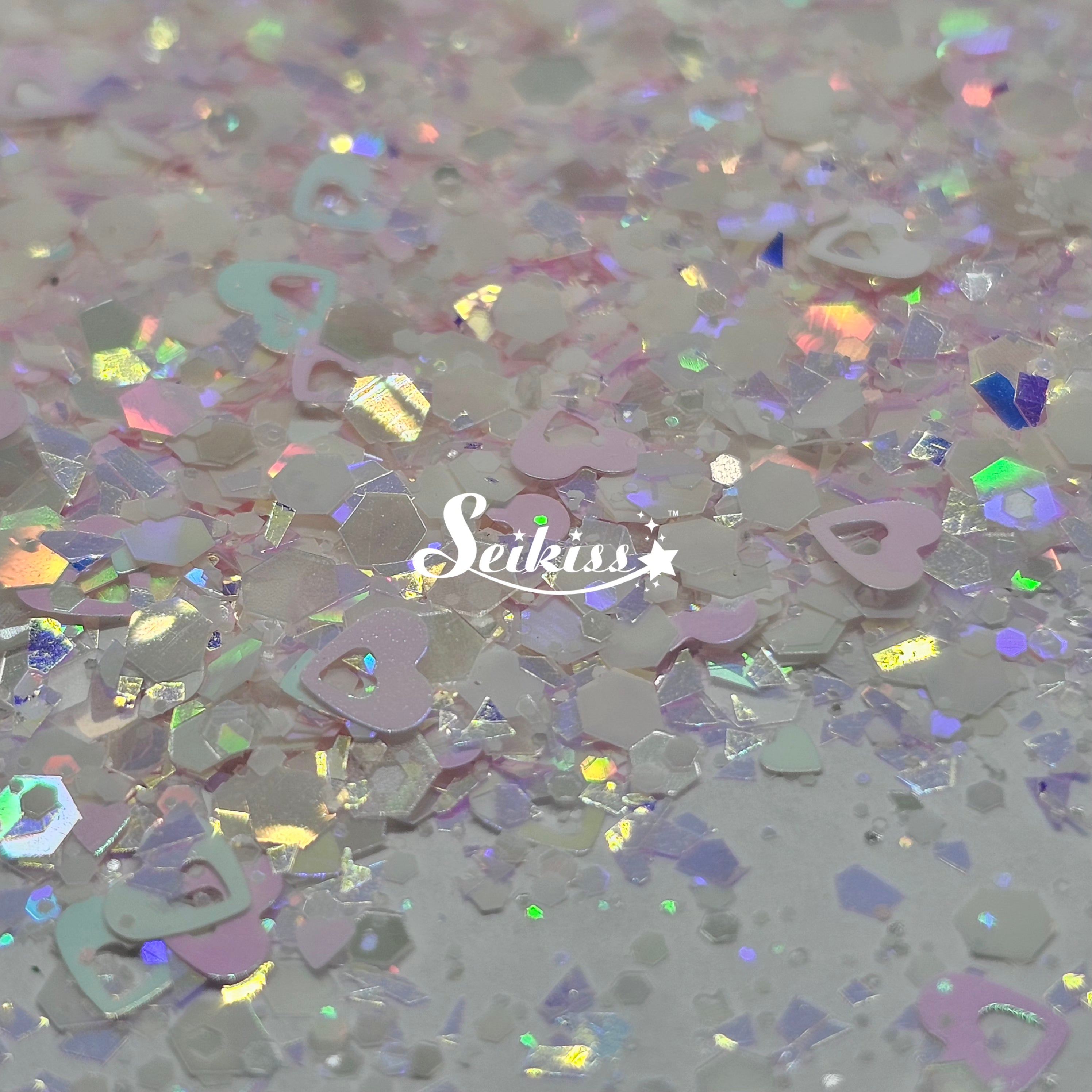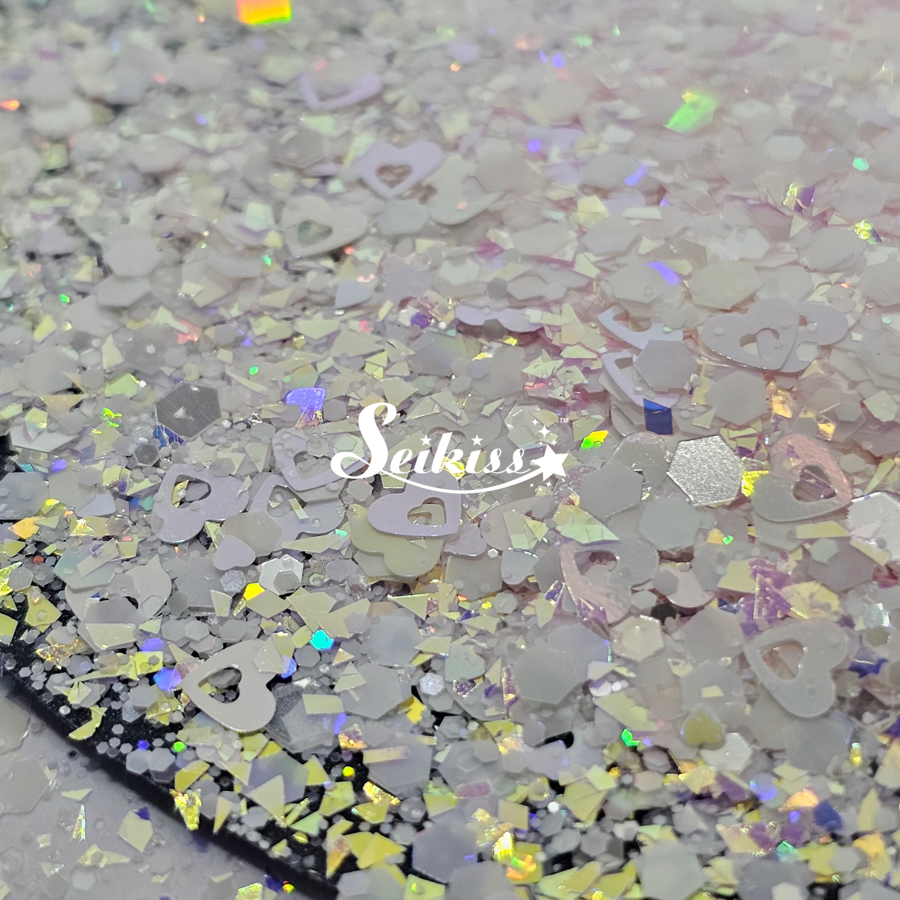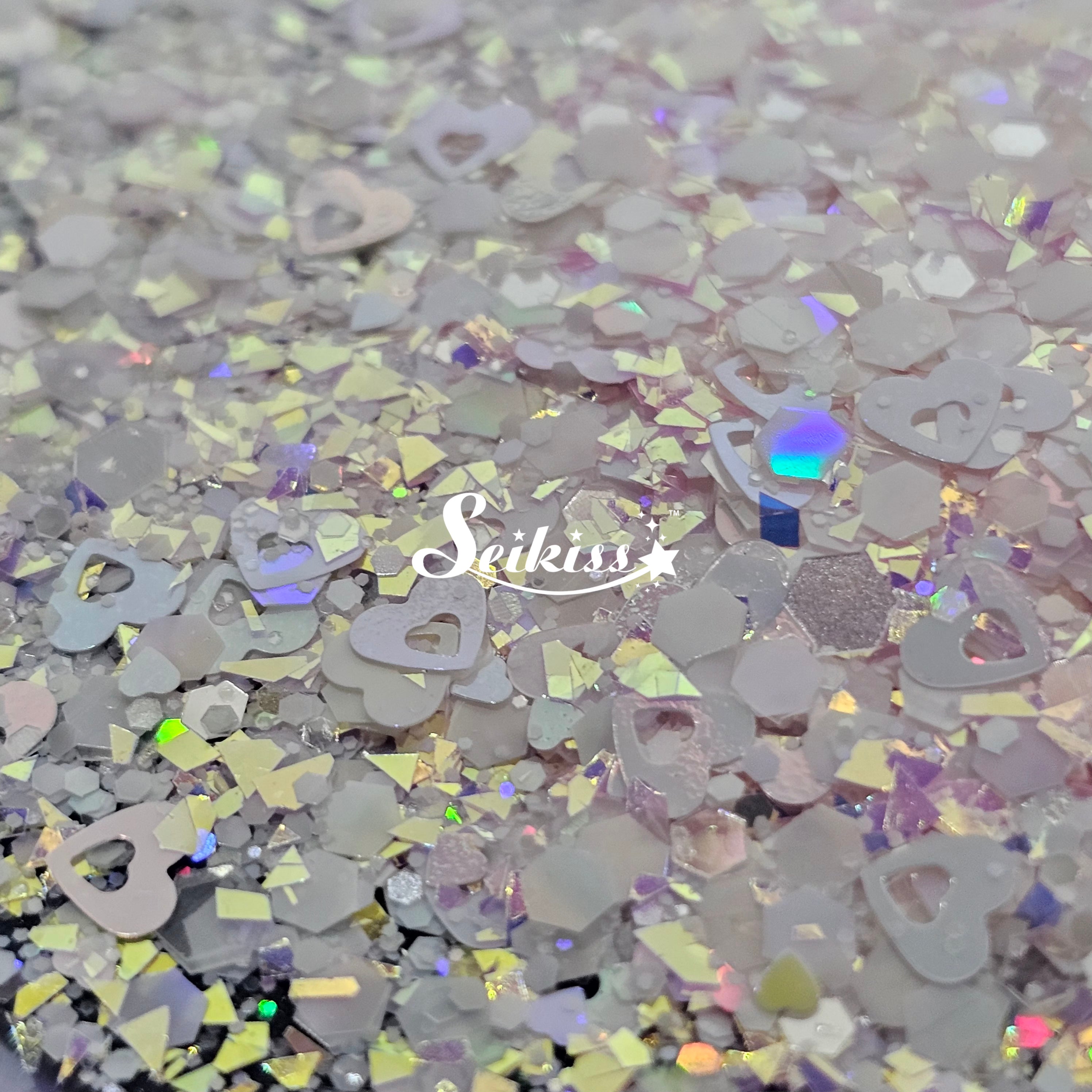 Sweetheart is a custom glitter mix with iridescent hearts, flakes and white holographic chunky mix. Perfect for resin, nails, tumblers, jewelry, arts, and all types of crafts and projects.